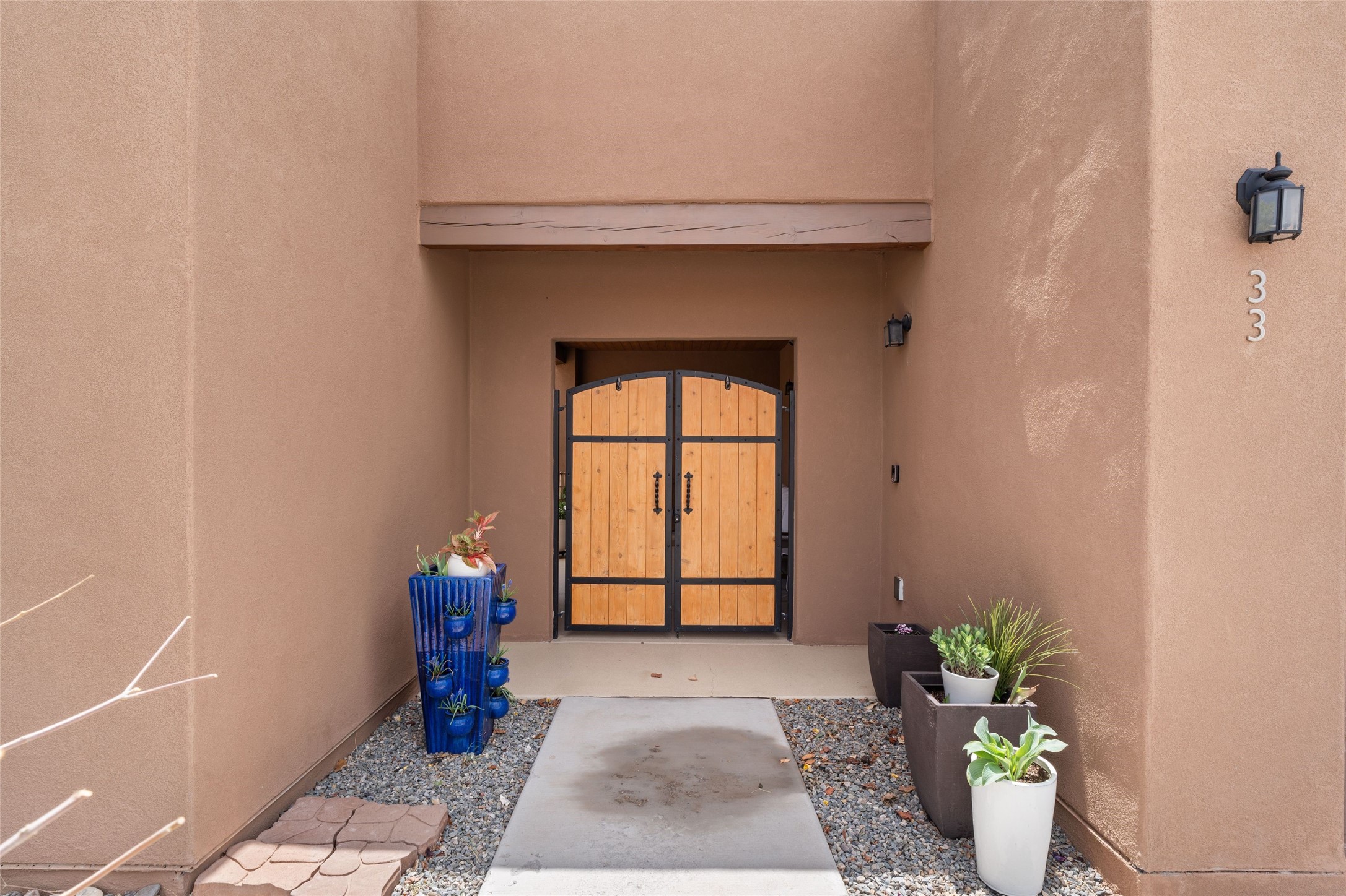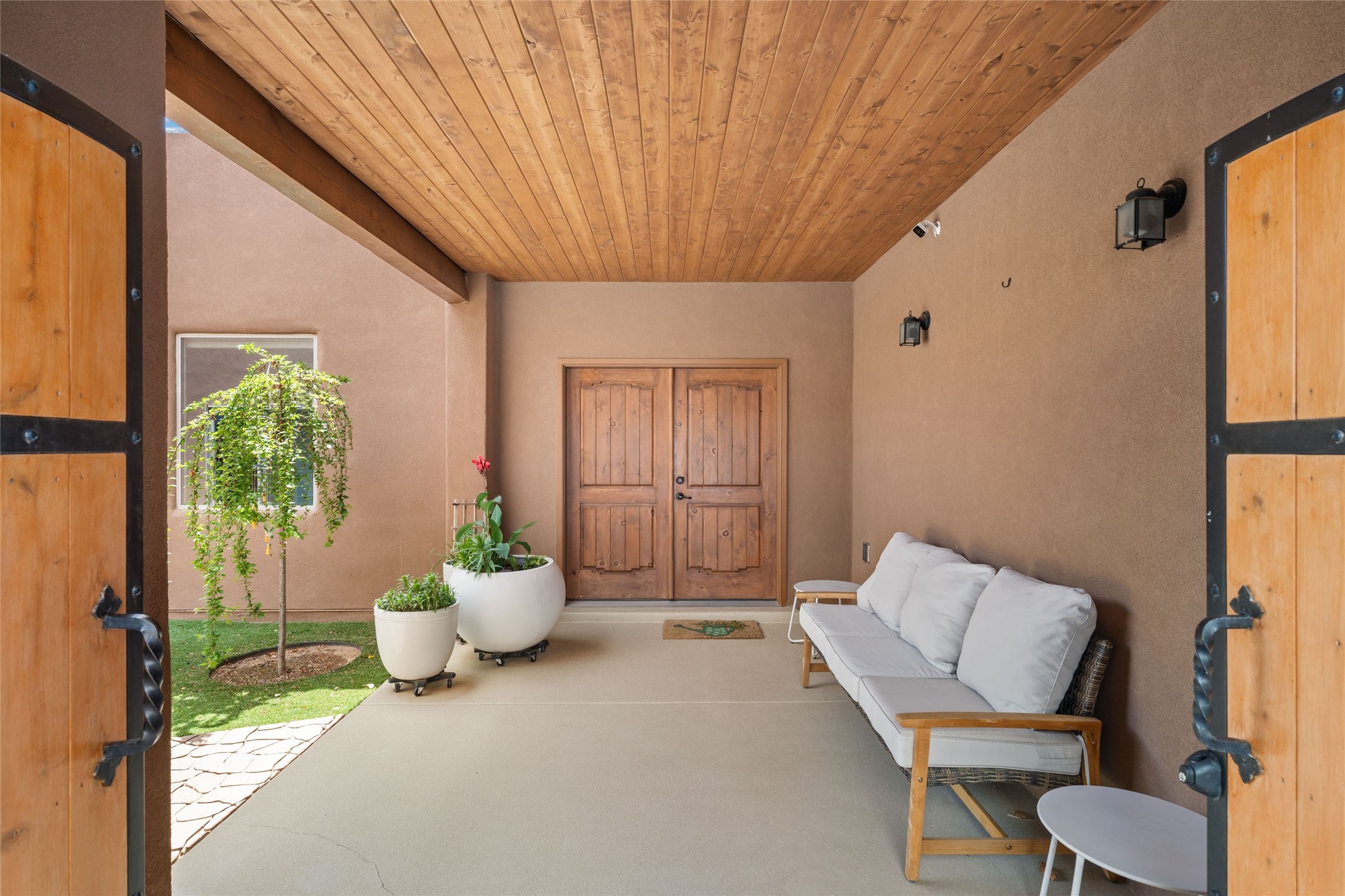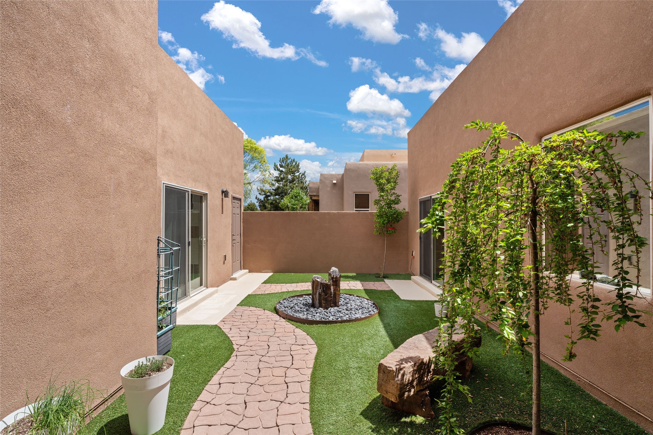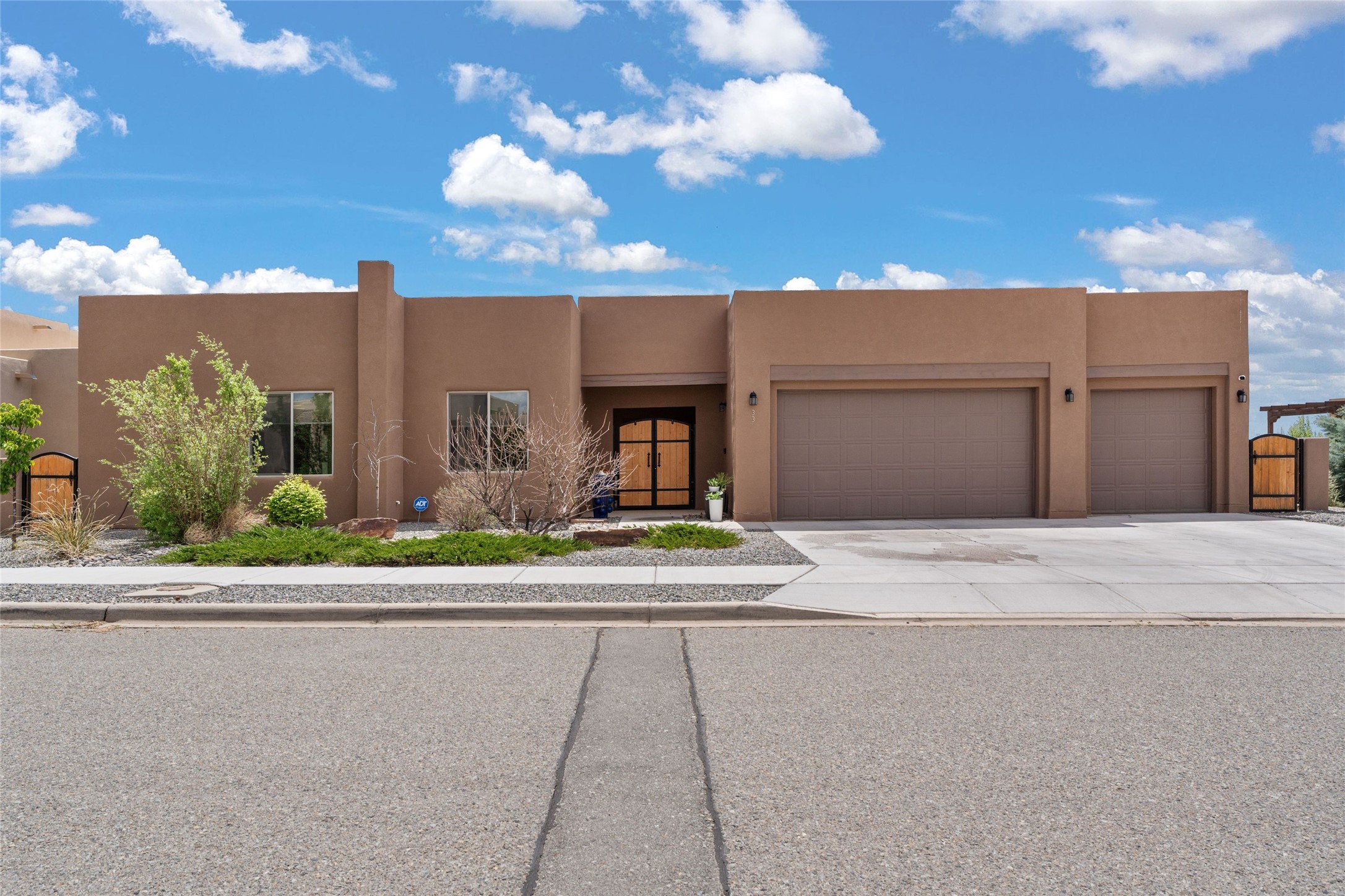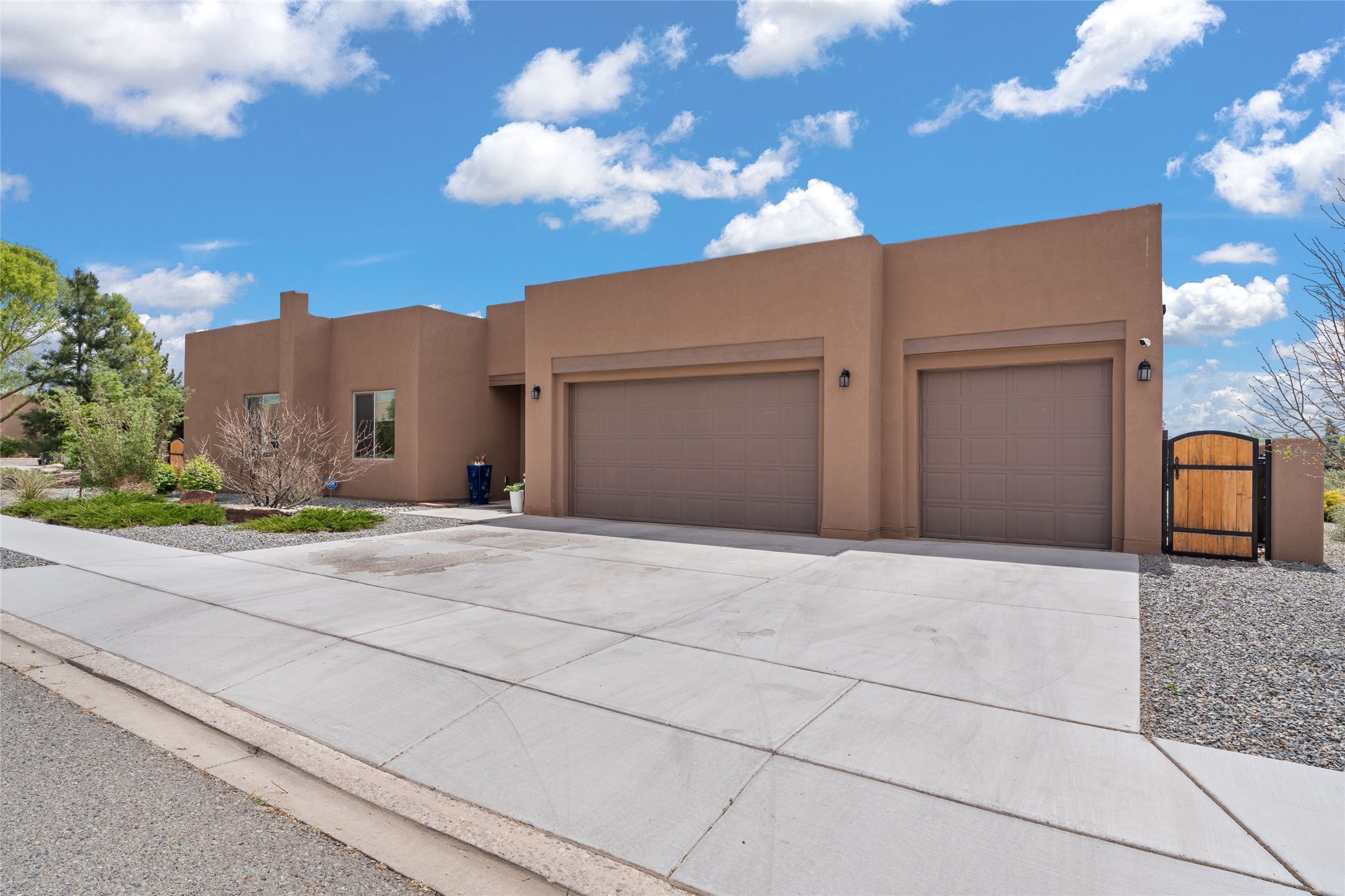 Step inside this move-in ready La Pradera home and enjoy the tranquility and tasteful design found in this award-winning Zaguan floor-plan, offering an unparalleled blend of modern sophistication, premium upgrades, and magnificent sun-filled vistas. Upon entering through handcrafted double cedar gates, you will find a welcoming private courtyard with a soothing water feature and ample space for lush potted plantings.This 3-bedroom, 3-bath home provides flexibility, privacy, and exceptional finishes throughout the home, including a modern Kiva fireplace, porcelain tile flooring and dramatic beamed ceilings. Designed for culinary enthusiasts, the spacious kitchen claims a 4-burner WOLF convection oven with indoor griddle, a professional-grade ventilation system, a Sub-Zero Cove dishwasher, and a counter-depth Jennair refrigerator, all complemented by soft-close cabinetry, elegant Silestone countertops, and shimmer-tiled backsplashThe primary suite features a custom tiled shower, a deep soaking tub, dual walk-in closets, and a private water closet, all designed for ultimate comfort. Within a few steps from here into the courtyard, lies the separate guest suite, with a living room, bedroom, and upsale bath. The second bedroom in the home extends out to the portal and a large yard that is completely surrounded by a custom-made wall for security and privacy.Additional highlights include an oversized, fully finished three-car garage with extra storage, wired EV outlet, and durable epoxy flooring. The home is equipped with tankless hot water system, an in-duct air purification system, a whole-house steam humidifier, and a reverse-osmosis water purification system...all ensuring a high standard of living, located near health care, SFCC, schools and access to major roads.