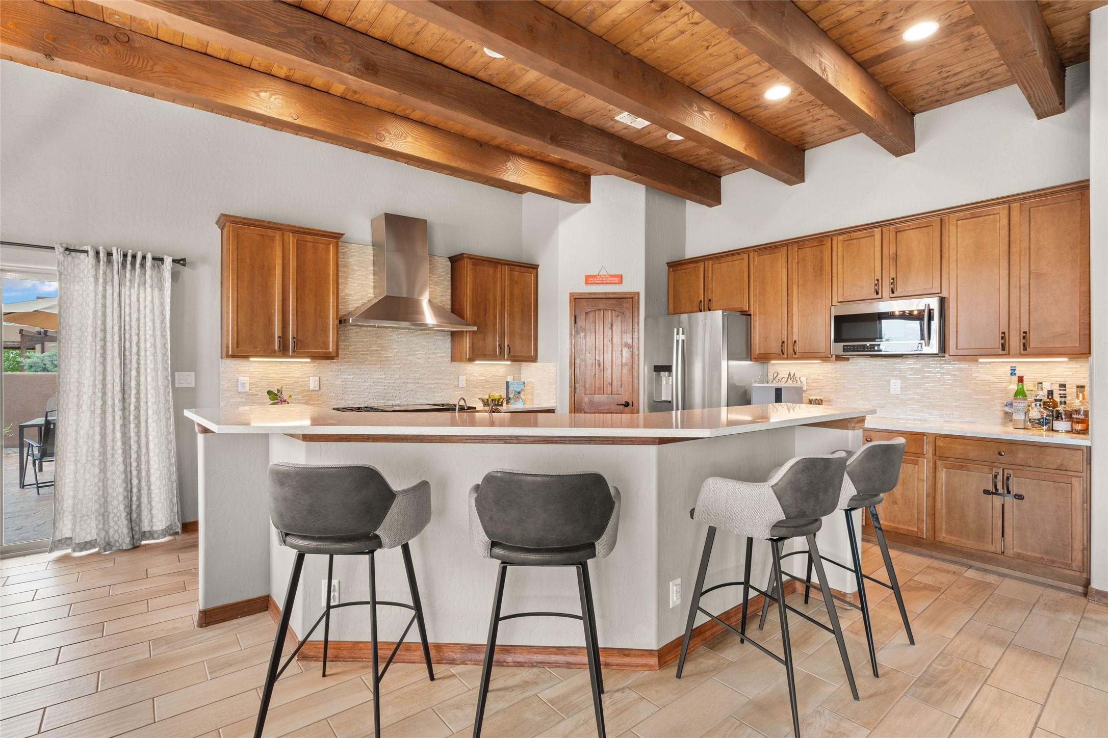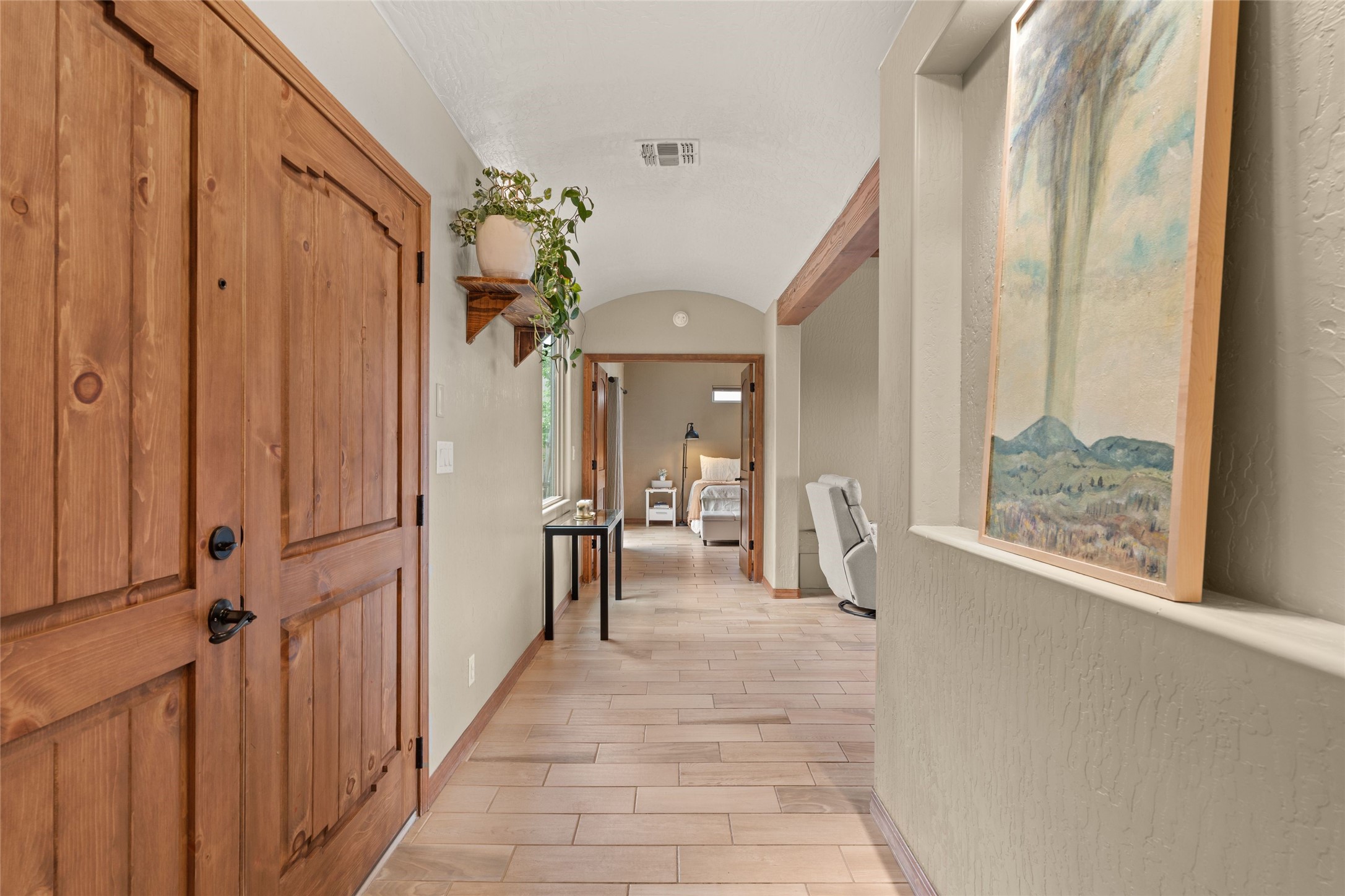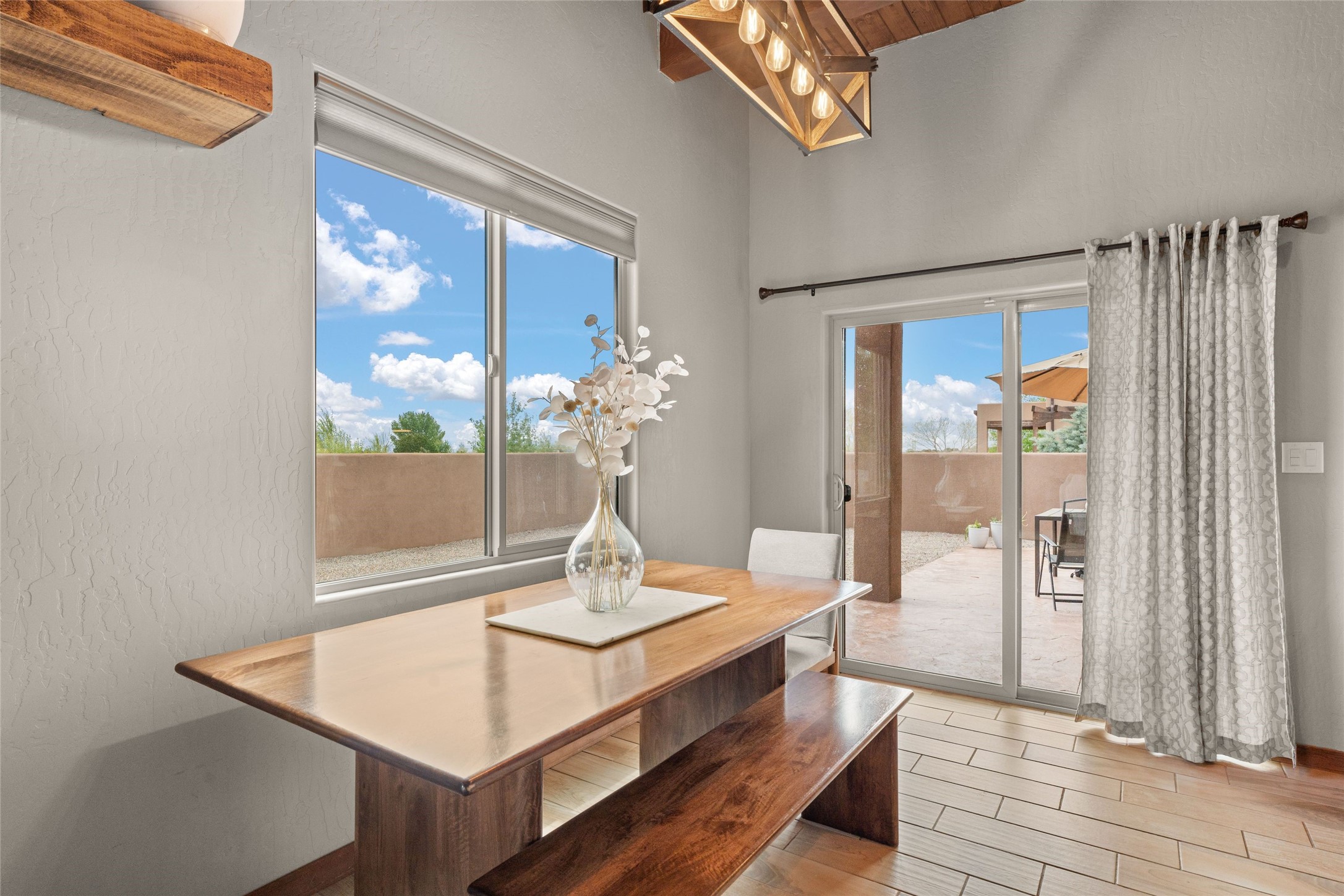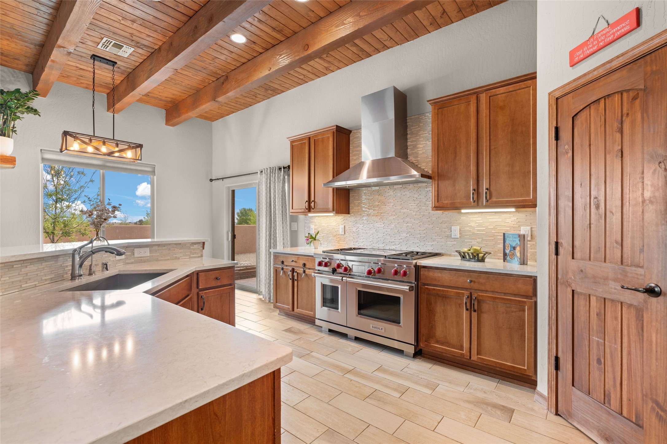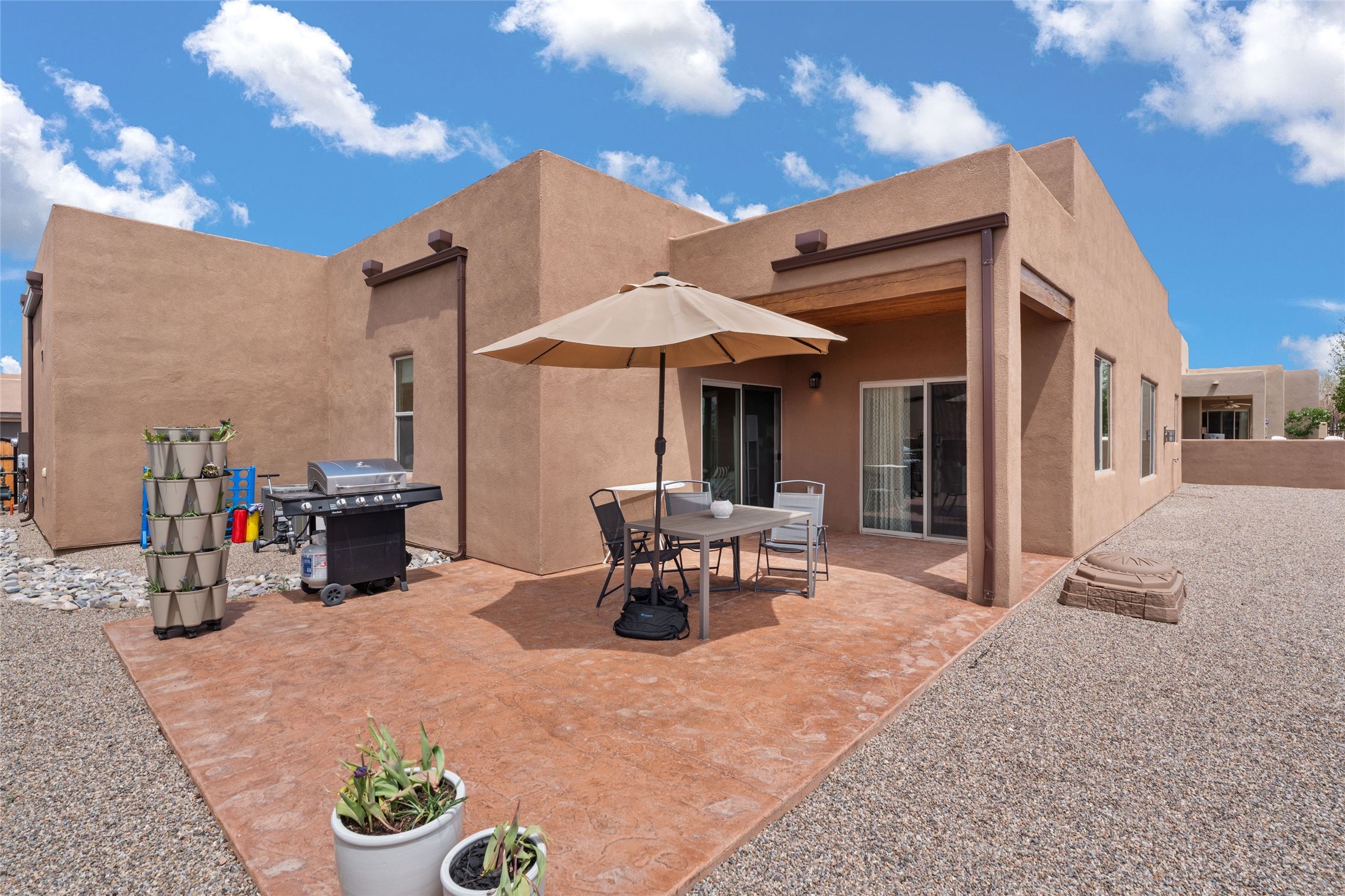 Step inside this move-in ready La Pradera home and enjoy the tranquility and tasteful design found in this award-winning Zaguan floor-plan, offering an unparalleled blend of modern sophistication, premium upgrades, and magnificent sun-filled vistas. Upon entering through handcrafted double cedar gates, you will find a welcoming private courtyard with a soothing water feature and ample space for lush potted plantings.This 3-bedroom, 3-bath home provides flexibility, privacy, and exceptional finishes throughout the home, including a modern Kiva fireplace, porcelain tile flooring and dramatic beamed ceilings. Designed for culinary enthusiasts, the spacious kitchen claims a 4-burner WOLF convection oven with indoor griddle, a professional-grade ventilation system, a Sub-Zero Cove dishwasher, and a counter-depth Jennair refrigerator, all complemented by soft-close cabinetry, elegant Silestone countertops, and shimmer-tiled backsplashThe primary suite features a custom tiled shower, a deep soaking tub, dual walk-in closets, and a private water closet, all designed for ultimate comfort. Within a few steps from here into the courtyard, lies the separate guest suite, with a living room, bedroom, and upsale bath. The second bedroom in the home extends out to the portal and a large yard that is completely surrounded by a custom-made wall for security and privacy.Additional highlights include an oversized, fully finished three-car garage with extra storage, wired EV outlet, and durable epoxy flooring. The home is equipped with tankless hot water system, an in-duct air purification system, a whole-house steam humidifier, and a reverse-osmosis water purification system...all ensuring a high standard of living, located near health care, SFCC, schools and access to major roads.