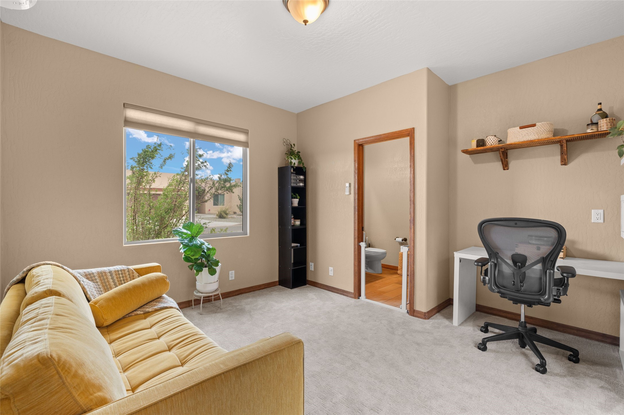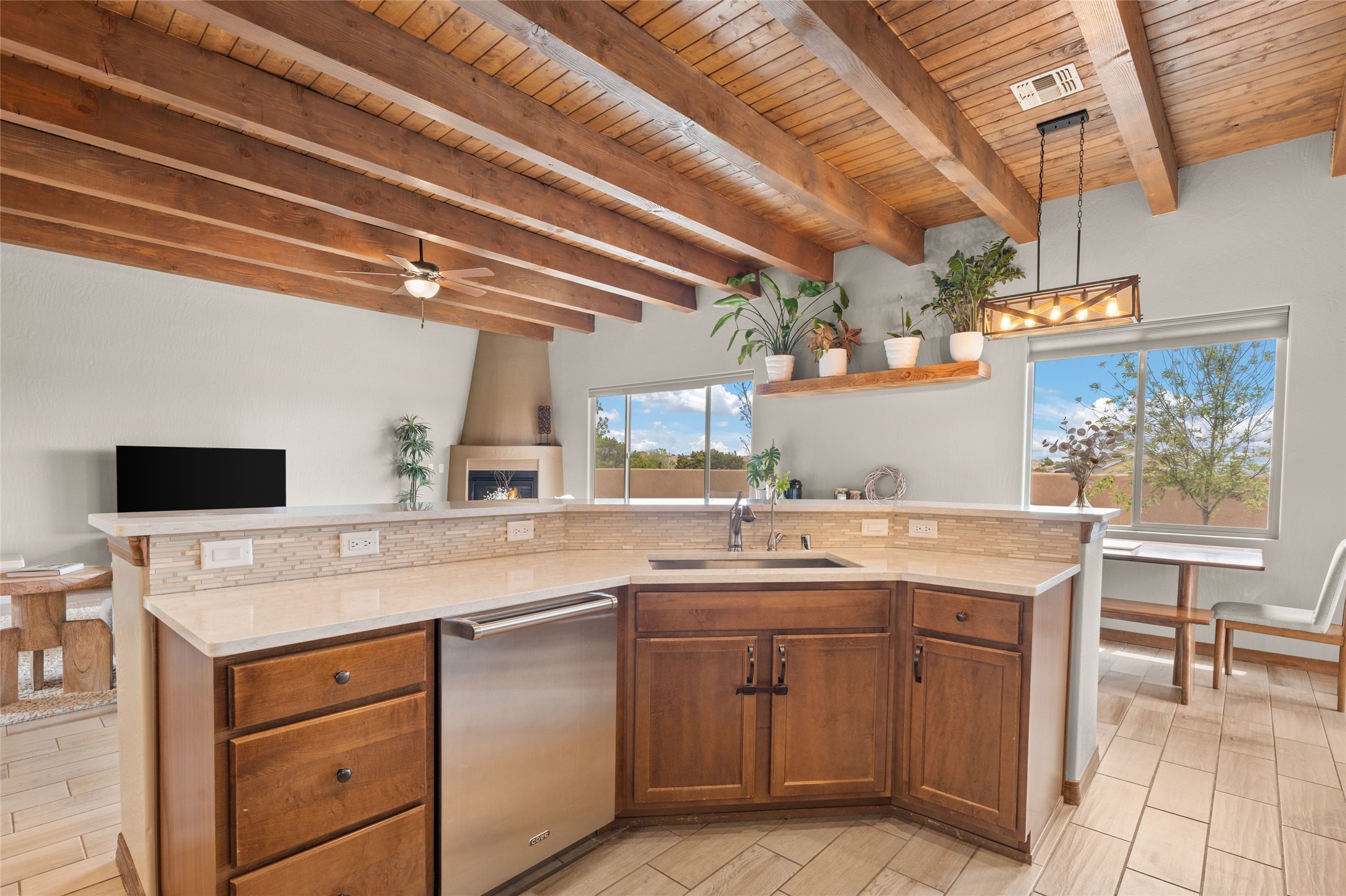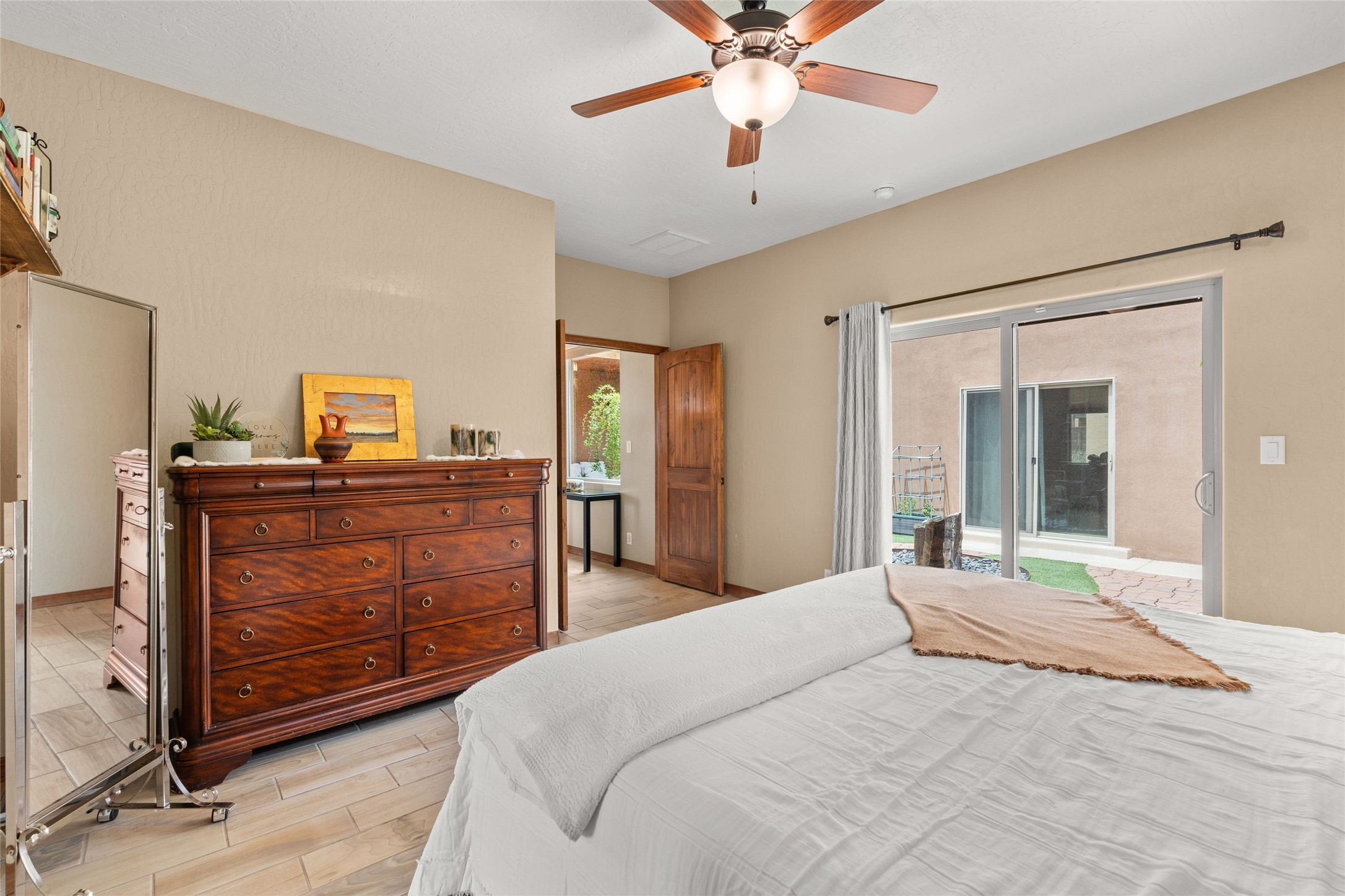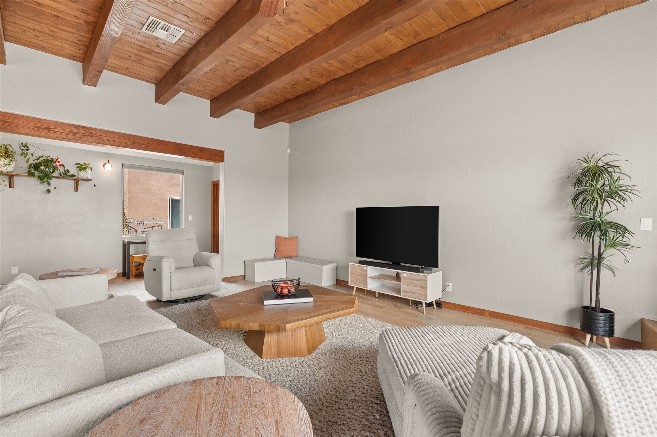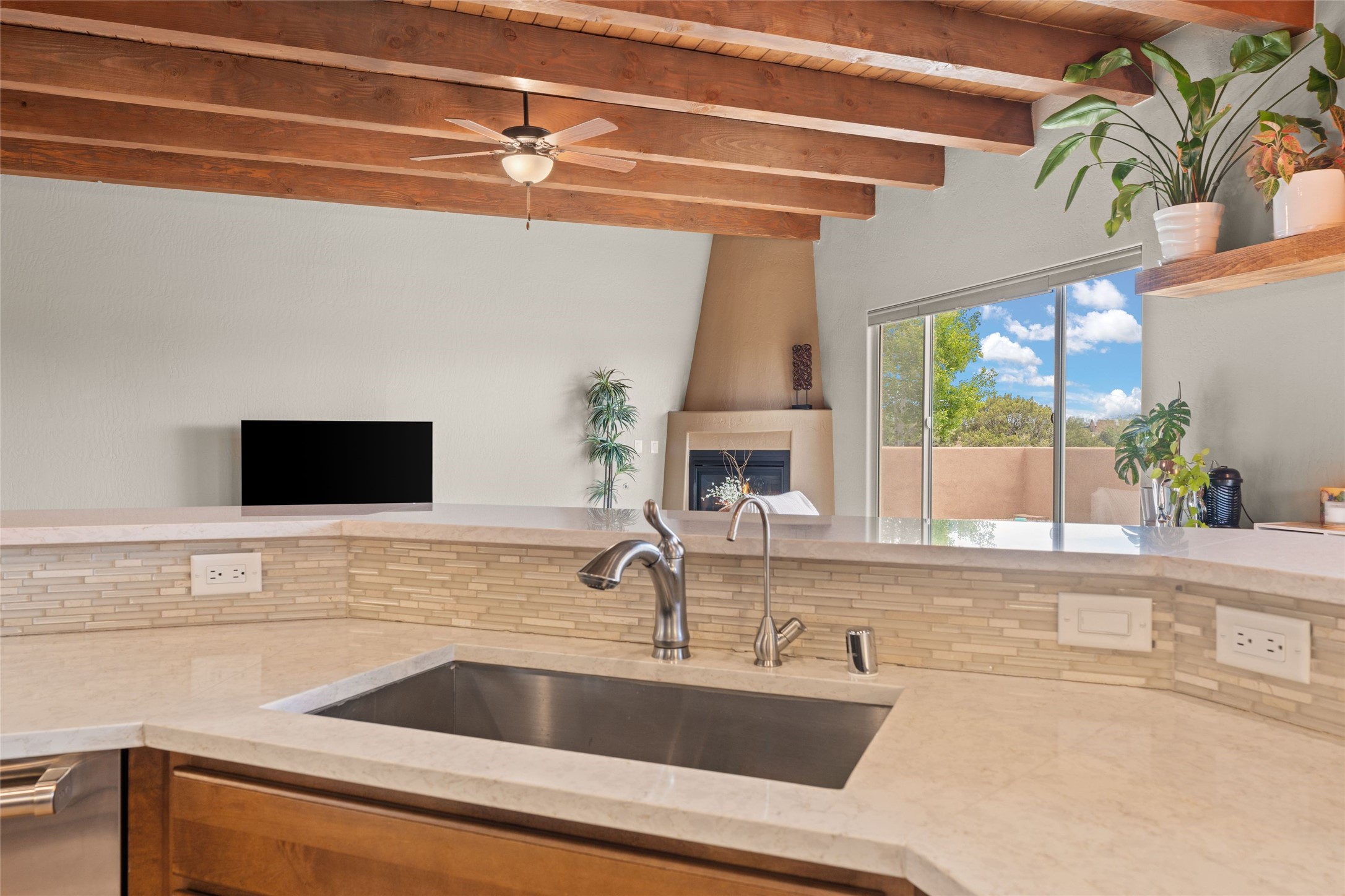 Step inside this move-in ready La Pradera home and enjoy the tranquility and tasteful design found in this award-winning Zaguan floor-plan, offering an unparalleled blend of modern sophistication, premium upgrades, and magnificent sun-filled vistas. Upon entering through handcrafted double cedar gates, you will find a welcoming private courtyard with a soothing water feature and ample space for lush potted plantings.This 3-bedroom, 3-bath home provides flexibility, privacy, and exceptional finishes throughout the home, including a modern Kiva fireplace, porcelain tile flooring and dramatic beamed ceilings. Designed for culinary enthusiasts, the spacious kitchen claims a 4-burner WOLF convection oven with indoor griddle, a professional-grade ventilation system, a Sub-Zero Cove dishwasher, and a counter-depth Jennair refrigerator, all complemented by soft-close cabinetry, elegant Silestone countertops, and shimmer-tiled backsplashThe primary suite features a custom tiled shower, a deep soaking tub, dual walk-in closets, and a private water closet, all designed for ultimate comfort. Within a few steps from here into the courtyard, lies the separate guest suite, with a living room, bedroom, and upsale bath. The second bedroom in the home extends out to the portal and a large yard that is completely surrounded by a custom-made wall for security and privacy.Additional highlights include an oversized, fully finished three-car garage with extra storage, wired EV outlet, and durable epoxy flooring. The home is equipped with tankless hot water system, an in-duct air purification system, a whole-house steam humidifier, and a reverse-osmosis water purification system...all ensuring a high standard of living, located near health care, SFCC, schools and access to major roads.