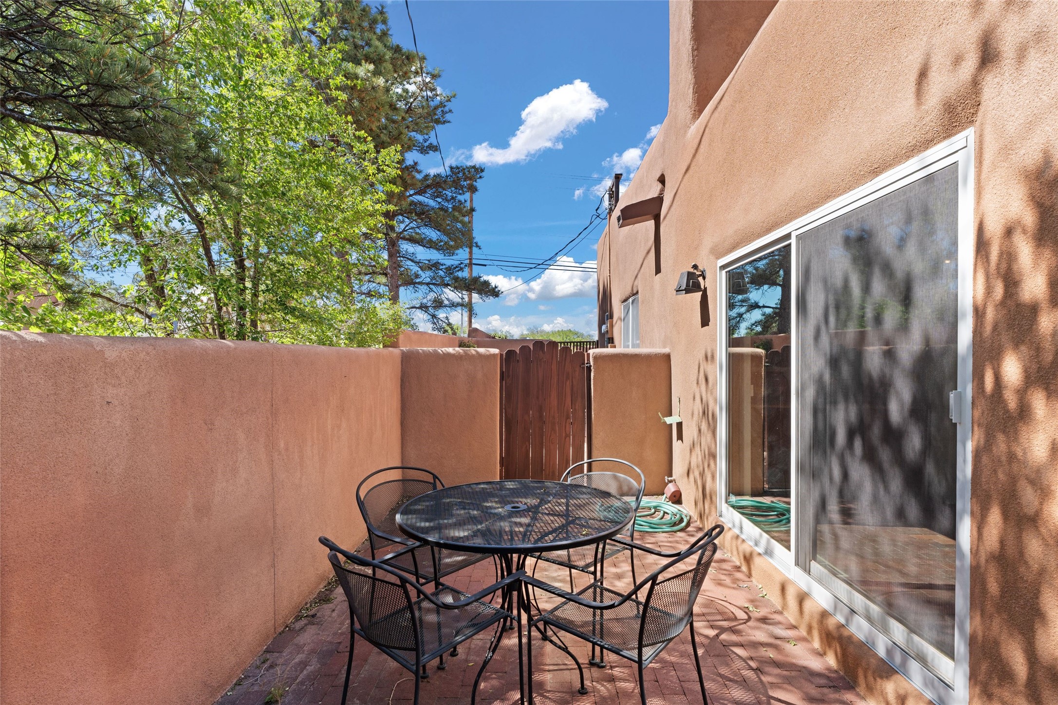 Charming Pueblo-Style Home in prime Santa Fe location, just minutes from downtown Santa Fe and the famed Canyon Road. This 2,102 sq ft Pueblo-style home blends timeless Southwestern character with modern comforts. Featuring 3 bedrooms and 2.5 bathrooms, this residence offers classic Santa Fe architecture with brick floors, exposed wood vigas, and two fireplaces. The kitchen boasts custom cabinetry, new dishwasher, and thoughtful craftsmanship throughout. Two generously sized bedrooms are located on the main level, while the upstairs hosts a large, private bedroom retreat with access to the rooftop--perfect for enjoying panoramic views of the Sangre de Cristo mountains and Santa Fe sunsets. Outdoors, professionally landscaped gardens are supported by a drip irrigation system. Additional features include a two-car garage and ample private outdoor spaces. This is a rare opportunity to own a beautifully appointed home in one of Santa Fe's most coveted locations. Furnishings available for purchase.