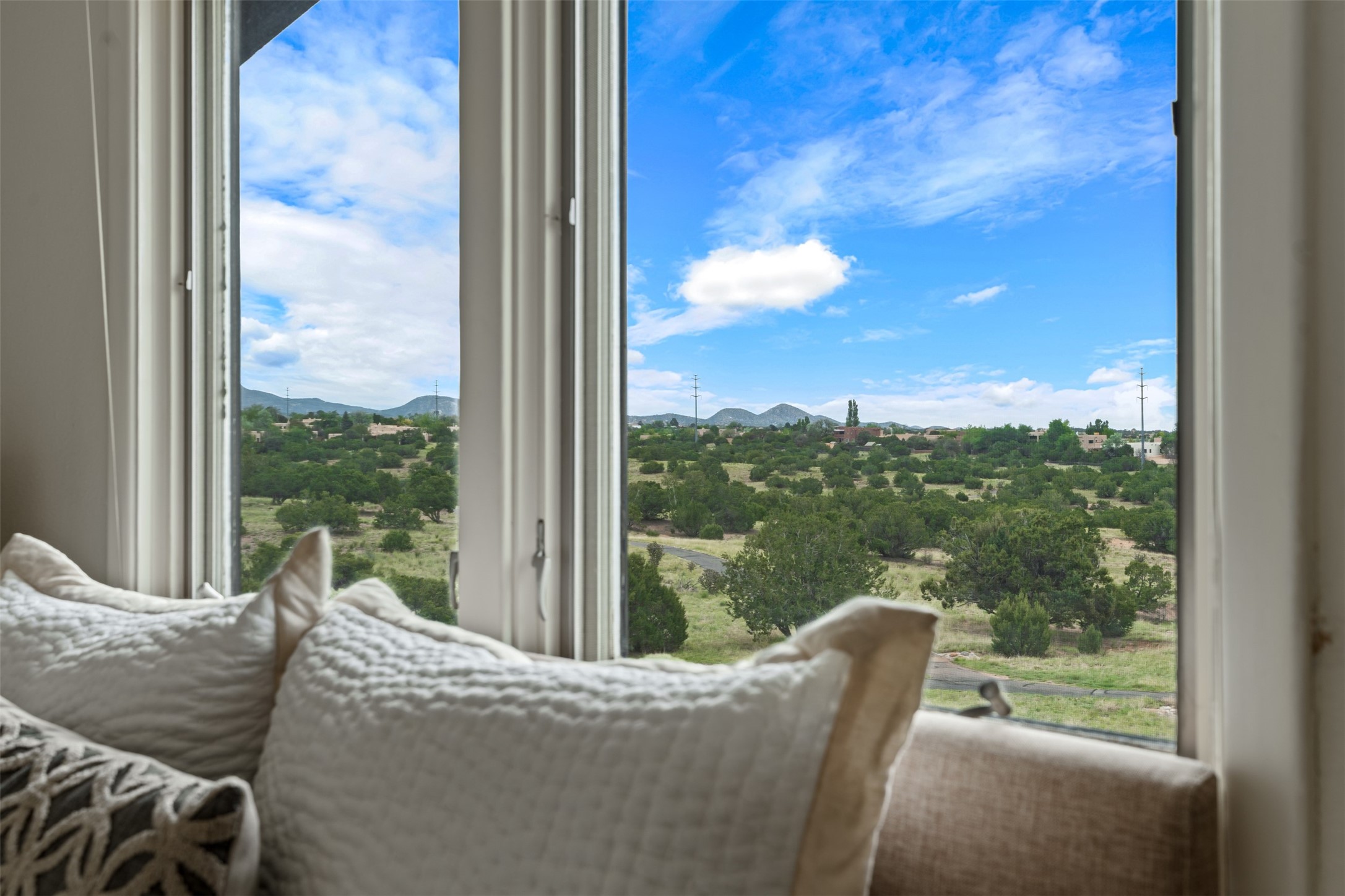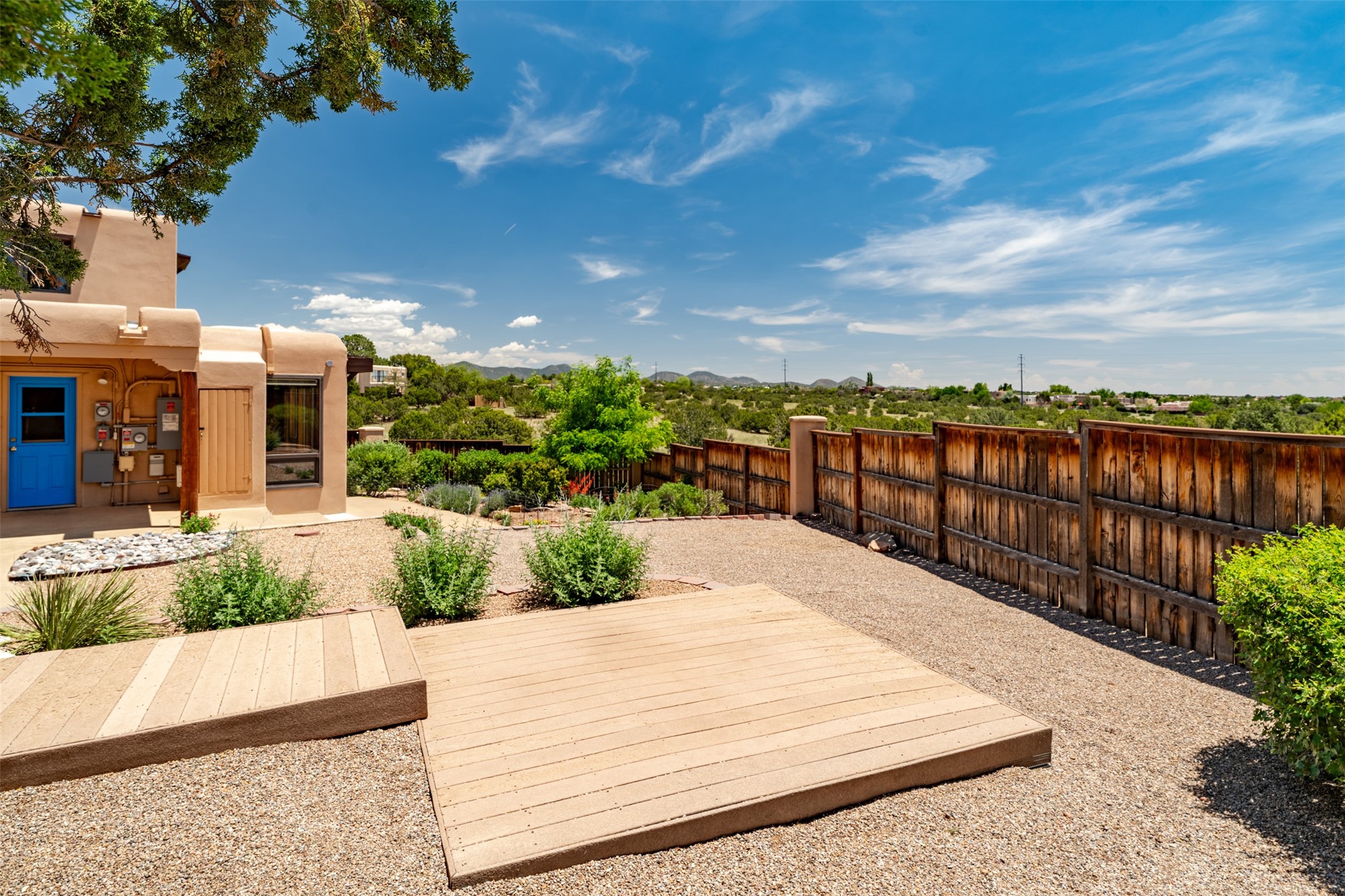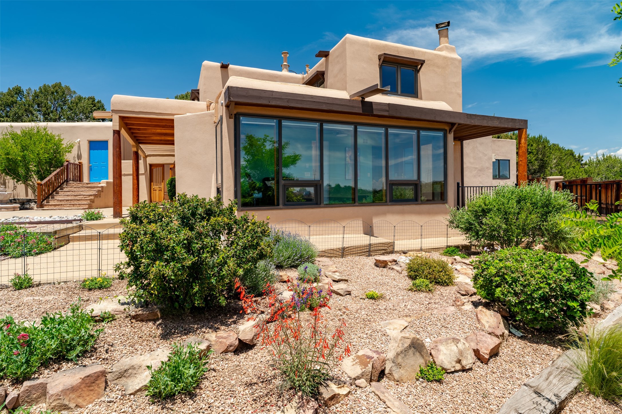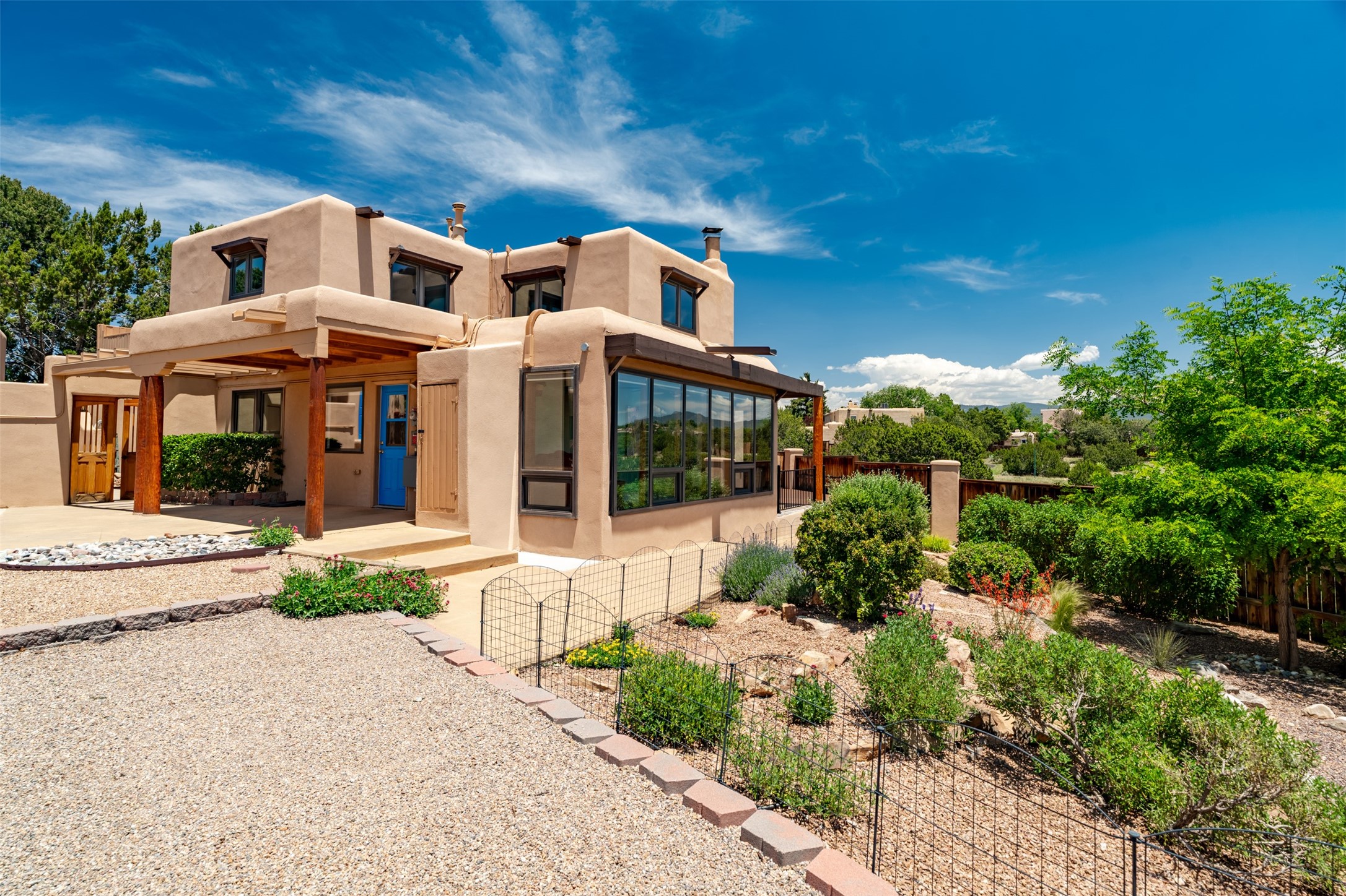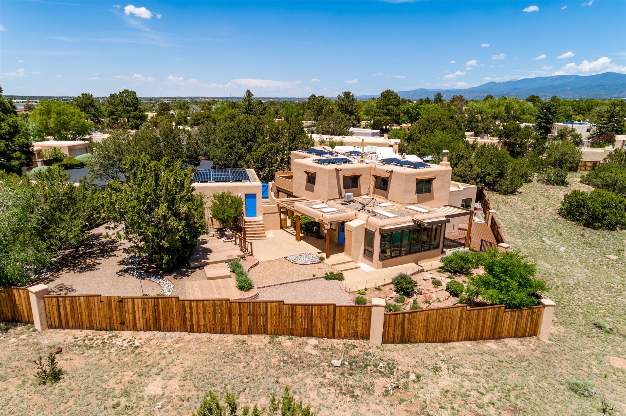 Nestled amid sweeping views and exquisite natural surroundings, this remarkable 4-bedroom, two story, home is a serene and sustainable retreat with a perfect blend of comfort, character, and eco-conscious upgrades. The luxurious, newer (2020) 600 sq ft primary suite on the main floor offers privacy and indulgence, complete with its own mini-split system, a spa-like bathroom, and direct access to outdoor living spaces. Three additional bedrooms are upstairs, where a sunny second-floor deck invites morning coffee or sunset unwinding.Skylights throughout the home bathe the interiors in natural light, highlighting thoughtful details like American clay walls, wood-beamed ceilings, and not one, but two fireplaces--including a charming corner Kiva in the dining room and a striking centerpiece hearth in the living room with a cozy built-in window seat.The bright, eat-in kitchen is a delight with newer appliances, abundant cabinetry, a classic white subway tile backsplash, and views that inspire. Comfort is ensured year-round with two-zone HVAC, refrigerated A/C, mini-splits, and tankless hot water in both upstairs baths.Outside, this home continues to impress with lush xeriscaping, a fenced garden area, and a fully fenced yard. A detached two-car garage includes an extra storage room, while multiple portals and decks provide ideal spots for dining, relaxing, or stargazing. Eco-conscious buyers will appreciate the complete solar electric system and 900-gallon rainwater catchment.This home is a rare find--where views, design, and sustainability come together in perfect harmony.This home is tucked away at the end of a cul-de-sac, with acres of open space and walking trails behind the house. Park Plazas has 8-9 miles of hiking trails, tennis courts, a community garden and is an oasis in the center of Santa Fe close to restaurants, shopping and other amenities, Don't miss this spectacular home in this wonderful neighborhood.