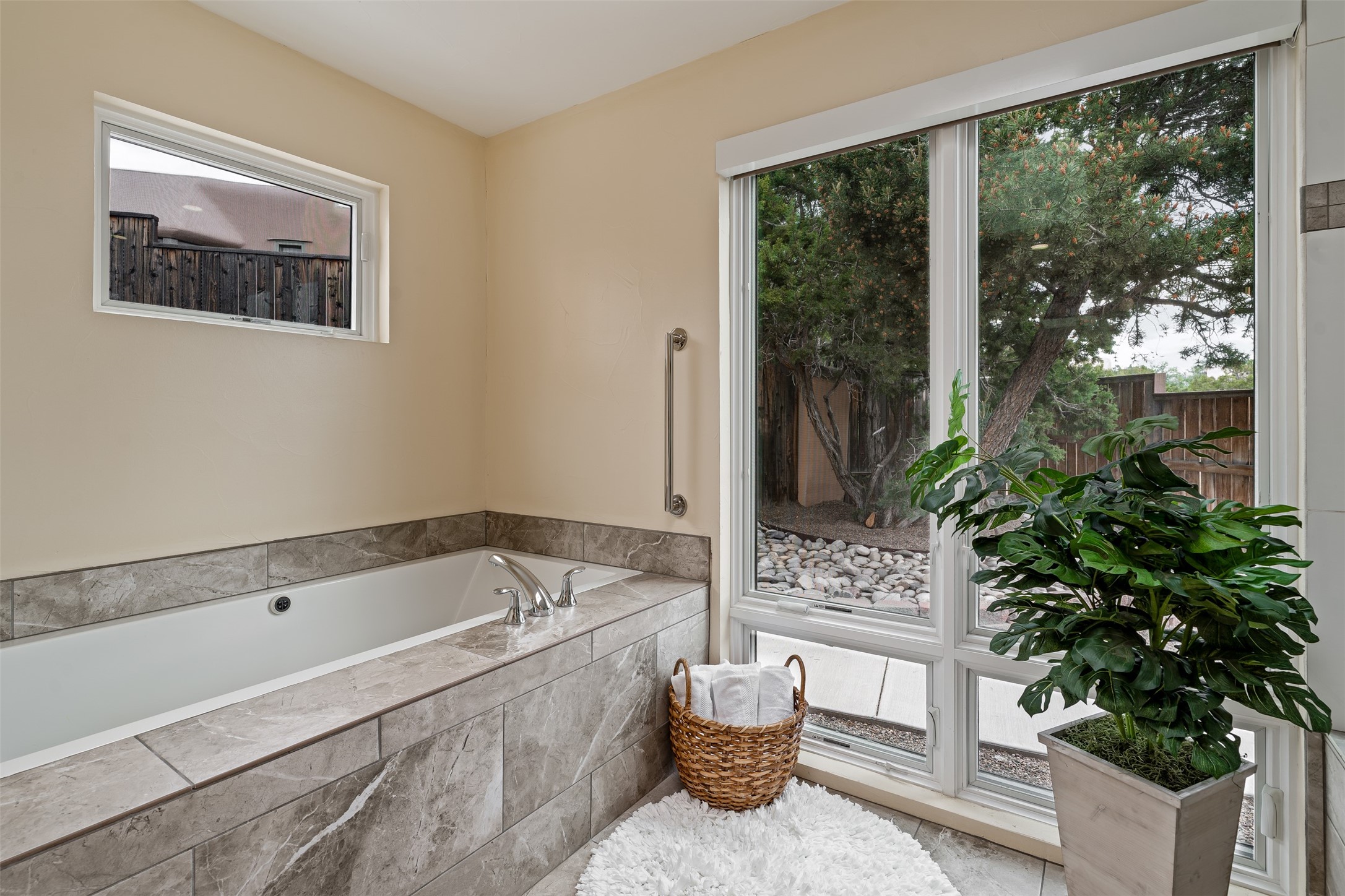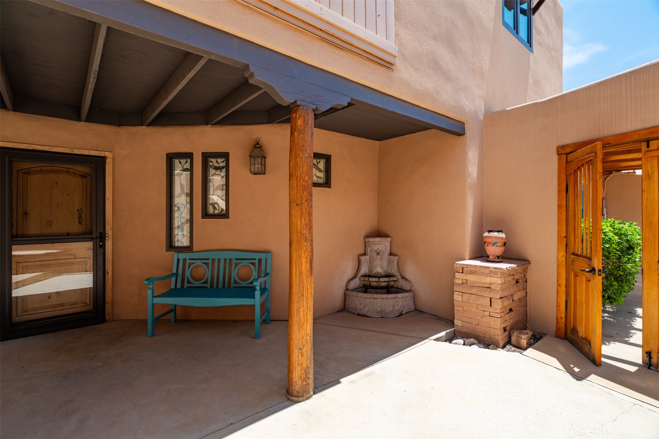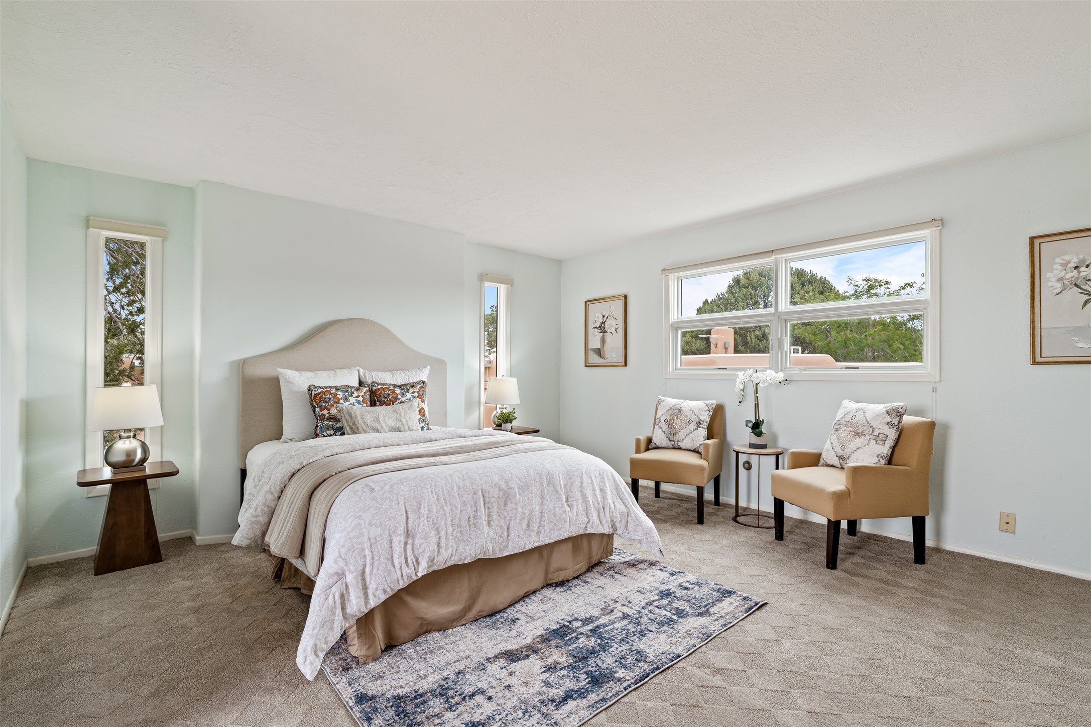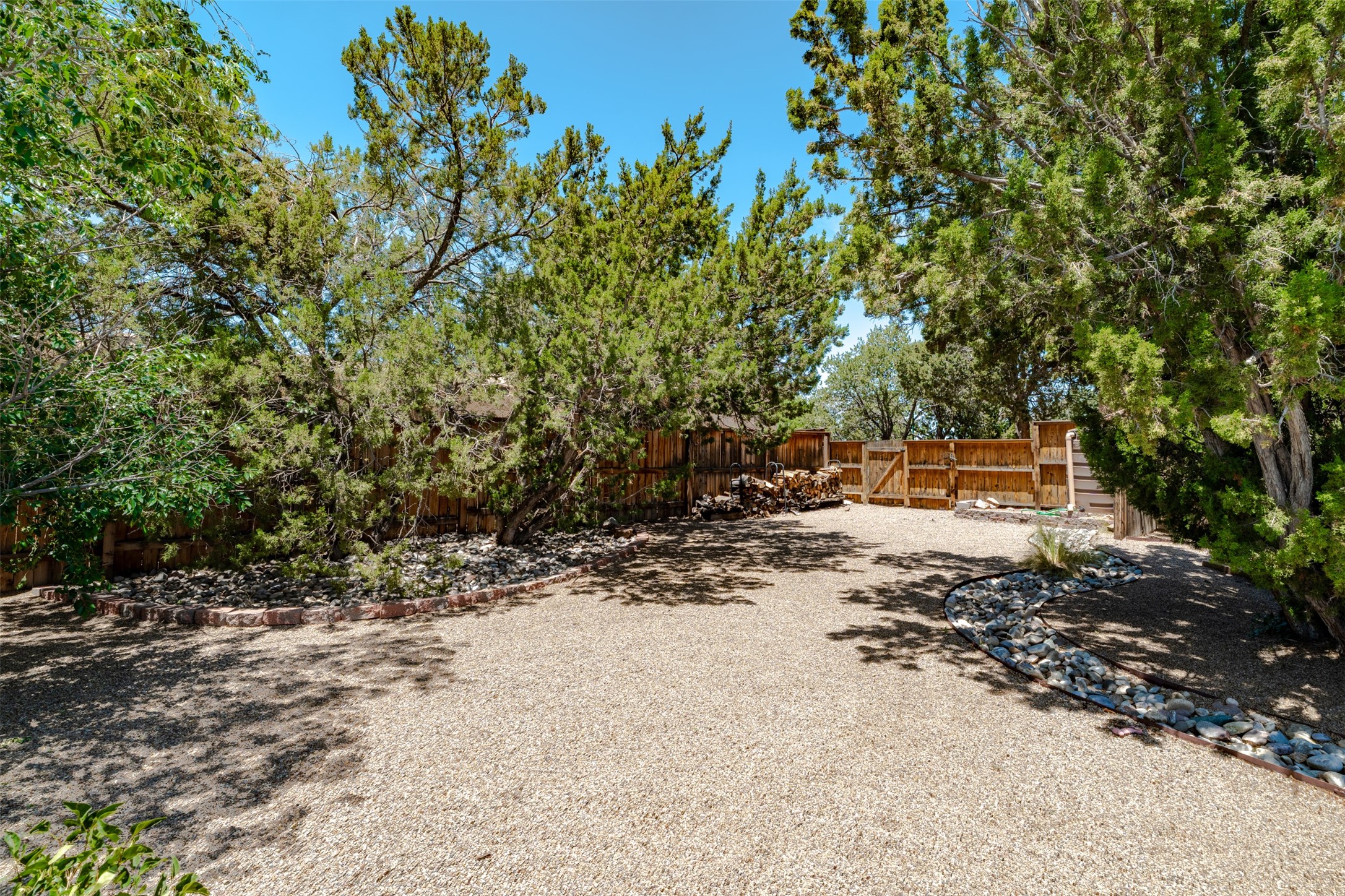Nestled amid sweeping views and exquisite natural surroundings, this remarkable 4-bedroom, two story, home is a serene and sustainable retreat with a perfect blend of comfort, character, and eco-conscious upgrades. The luxurious, newer (2020) 600 sq ft primary suite on the main floor offers privacy and indulgence, complete with its own mini-split system, a spa-like bathroom, and direct access to outdoor living spaces. Three additional bedrooms are upstairs, where a sunny second-floor deck invites morning coffee or sunset unwinding.Skylights throughout the home bathe the interiors in natural light, highlighting thoughtful details like American clay walls, wood-beamed ceilings, and not one, but two fireplaces--including a charming corner Kiva in the dining room and a striking centerpiece hearth in the living room with a cozy built-in window seat.The bright, eat-in kitchen is a delight with newer appliances, abundant cabinetry, a classic white subway tile backsplash, and views that inspire. Comfort is ensured year-round with two-zone HVAC, refrigerated A/C, mini-splits, and tankless hot water in both upstairs baths.Outside, this home continues to impress with lush xeriscaping, a fenced garden area, and a fully fenced yard. A detached two-car garage includes an extra storage room, while multiple portals and decks provide ideal spots for dining, relaxing, or stargazing. Eco-conscious buyers will appreciate the complete solar electric system and 900-gallon rainwater catchment.This home is a rare find--where views, design, and sustainability come together in perfect harmony.This home is tucked away at the end of a cul-de-sac, with acres of open space and walking trails behind the house. Park Plazas has 8-9 miles of hiking trails, tennis courts, a community garden and is an oasis in the center of Santa Fe close to restaurants, shopping and other amenities, Don't miss this spectacular home in this wonderful neighborhood.
