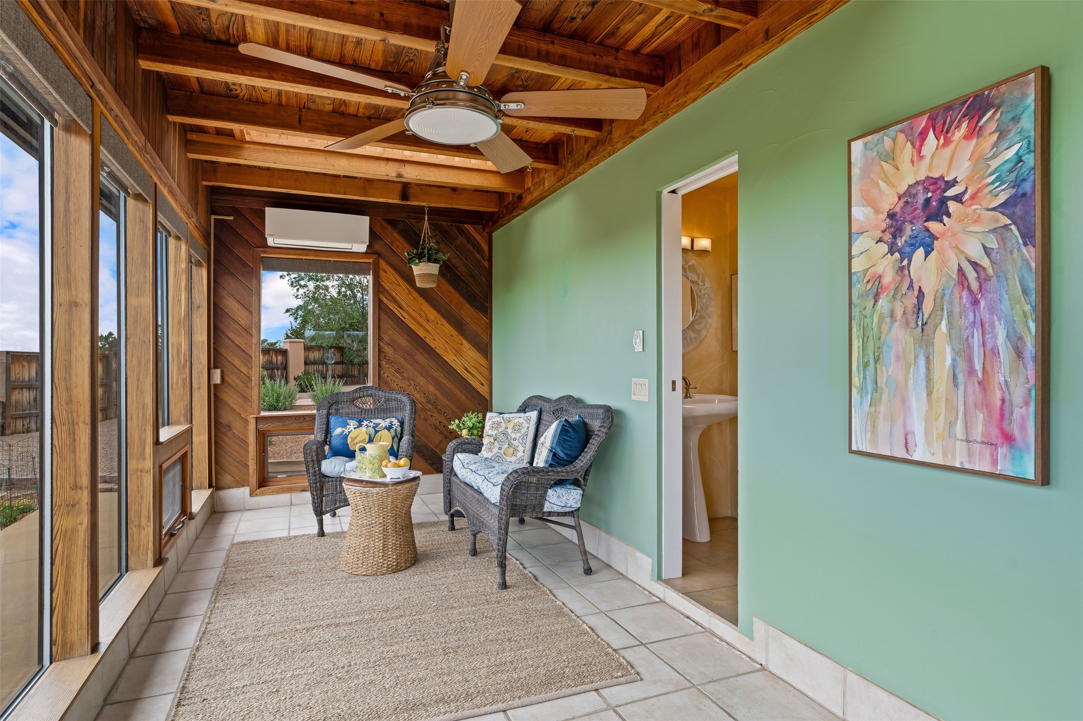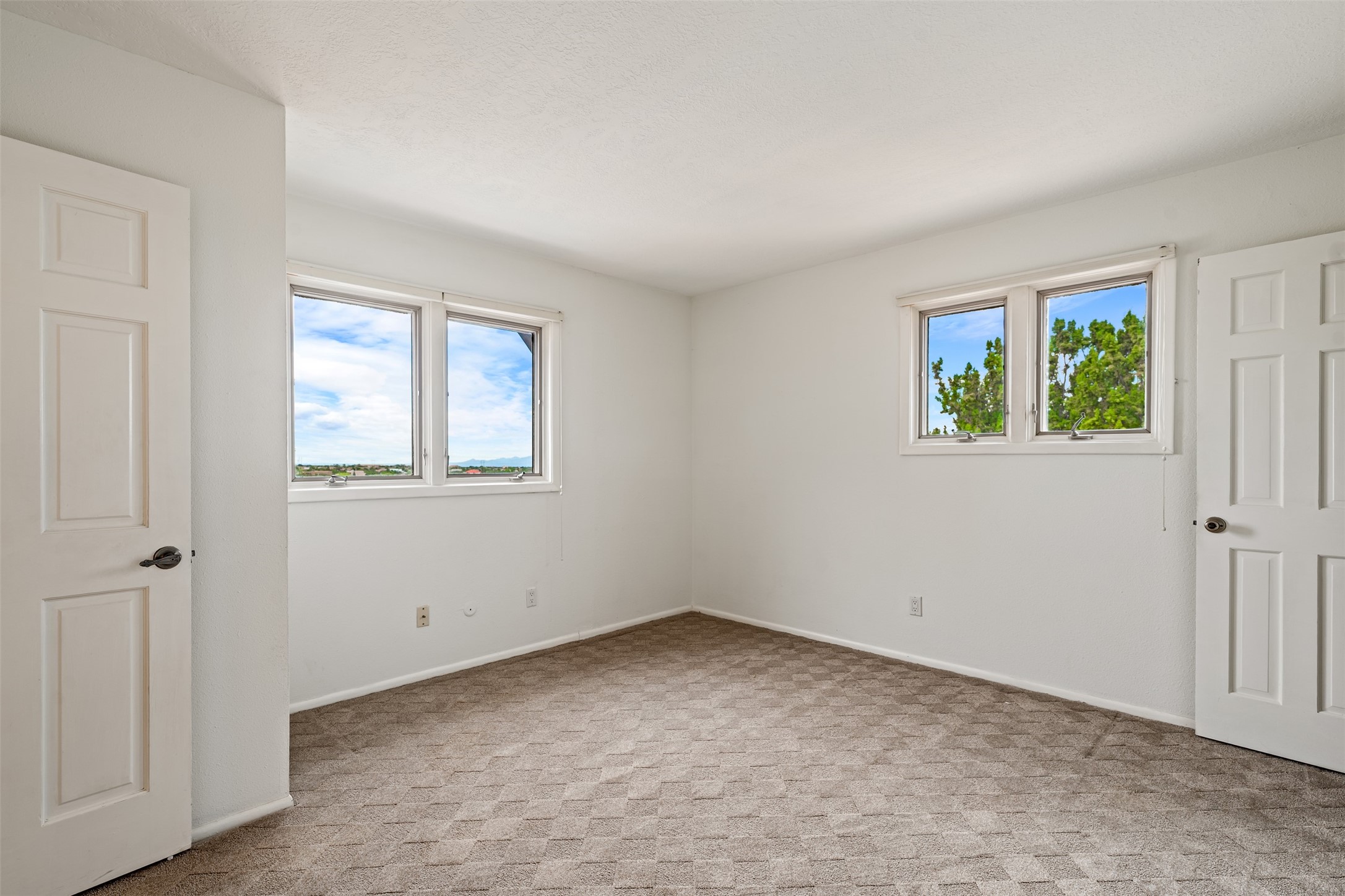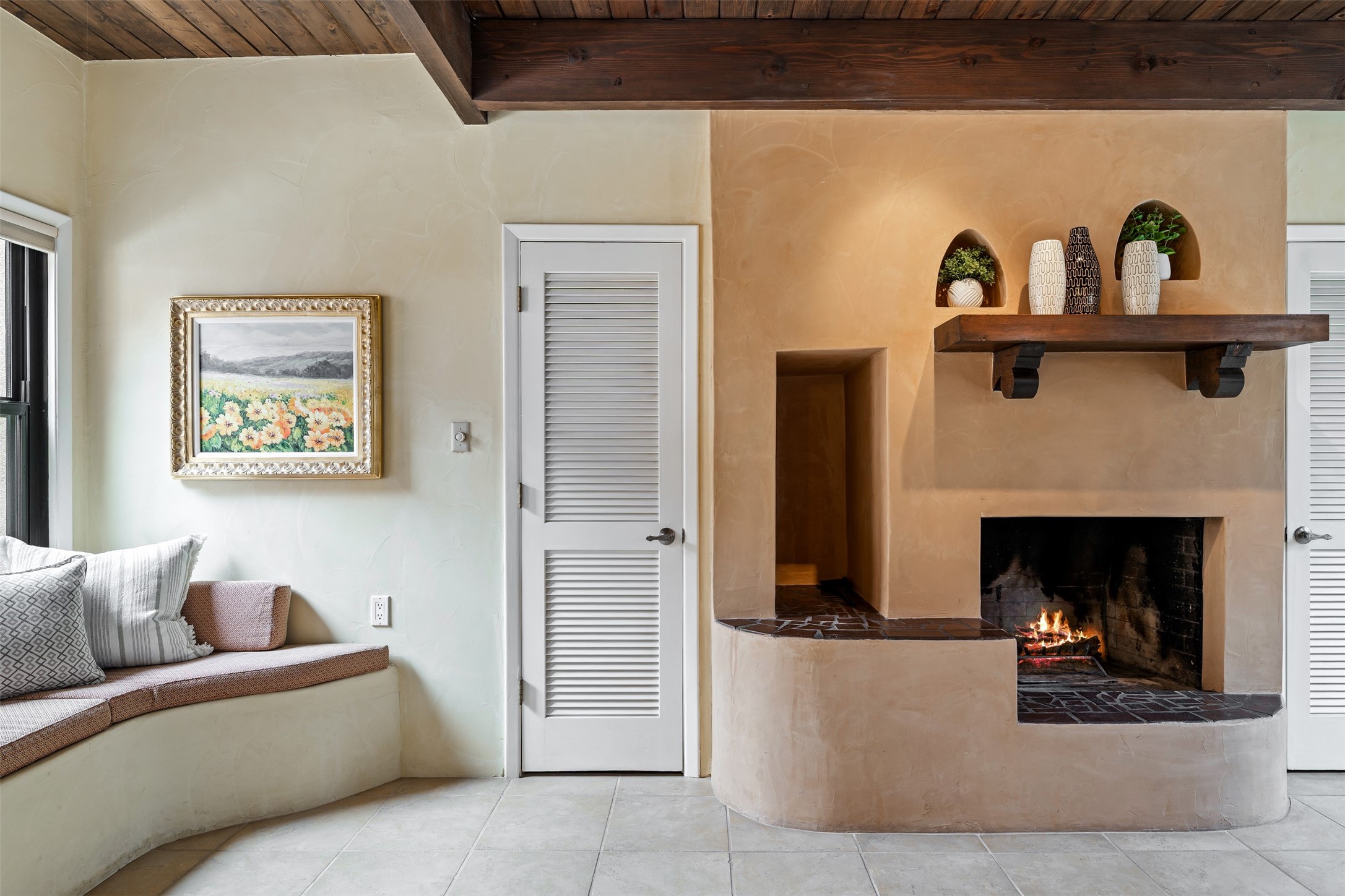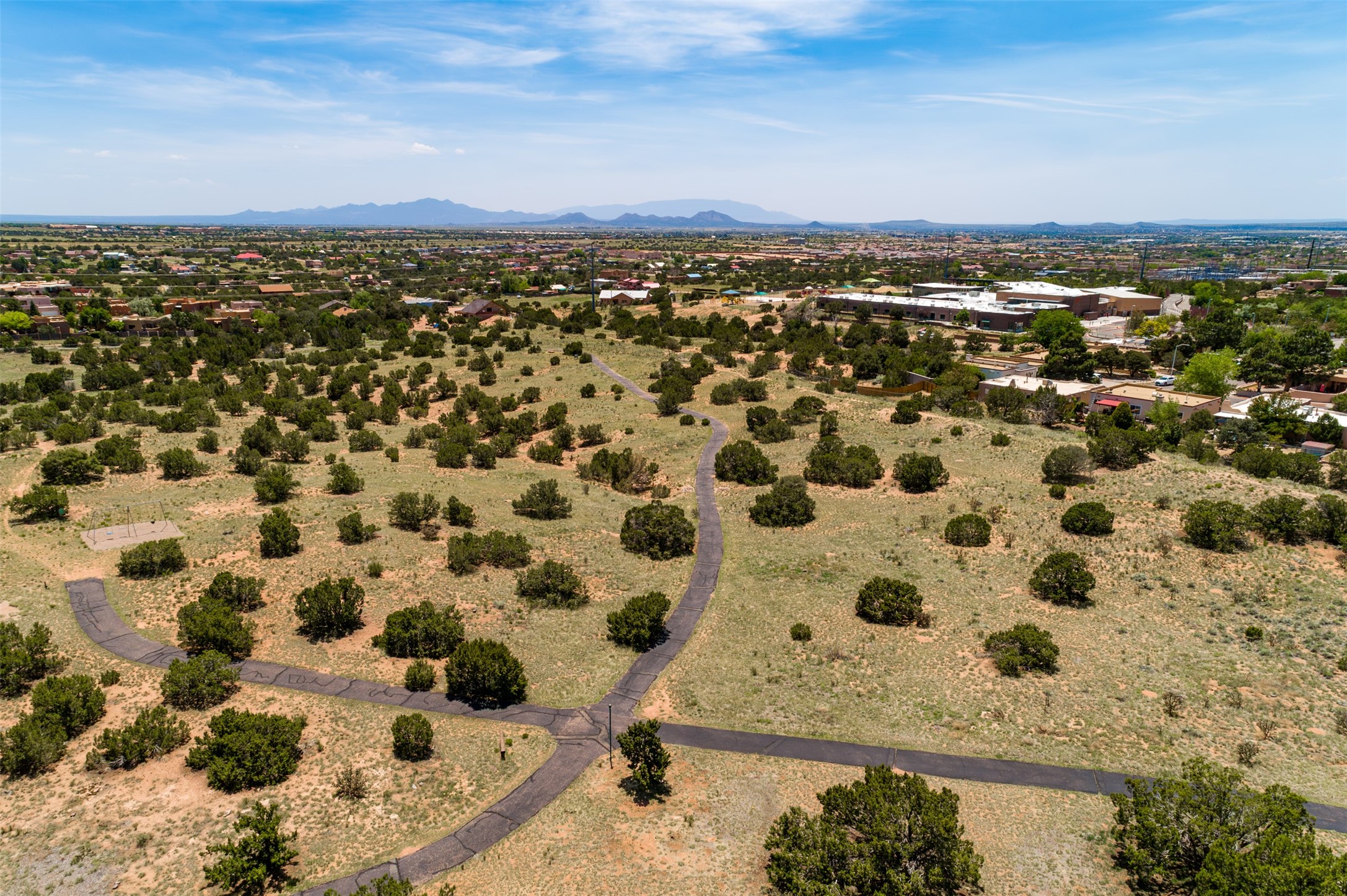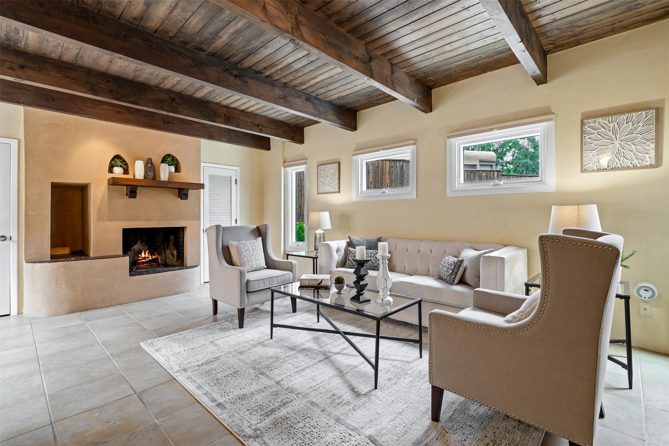 Nestled amid sweeping views and exquisite natural surroundings, this remarkable 4-bedroom, two story, home is a serene and sustainable retreat with a perfect blend of comfort, character, and eco-conscious upgrades. The luxurious, newer (2020) 600 sq ft primary suite on the main floor offers privacy and indulgence, complete with its own mini-split system, a spa-like bathroom, and direct access to outdoor living spaces. Three additional bedrooms are upstairs, where a sunny second-floor deck invites morning coffee or sunset unwinding.Skylights throughout the home bathe the interiors in natural light, highlighting thoughtful details like American clay walls, wood-beamed ceilings, and not one, but two fireplaces--including a charming corner Kiva in the dining room and a striking centerpiece hearth in the living room with a cozy built-in window seat.The bright, eat-in kitchen is a delight with newer appliances, abundant cabinetry, a classic white subway tile backsplash, and views that inspire. Comfort is ensured year-round with two-zone HVAC, refrigerated A/C, mini-splits, and tankless hot water in both upstairs baths.Outside, this home continues to impress with lush xeriscaping, a fenced garden area, and a fully fenced yard. A detached two-car garage includes an extra storage room, while multiple portals and decks provide ideal spots for dining, relaxing, or stargazing. Eco-conscious buyers will appreciate the complete solar electric system and 900-gallon rainwater catchment.This home is a rare find--where views, design, and sustainability come together in perfect harmony.This home is tucked away at the end of a cul-de-sac, with acres of open space and walking trails behind the house. Park Plazas has 8-9 miles of hiking trails, tennis courts, a community garden and is an oasis in the center of Santa Fe close to restaurants, shopping and other amenities, Don't miss this spectacular home in this wonderful neighborhood.