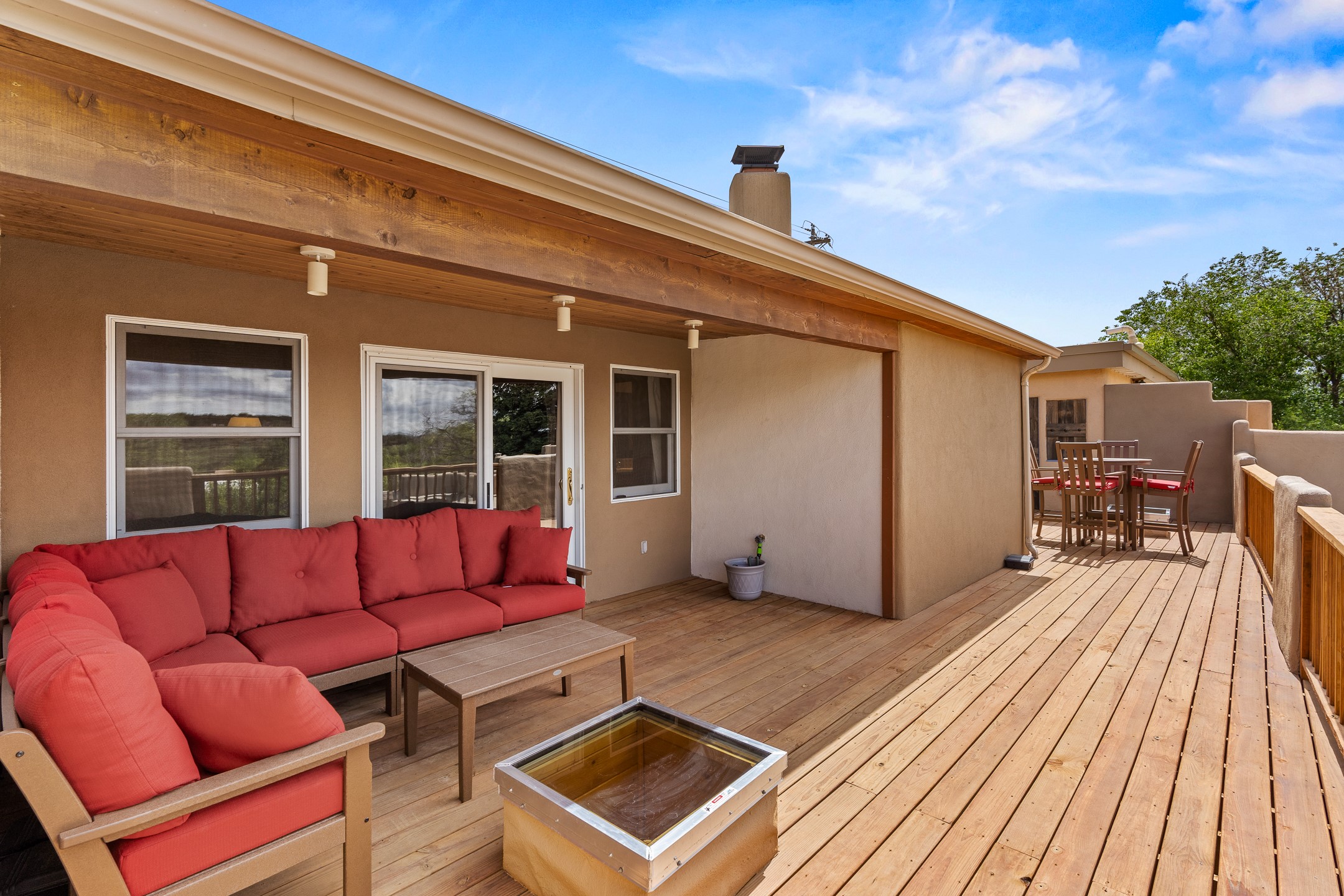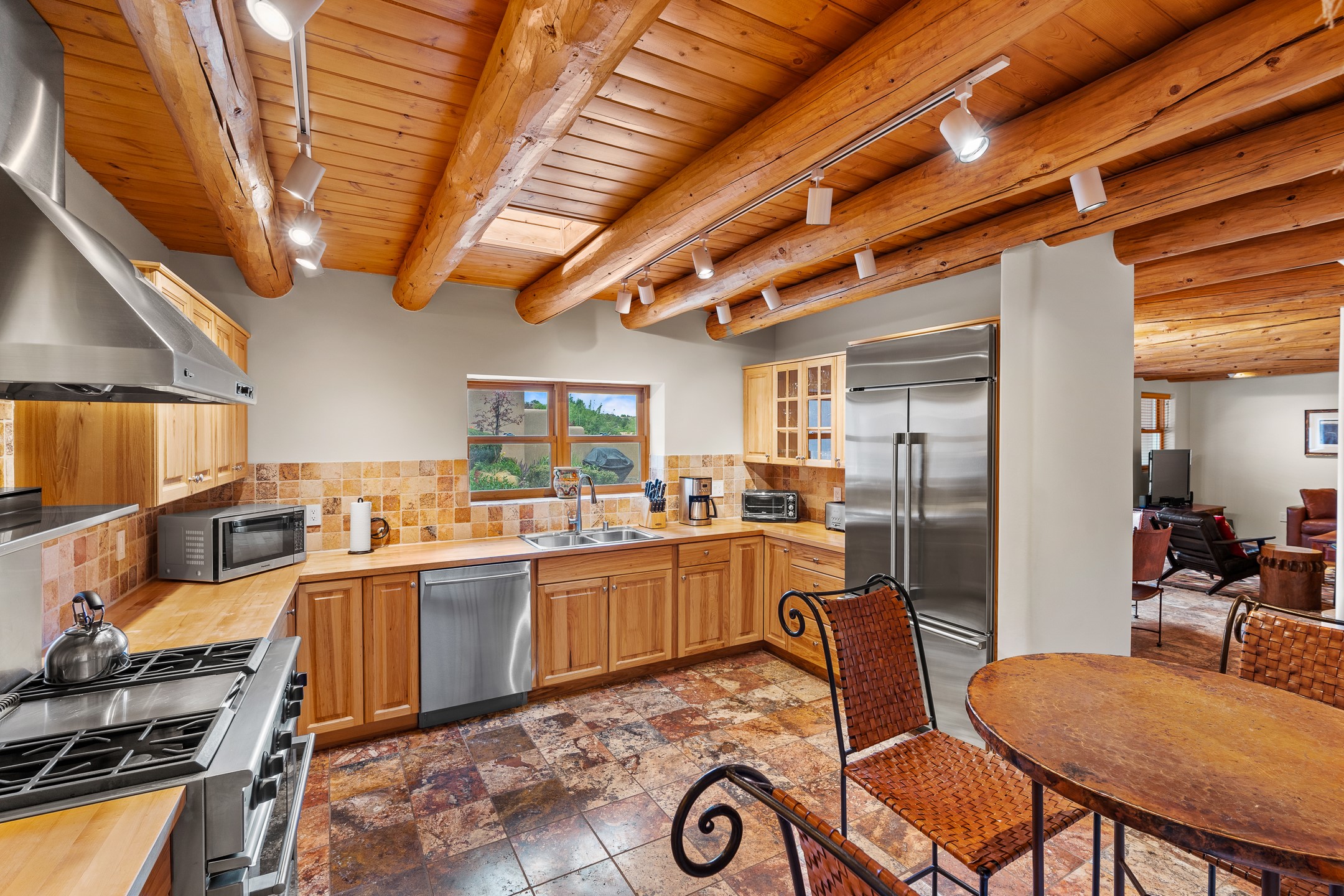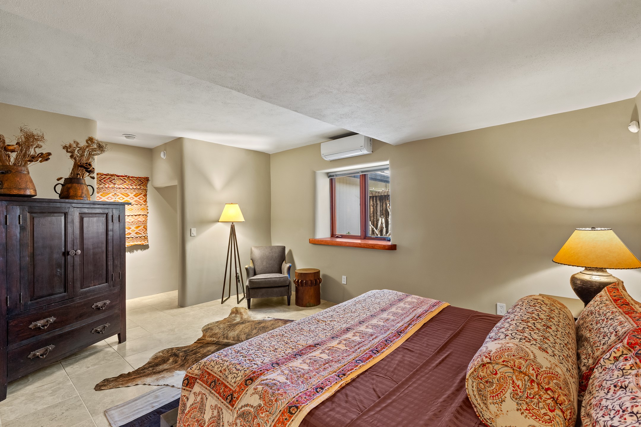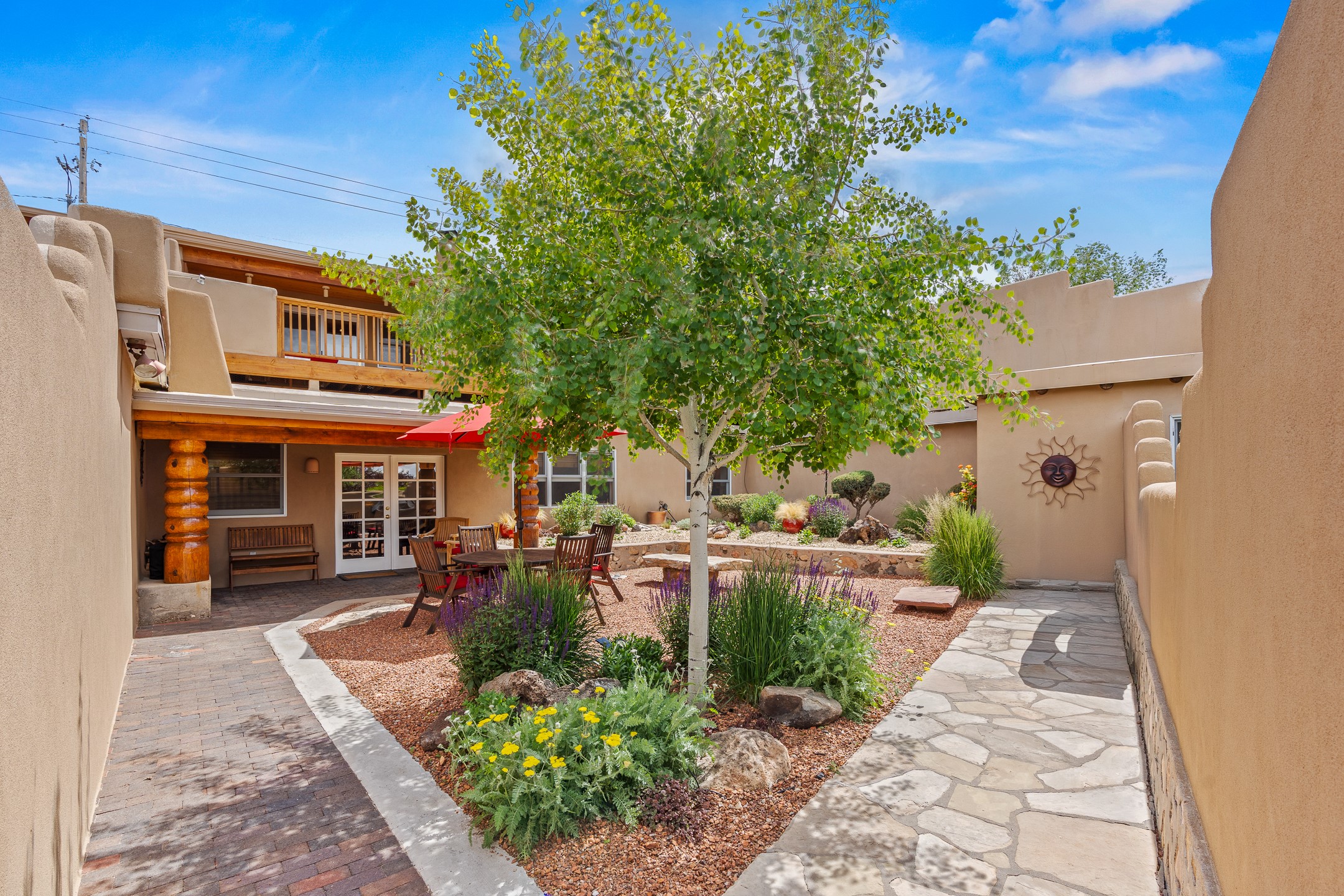 This Historic Eastside home is in the gated Girard Gardens Compound located a block from the Canyon Road arts district. It consists of a beautifully appointed main home and a guest casita. The casita has the possibility of being used as a wonderful studio, home office space or as an income generating rental. The location of this property has close proximity to all Santa Fe has to offer. Hiking, skiing, mountain biking, along with the fabulous restaurants and cultural activities for which it is famous. Mountain views from the expansive upstairs deck, a large private outdoor garden space. 3 large bedrooms, 3.5 bathrooms with ample closet space. The fully equipped kitchen has stainless appliances and is a bright welcoming space for the cook in the family. A detached garage is included with the main home. The guest casita has its own parking space. This is a turn-key sale which includes all designer selected furnishings.