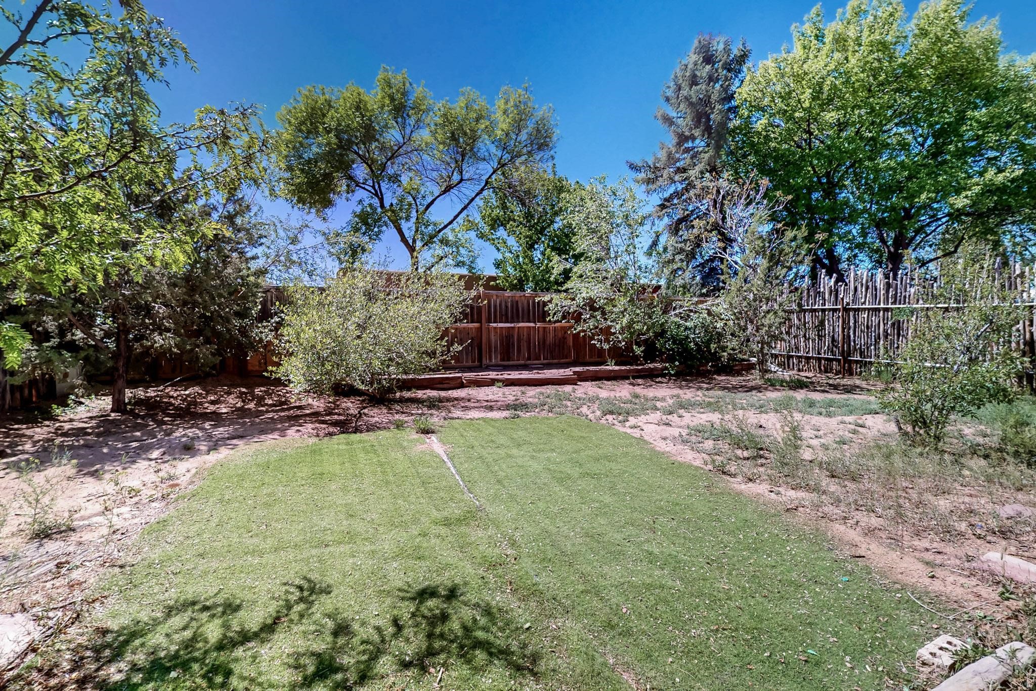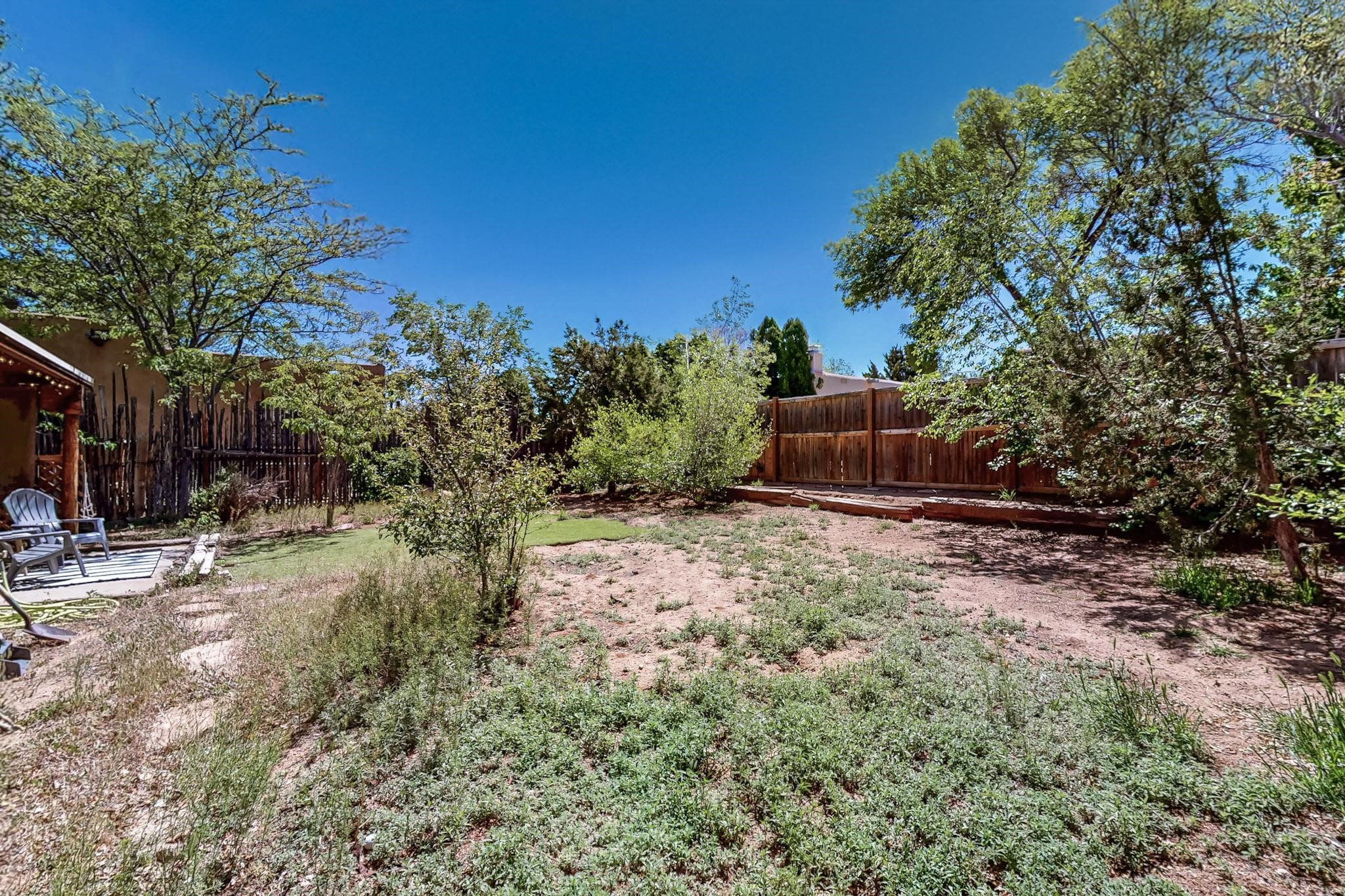 Charming 2-bedroom home in beautiful Santa Fe! This cozy retreat features classic Southwestern details including viga ceilings, tile floors, three skylights that fill the space with natural light and a stunning kiva fireplace. The kitchen opens to the dining area, creating a warm and functional layout. The second bedroom offers cozy carpeting, while the primary bath boasts a custom steam shower with three luxury shower heads! A large walk-in closet completes the master retreat. Step outside to an open patio and oversized backyard, ideal for entertaining or relaxing under the Santa Fe sky. A true blend of comfort and New Mexico charm!