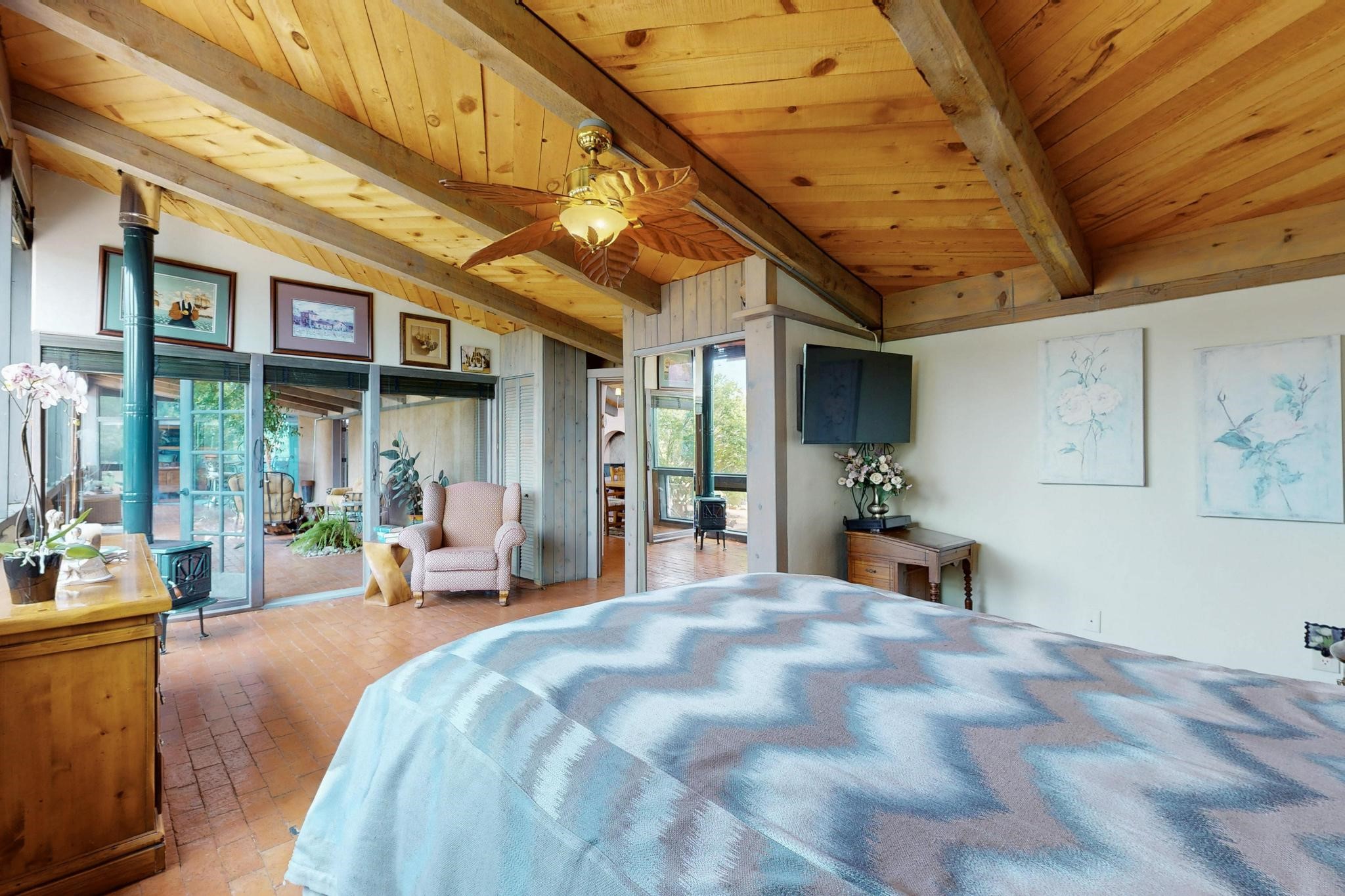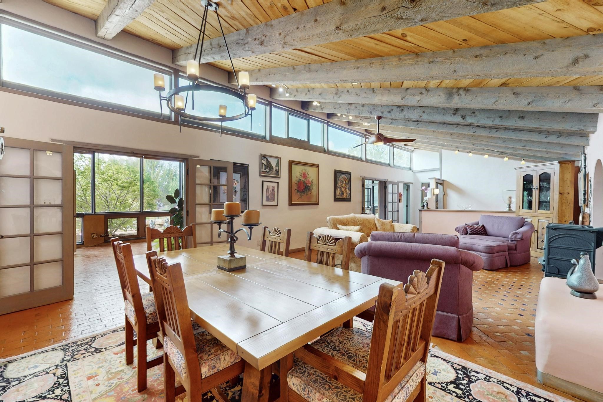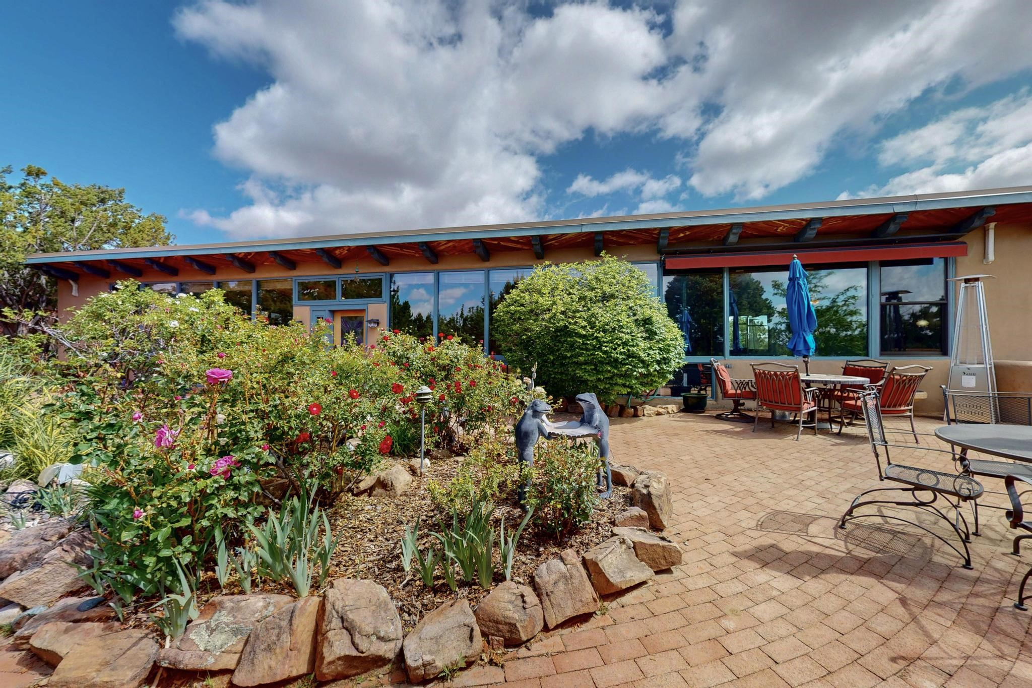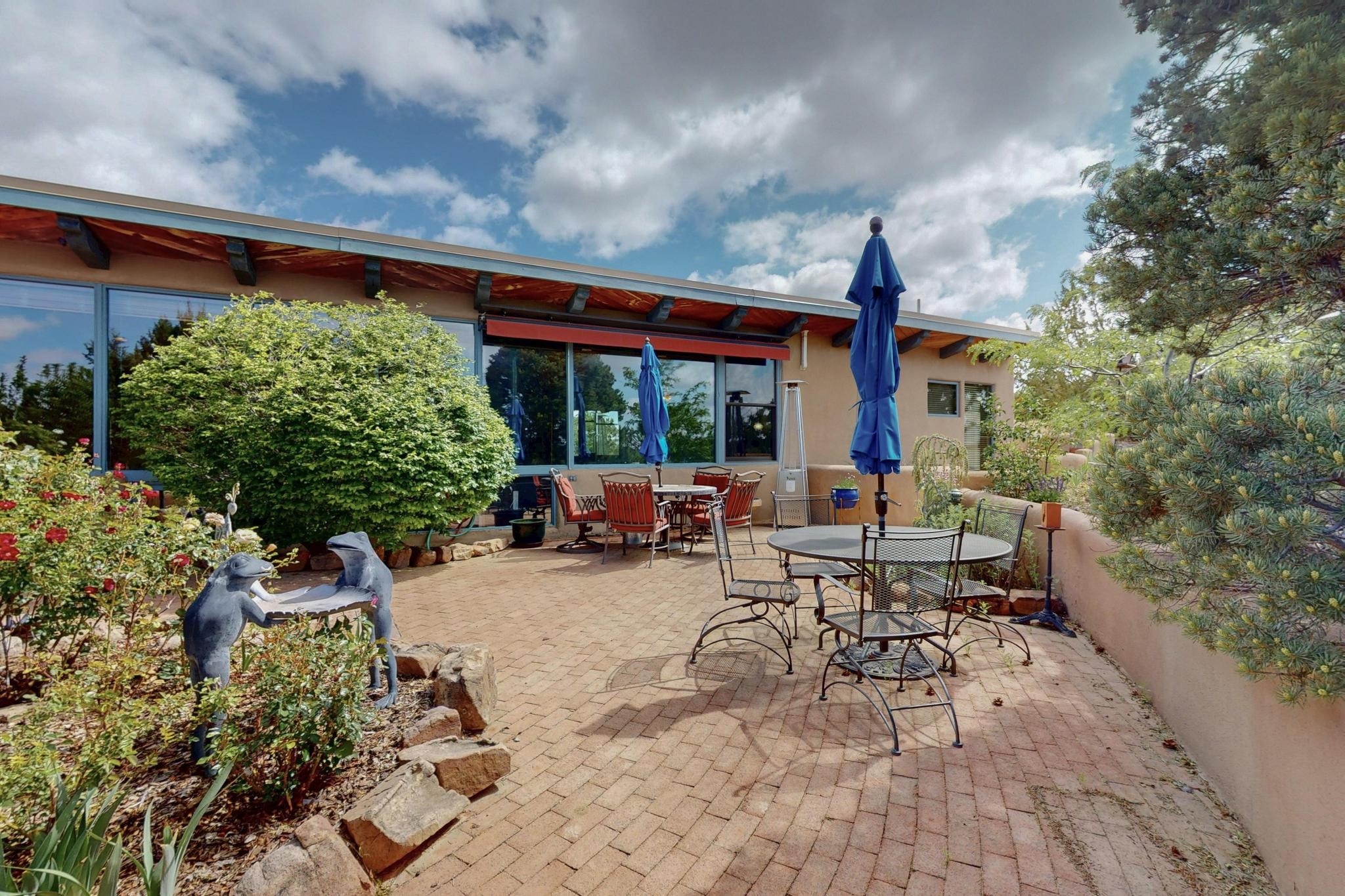 First time on the market! One-of-a-kind pitched roof propanel passive solar beauty with Old World Charm. Like a Swiss Chalet with a dash of Mid-Century Modern. A rarity in Eldorado! Set back off the road on a circular drive, with nary a house in sight, is this gorgeously maintained and landscaped 1.50 acre lot replete with a bubbling Koi and goldfish pond. A multitude of exterior dining and entertaining areas. Meander through the totally dripped irrigated garden which leads the way into a sun drenched, and massive, brick floor Atrium. In fact, the whole house has brick floors and Post and Beam high ceilings with French doors galore! Oversized Living/Dining room with floor to ceiling windows and remote controlled blinds. The wood stove has a catalytic converter which keeps the room toasty through those long winter nights with an 75% to 81% efficiency rating. Split bedroom floor plan. A fabulous Master with a Vermont casting wood stove, en-suite bath with an on-demand gas water heater and a remote controlled awning to keep the bright morning light at bay. Ginormous cedar closet in dressing room/walk-in closet which is the size of a NYC studio apartment! Both the Living Room and Bedrooms have mini-splits and ceiling fans. European-style kitchen has a warming drawer, open shelving and tons of cupboards. A wonderful long pantry with a utility area and space for all your pots, pans, spices and sundries. Outside the kitchen door is a dedicated gas connection for the BBQ. A long and wide two car detached tandem garage has tons of storage and a climate controlled wine room suitable for hundreds of bottles. One of a kind unique beauty.There's nothing like it!