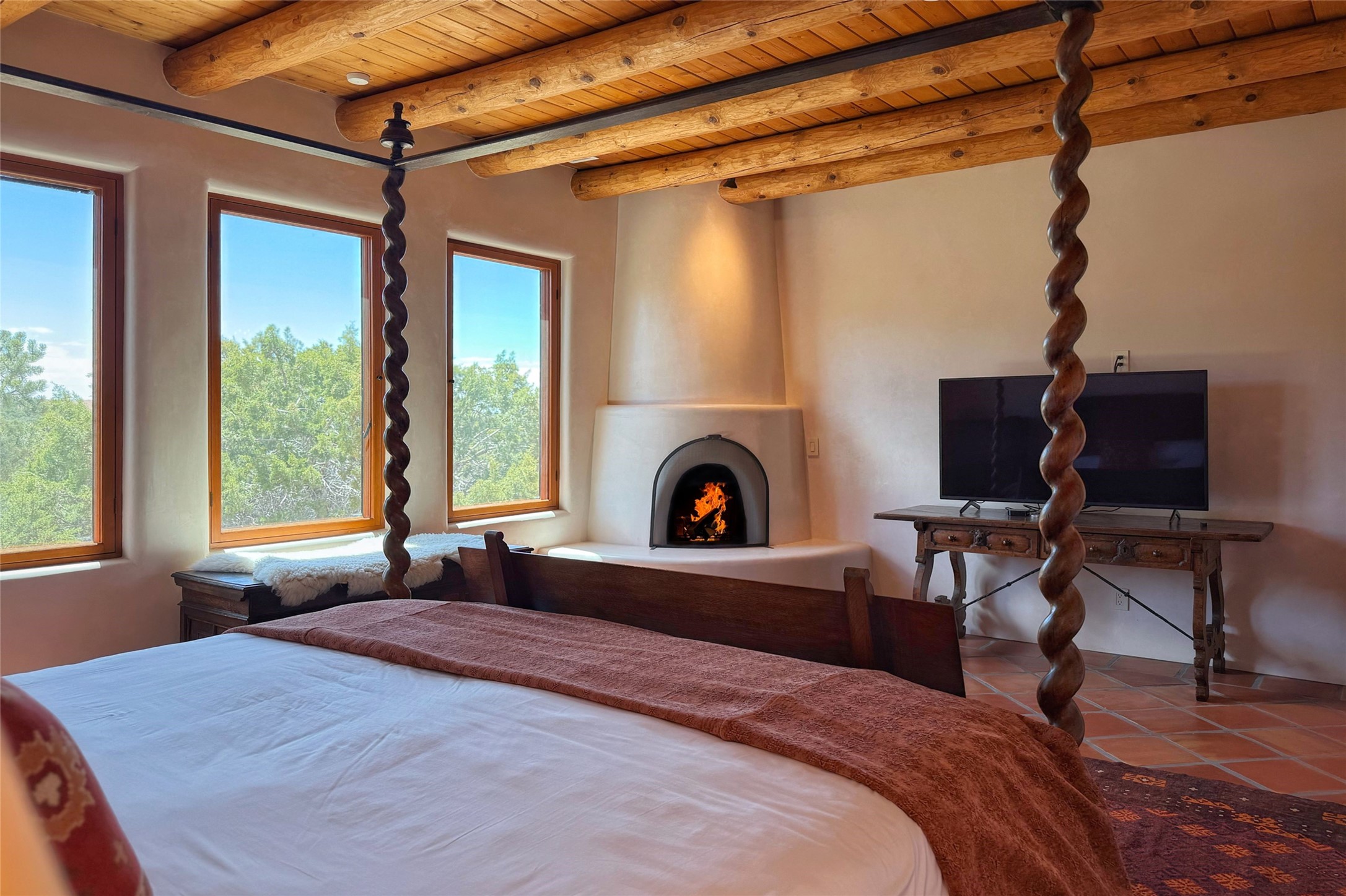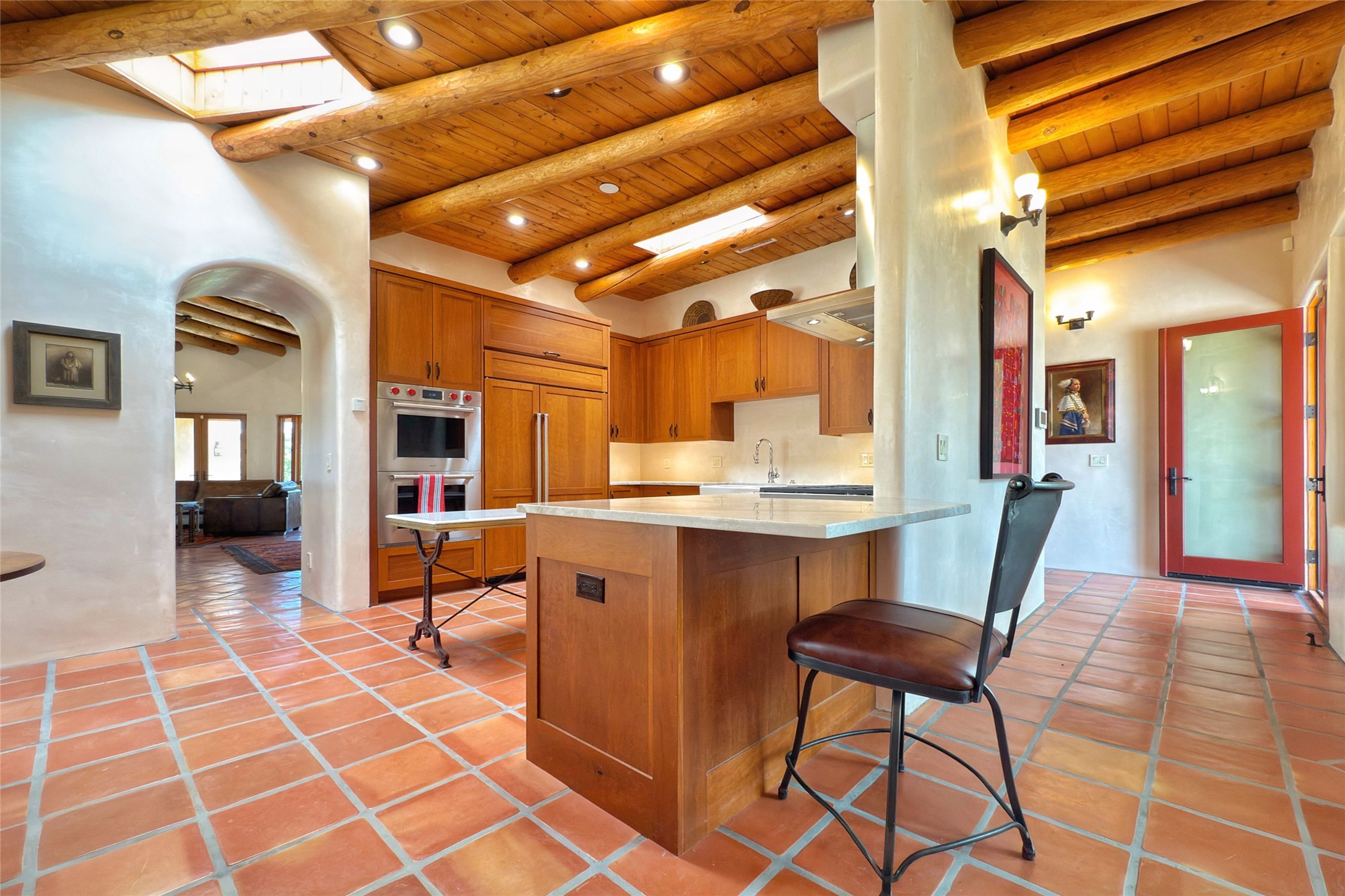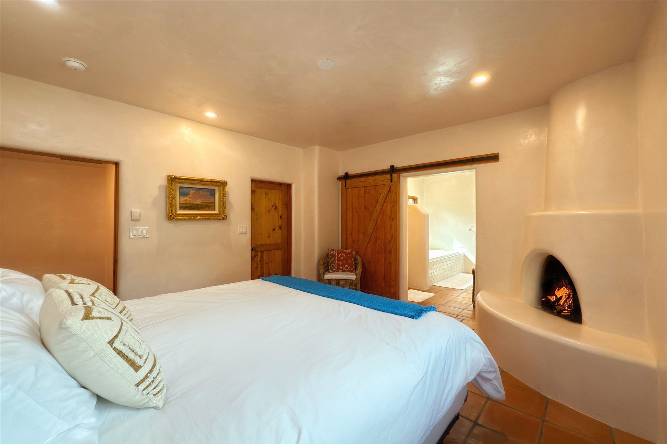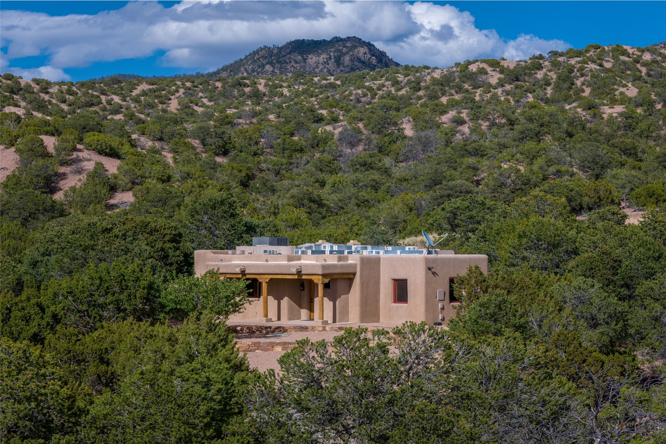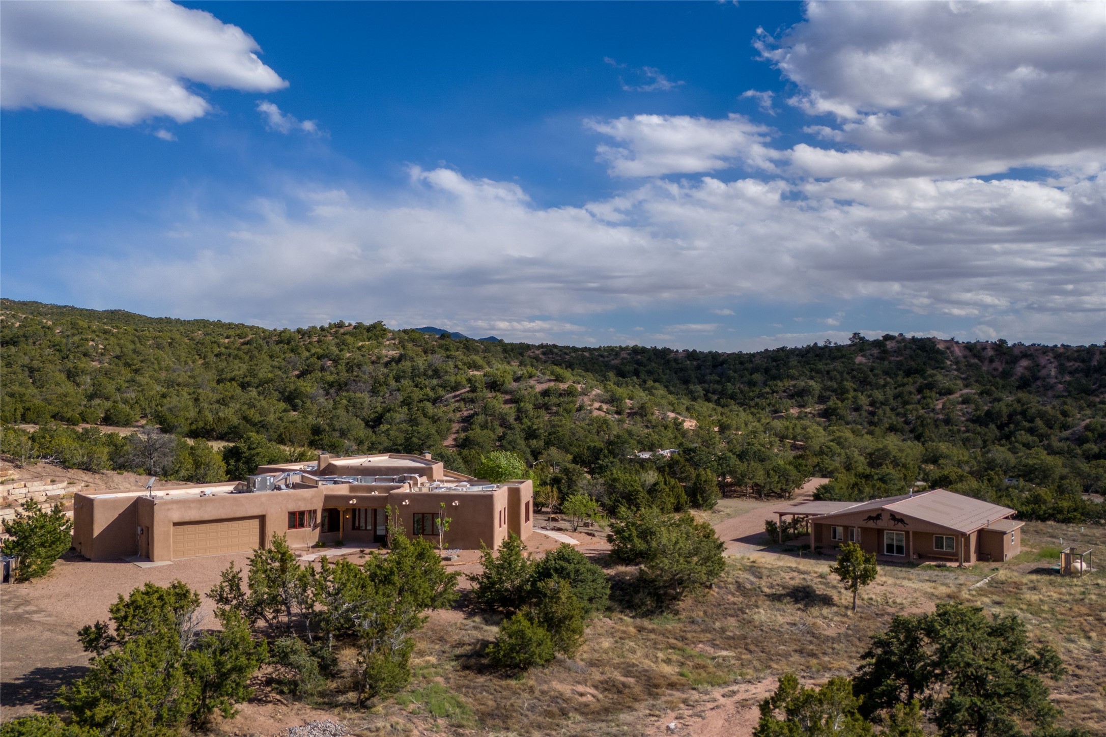 Southwest Elegance Meets Modern Luxury - Tesuque Estate Near Santa FeExperience timeless charm and refined upgrades in this exceptional Tesuque estate just 15 minutes from downtown Santa Fe. The property includes a beautifully renovated main house, a private guesthouse, and a versatile third structure ideal as a studio, barn, or additional guest quarters.The main residence showcases superior craftsmanship with diamond plaster walls, Loewen windows and doors, and Saltillo tile floors. The chef's kitchen features SubZero and Wolf appliances, an Asko dishwasher, an imported porcelain farmhouse sink, and striking Taj Mahal quartz countertops. The great room impresses with soaring ceilings, dual chandeliers, a wood-burning fireplace, and expansive western views, flowing onto two covered flagstone patios--perfect for indoor-outdoor living.The primary suite offers a luxurious retreat with its own fireplace, a spa-like bath with soaking tub, walk-in shower, dual pedestal sinks, and an adjacent study with fireplace and patio access. Two additional bedrooms complete the home--one with ensuite bath, the other with access to a nearby half bath. Comforts include radiant floor heating and central A/C.The guesthouse offers two bedrooms and two baths, with upgrades mirroring the main home: diamond plaster walls, quartz countertops, radiant heating, central A/C, and Loewen windows. Its primary suite features a kiva fireplace, soaking tub, and walk-in shower, while the second bedroom enjoys tranquil western views. A cozy living/dining area with kiva fireplace and a private flagstone patio complete the space.Set on a beautifully landscaped lot with mature junipers, fenced areas, and irrigated gardens, this private estate offers peace and elegance just minutes from the heart of Santa Fe.