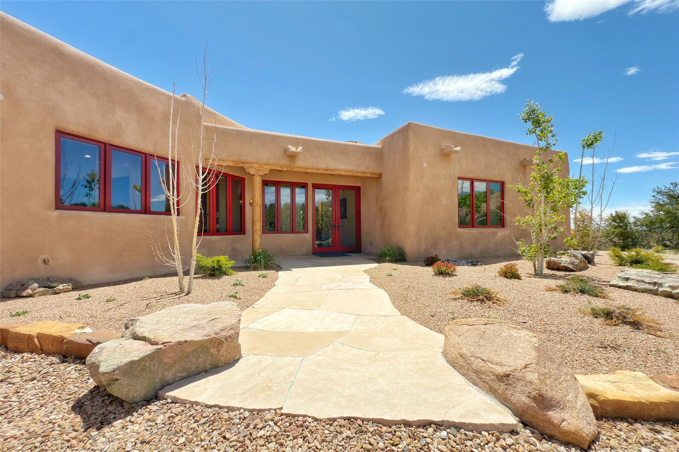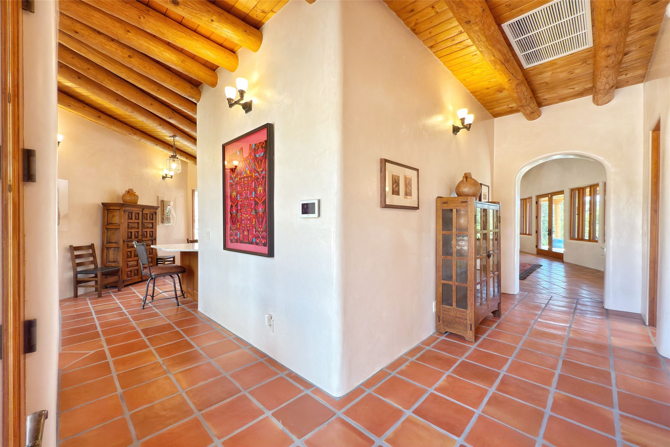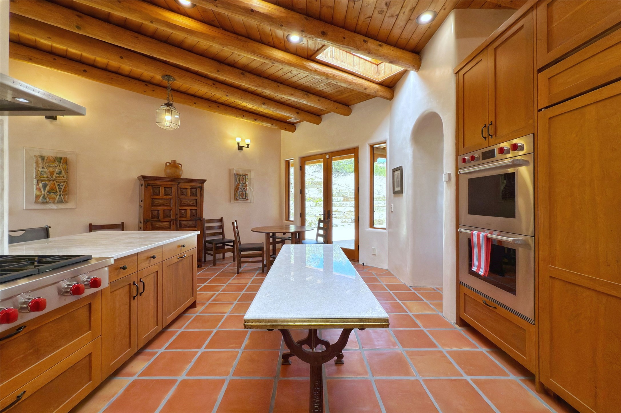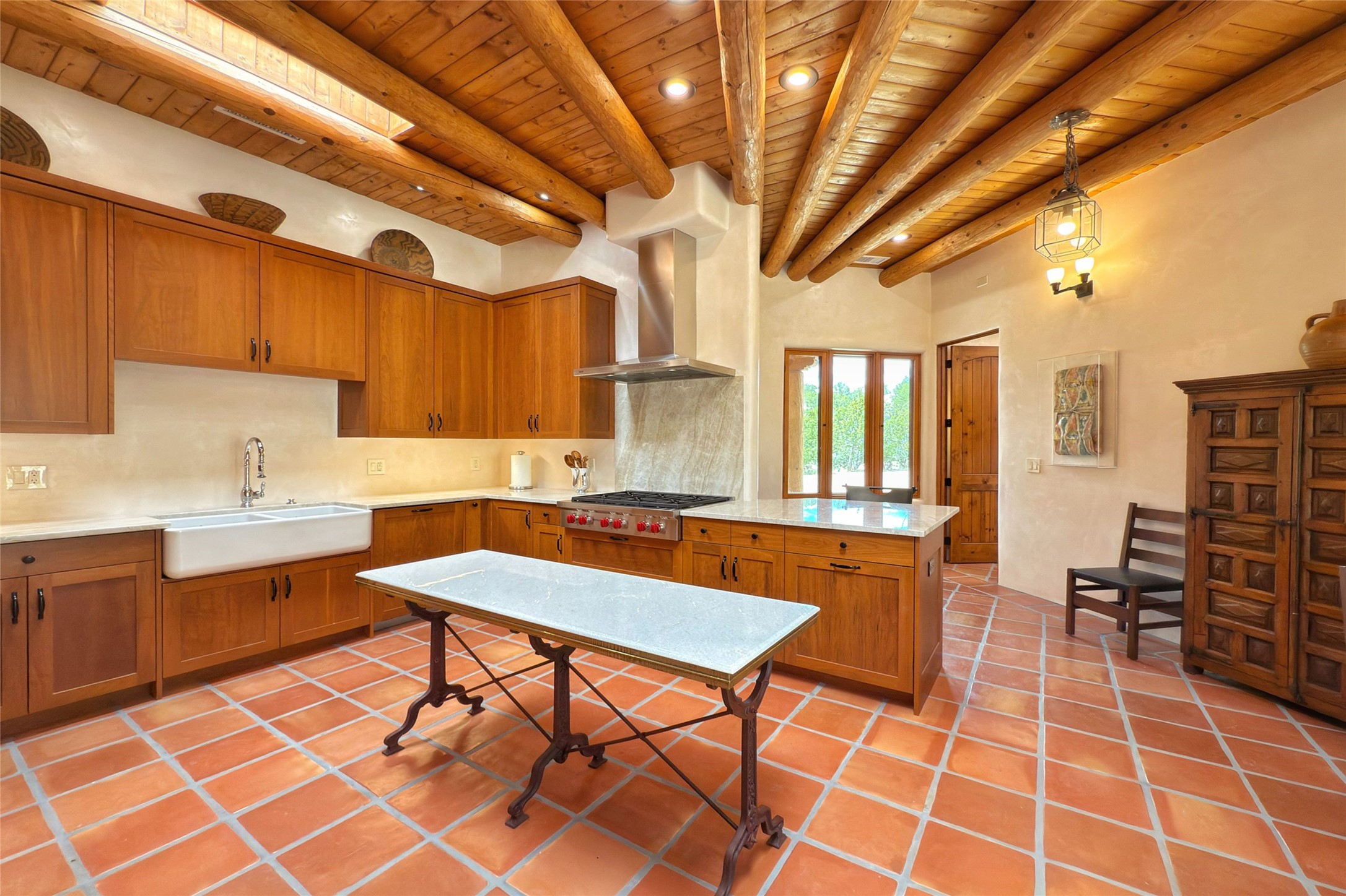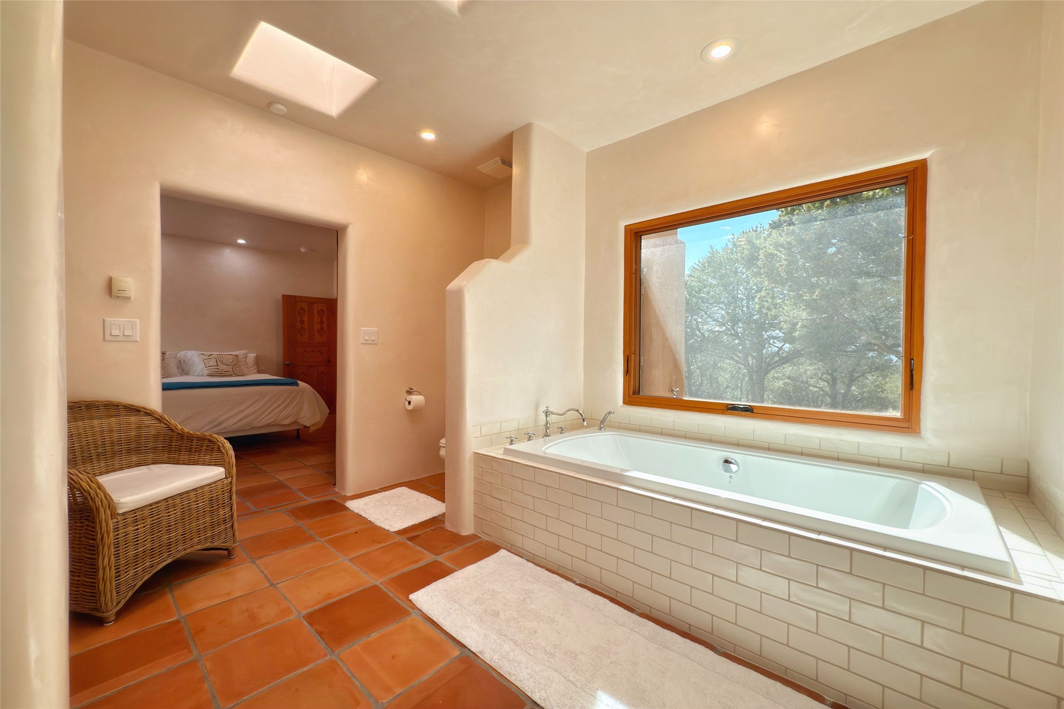 Southwest Elegance Meets Modern Luxury - Tesuque Estate Near Santa FeExperience timeless charm and refined upgrades in this exceptional Tesuque estate just 15 minutes from downtown Santa Fe. The property includes a beautifully renovated main house, a private guesthouse, and a versatile third structure ideal as a studio, barn, or additional guest quarters.The main residence showcases superior craftsmanship with diamond plaster walls, Loewen windows and doors, and Saltillo tile floors. The chef's kitchen features SubZero and Wolf appliances, an Asko dishwasher, an imported porcelain farmhouse sink, and striking Taj Mahal quartz countertops. The great room impresses with soaring ceilings, dual chandeliers, a wood-burning fireplace, and expansive western views, flowing onto two covered flagstone patios--perfect for indoor-outdoor living.The primary suite offers a luxurious retreat with its own fireplace, a spa-like bath with soaking tub, walk-in shower, dual pedestal sinks, and an adjacent study with fireplace and patio access. Two additional bedrooms complete the home--one with ensuite bath, the other with access to a nearby half bath. Comforts include radiant floor heating and central A/C.The guesthouse offers two bedrooms and two baths, with upgrades mirroring the main home: diamond plaster walls, quartz countertops, radiant heating, central A/C, and Loewen windows. Its primary suite features a kiva fireplace, soaking tub, and walk-in shower, while the second bedroom enjoys tranquil western views. A cozy living/dining area with kiva fireplace and a private flagstone patio complete the space.Set on a beautifully landscaped lot with mature junipers, fenced areas, and irrigated gardens, this private estate offers peace and elegance just minutes from the heart of Santa Fe.
