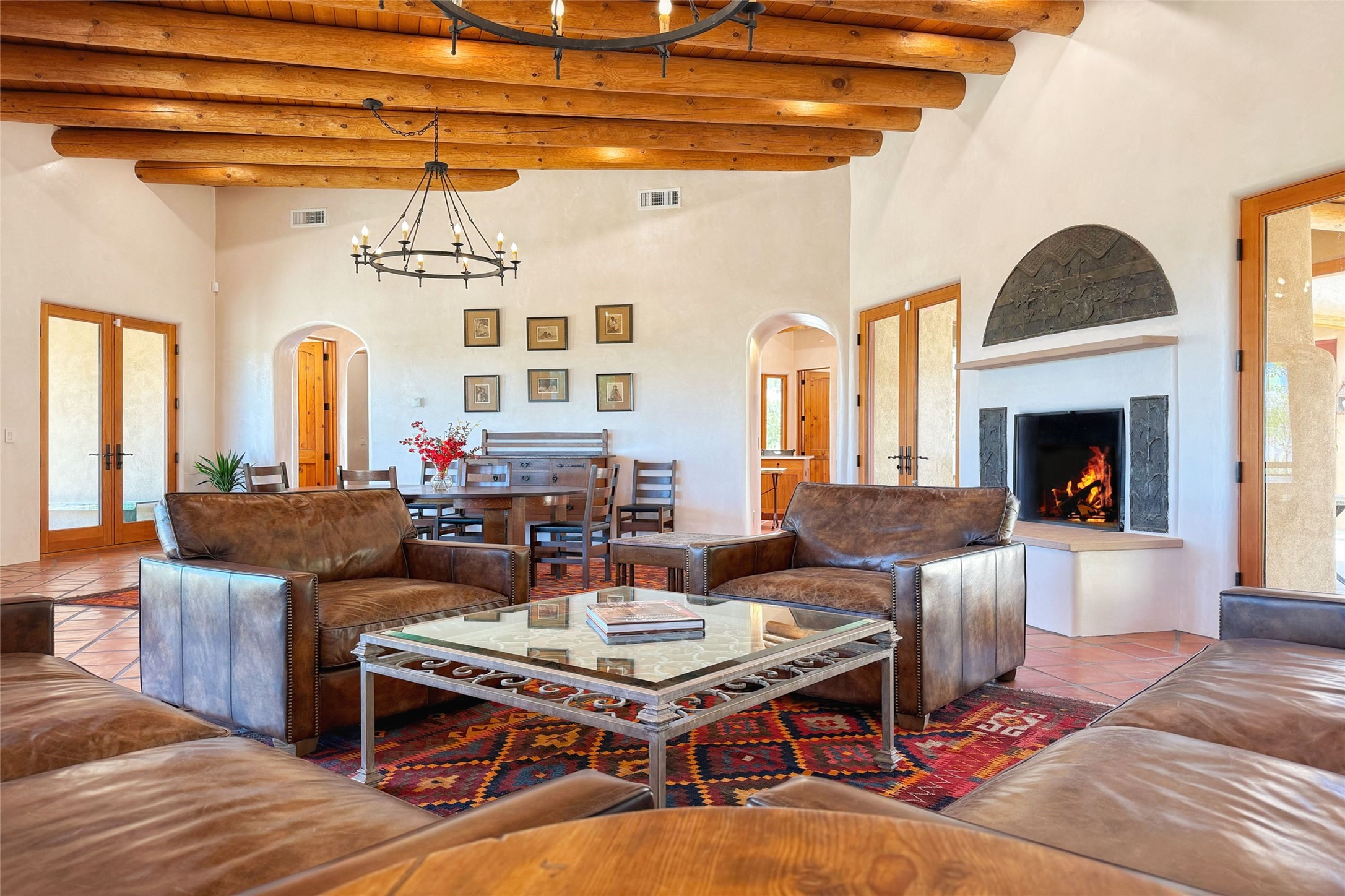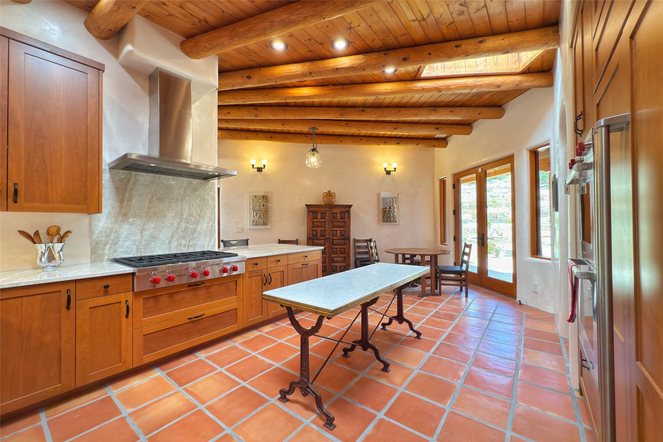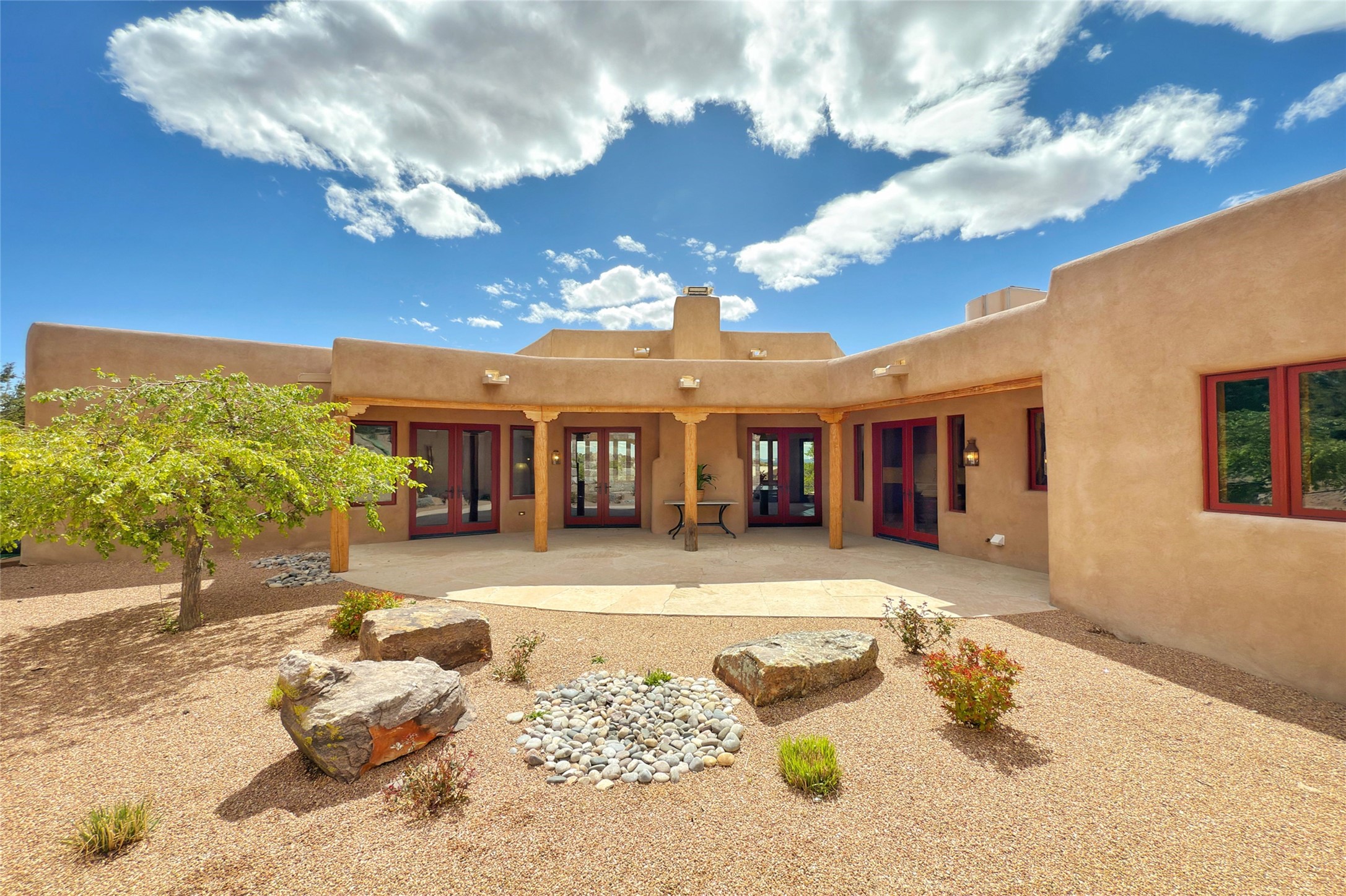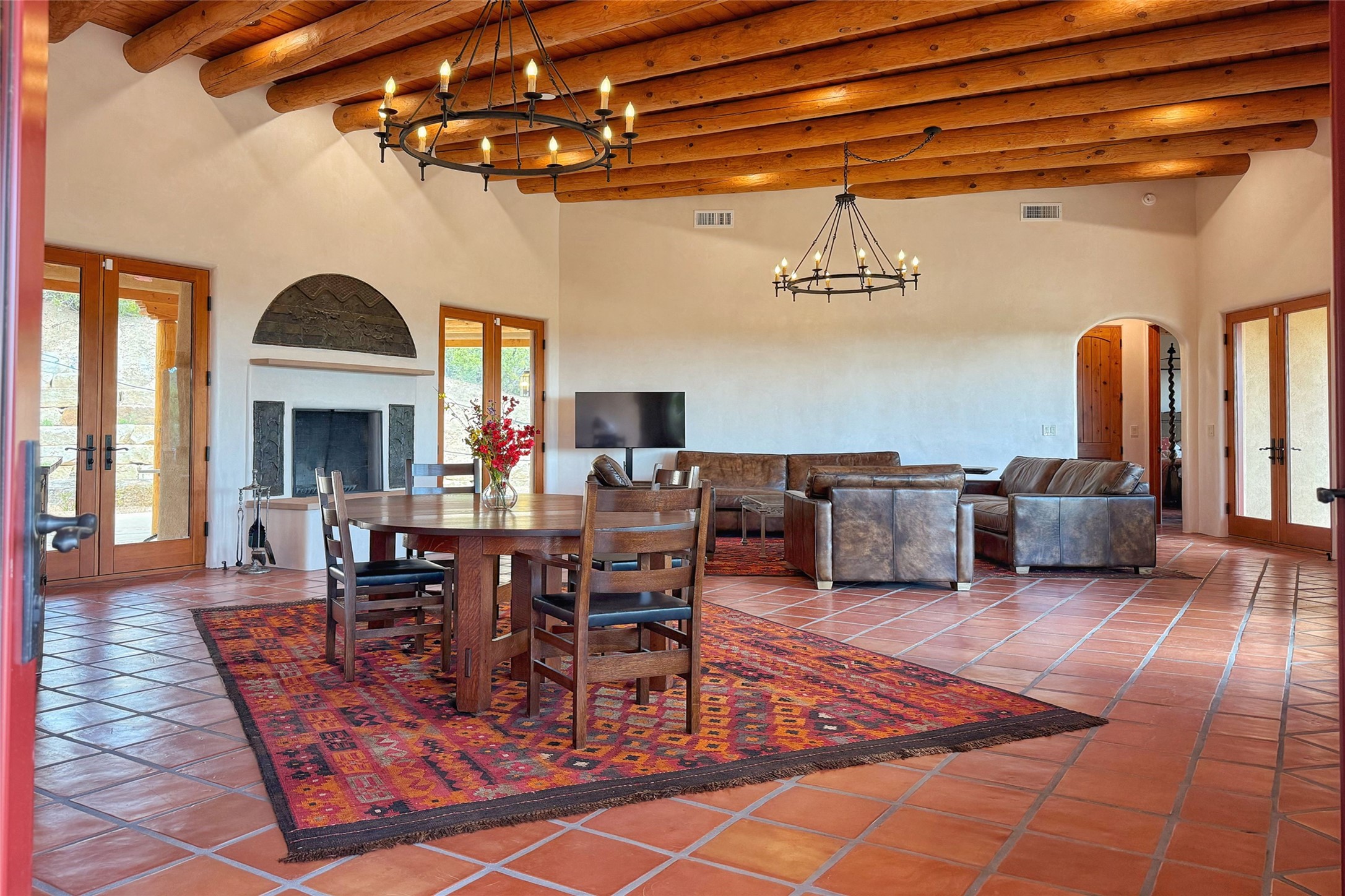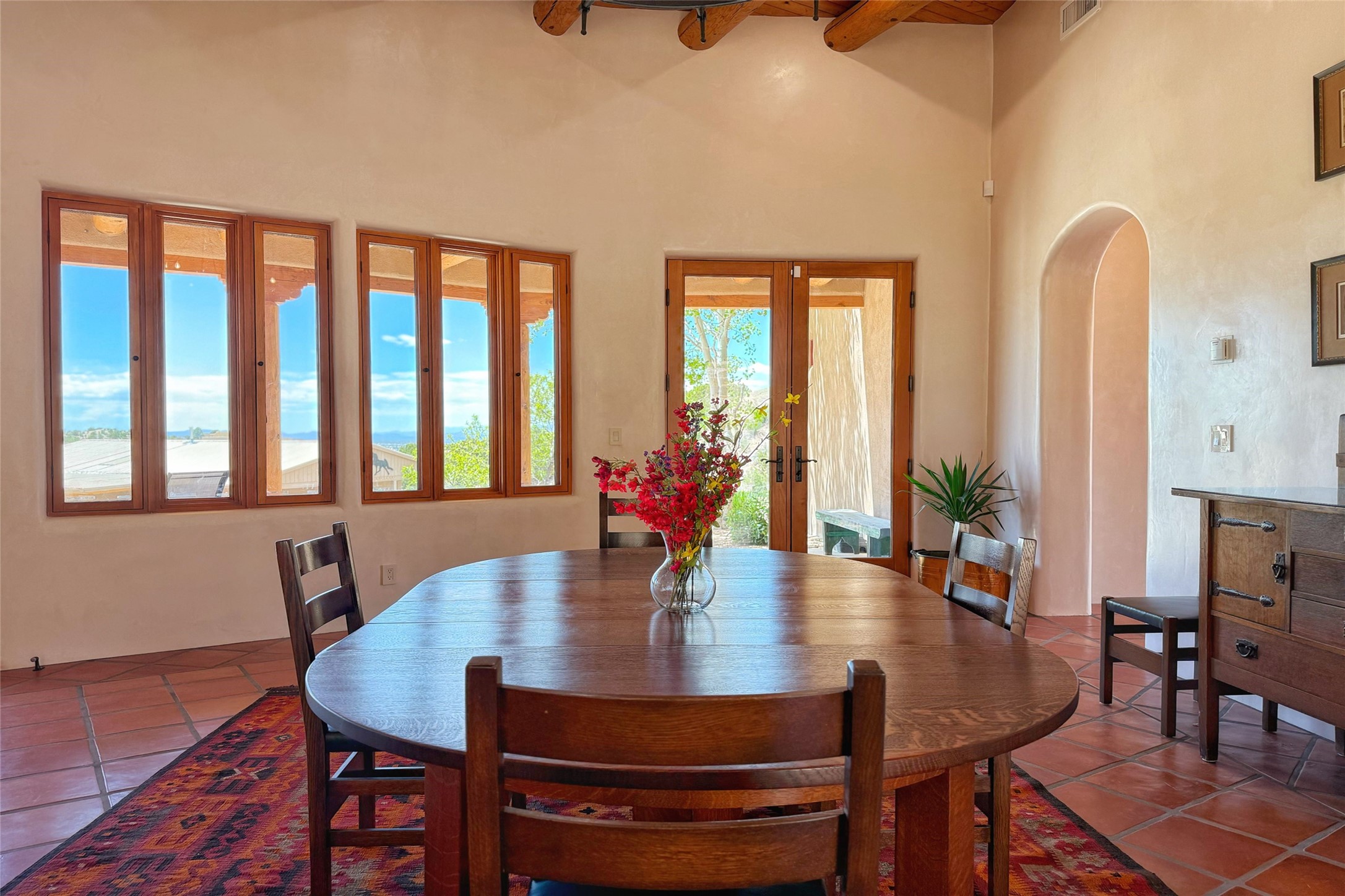 Southwest Elegance Meets Modern Luxury - Tesuque Estate Near Santa FeExperience timeless charm and refined upgrades in this exceptional Tesuque estate just 15 minutes from downtown Santa Fe. The property includes a beautifully renovated main house, a private guesthouse, and a versatile third structure ideal as a studio, barn, or additional guest quarters.The main residence showcases superior craftsmanship with diamond plaster walls, Loewen windows and doors, and Saltillo tile floors. The chef's kitchen features SubZero and Wolf appliances, an Asko dishwasher, an imported porcelain farmhouse sink, and striking Taj Mahal quartz countertops. The great room impresses with soaring ceilings, dual chandeliers, a wood-burning fireplace, and expansive western views, flowing onto two covered flagstone patios--perfect for indoor-outdoor living.The primary suite offers a luxurious retreat with its own fireplace, a spa-like bath with soaking tub, walk-in shower, dual pedestal sinks, and an adjacent study with fireplace and patio access. Two additional bedrooms complete the home--one with ensuite bath, the other with access to a nearby half bath. Comforts include radiant floor heating and central A/C.The guesthouse offers two bedrooms and two baths, with upgrades mirroring the main home: diamond plaster walls, quartz countertops, radiant heating, central A/C, and Loewen windows. Its primary suite features a kiva fireplace, soaking tub, and walk-in shower, while the second bedroom enjoys tranquil western views. A cozy living/dining area with kiva fireplace and a private flagstone patio complete the space.Set on a beautifully landscaped lot with mature junipers, fenced areas, and irrigated gardens, this private estate offers peace and elegance just minutes from the heart of Santa Fe.