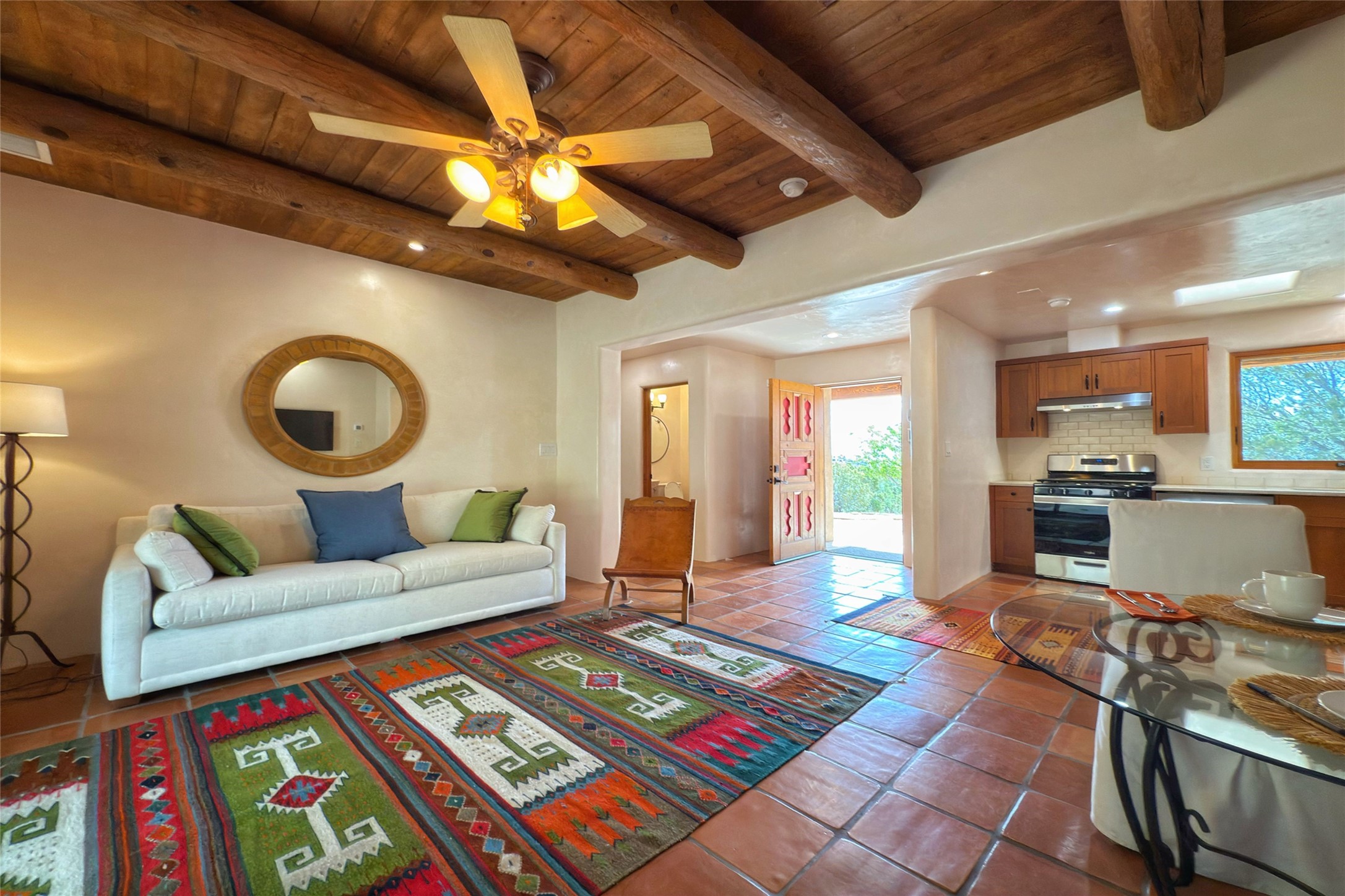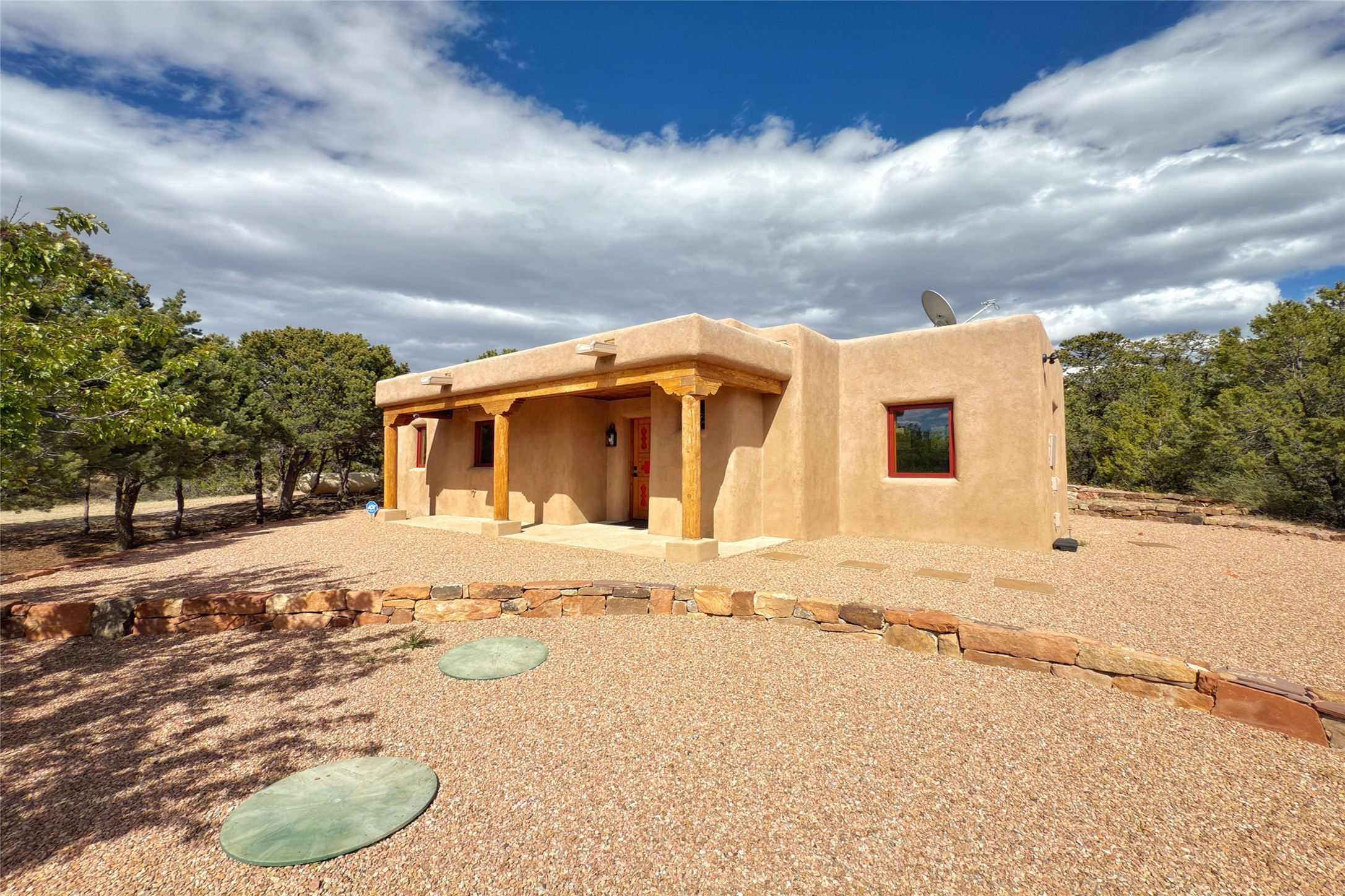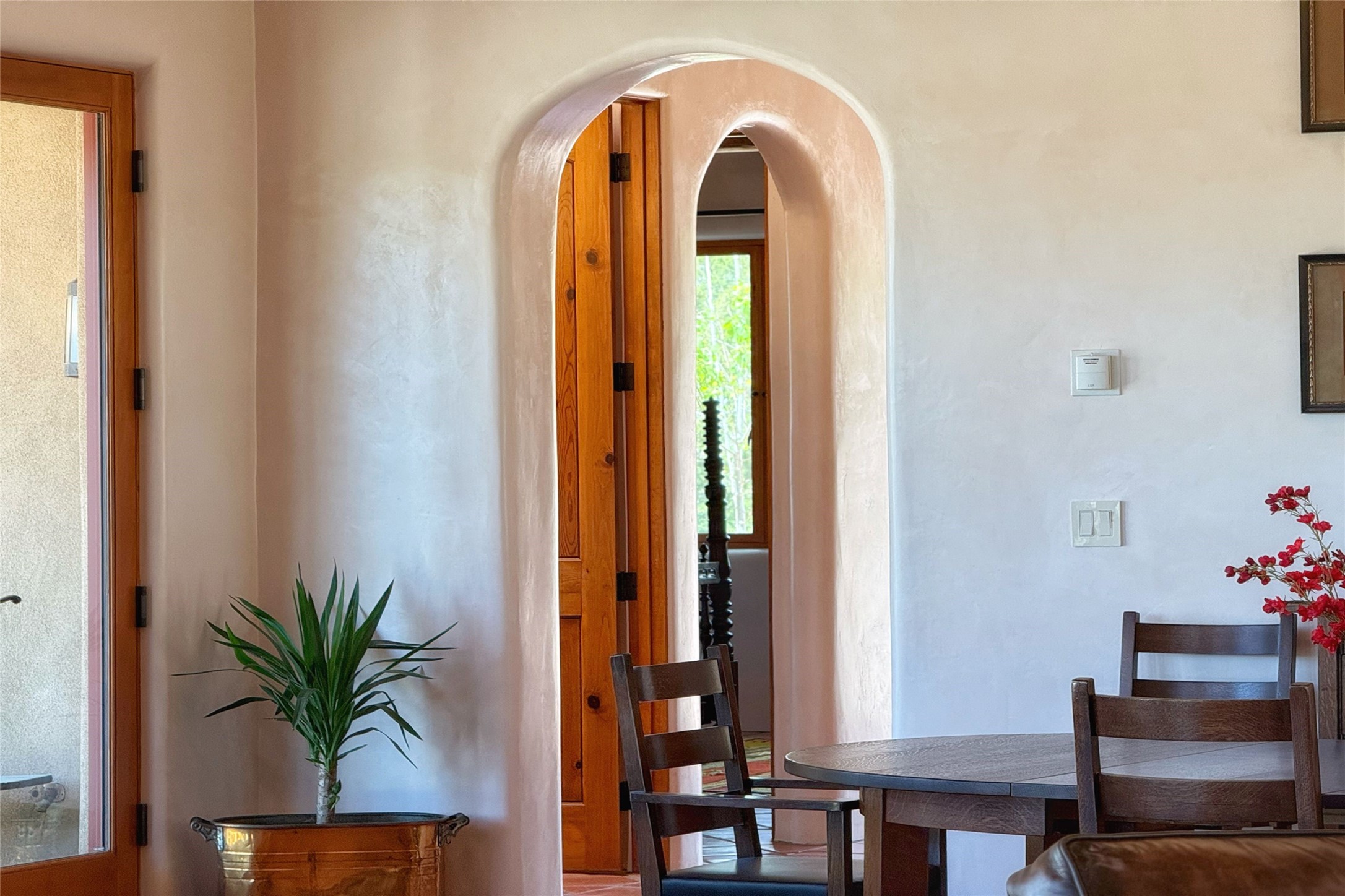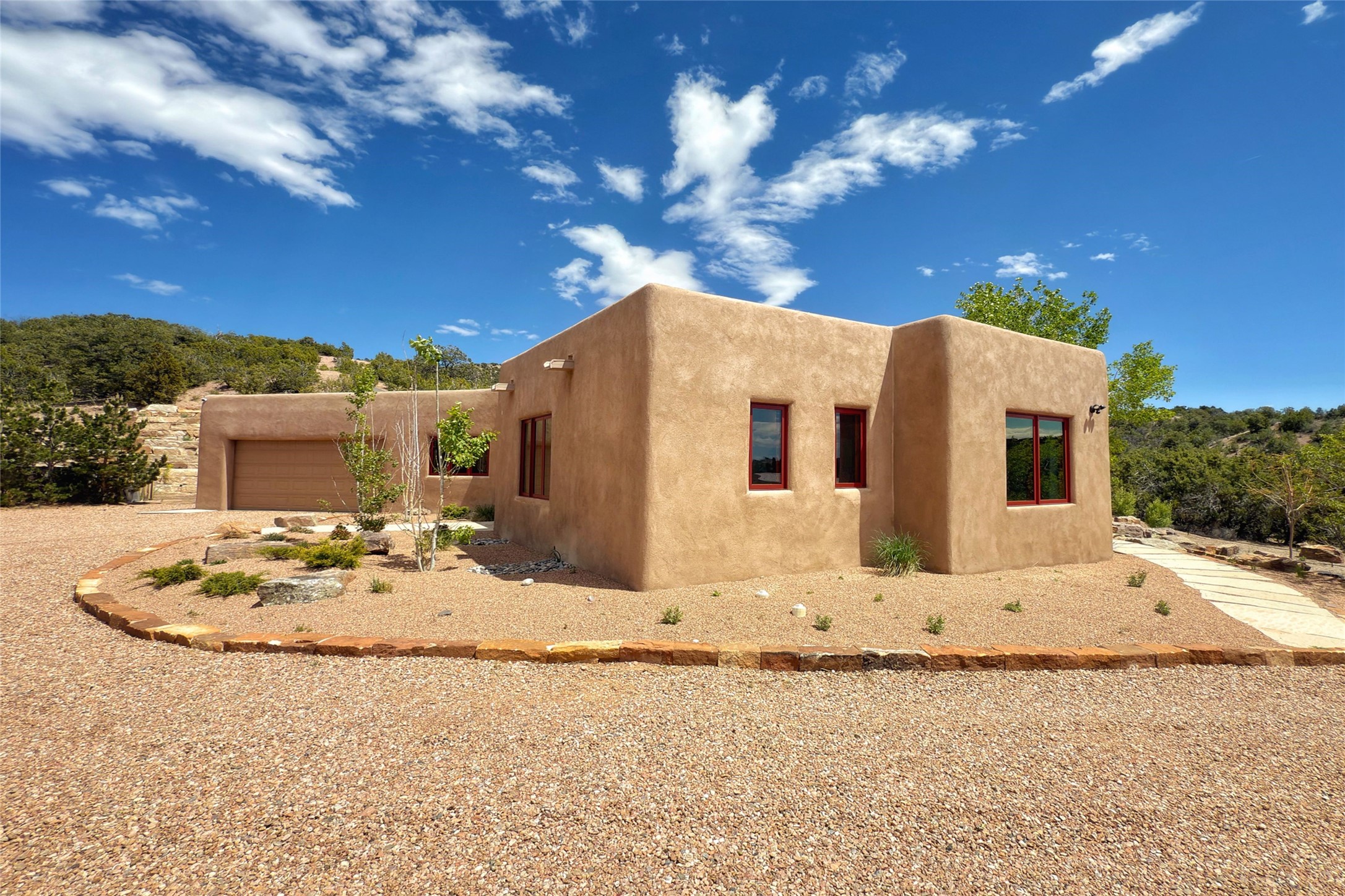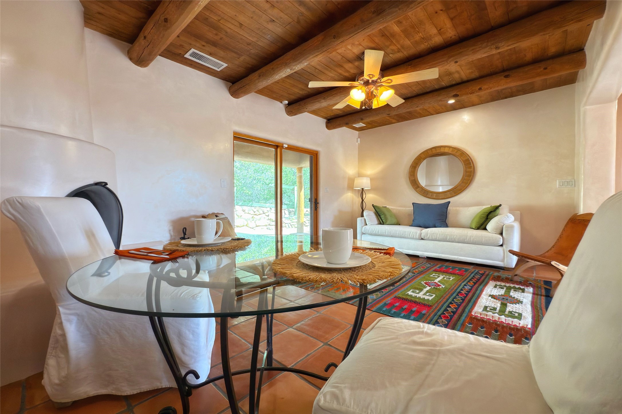 Southwest Elegance Meets Modern Luxury - Tesuque Estate Near Santa FeExperience timeless charm and refined upgrades in this exceptional Tesuque estate just 15 minutes from downtown Santa Fe. The property includes a beautifully renovated main house, a private guesthouse, and a versatile third structure ideal as a studio, barn, or additional guest quarters.The main residence showcases superior craftsmanship with diamond plaster walls, Loewen windows and doors, and Saltillo tile floors. The chef's kitchen features SubZero and Wolf appliances, an Asko dishwasher, an imported porcelain farmhouse sink, and striking Taj Mahal quartz countertops. The great room impresses with soaring ceilings, dual chandeliers, a wood-burning fireplace, and expansive western views, flowing onto two covered flagstone patios--perfect for indoor-outdoor living.The primary suite offers a luxurious retreat with its own fireplace, a spa-like bath with soaking tub, walk-in shower, dual pedestal sinks, and an adjacent study with fireplace and patio access. Two additional bedrooms complete the home--one with ensuite bath, the other with access to a nearby half bath. Comforts include radiant floor heating and central A/C.The guesthouse offers two bedrooms and two baths, with upgrades mirroring the main home: diamond plaster walls, quartz countertops, radiant heating, central A/C, and Loewen windows. Its primary suite features a kiva fireplace, soaking tub, and walk-in shower, while the second bedroom enjoys tranquil western views. A cozy living/dining area with kiva fireplace and a private flagstone patio complete the space.Set on a beautifully landscaped lot with mature junipers, fenced areas, and irrigated gardens, this private estate offers peace and elegance just minutes from the heart of Santa Fe.