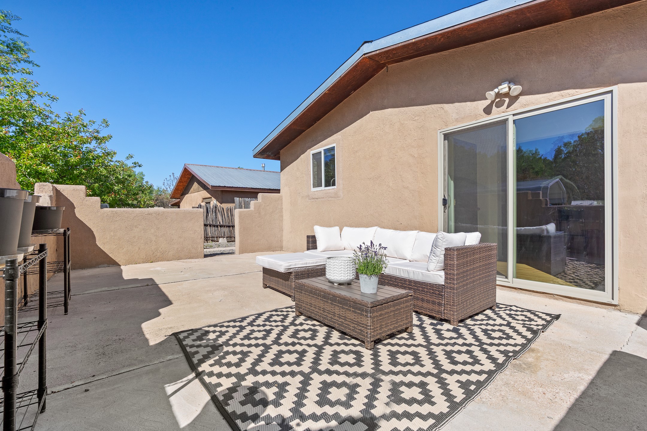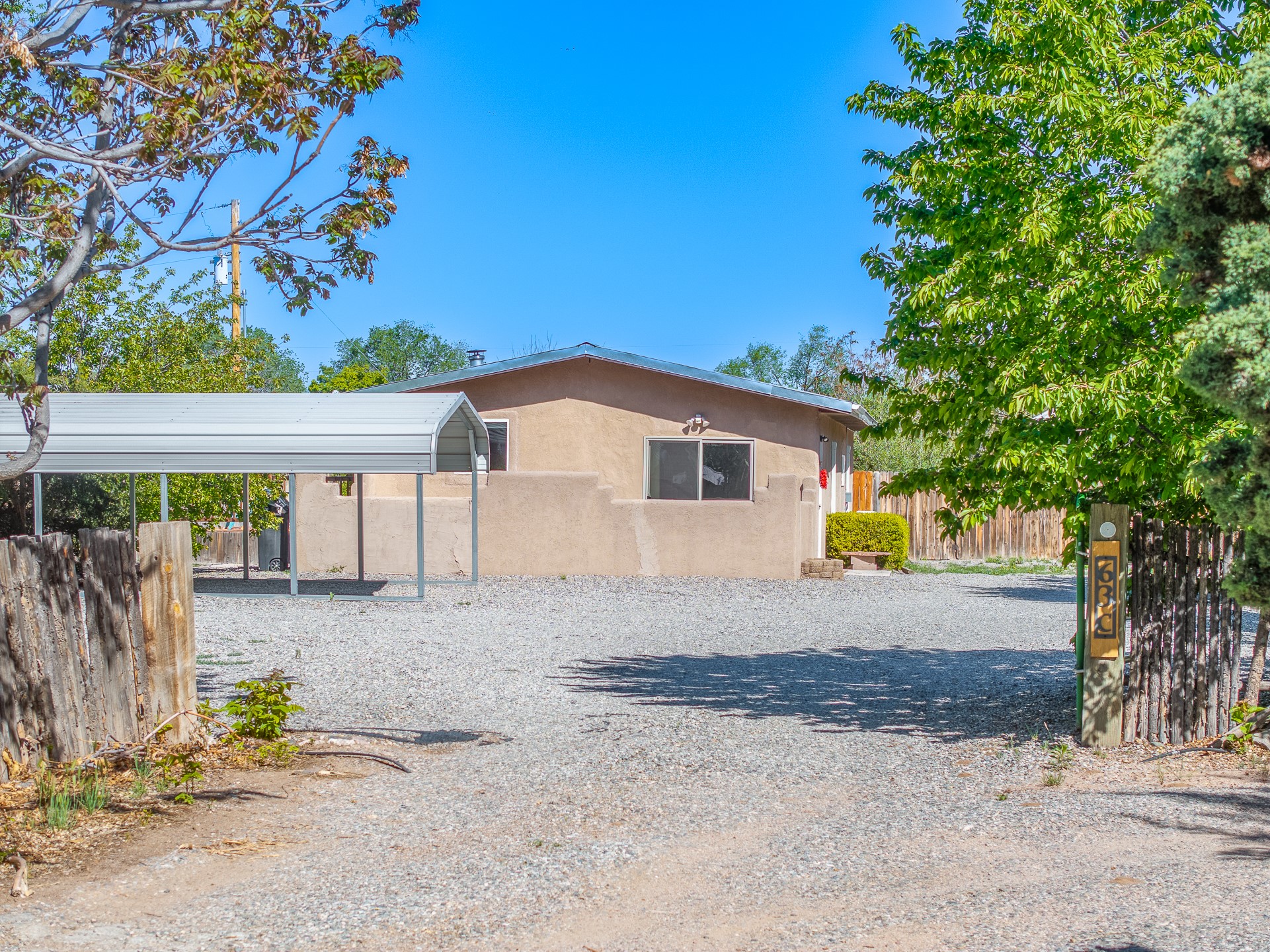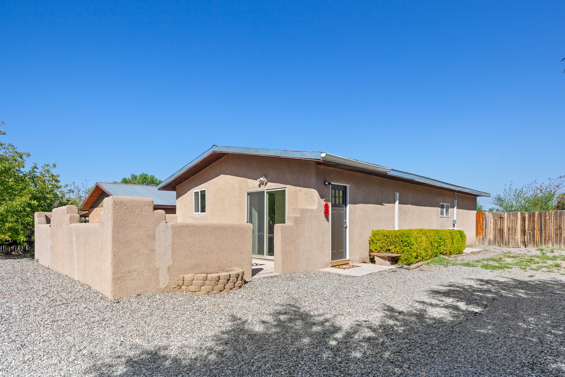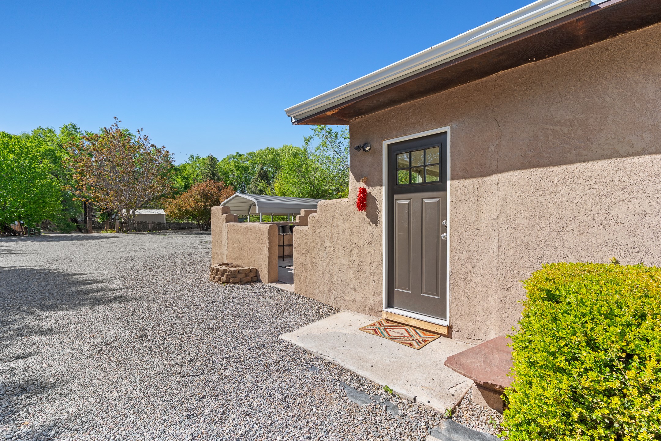 Tucked away in the tranquil beauty of Nambe, this recently renovated 1-bedroom, 1.5-bath home has 1,150 square feet of thoughtfully updated living space and is ideal for anyone seeking peace, privacy, and a connection to the land. Step inside to discover a host of modern upgrades including new flooring, doors, appliances, and efficient mini-split heating and cooling systems. A cozy wood-burning stove adds rustic charm and warmth for the cooler months. The home's layout is open and inviting, ideal for both relaxed living and casual entertaining. Outdoors, enjoy two dedicated entertaining areas perfect for dining under the stars or soaking in the serene surroundings. The fully fenced backyard provides privacy and space for pets or gardening. Green thumbs will appreciate the numerous fruit trees scattered throughout the property, apricot, apple, and cherry. This home proudly boasts a private well and additional surface water rights supplied by the nearby acequia, ensuring a sustainable and reliable water supply. Whether you're looking for a full-time residence, a peaceful retreat, or a smart investment, this Namb gem is ready to welcome you home.