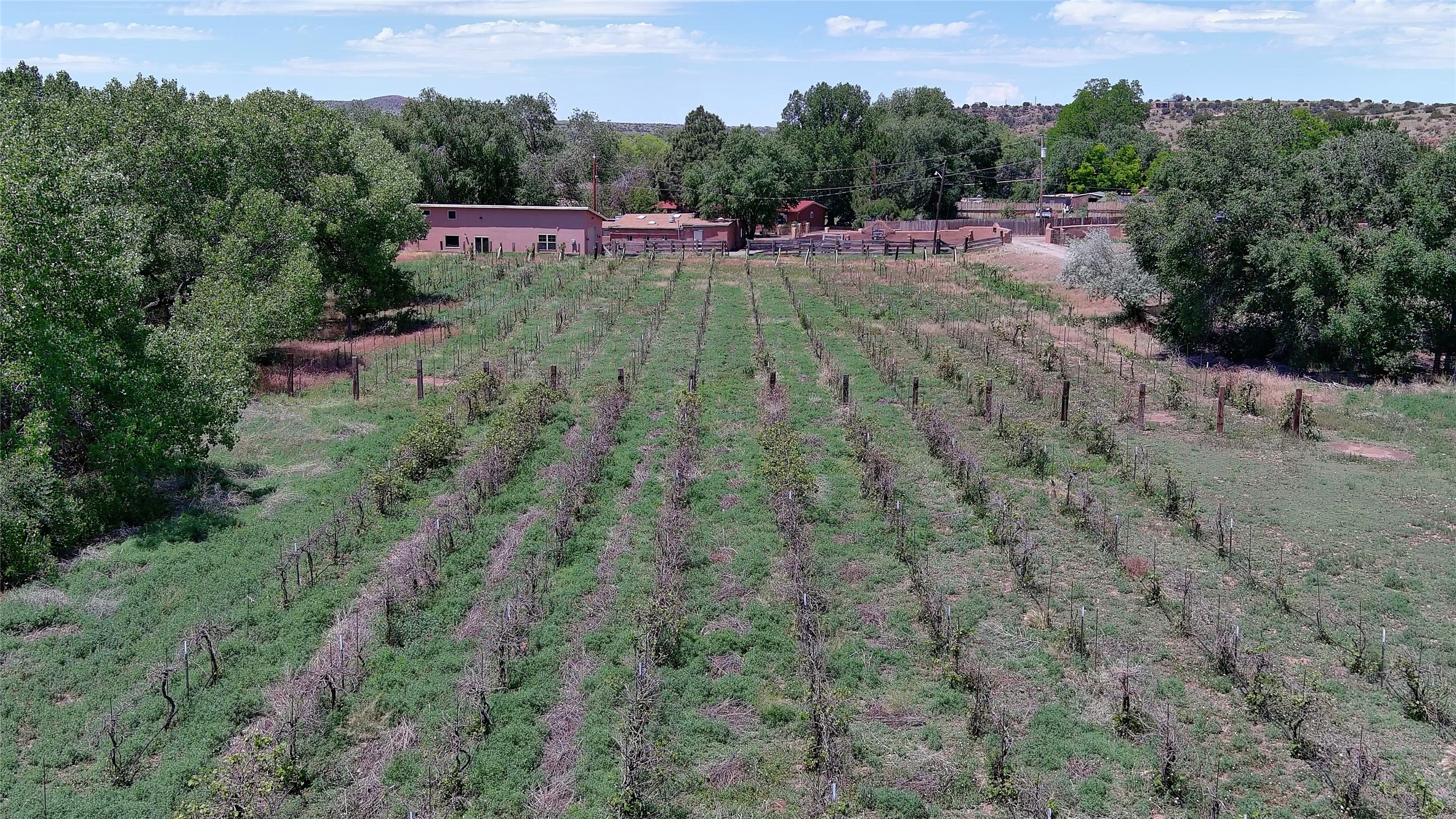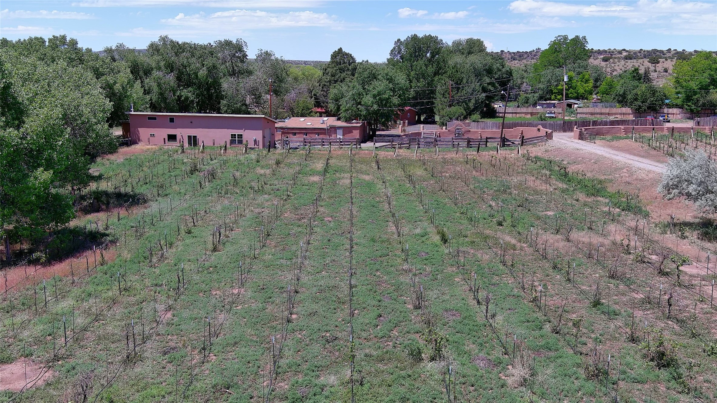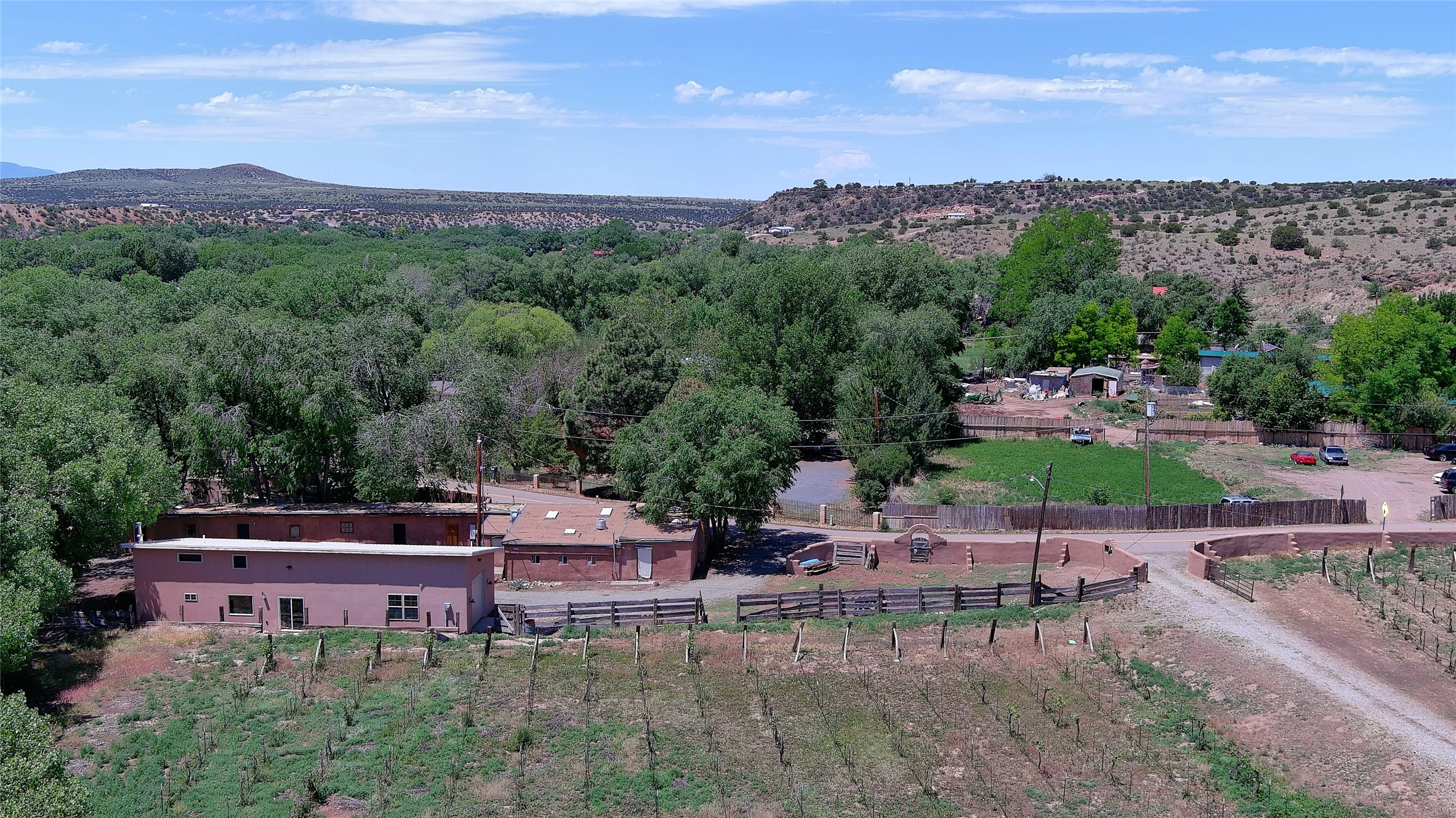 La Cienega Vineyard Estate - Four Parcels with Adobe Homes, Studios & Acequia Water Rights. Discover a unique opportunity in the heart of historic La Cienega--a vibrant 6-acre vineyard comprising four separately deeded parcels, rich with potential and authentic New Mexico charm. Anchored by two traditional adobe homes, the estate is steeped in regional character and surrounded by natural beauty. The main house features 3 bedrooms, 2 baths, and showcases classic Santa Fe style with brick floors, vigas, and elegant touches throughout. The adobe main residence is a quintessential historic home in the La Cienega Village. The second adobe home offers additional living space or rental income potential. In addition to the homes, the property includes a partially completed two-story apartment--ready for your finishing touches--and several studio structures that could be transformed into creative workspaces, studios, rentals or other uses associated with the Vineyard. The well-maintained vineyard is nourished by valuable acequia water rights, ensuring sustainable growth and offering agricultural possibilities for wine production, agritourism, or farm-to-table ventures. With flexible uses and multiple dwellings already in place, this rare offering is ideal for a variety of uses--live/work, multi-generational living, a creative retreat, or a boutique vineyard business. Properties with this combination of history, water, and opportunity are seldom available in La Cienega