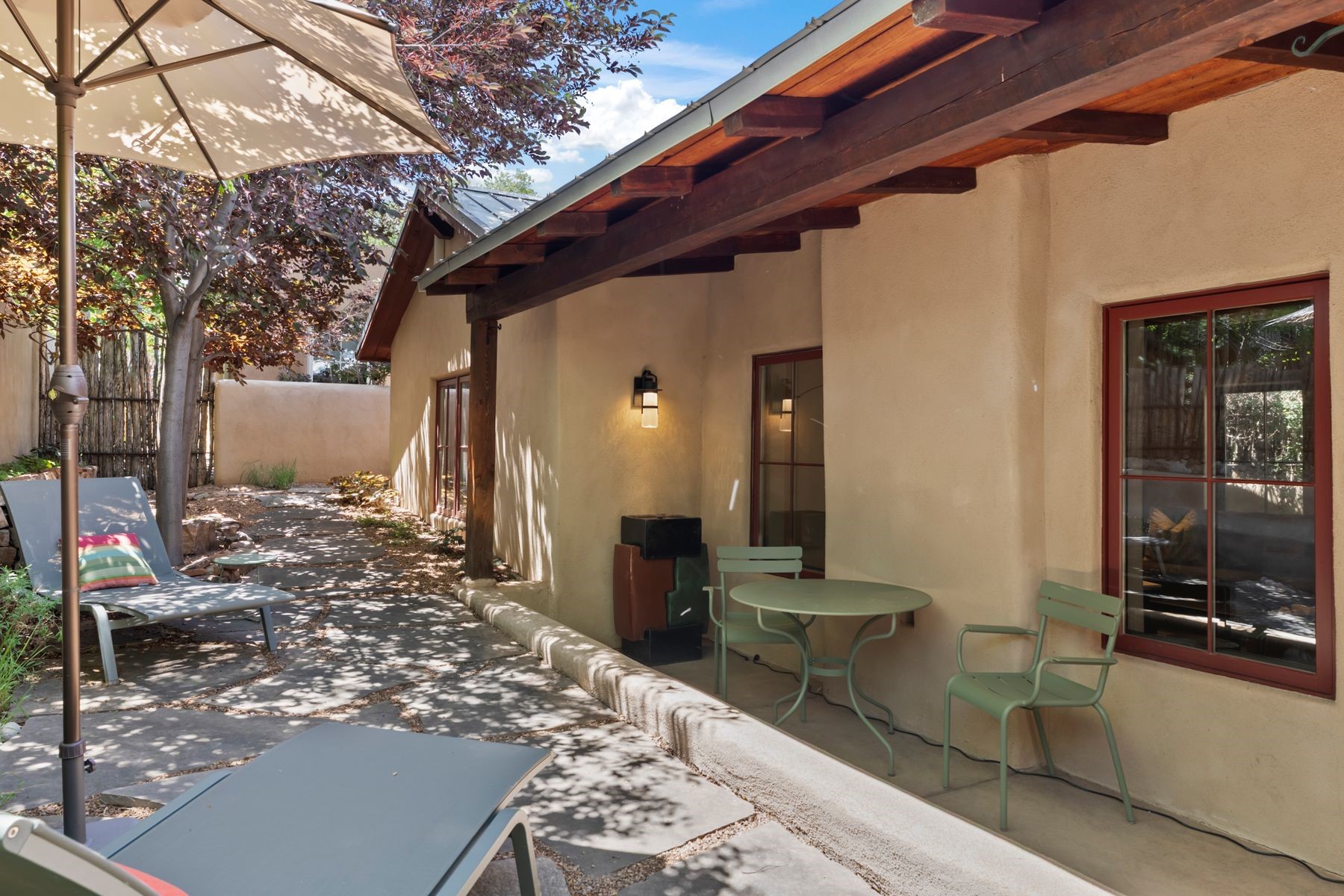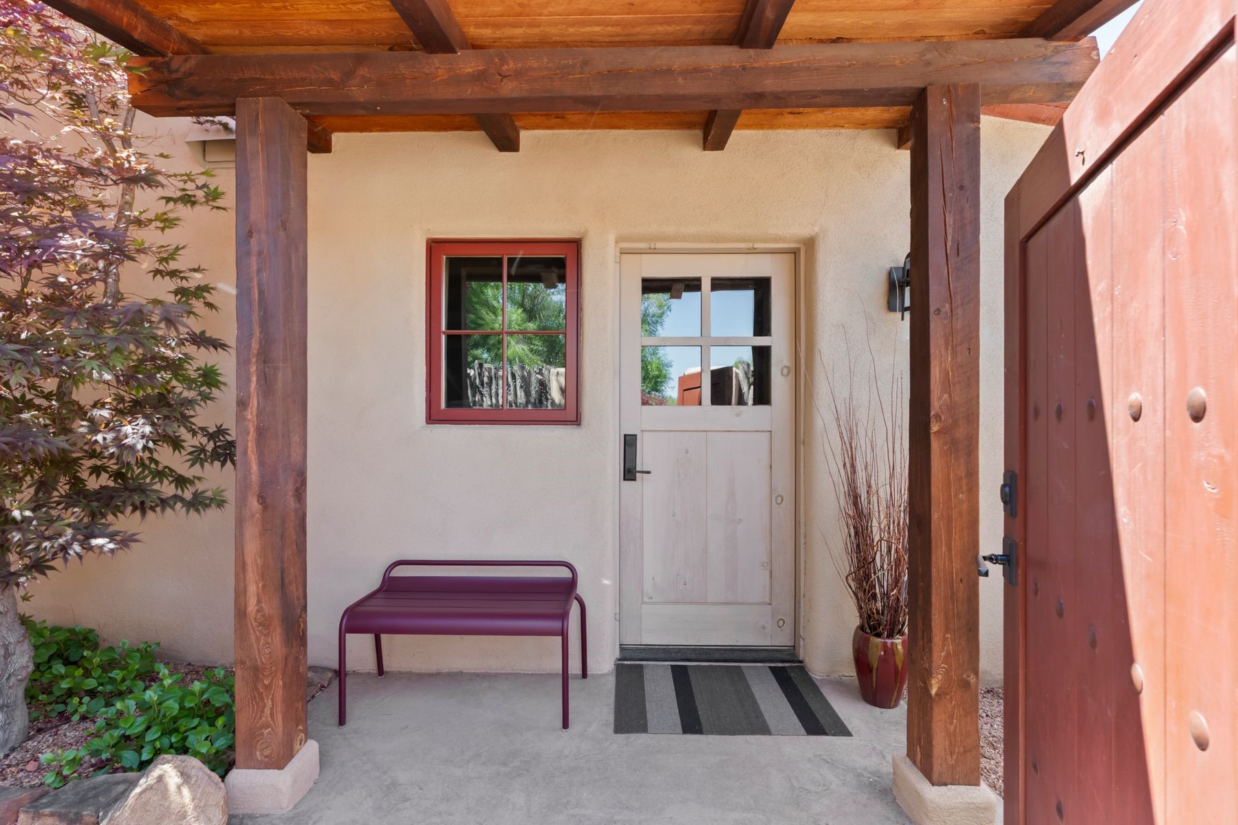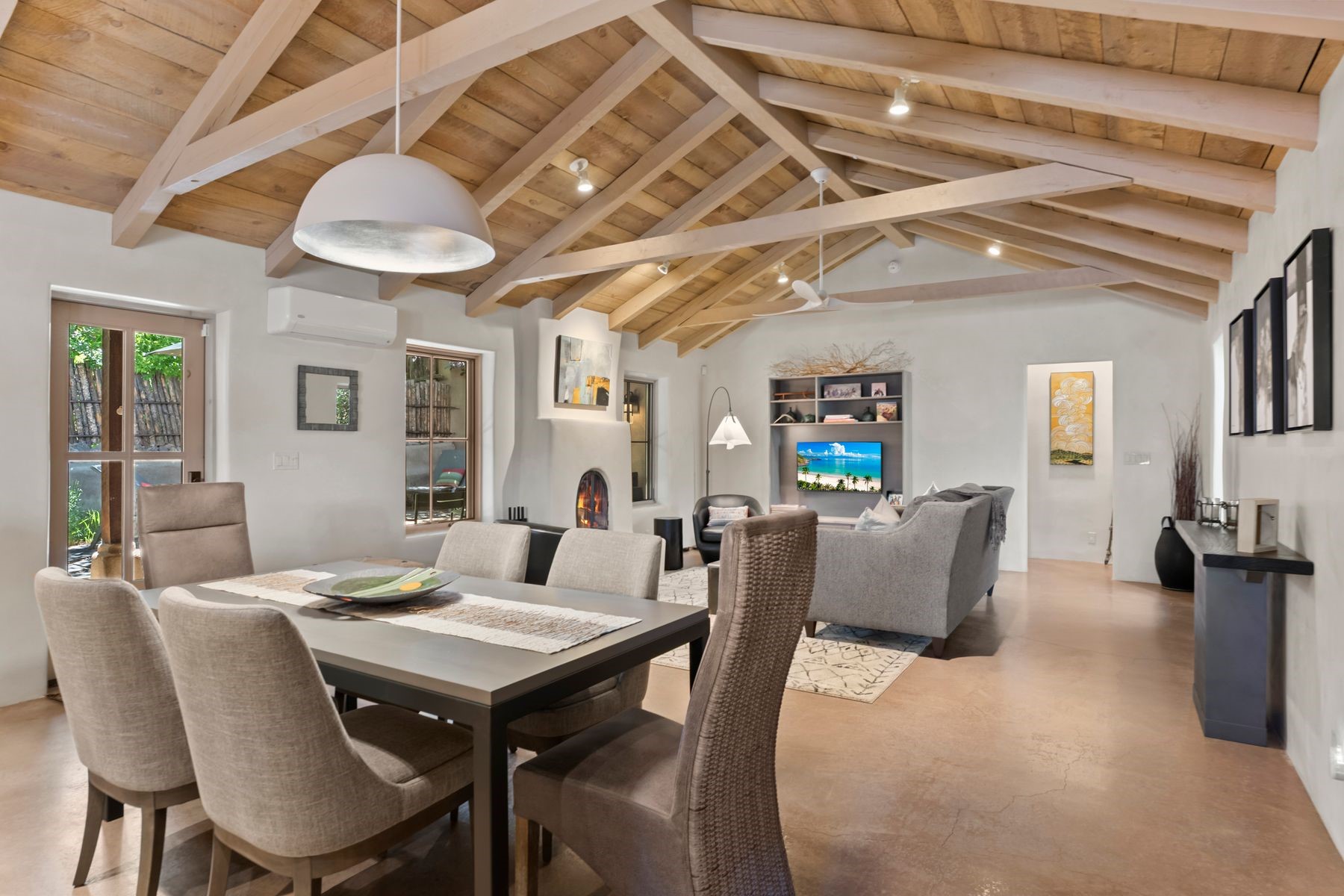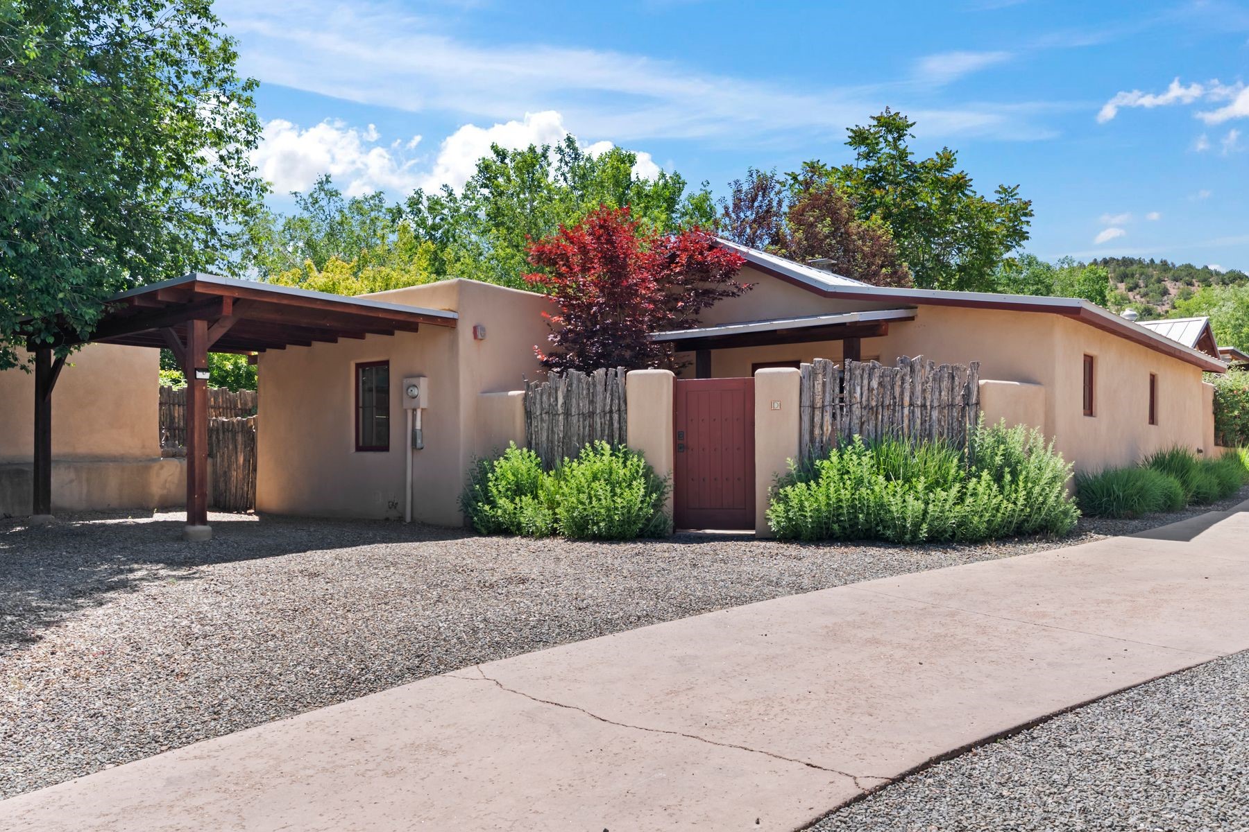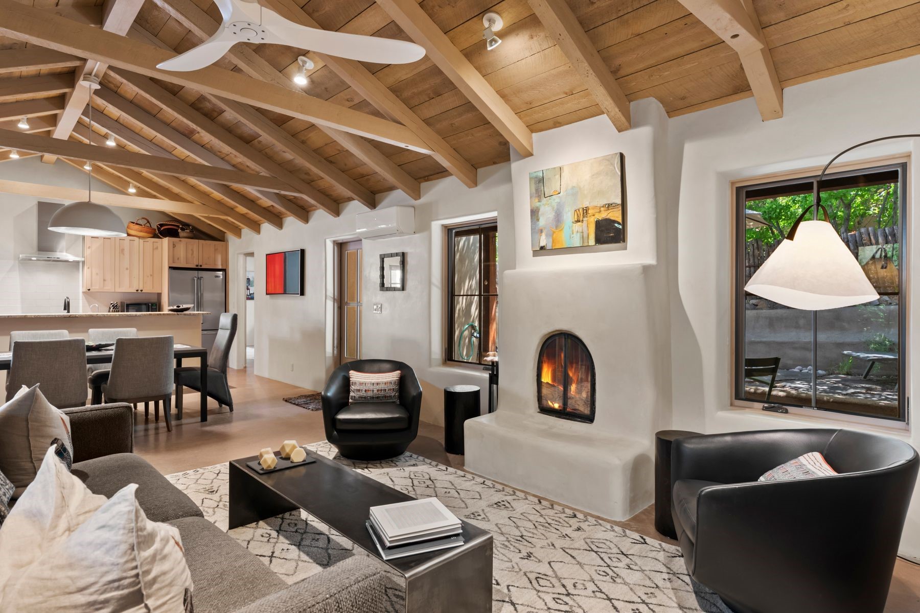 Elegant & Refined, free standing condominium in Pristine, Move-in Condition Eastside Downtown Santa Fe! Built in 2015, this beautiful True North designed Adobe has all of the amenities you desire on the Eastside of Downtown Santa Fe: Northern NM Pitched Roof style, Single level, soaring ceilings with light colored natural wood, plaster walls, and earth toned stained concrete flooring. Two bedrooms are located on either end of the living area: The primary en-suite bedroom is bathed in natural light, with spacious walk in closet, and a full bathroom. The 2nd bedroom is private, located just off the living area and might accommodate family, guests, fitness endeavors, with nearby full bath. The "Great Room" is open and includes a spacious modern kitchen, dining area, and comfortable living space to enjoy quiet evenings in front of the wood burning fireplace. A spacious entry mud room functions as closet and small storage for gear & seasonal items; there is a separate laundry located just off the living room next to a well designed pantry/ bar. The private and fully enclosed back yard allows for intimate gatherings surrounded by native plants and shrubs. All City utilities, Mini Splits for Cooling, in floor radiant heat, contemporary lighting and fixtures. Single car covered carport is attached for private parking; guest parking is available at the entry to this small enclave just off Historic Canyon Rd. A truly Turn Key property located just moments from Canyon Road galleries, restaurants, a park, and Cristo Rey church. Most Furnishings - interior and exterior - may be included with an Acceptable Offer to Purchas-See Remarks.