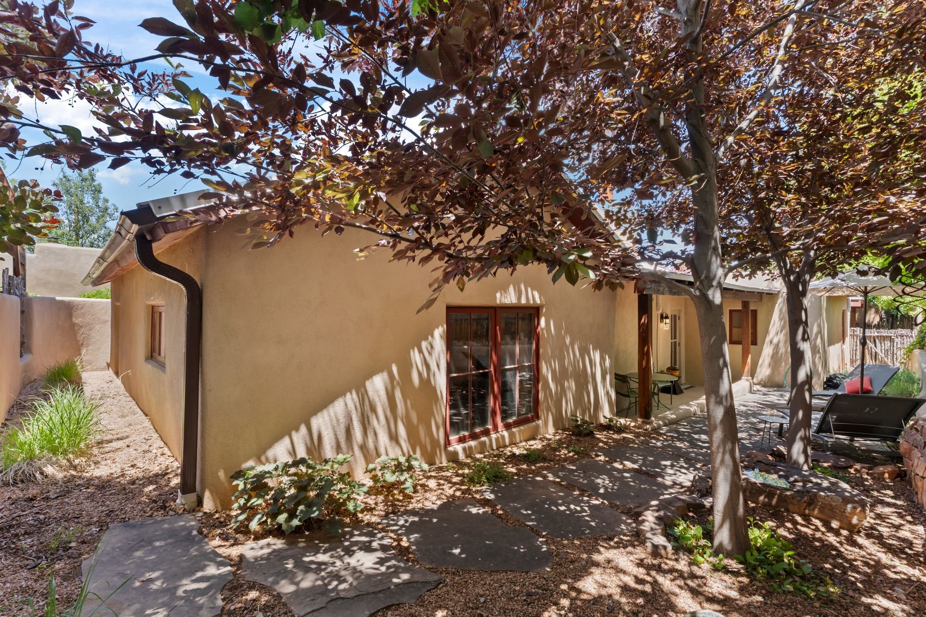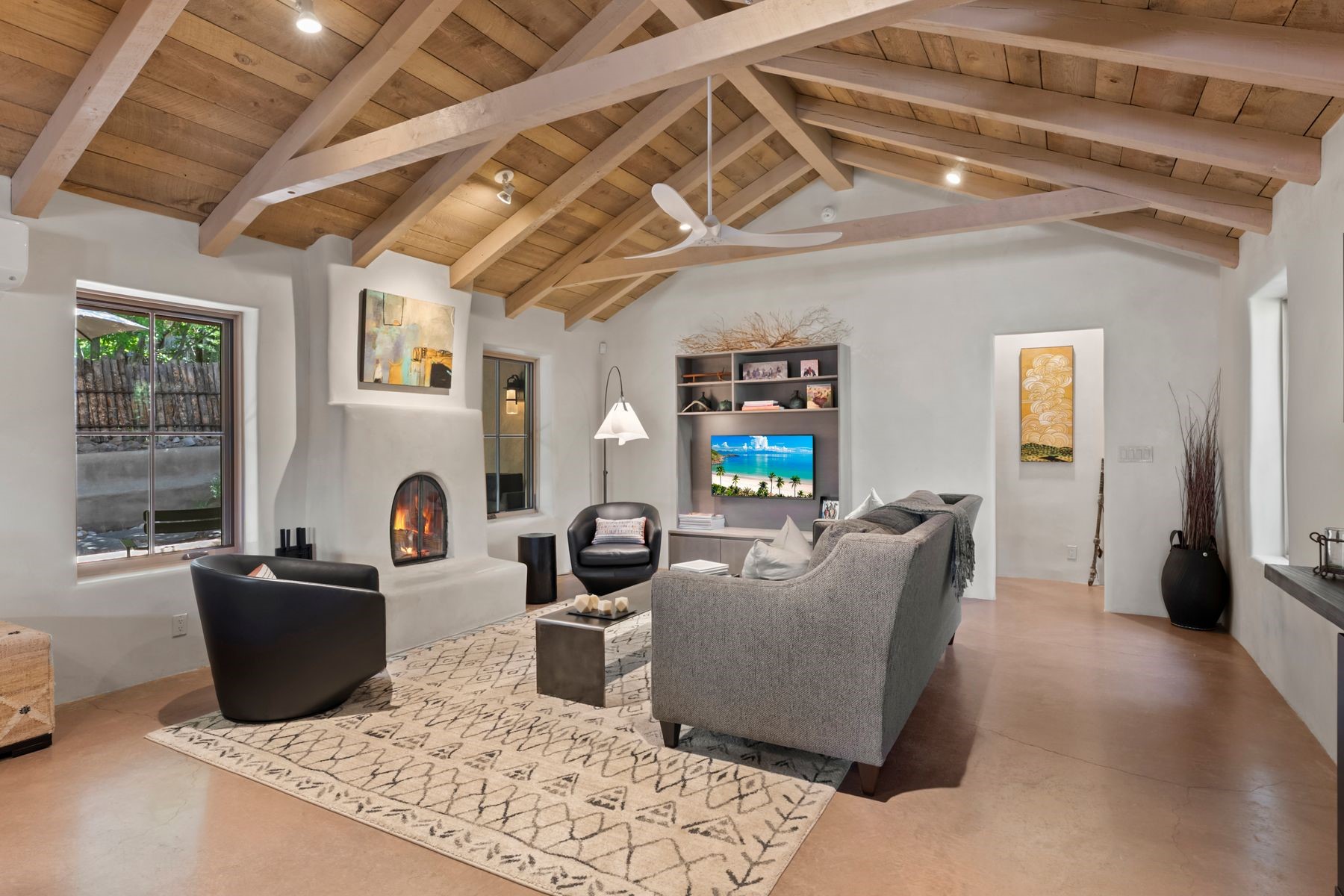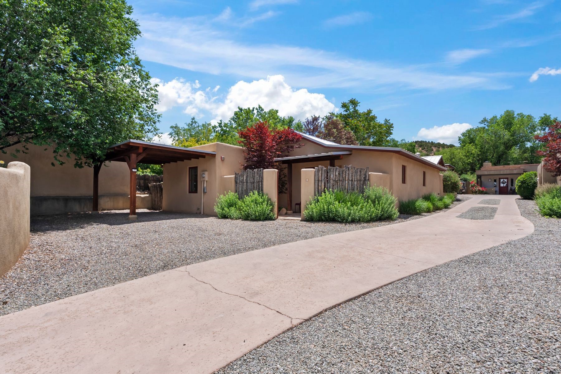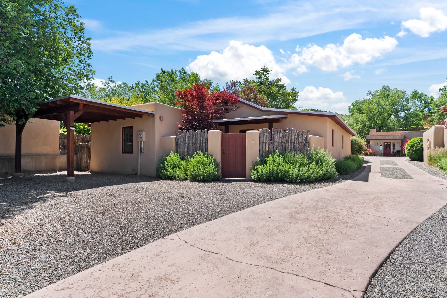 Elegant & Refined, free standing condominium in Pristine, Move-in Condition Eastside Downtown Santa Fe! Built in 2015, this beautiful True North designed Adobe has all of the amenities you desire on the Eastside of Downtown Santa Fe: Northern NM Pitched Roof style, Single level, soaring ceilings with light colored natural wood, plaster walls, and earth toned stained concrete flooring. Two bedrooms are located on either end of the living area: The primary en-suite bedroom is bathed in natural light, with spacious walk in closet, and a full bathroom. The 2nd bedroom is private, located just off the living area and might accommodate family, guests, fitness endeavors, with nearby full bath. The "Great Room" is open and includes a spacious modern kitchen, dining area, and comfortable living space to enjoy quiet evenings in front of the wood burning fireplace. A spacious entry mud room functions as closet and small storage for gear & seasonal items; there is a separate laundry located just off the living room next to a well designed pantry/ bar. The private and fully enclosed back yard allows for intimate gatherings surrounded by native plants and shrubs. All City utilities, Mini Splits for Cooling, in floor radiant heat, contemporary lighting and fixtures. Single car covered carport is attached for private parking; guest parking is available at the entry to this small enclave just off Historic Canyon Rd. A truly Turn Key property located just moments from Canyon Road galleries, restaurants, a park, and Cristo Rey church. Most Furnishings - interior and exterior - may be included with an Acceptable Offer to Purchas-See Remarks.
