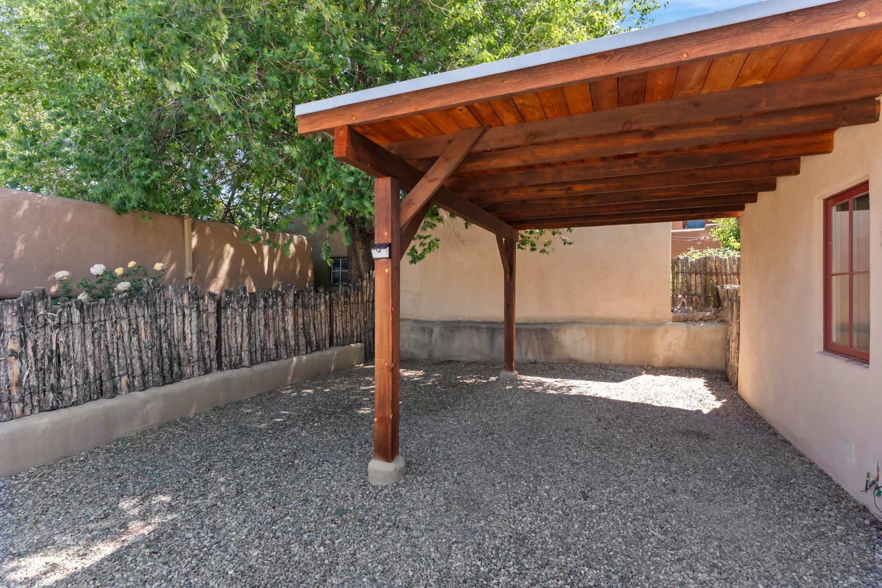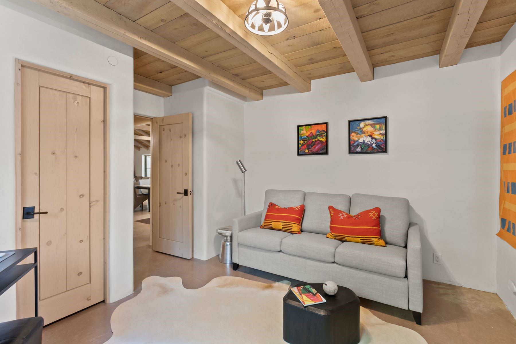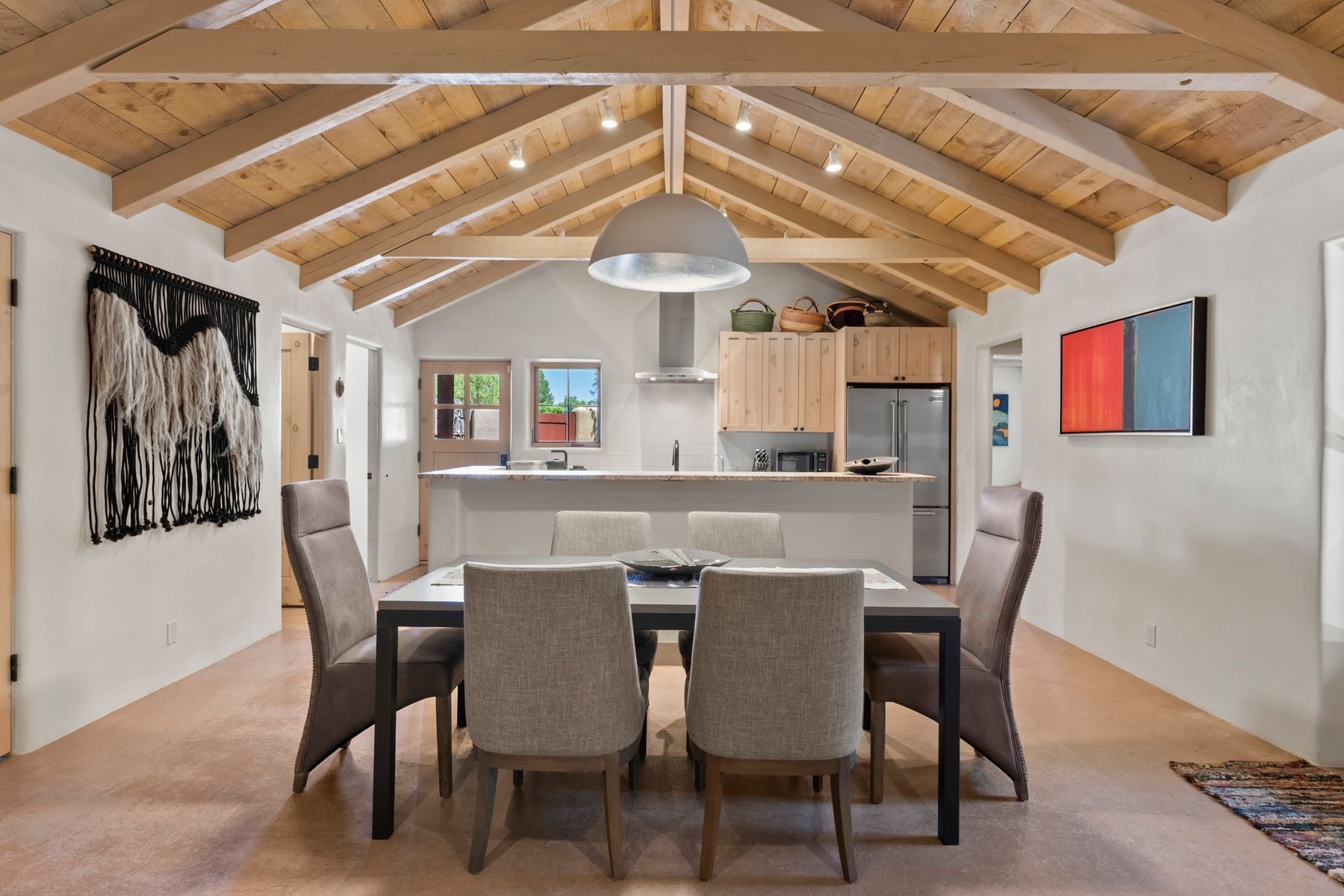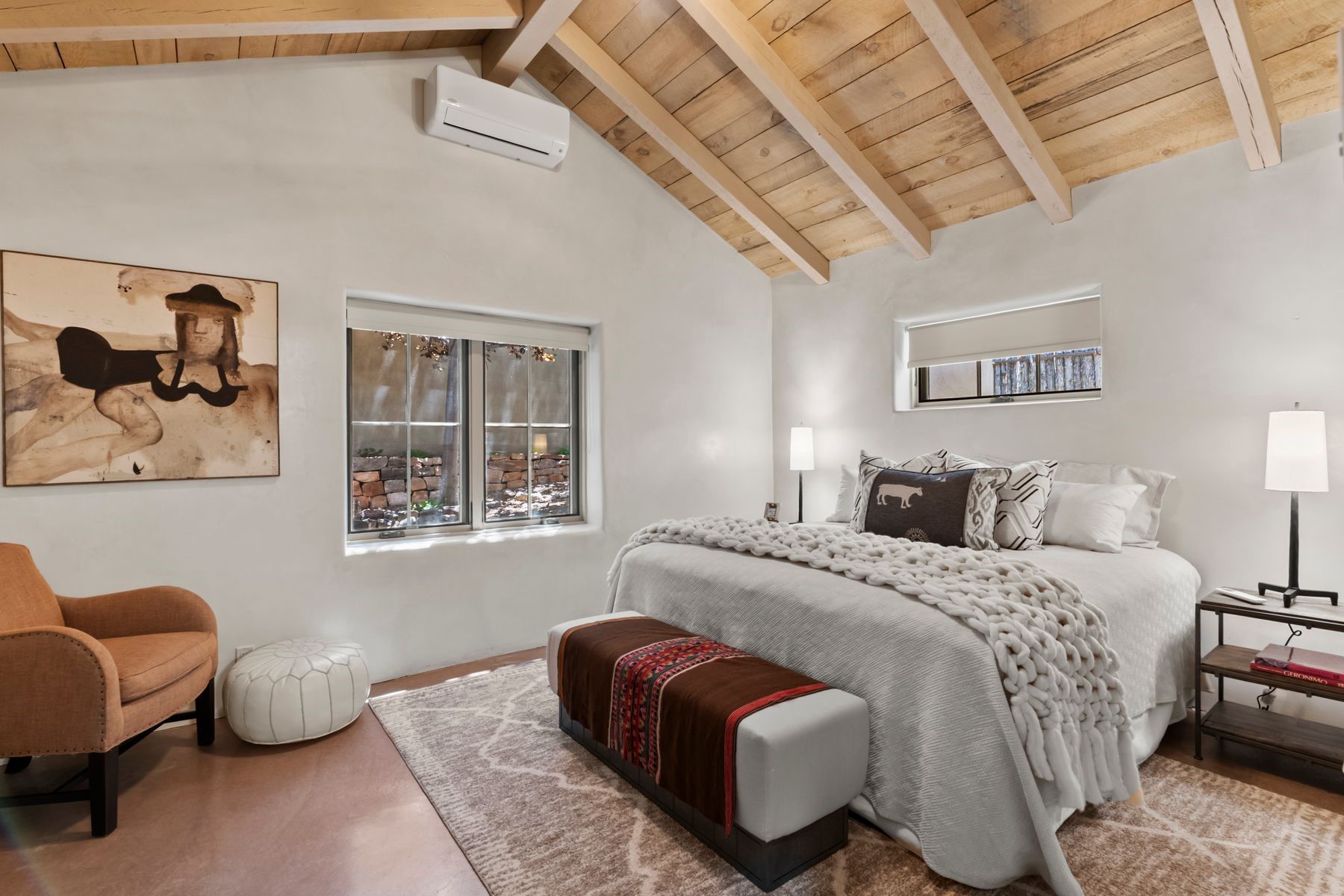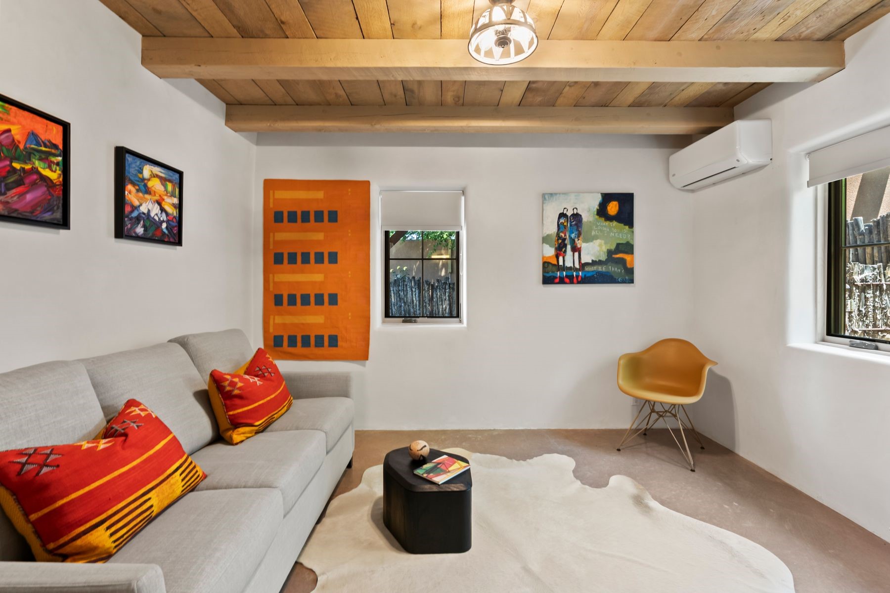 Elegant & Refined, free standing condominium in Pristine, Move-in Condition Eastside Downtown Santa Fe! Built in 2015, this beautiful True North designed Adobe has all of the amenities you desire on the Eastside of Downtown Santa Fe: Northern NM Pitched Roof style, Single level, soaring ceilings with light colored natural wood, plaster walls, and earth toned stained concrete flooring. Two bedrooms are located on either end of the living area: The primary en-suite bedroom is bathed in natural light, with spacious walk in closet, and a full bathroom. The 2nd bedroom is private, located just off the living area and might accommodate family, guests, fitness endeavors, with nearby full bath. The "Great Room" is open and includes a spacious modern kitchen, dining area, and comfortable living space to enjoy quiet evenings in front of the wood burning fireplace. A spacious entry mud room functions as closet and small storage for gear & seasonal items; there is a separate laundry located just off the living room next to a well designed pantry/ bar. The private and fully enclosed back yard allows for intimate gatherings surrounded by native plants and shrubs. All City utilities, Mini Splits for Cooling, in floor radiant heat, contemporary lighting and fixtures. Single car covered carport is attached for private parking; guest parking is available at the entry to this small enclave just off Historic Canyon Rd. A truly Turn Key property located just moments from Canyon Road galleries, restaurants, a park, and Cristo Rey church. Most Furnishings - interior and exterior - may be included with an Acceptable Offer to Purchas-See Remarks.