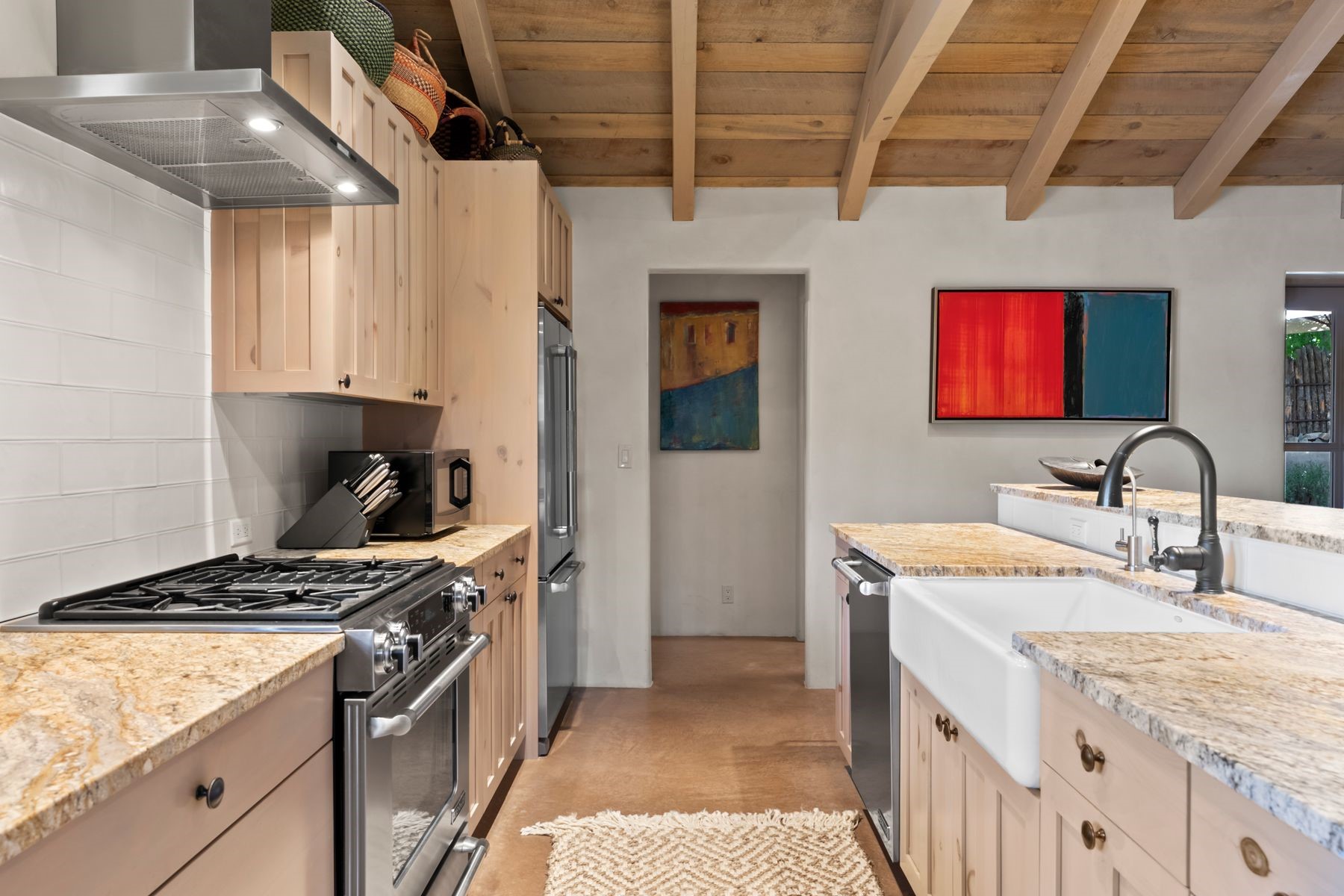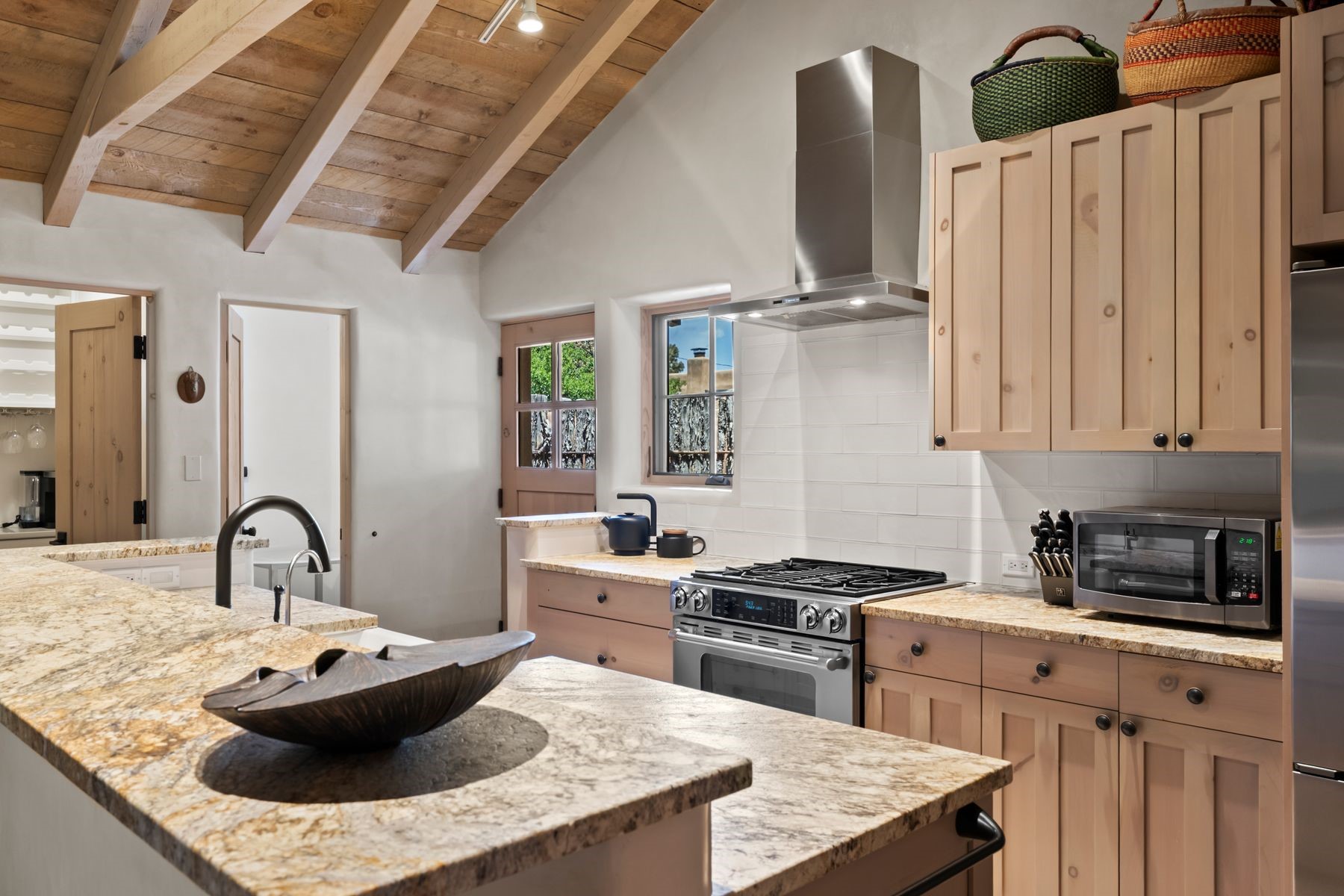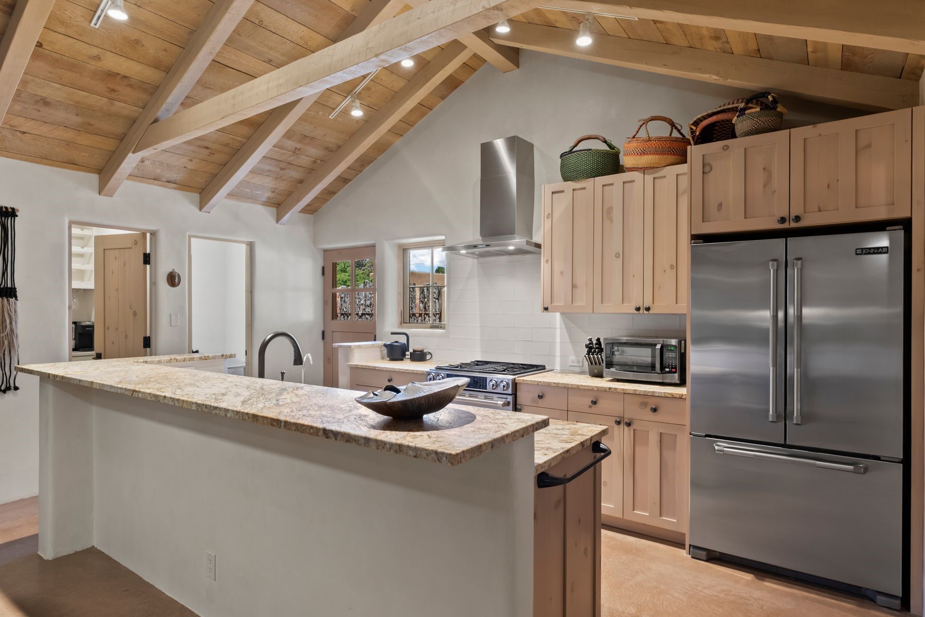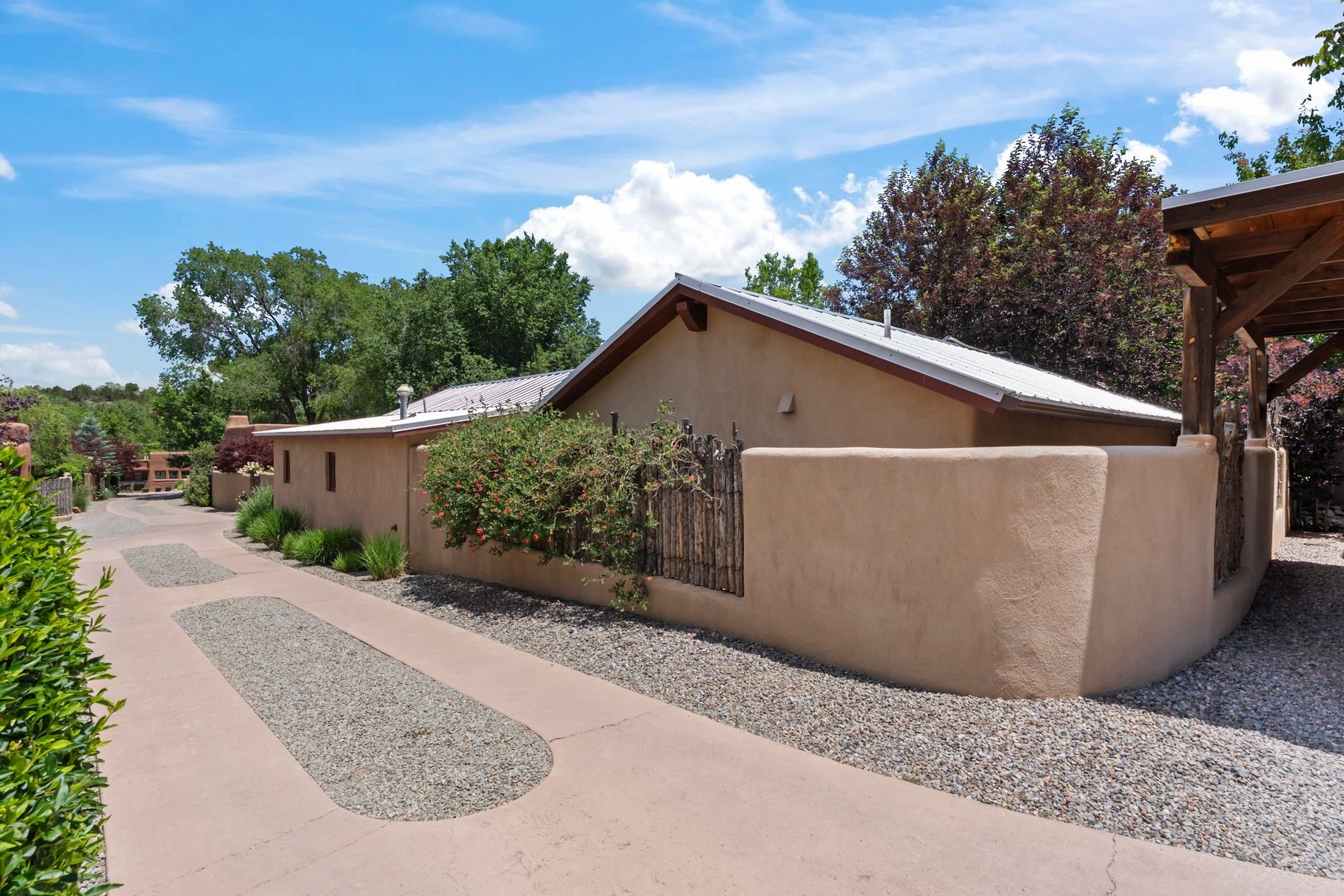 Elegant & Refined, free standing condominium in Pristine, Move-in Condition Eastside Downtown Santa Fe! Built in 2015, this beautiful True North designed Adobe has all of the amenities you desire on the Eastside of Downtown Santa Fe: Northern NM Pitched Roof style, Single level, soaring ceilings with light colored natural wood, plaster walls, and earth toned stained concrete flooring. Two bedrooms are located on either end of the living area: The primary en-suite bedroom is bathed in natural light, with spacious walk in closet, and a full bathroom. The 2nd bedroom is private, located just off the living area and might accommodate family, guests, fitness endeavors, with nearby full bath. The "Great Room" is open and includes a spacious modern kitchen, dining area, and comfortable living space to enjoy quiet evenings in front of the wood burning fireplace. A spacious entry mud room functions as closet and small storage for gear & seasonal items; there is a separate laundry located just off the living room next to a well designed pantry/ bar. The private and fully enclosed back yard allows for intimate gatherings surrounded by native plants and shrubs. All City utilities, Mini Splits for Cooling, in floor radiant heat, contemporary lighting and fixtures. Single car covered carport is attached for private parking; guest parking is available at the entry to this small enclave just off Historic Canyon Rd. A truly Turn Key property located just moments from Canyon Road galleries, restaurants, a park, and Cristo Rey church. Most Furnishings - interior and exterior - may be included with an Acceptable Offer to Purchas-See Remarks.