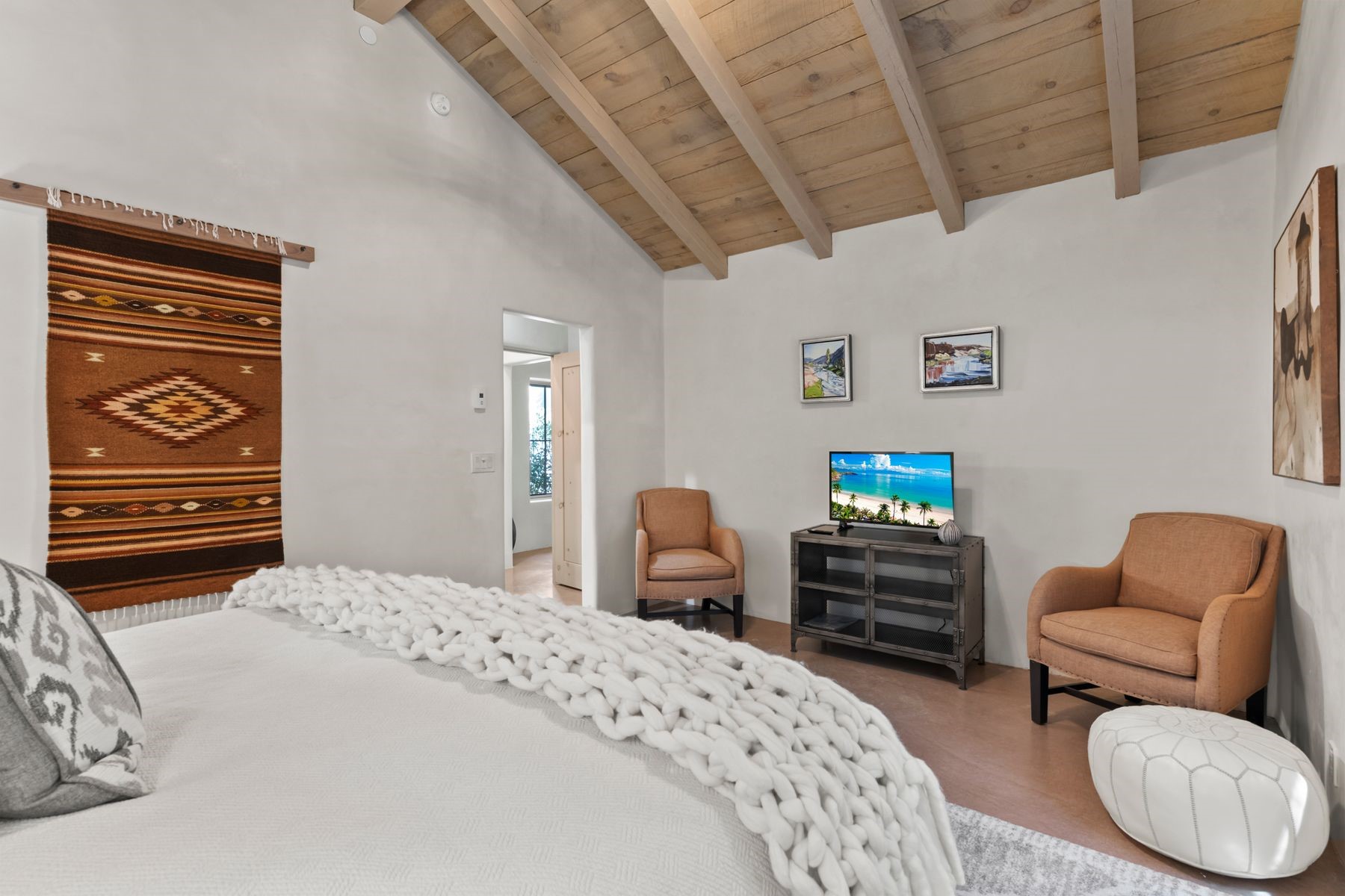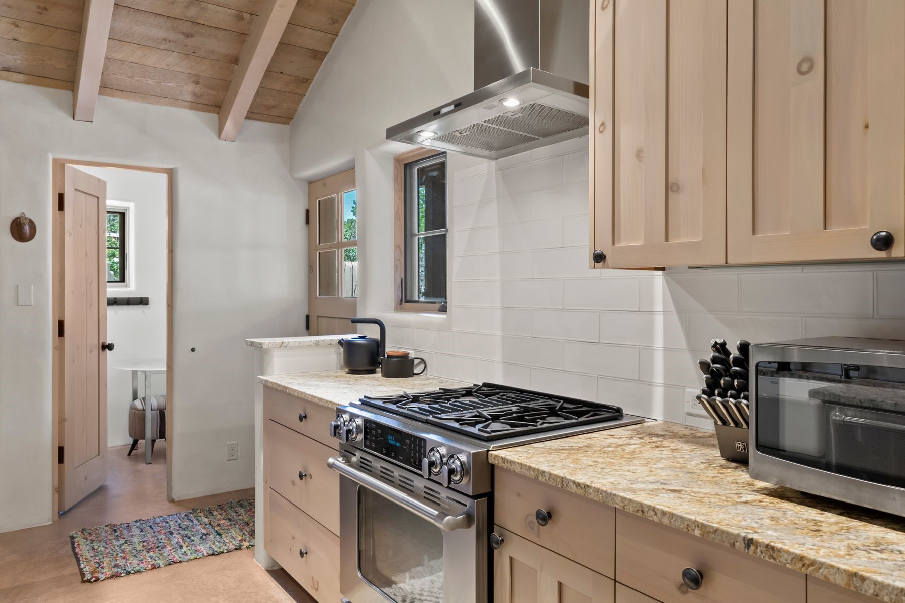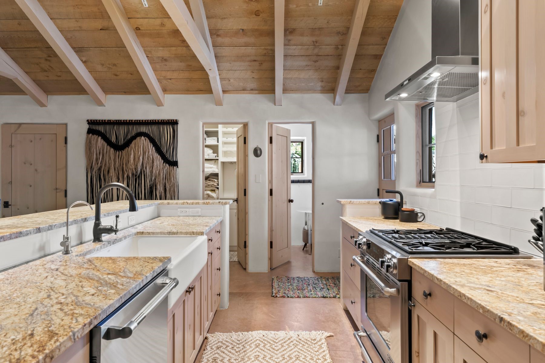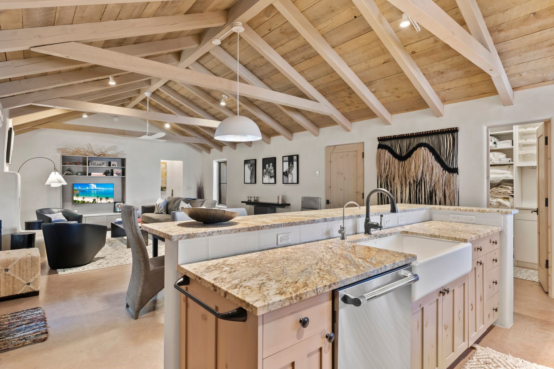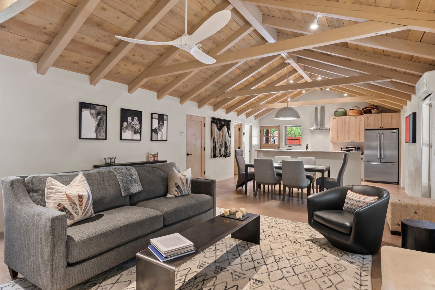 Elegant & Refined, free standing condominium in Pristine, Move-in Condition Eastside Downtown Santa Fe! Built in 2015, this beautiful True North designed Adobe has all of the amenities you desire on the Eastside of Downtown Santa Fe: Northern NM Pitched Roof style, Single level, soaring ceilings with light colored natural wood, plaster walls, and earth toned stained concrete flooring. Two bedrooms are located on either end of the living area: The primary en-suite bedroom is bathed in natural light, with spacious walk in closet, and a full bathroom. The 2nd bedroom is private, located just off the living area and might accommodate family, guests, fitness endeavors, with nearby full bath. The "Great Room" is open and includes a spacious modern kitchen, dining area, and comfortable living space to enjoy quiet evenings in front of the wood burning fireplace. A spacious entry mud room functions as closet and small storage for gear & seasonal items; there is a separate laundry located just off the living room next to a well designed pantry/ bar. The private and fully enclosed back yard allows for intimate gatherings surrounded by native plants and shrubs. All City utilities, Mini Splits for Cooling, in floor radiant heat, contemporary lighting and fixtures. Single car covered carport is attached for private parking; guest parking is available at the entry to this small enclave just off Historic Canyon Rd. A truly Turn Key property located just moments from Canyon Road galleries, restaurants, a park, and Cristo Rey church. Most Furnishings - interior and exterior - may be included with an Acceptable Offer to Purchas-See Remarks.