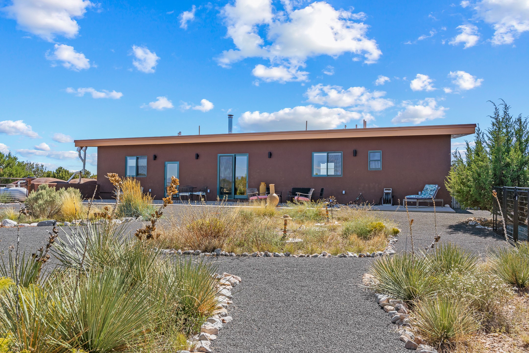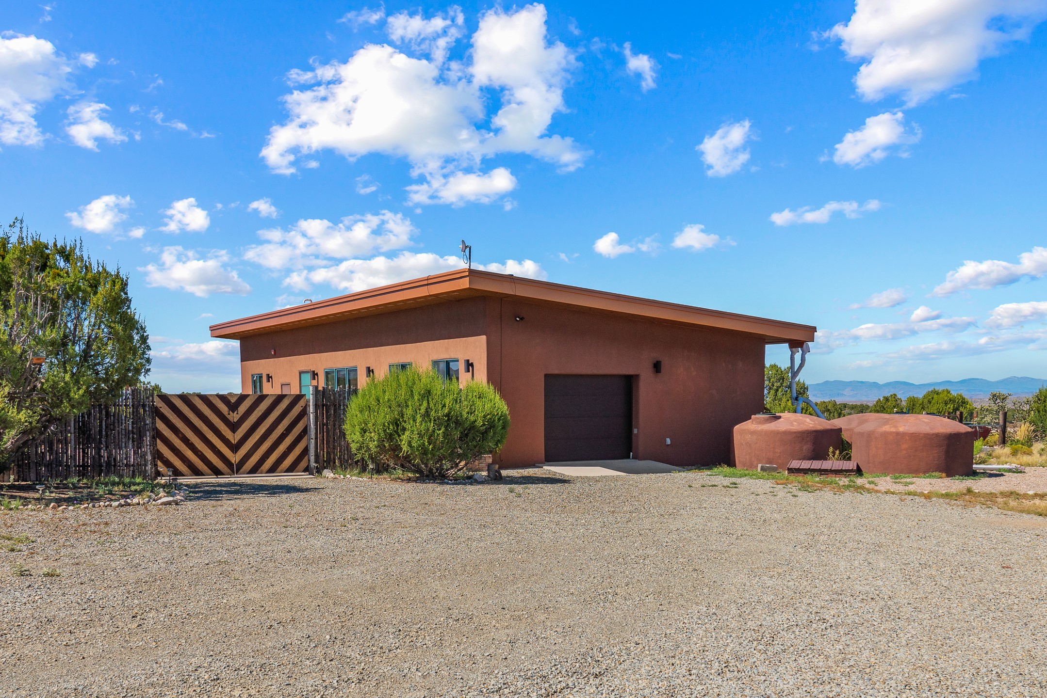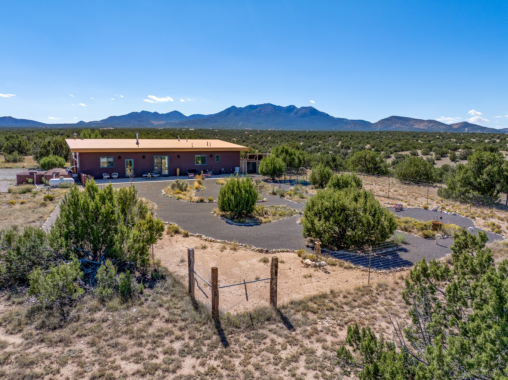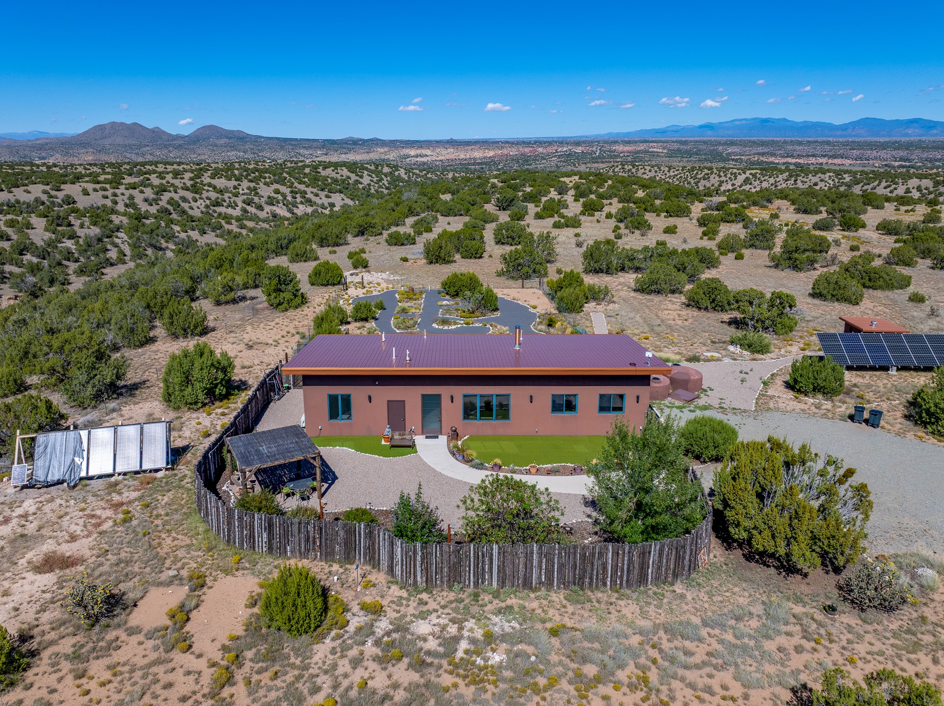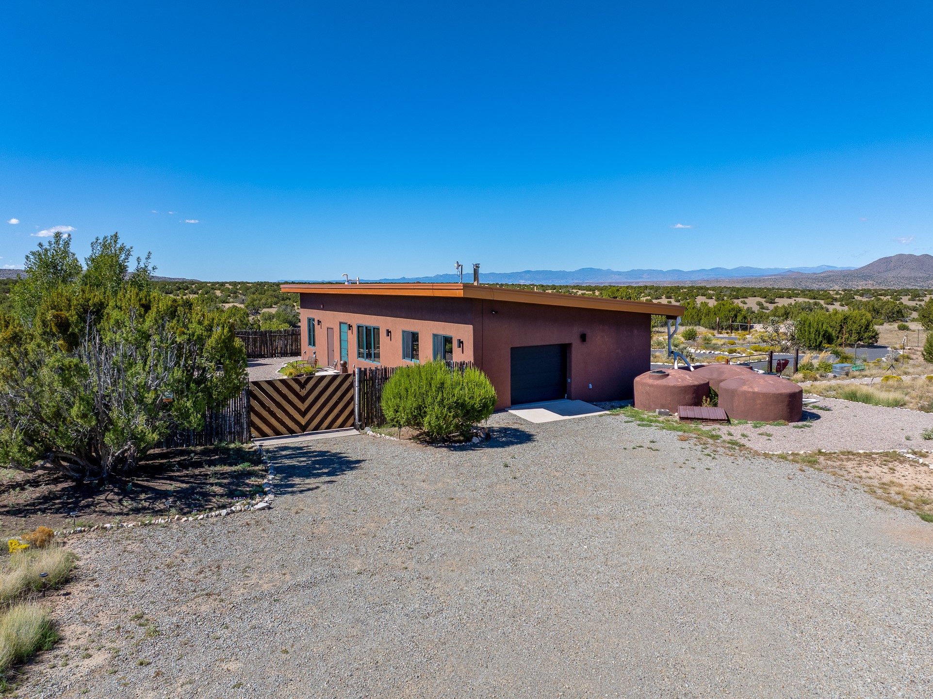 Contemporary style in a high-desert setting with breathtaking mountain views, this home sits on a spacious forty-acre lot in the foothills of the Ortiz Mountains. Fully self-reliant, it boasts utilities provided by solar, wind, and water catchment, with public electric lines available on the street. Thoughtfully designed, the home features high wood plank ceilings, polished concrete floors, and an open, modern kitchen. House is constructed of rastra for energy efficiency and fire safety. Natural light floods the space through glass doors on both the north and south sides of the house. Fenced courtyards delineate landscaped areas, while the remaining acreage remains untouched. The primary suite is cooled by a mini-split, and includes a full bath and conveniently located laundry, while a half bath serves the primary living area.On the opposite side of the house, a large bonus room offers versatility as an office, second bedroom, or art space, and leads to a one-car garage. Both the garage and bonus room are equipped with sinks. The house is warmed by radiant heat in the floors, powered by solar hot water collectors.The property includes a storage shed and shipping container, solar shed, wind generator, 9000 gallons of water storage, as well as hookups for an RV. The locationoffers easy access to town on well-maintained roads within a gated community with no HOA. Located just 21 miles from Santa Fe and near dining and entertainment options in Madrid and Cerrillos, this home provides a perfect retreat without compromising comfort or convenience.