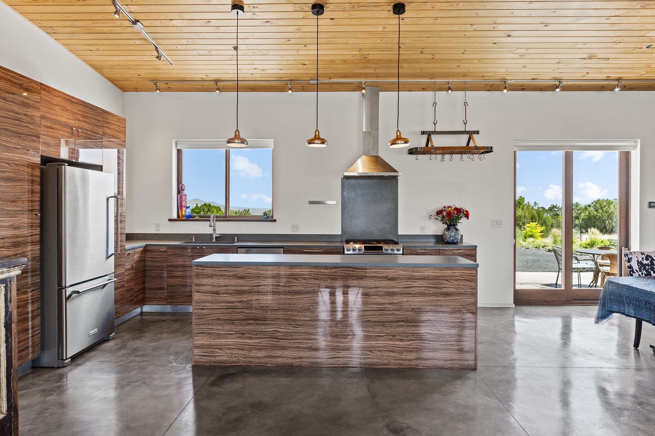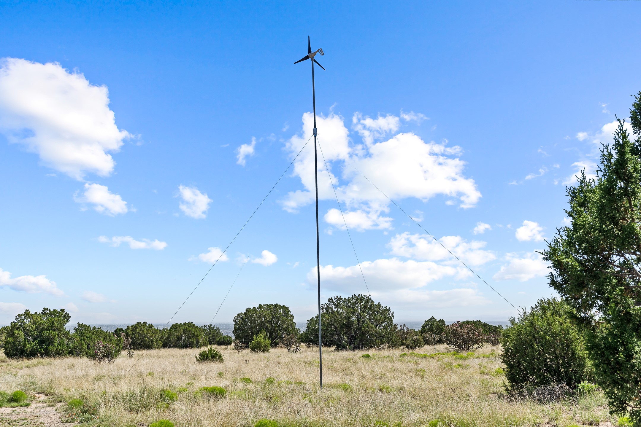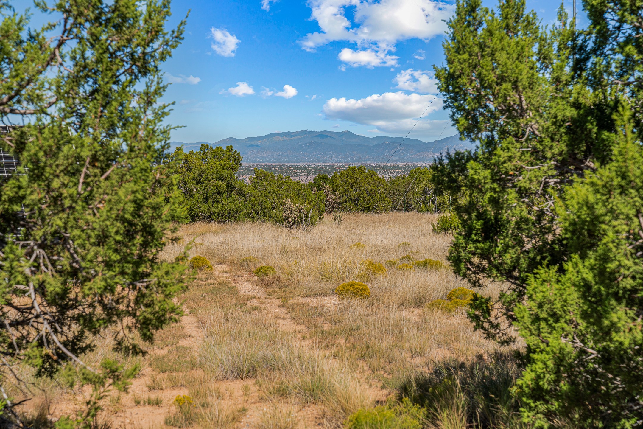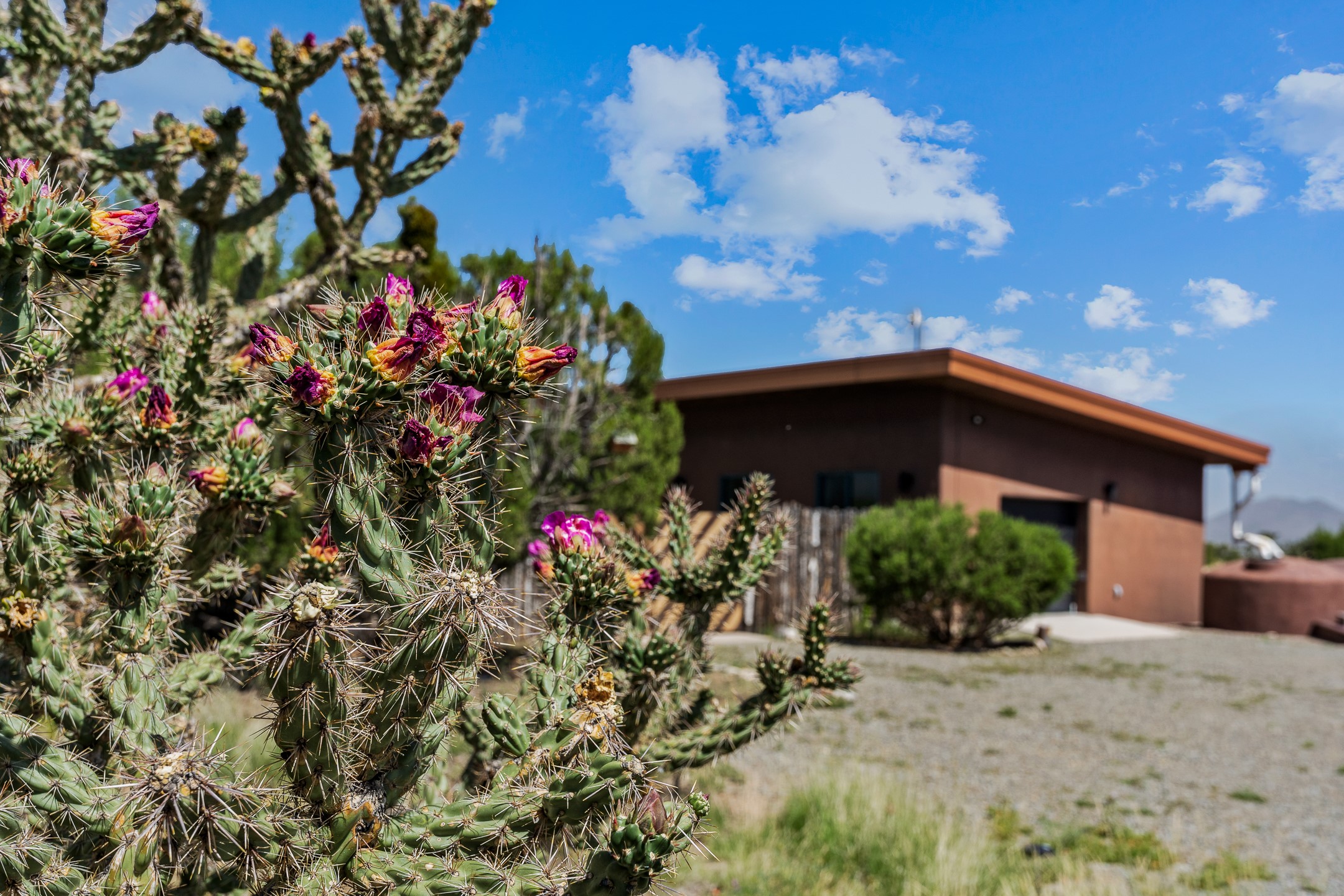 Contemporary style in a high-desert setting with breathtaking mountain views, this home sits on a spacious forty-acre lot in the foothills of the Ortiz Mountains. Fully self-reliant, it boasts utilities provided by solar, wind, and water catchment, with public electric lines available on the street. Thoughtfully designed, the home features high wood plank ceilings, polished concrete floors, and an open, modern kitchen. House is constructed of rastra for energy efficiency and fire safety. Natural light floods the space through glass doors on both the north and south sides of the house. Fenced courtyards delineate landscaped areas, while the remaining acreage remains untouched. The primary suite is cooled by a mini-split, and includes a full bath and conveniently located laundry, while a half bath serves the primary living area.On the opposite side of the house, a large bonus room offers versatility as an office, second bedroom, or art space, and leads to a one-car garage. Both the garage and bonus room are equipped with sinks. The house is warmed by radiant heat in the floors, powered by solar hot water collectors.The property includes a storage shed and shipping container, solar shed, wind generator, 9000 gallons of water storage, as well as hookups for an RV. The locationoffers easy access to town on well-maintained roads within a gated community with no HOA. Located just 21 miles from Santa Fe and near dining and entertainment options in Madrid and Cerrillos, this home provides a perfect retreat without compromising comfort or convenience.
