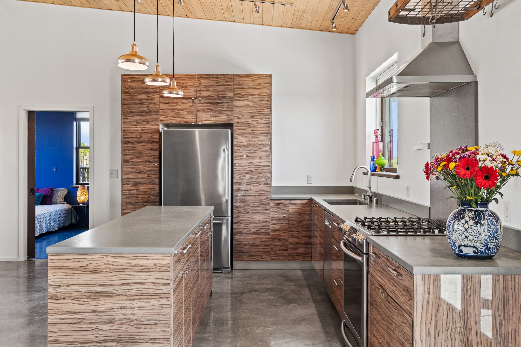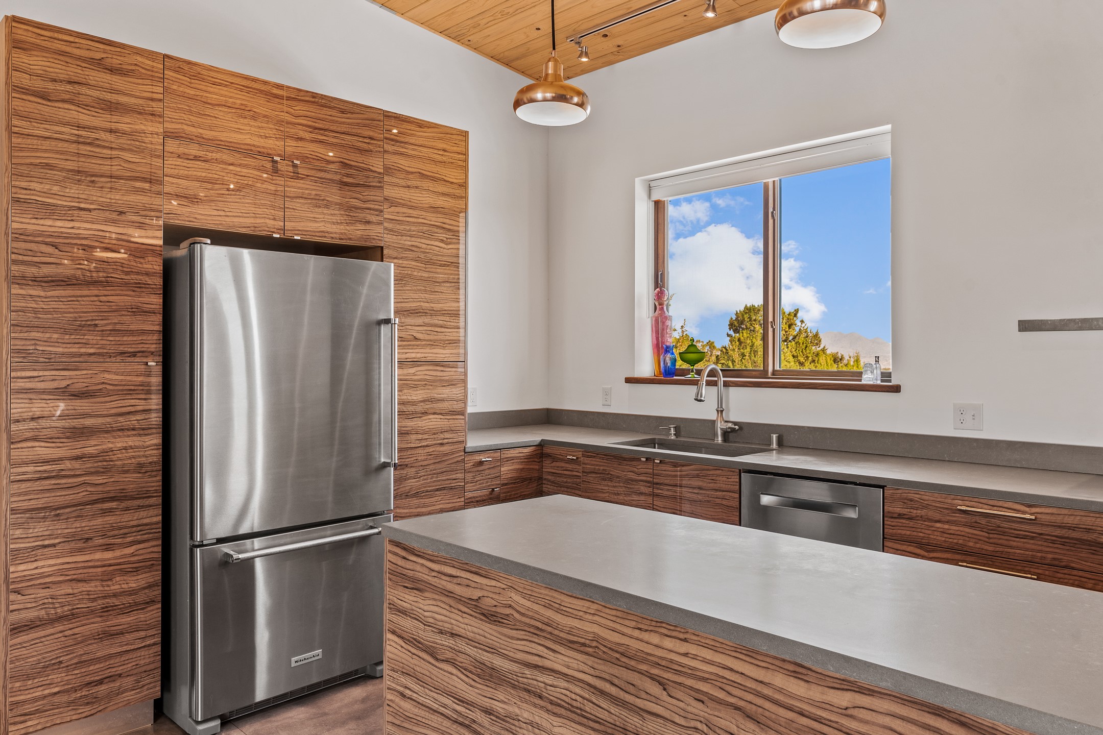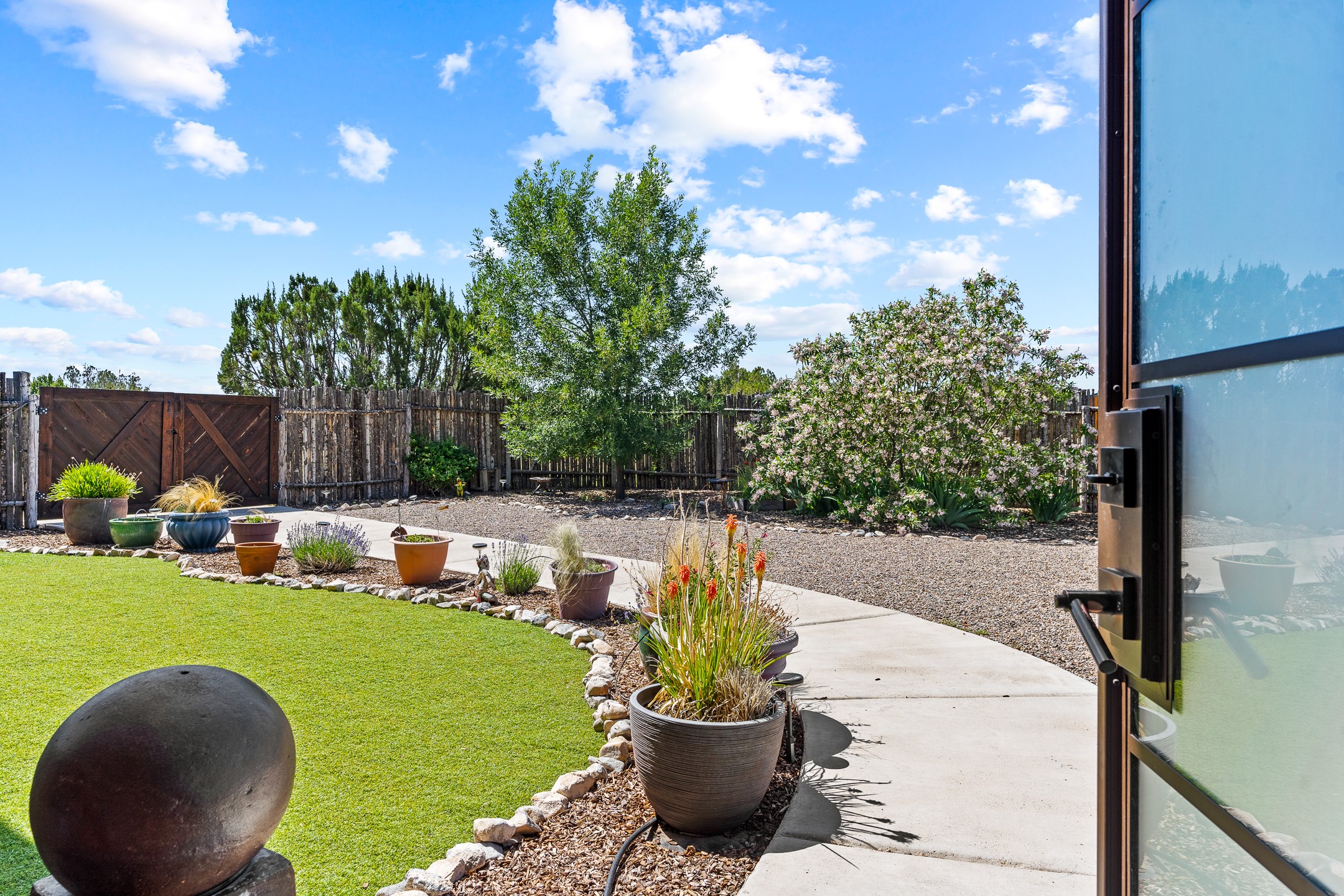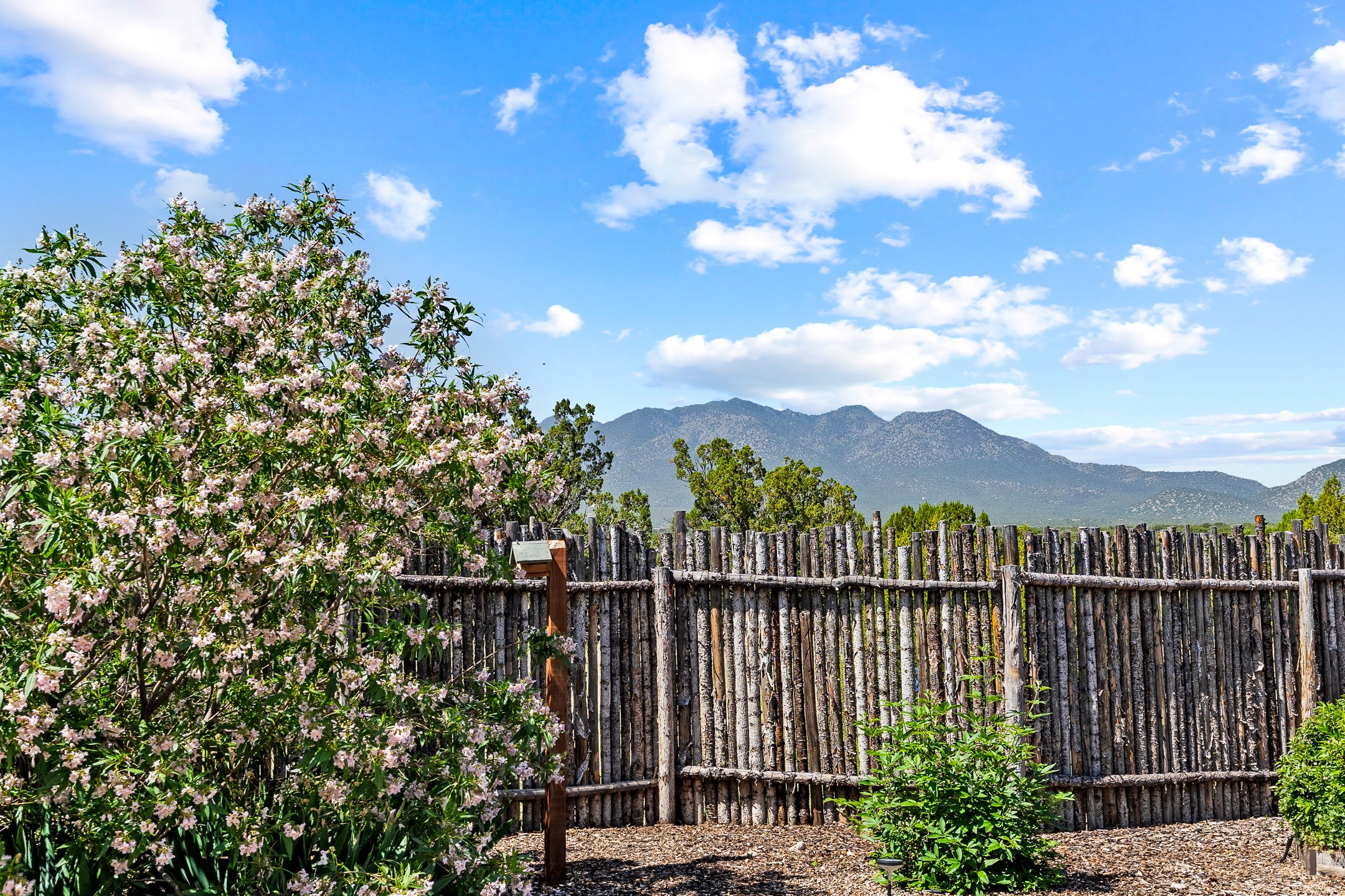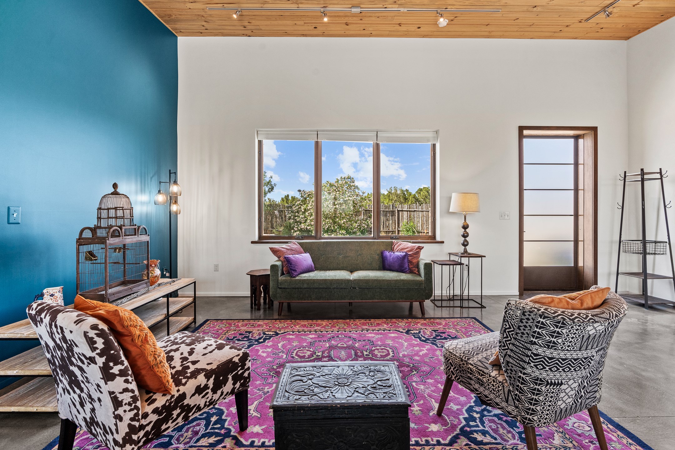 Contemporary style in a high-desert setting with breathtaking mountain views, this home sits on a spacious forty-acre lot in the foothills of the Ortiz Mountains. Fully self-reliant, it boasts utilities provided by solar, wind, and water catchment, with public electric lines available on the street. Thoughtfully designed, the home features high wood plank ceilings, polished concrete floors, and an open, modern kitchen. House is constructed of rastra for energy efficiency and fire safety. Natural light floods the space through glass doors on both the north and south sides of the house. Fenced courtyards delineate landscaped areas, while the remaining acreage remains untouched. The primary suite is cooled by a mini-split, and includes a full bath and conveniently located laundry, while a half bath serves the primary living area.On the opposite side of the house, a large bonus room offers versatility as an office, second bedroom, or art space, and leads to a one-car garage. Both the garage and bonus room are equipped with sinks. The house is warmed by radiant heat in the floors, powered by solar hot water collectors.The property includes a storage shed and shipping container, solar shed, wind generator, 9000 gallons of water storage, as well as hookups for an RV. The locationoffers easy access to town on well-maintained roads within a gated community with no HOA. Located just 21 miles from Santa Fe and near dining and entertainment options in Madrid and Cerrillos, this home provides a perfect retreat without compromising comfort or convenience.