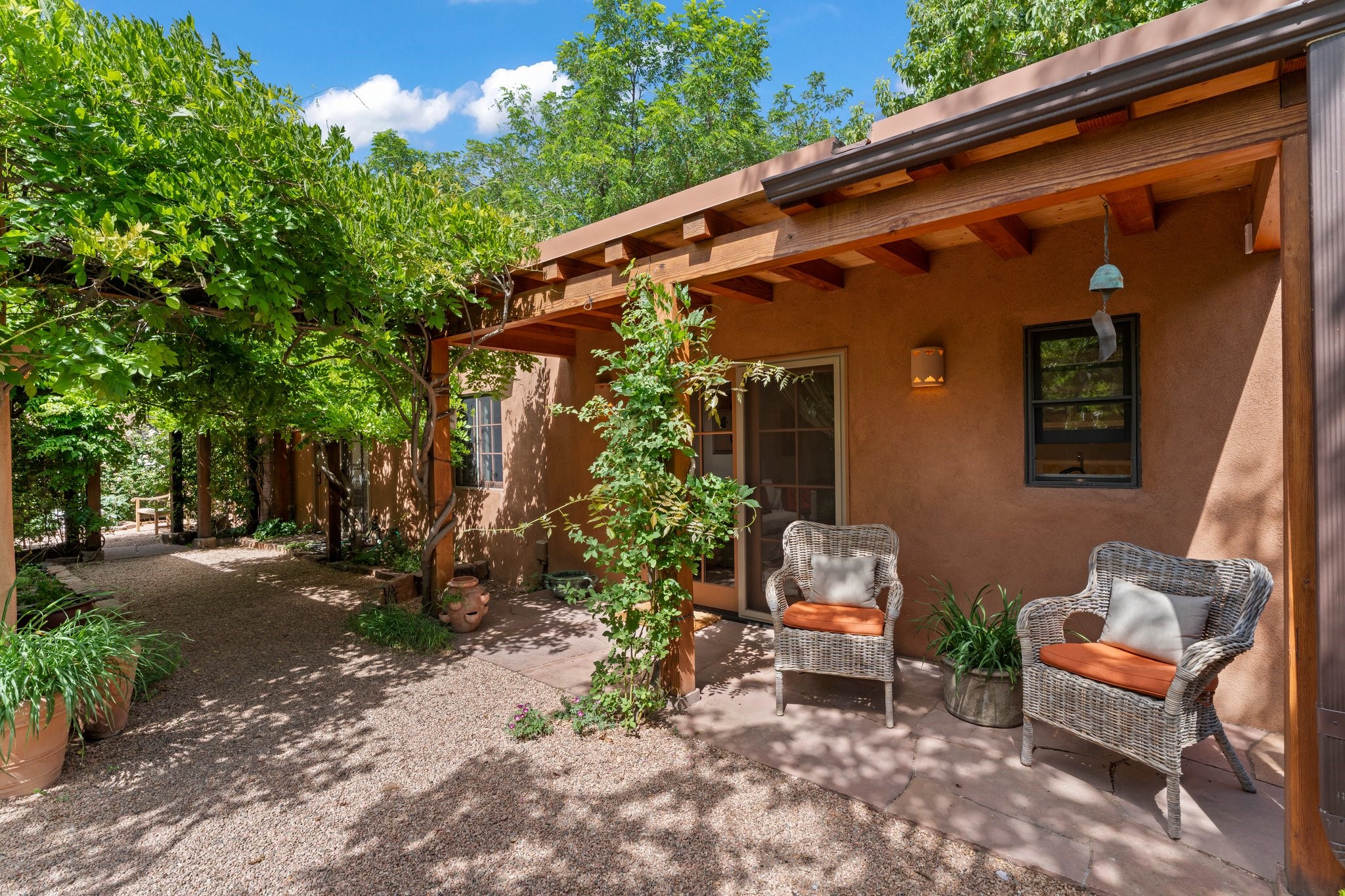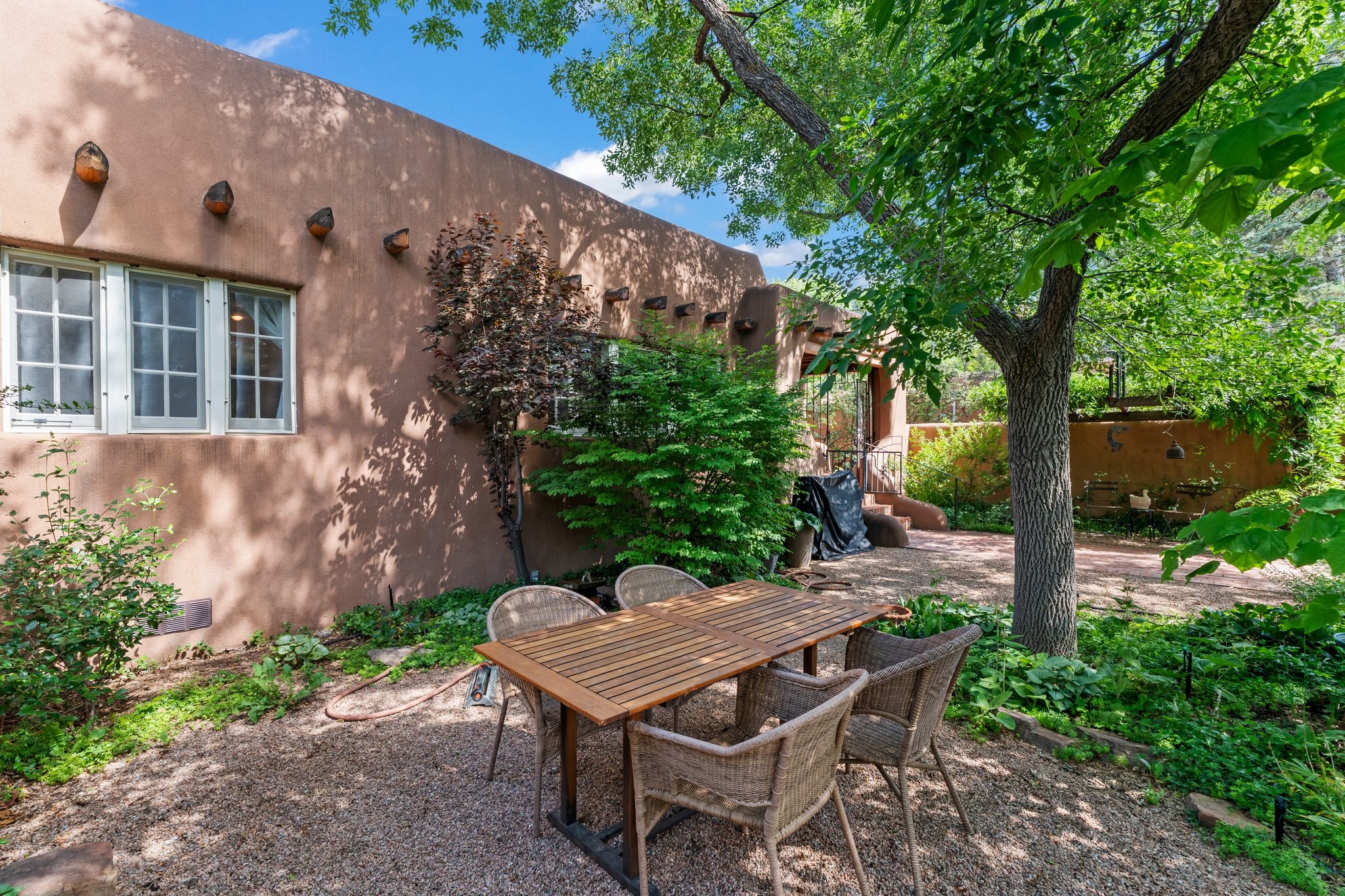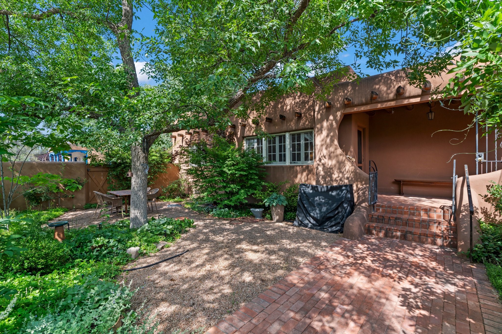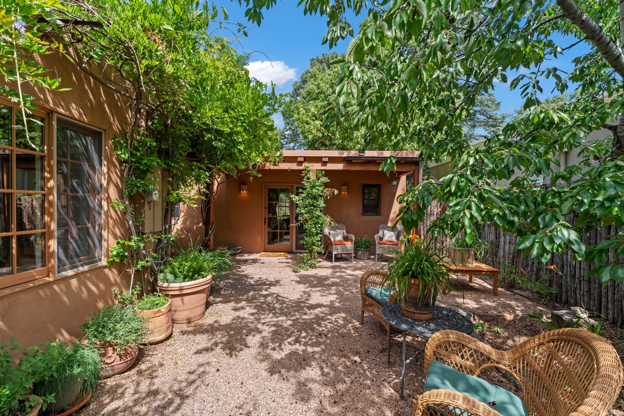 In the heart of Santa Fe's coveted Historic Eastside, this enchanting property offers the perfect blend of charm, versatility, and an unbeatable location. Just a short stroll to local favorites like Downtown Subscription and Garcia Street Books, the home is one of only two residences in the serene Berry Compound. The main house spans 1,866 square feet across a single level, featuring two bedrooms and two bathrooms. The two bedrooms are separated by a flexible area currently used as an office. Thoughtfully designed for comfort and connection to nature, it offers abundant natural light, hardwood floors, built-in bookshelves, and a seamless indoor-outdoor flow. A detached 528-square-foot guesthouse provides ideal accommodations for friends and family, complete with a cozy living room, bedroom, bathroom, and efficient kitchenette. Adjoining the guesthouse is a bright and spacious studio with its own plumbing and cooling--perfect for artists, remote work, or flexible live/work needs. Surrounded by mature landscaping and tranquil garden spaces, the outdoor areas invite year-round enjoyment. Highlights include a welcoming front courtyard, a lush backyard with climbing roses, a wisteria-draped arbor, and a variety of fruit trees including apple, quince, and cherry. Additional features include a steam shower, two dedicated off-street parking spaces, and a large usable basement offering ample storage. With timeless appeal and a location that puts you minutes from the Plaza and Canyon Road, this rare Eastside offering combines Santa Fe charm with modern livability.