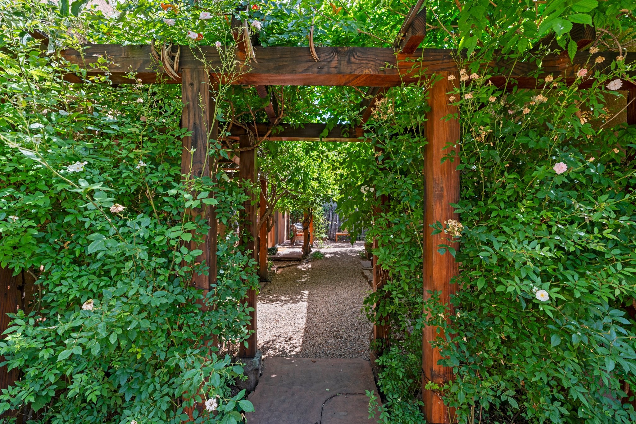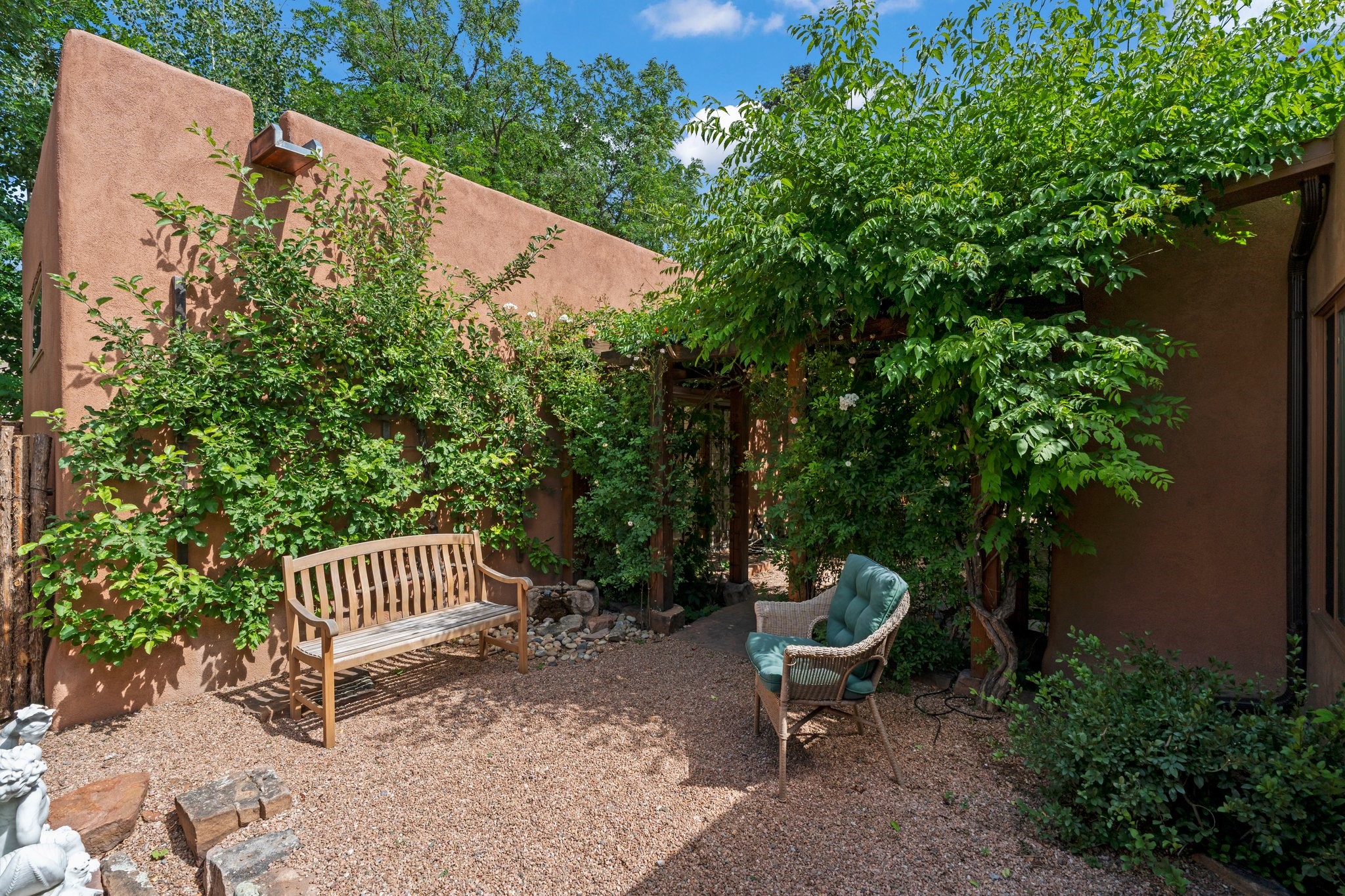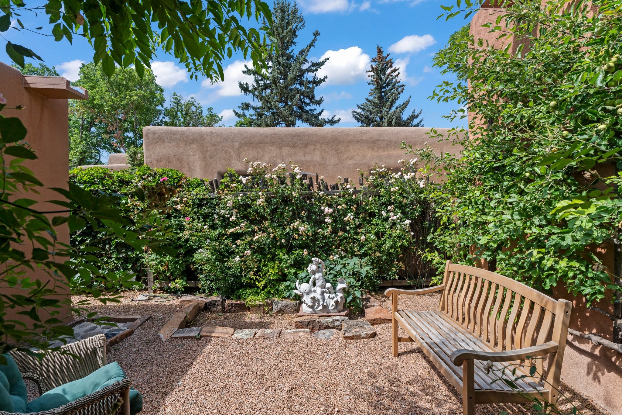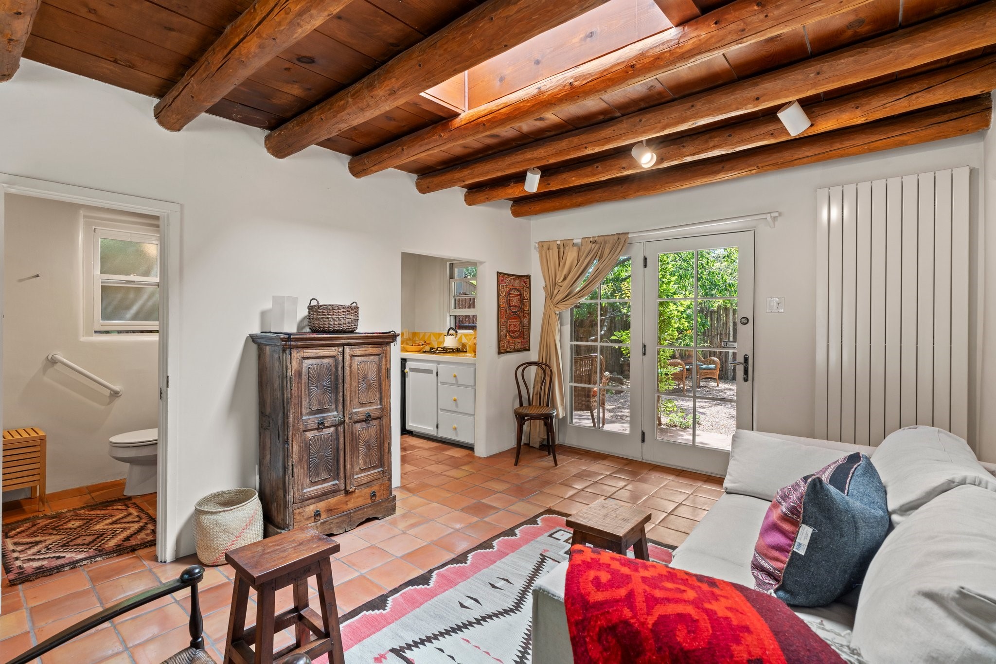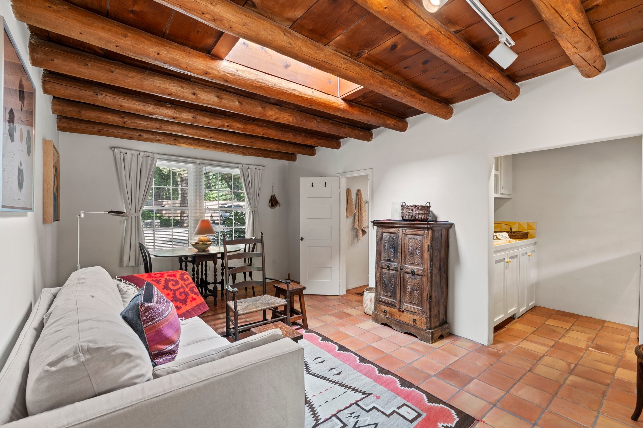 In the heart of Santa Fe's coveted Historic Eastside, this enchanting property offers the perfect blend of charm, versatility, and an unbeatable location. Just a short stroll to local favorites like Downtown Subscription and Garcia Street Books, the home is one of only two residences in the serene Berry Compound. The main house spans 1,866 square feet across a single level, featuring two bedrooms and two bathrooms. The two bedrooms are separated by a flexible area currently used as an office. Thoughtfully designed for comfort and connection to nature, it offers abundant natural light, hardwood floors, built-in bookshelves, and a seamless indoor-outdoor flow. A detached 528-square-foot guesthouse provides ideal accommodations for friends and family, complete with a cozy living room, bedroom, bathroom, and efficient kitchenette. Adjoining the guesthouse is a bright and spacious studio with its own plumbing and cooling--perfect for artists, remote work, or flexible live/work needs. Surrounded by mature landscaping and tranquil garden spaces, the outdoor areas invite year-round enjoyment. Highlights include a welcoming front courtyard, a lush backyard with climbing roses, a wisteria-draped arbor, and a variety of fruit trees including apple, quince, and cherry. Additional features include a steam shower, two dedicated off-street parking spaces, and a large usable basement offering ample storage. With timeless appeal and a location that puts you minutes from the Plaza and Canyon Road, this rare Eastside offering combines Santa Fe charm with modern livability.