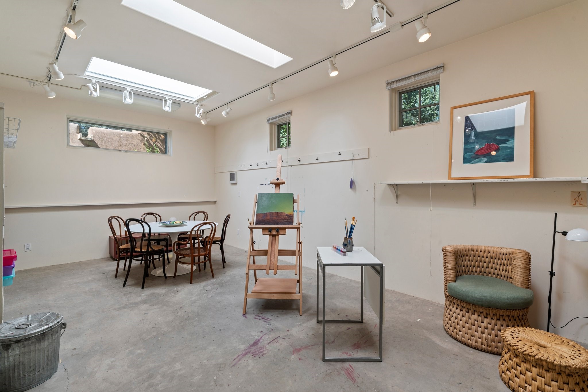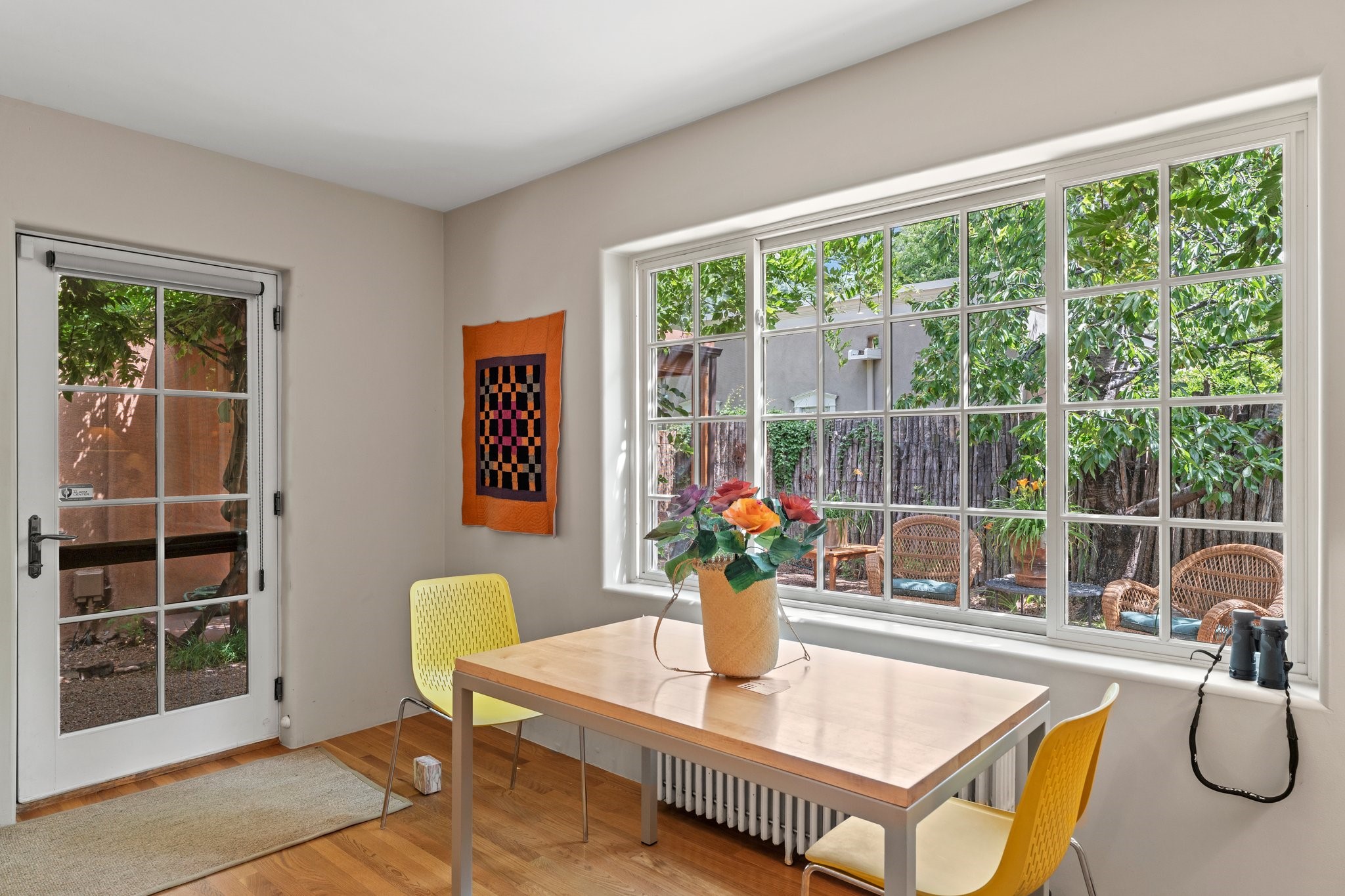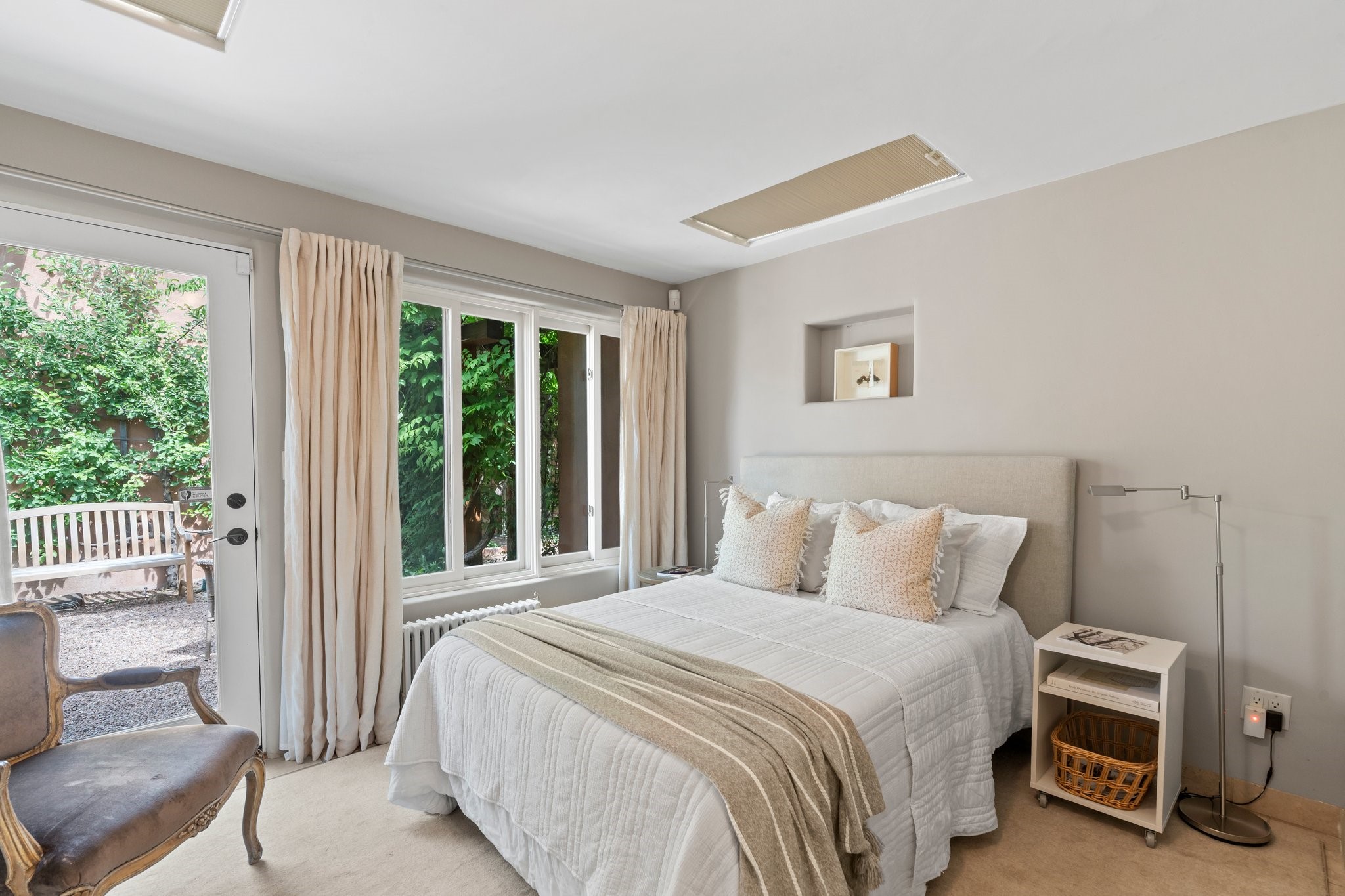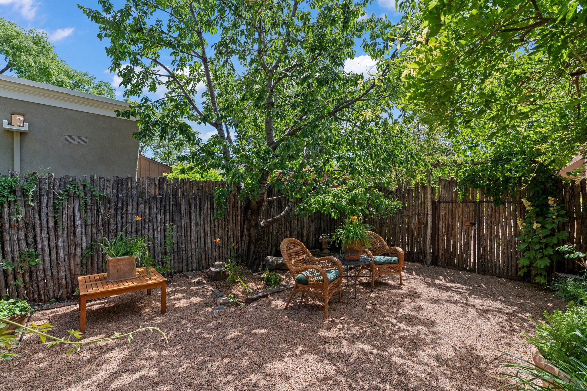 In the heart of Santa Fe's coveted Historic Eastside, this enchanting property offers the perfect blend of charm, versatility, and an unbeatable location. Just a short stroll to local favorites like Downtown Subscription and Garcia Street Books, the home is one of only two residences in the serene Berry Compound. The main house spans 1,866 square feet across a single level, featuring two bedrooms and two bathrooms. The two bedrooms are separated by a flexible area currently used as an office. Thoughtfully designed for comfort and connection to nature, it offers abundant natural light, hardwood floors, built-in bookshelves, and a seamless indoor-outdoor flow. A detached 528-square-foot guesthouse provides ideal accommodations for friends and family, complete with a cozy living room, bedroom, bathroom, and efficient kitchenette. Adjoining the guesthouse is a bright and spacious studio with its own plumbing and cooling--perfect for artists, remote work, or flexible live/work needs. Surrounded by mature landscaping and tranquil garden spaces, the outdoor areas invite year-round enjoyment. Highlights include a welcoming front courtyard, a lush backyard with climbing roses, a wisteria-draped arbor, and a variety of fruit trees including apple, quince, and cherry. Additional features include a steam shower, two dedicated off-street parking spaces, and a large usable basement offering ample storage. With timeless appeal and a location that puts you minutes from the Plaza and Canyon Road, this rare Eastside offering combines Santa Fe charm with modern livability.