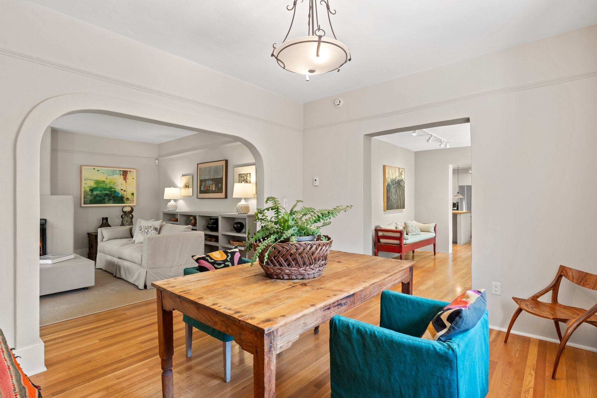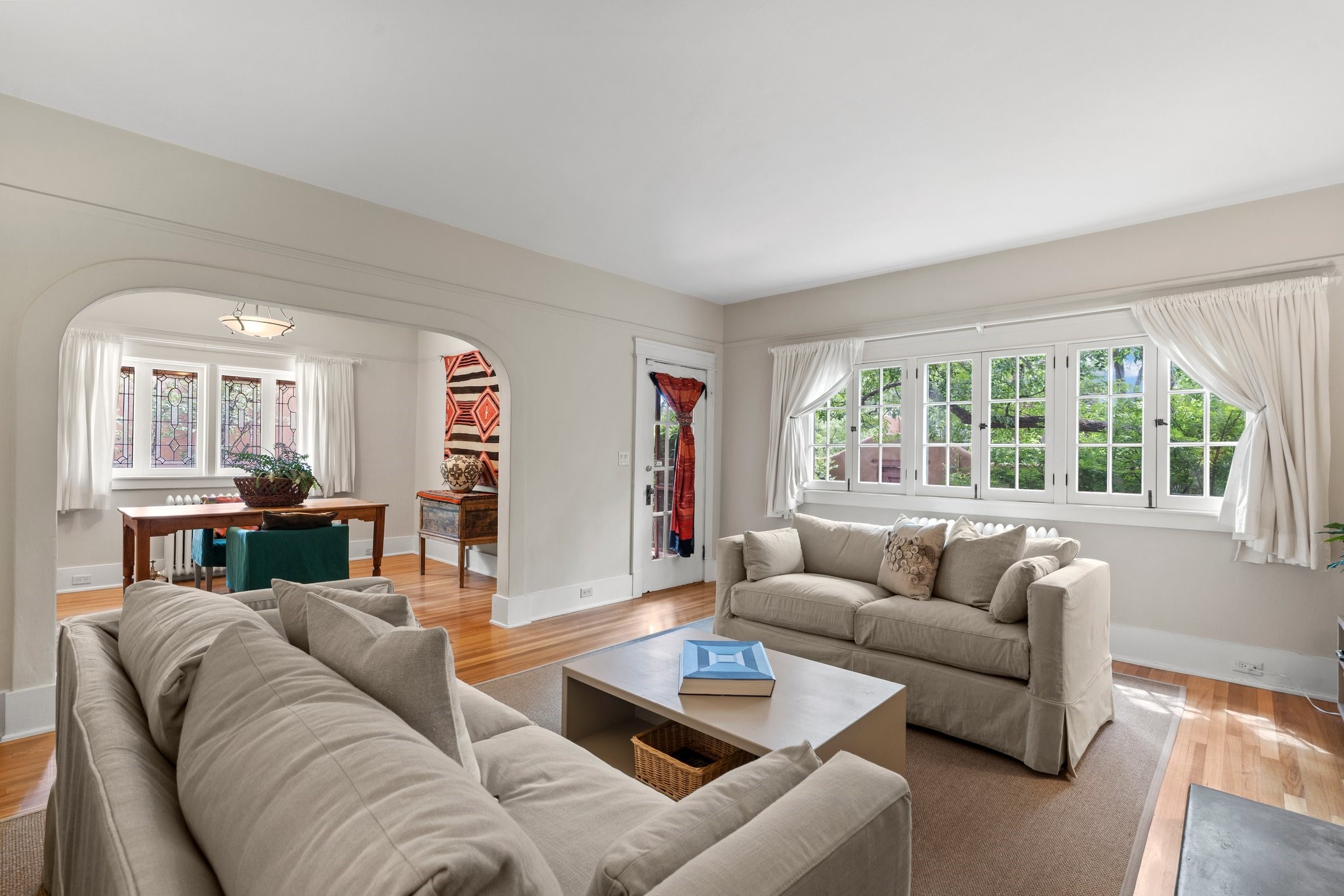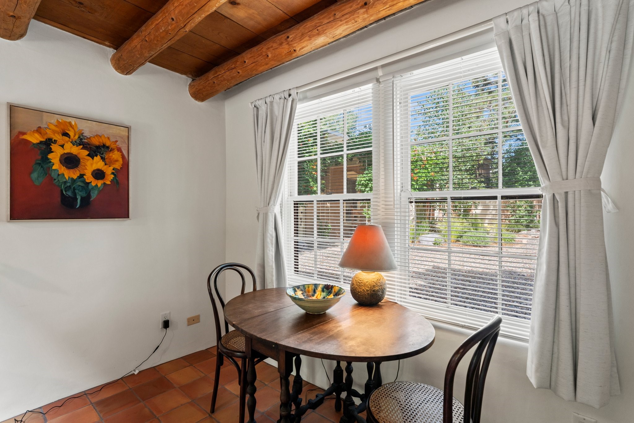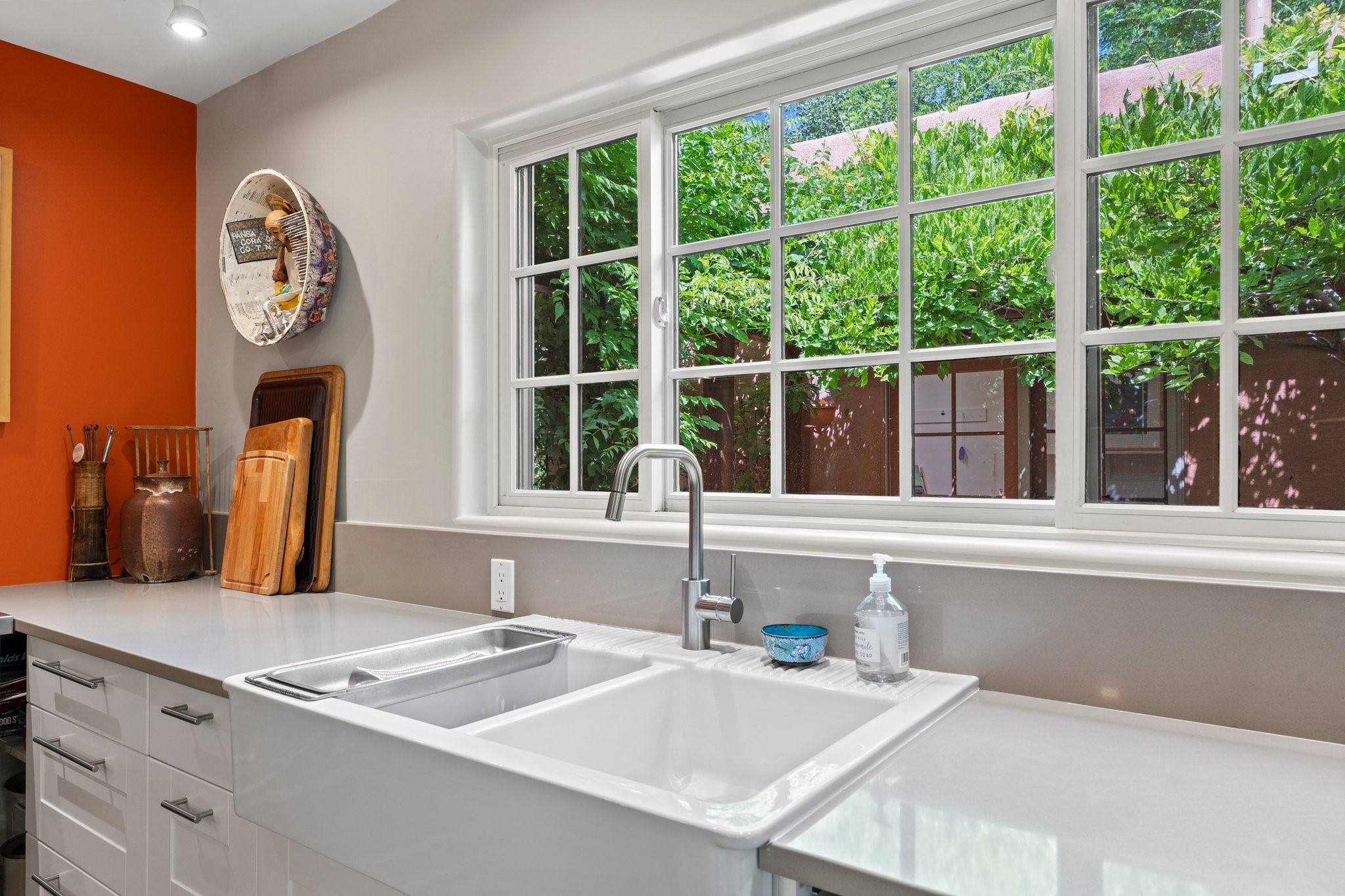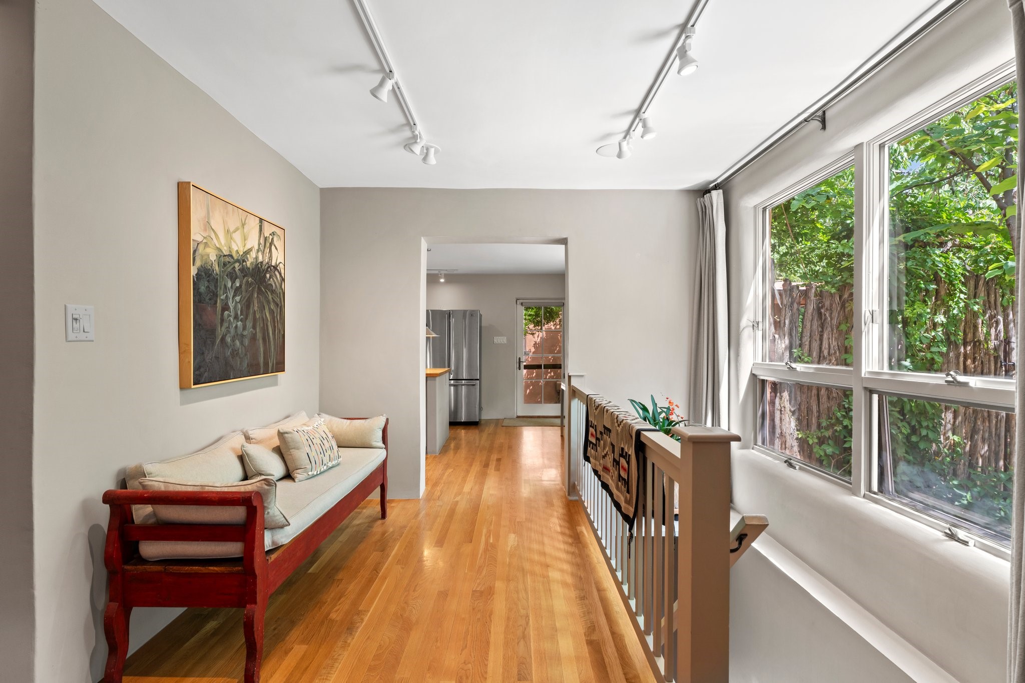 In the heart of Santa Fe's coveted Historic Eastside, this enchanting property offers the perfect blend of charm, versatility, and an unbeatable location. Just a short stroll to local favorites like Downtown Subscription and Garcia Street Books, the home is one of only two residences in the serene Berry Compound. The main house spans 1,866 square feet across a single level, featuring two bedrooms and two bathrooms. The two bedrooms are separated by a flexible area currently used as an office. Thoughtfully designed for comfort and connection to nature, it offers abundant natural light, hardwood floors, built-in bookshelves, and a seamless indoor-outdoor flow. A detached 528-square-foot guesthouse provides ideal accommodations for friends and family, complete with a cozy living room, bedroom, bathroom, and efficient kitchenette. Adjoining the guesthouse is a bright and spacious studio with its own plumbing and cooling--perfect for artists, remote work, or flexible live/work needs. Surrounded by mature landscaping and tranquil garden spaces, the outdoor areas invite year-round enjoyment. Highlights include a welcoming front courtyard, a lush backyard with climbing roses, a wisteria-draped arbor, and a variety of fruit trees including apple, quince, and cherry. Additional features include a steam shower, two dedicated off-street parking spaces, and a large usable basement offering ample storage. With timeless appeal and a location that puts you minutes from the Plaza and Canyon Road, this rare Eastside offering combines Santa Fe charm with modern livability.