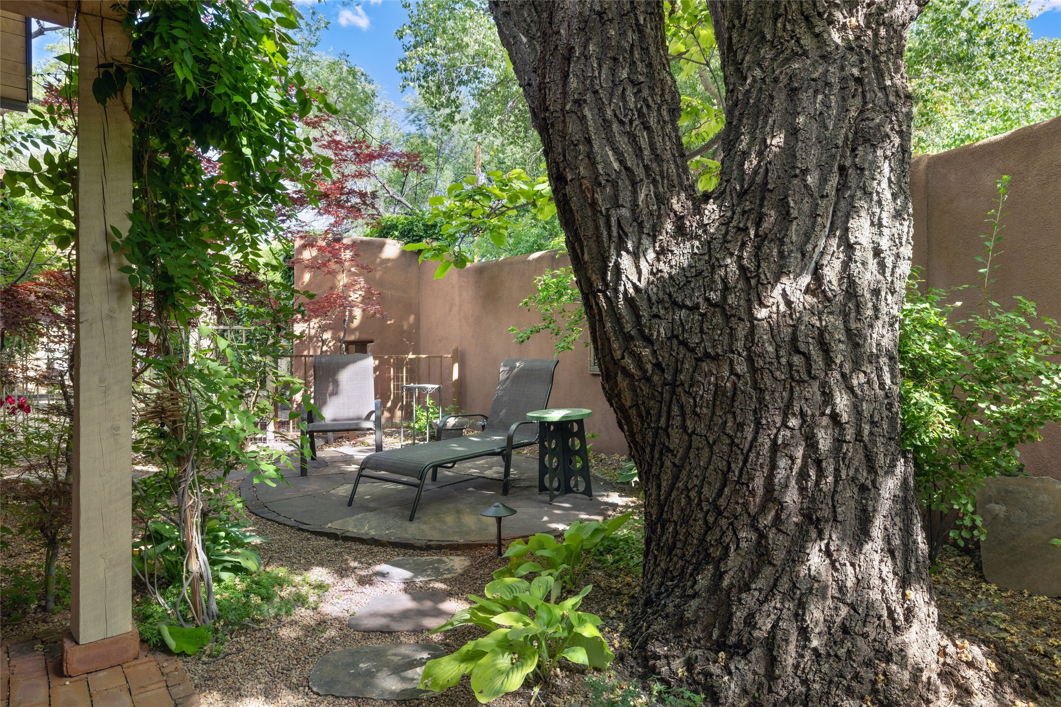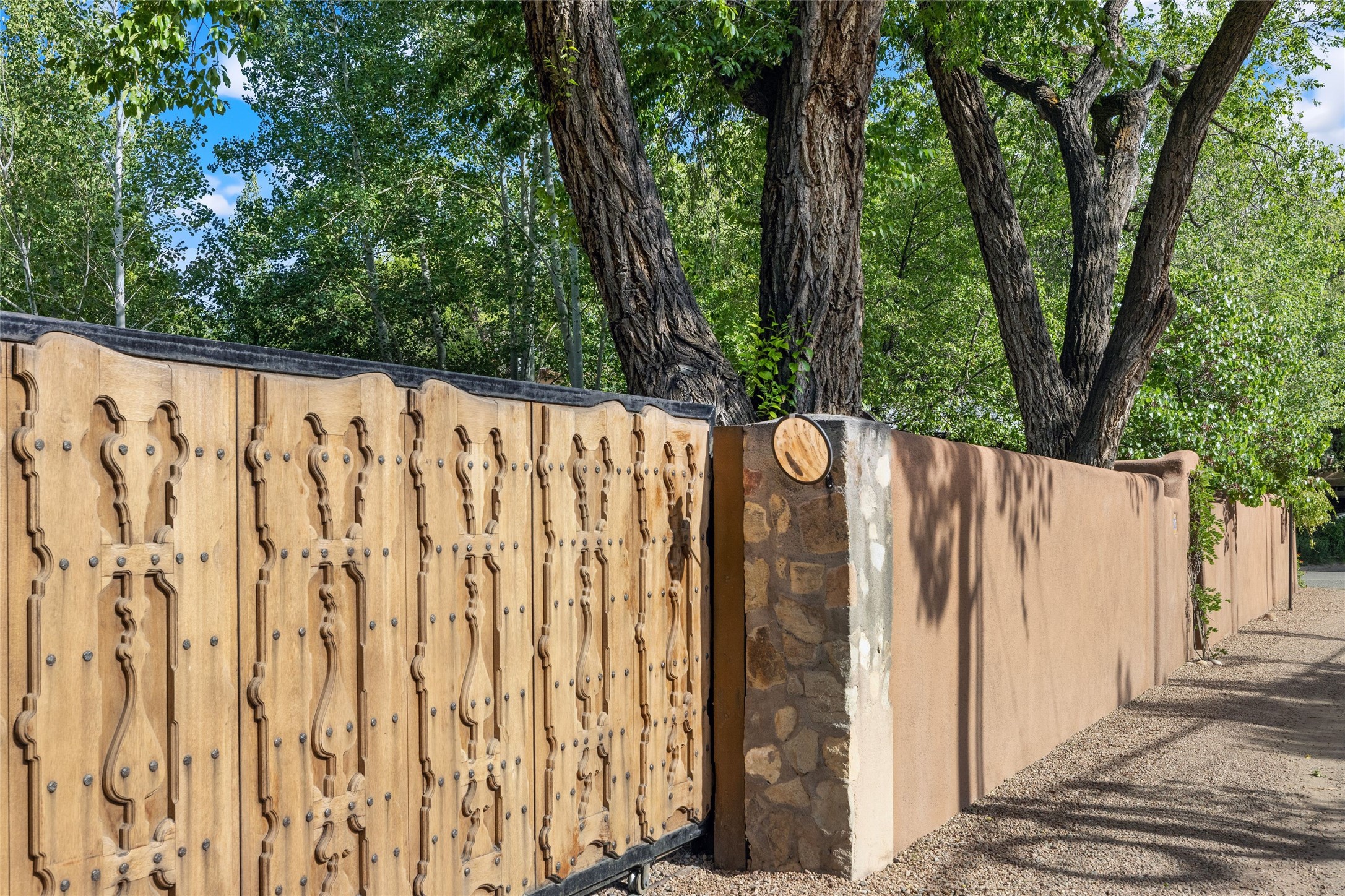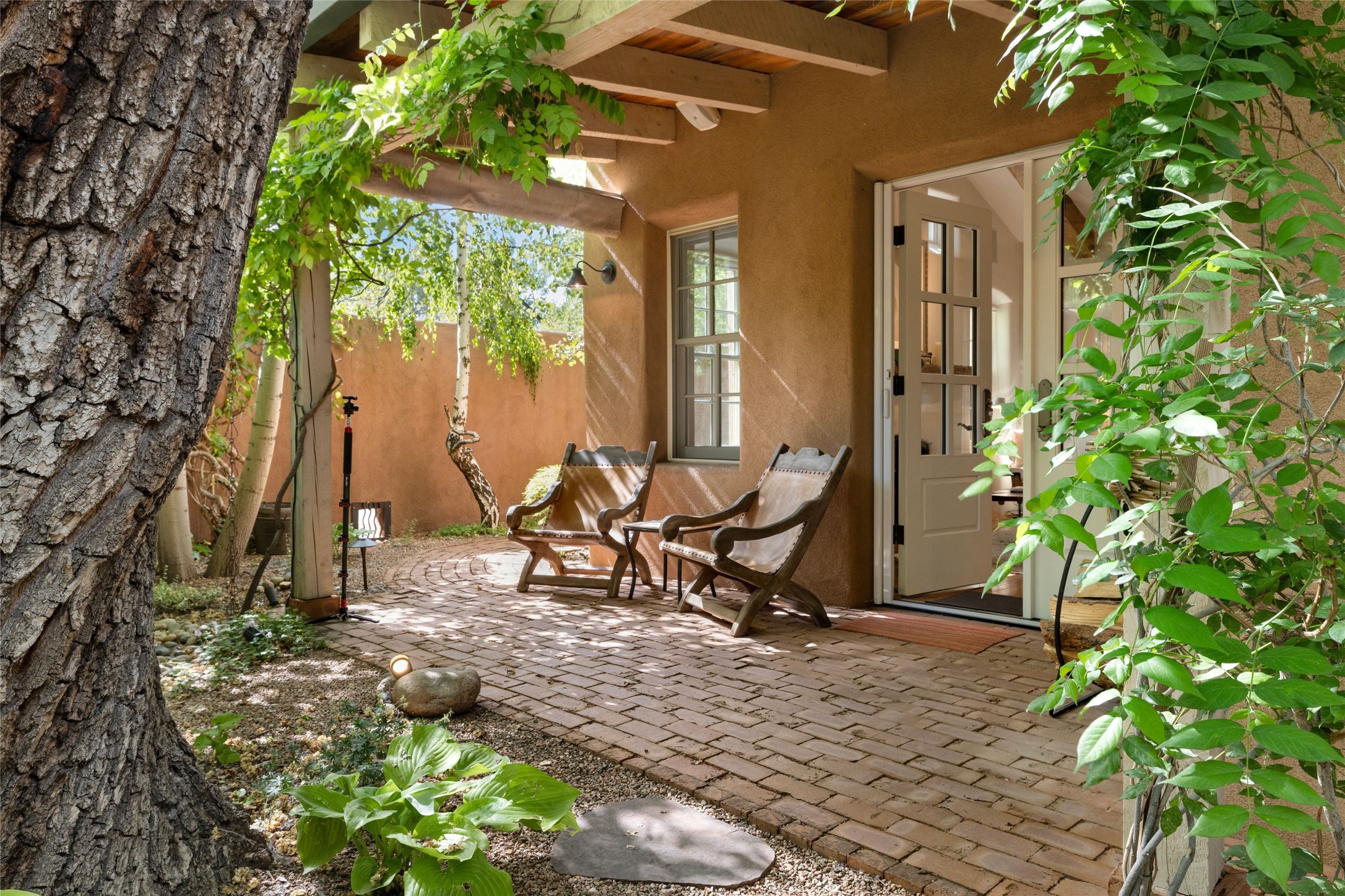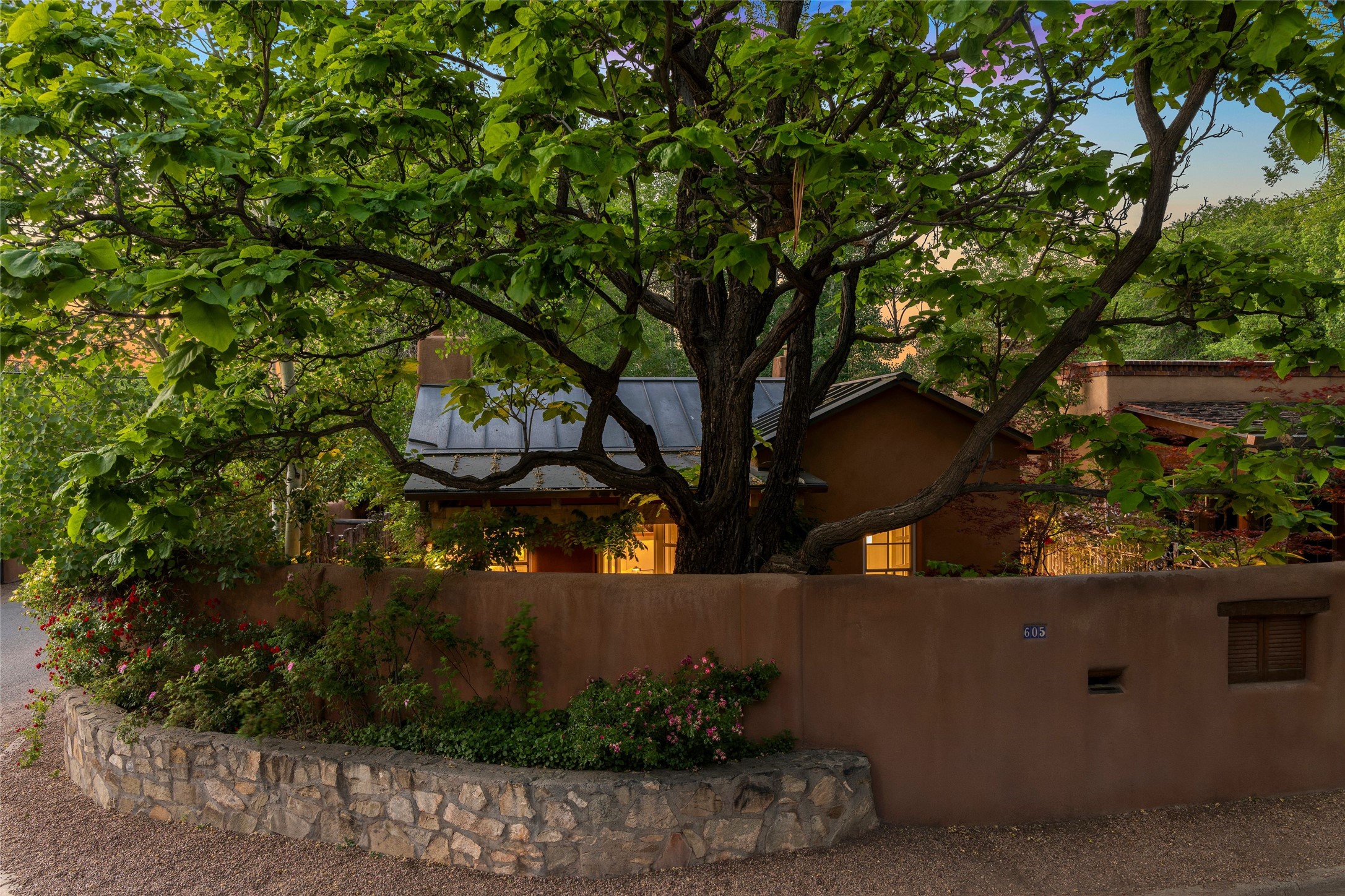 Experience the ultimate Santa Fe lifestyle, on one of the most iconic streets in all of Santa Fe, built by the famed, Sharon Woods. This extremely rare Historic Eastside home excites and impresses with modern architecture and lush, surround vibrant landscape and fountains, just steps away from the world class galleries and restaurants along Canyon Road and the Santa Fe River. Enter through the private, custom hand-carved electric gate, meander through the private pathway fountains, to this magical retreat. Built in 2008, this beautifully appointed home with soaring ceilings dazzles with soft natural light throughout and captivating design features. Ideal as the perfect lock and leave Santa Fe retreat, or as a primary home, 605 Acequia Madre has never been offered for sale since completion and is truly a rare offering. Design highlights include a stunning living room, located directly off the kitchen, with a grand fireplace, pitched ceilings with rich beams and surround view windows. Culinary enthusiasts will appreciate the well-appointed kitchen with custom cabinets, luxury appliances and ample storage which opens to the dining room and the vast outdoor entertainment and dining areas. The elegant primary suite, located on the main level, enjoys a private, fenced garden area with a fountain and an exquisite, spa-like bath with a walk-in closet. The spacious guest suite, located downstairs, offers privacy and a 1/2 bath, with a full bath option located on the main level. The outdoor living experience is one of the finest on the Historic Eastside, with vibrant gardens, multiple patios designed for both grand entertaining and intimate moments. Additional exceptional features include gated parking, a Northern New Mexican-style pitched roof, fully enclosed grounds, creamy plaster walls, and modern features. The property seamlessly blends seclusion with convenience, within the heart of the Historic Eastside and is not to be missed.