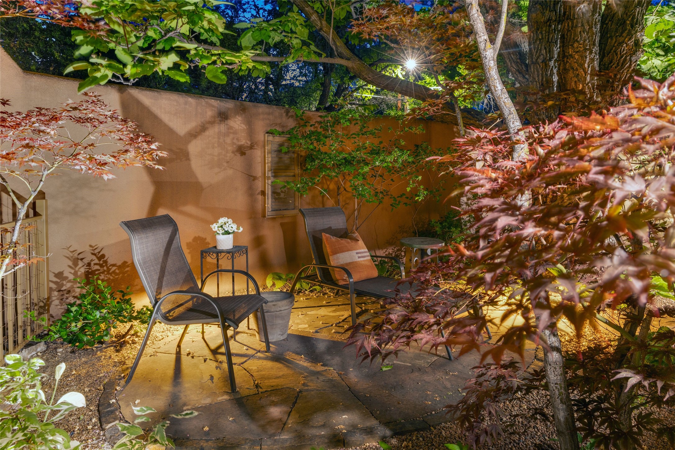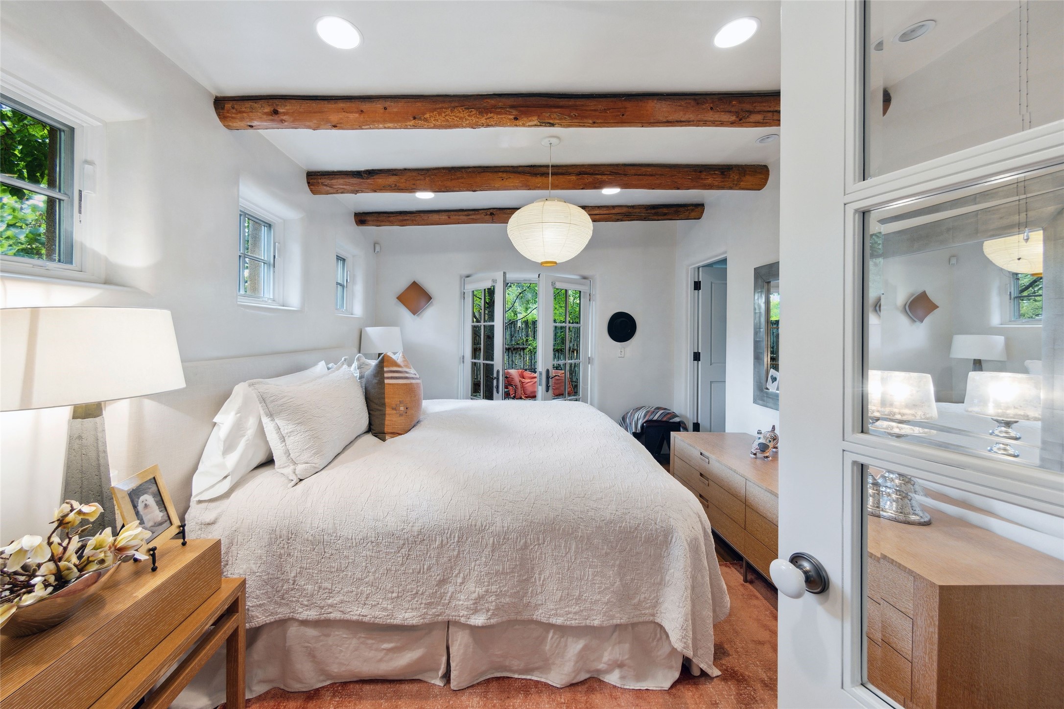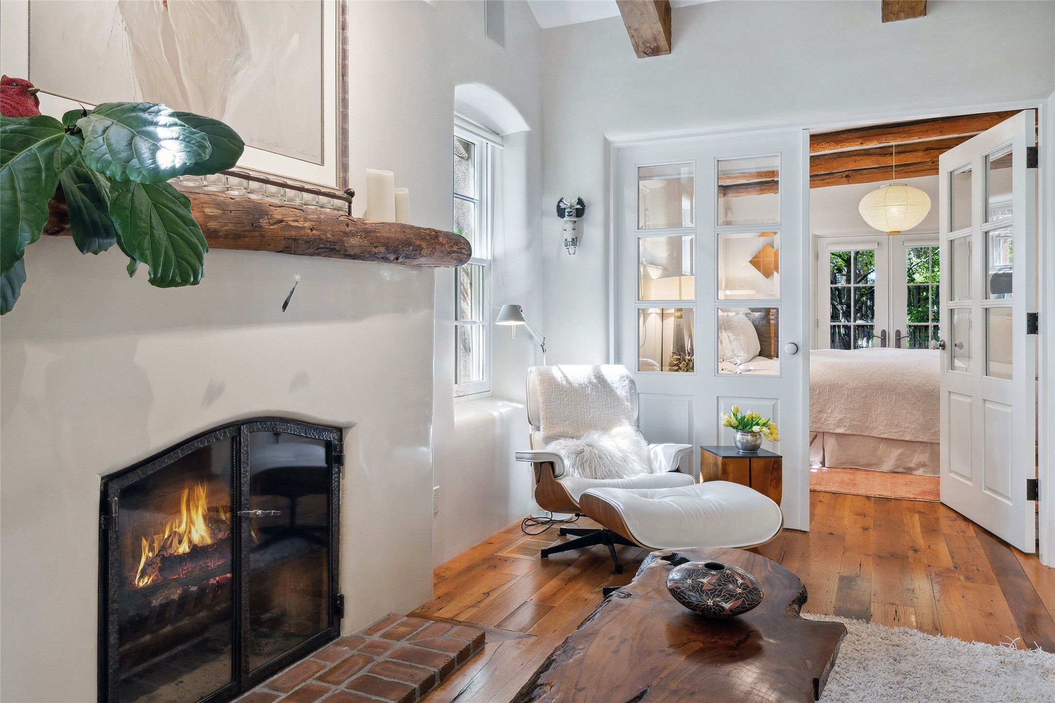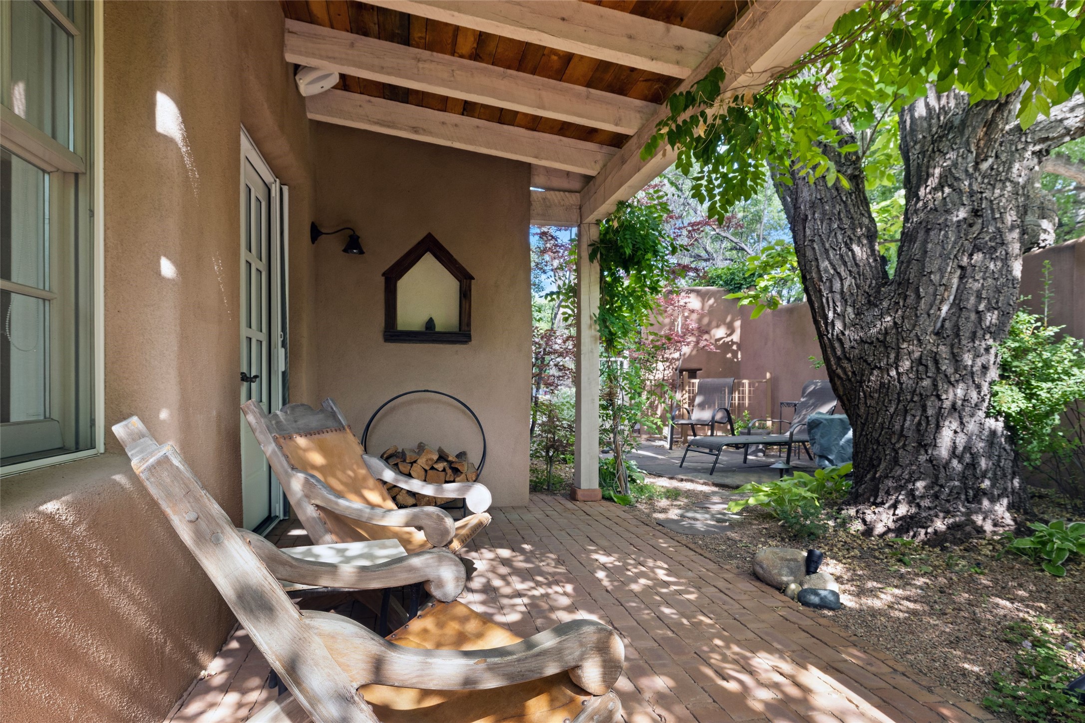 Experience the ultimate Santa Fe lifestyle, on one of the most iconic streets in all of Santa Fe, built by the famed, Sharon Woods. This extremely rare Historic Eastside home excites and impresses with modern architecture and lush, surround vibrant landscape and fountains, just steps away from the world class galleries and restaurants along Canyon Road and the Santa Fe River. Enter through the private, custom hand-carved electric gate, meander through the private pathway fountains, to this magical retreat. Built in 2008, this beautifully appointed home with soaring ceilings dazzles with soft natural light throughout and captivating design features. Ideal as the perfect lock and leave Santa Fe retreat, or as a primary home, 605 Acequia Madre has never been offered for sale since completion and is truly a rare offering. Design highlights include a stunning living room, located directly off the kitchen, with a grand fireplace, pitched ceilings with rich beams and surround view windows. Culinary enthusiasts will appreciate the well-appointed kitchen with custom cabinets, luxury appliances and ample storage which opens to the dining room and the vast outdoor entertainment and dining areas. The elegant primary suite, located on the main level, enjoys a private, fenced garden area with a fountain and an exquisite, spa-like bath with a walk-in closet. The spacious guest suite, located downstairs, offers privacy and a 1/2 bath, with a full bath option located on the main level. The outdoor living experience is one of the finest on the Historic Eastside, with vibrant gardens, multiple patios designed for both grand entertaining and intimate moments. Additional exceptional features include gated parking, a Northern New Mexican-style pitched roof, fully enclosed grounds, creamy plaster walls, and modern features. The property seamlessly blends seclusion with convenience, within the heart of the Historic Eastside and is not to be missed.