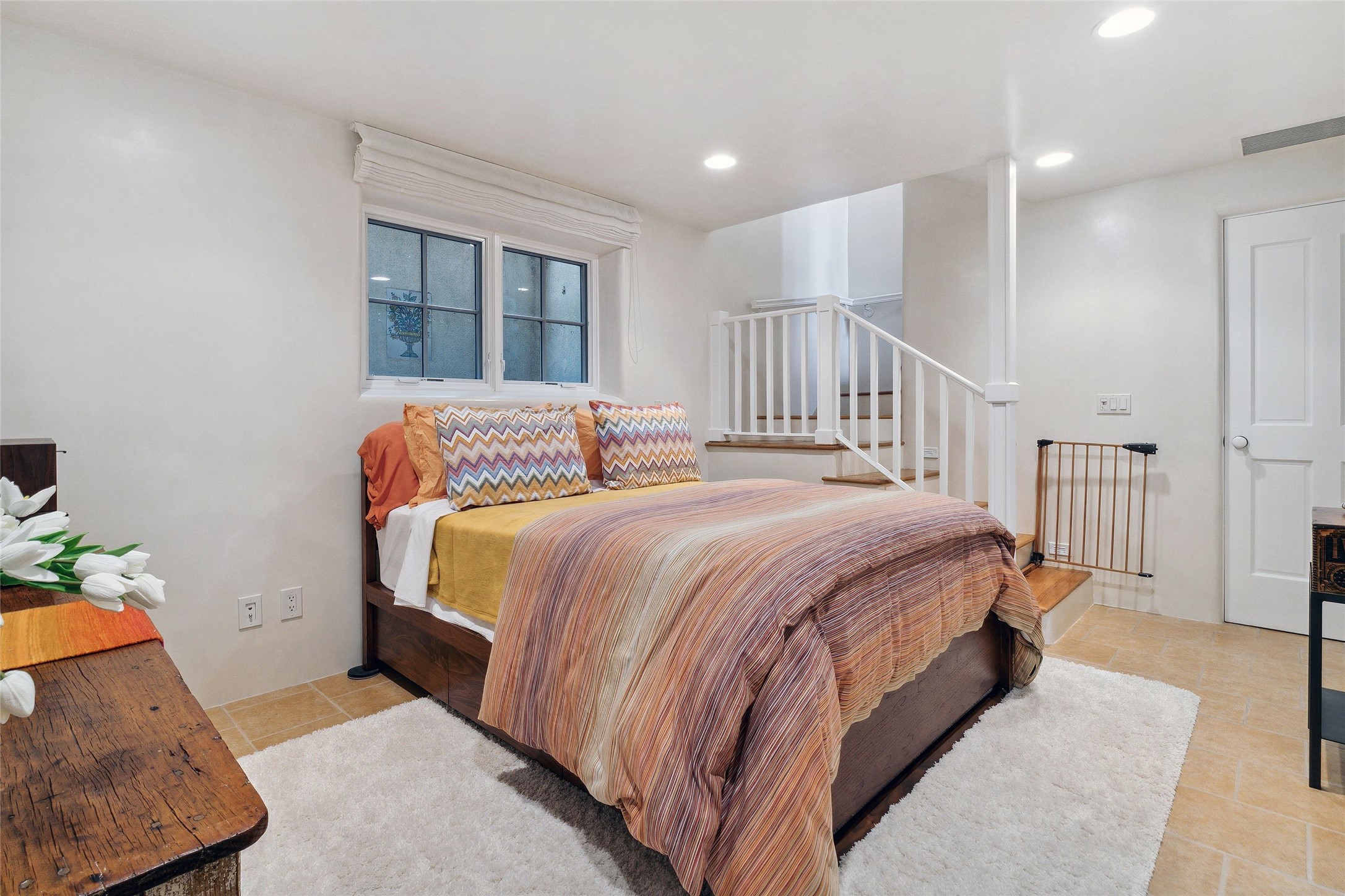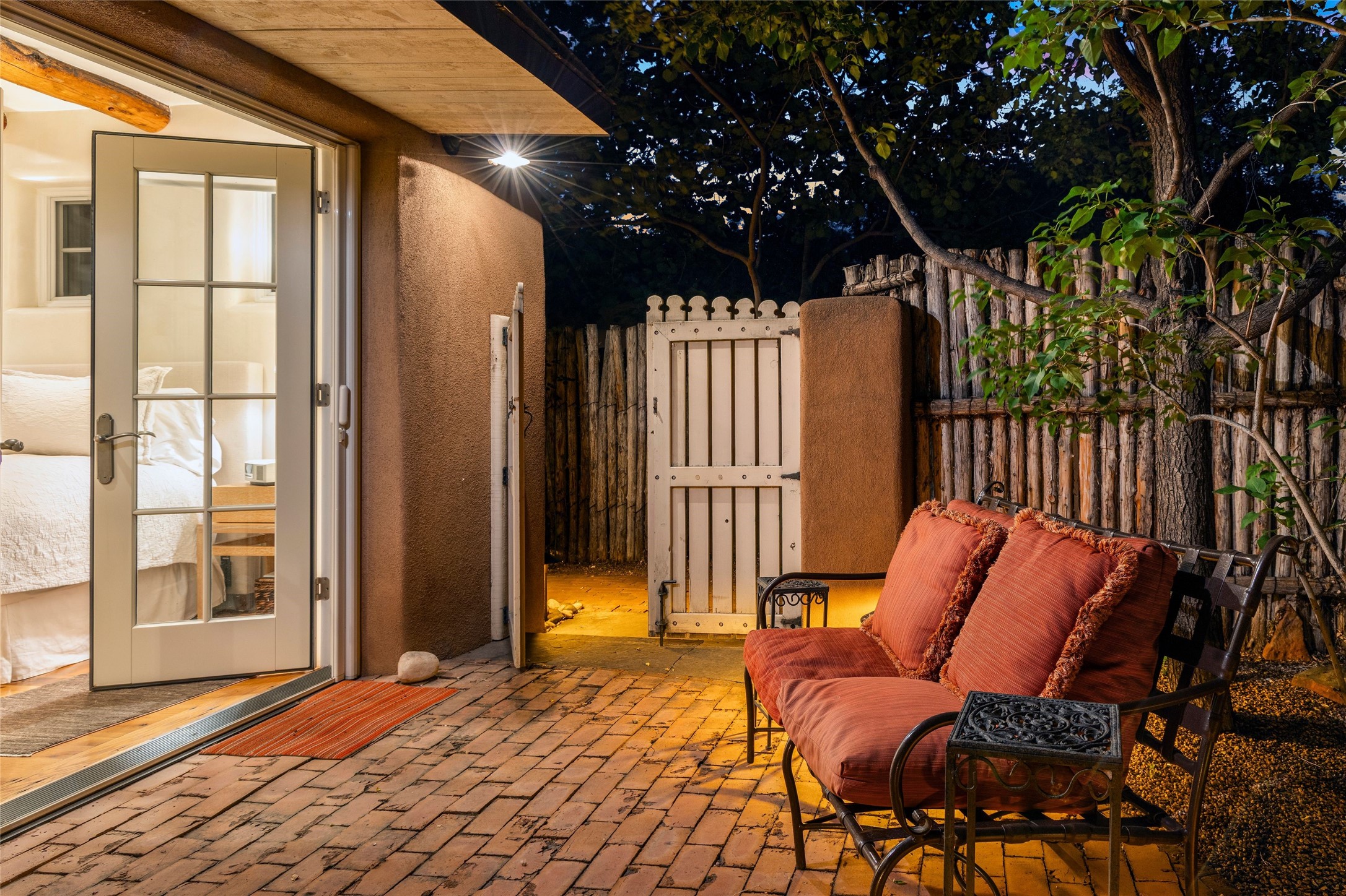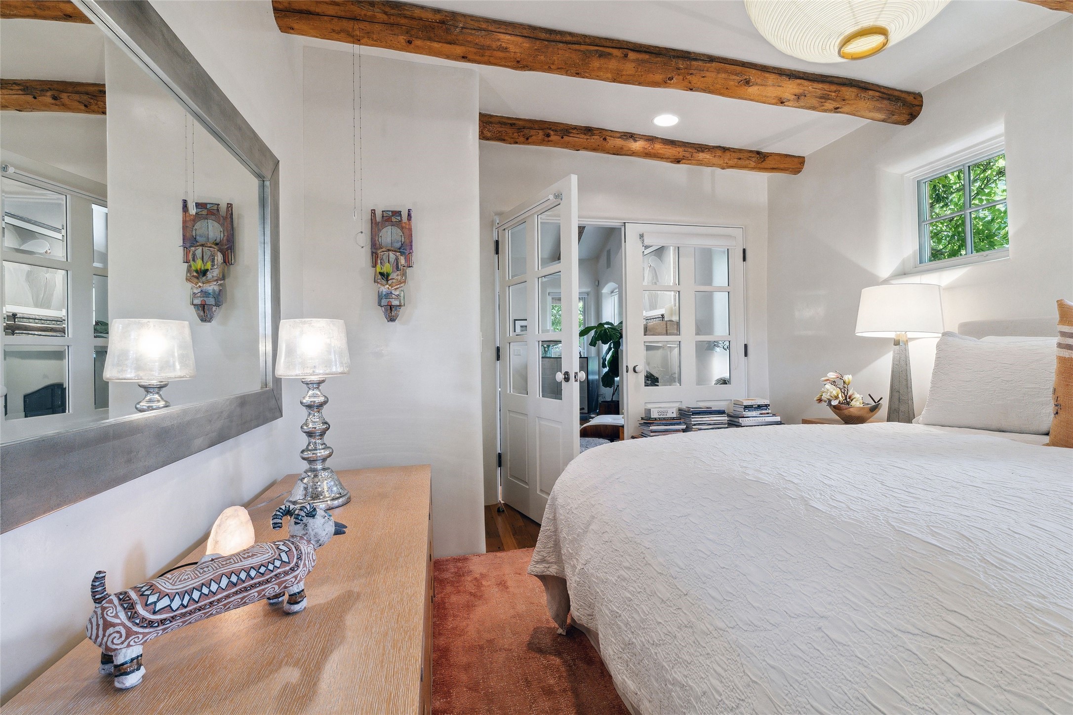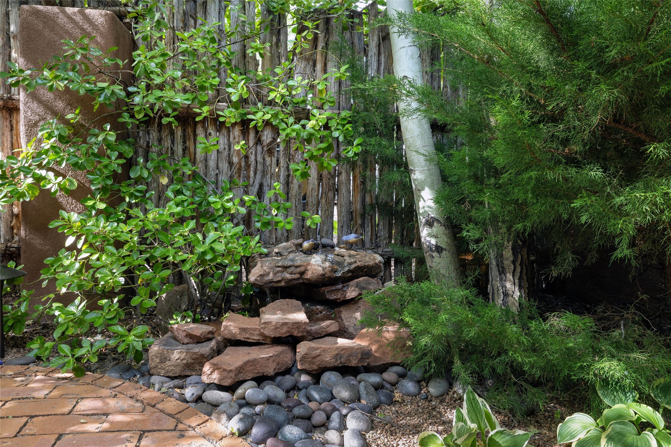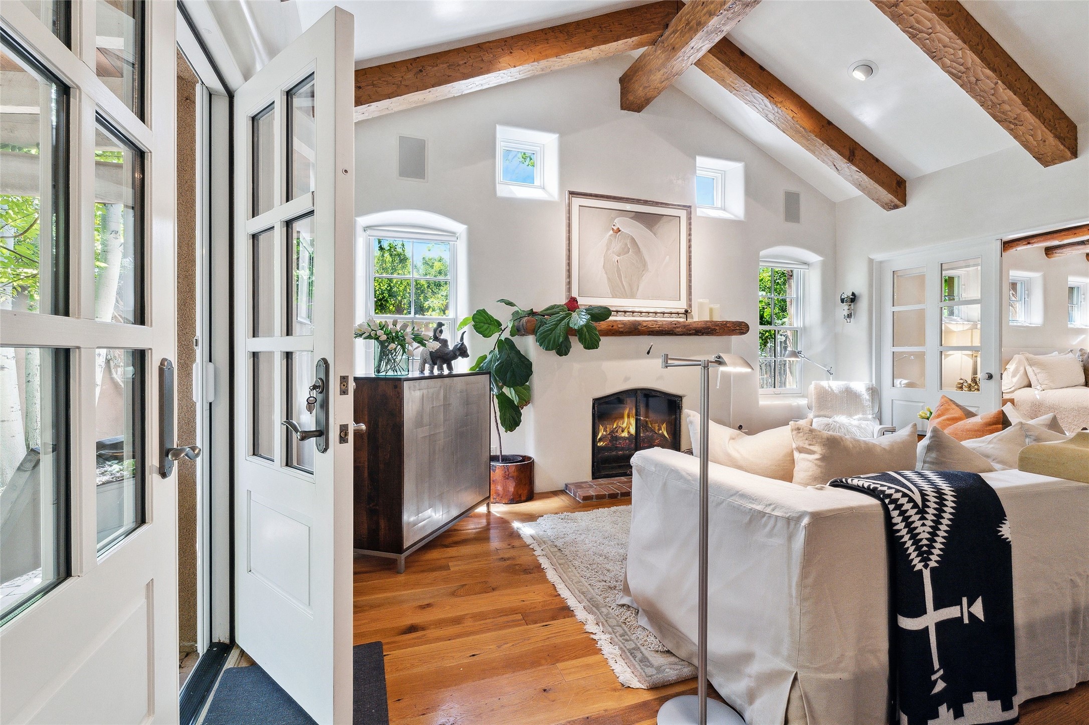 Experience the ultimate Santa Fe lifestyle, on one of the most iconic streets in all of Santa Fe, built by the famed, Sharon Woods. This extremely rare Historic Eastside home excites and impresses with modern architecture and lush, surround vibrant landscape and fountains, just steps away from the world class galleries and restaurants along Canyon Road and the Santa Fe River. Enter through the private, custom hand-carved electric gate, meander through the private pathway fountains, to this magical retreat. Built in 2008, this beautifully appointed home with soaring ceilings dazzles with soft natural light throughout and captivating design features. Ideal as the perfect lock and leave Santa Fe retreat, or as a primary home, 605 Acequia Madre has never been offered for sale since completion and is truly a rare offering. Design highlights include a stunning living room, located directly off the kitchen, with a grand fireplace, pitched ceilings with rich beams and surround view windows. Culinary enthusiasts will appreciate the well-appointed kitchen with custom cabinets, luxury appliances and ample storage which opens to the dining room and the vast outdoor entertainment and dining areas. The elegant primary suite, located on the main level, enjoys a private, fenced garden area with a fountain and an exquisite, spa-like bath with a walk-in closet. The spacious guest suite, located downstairs, offers privacy and a 1/2 bath, with a full bath option located on the main level. The outdoor living experience is one of the finest on the Historic Eastside, with vibrant gardens, multiple patios designed for both grand entertaining and intimate moments. Additional exceptional features include gated parking, a Northern New Mexican-style pitched roof, fully enclosed grounds, creamy plaster walls, and modern features. The property seamlessly blends seclusion with convenience, within the heart of the Historic Eastside and is not to be missed.