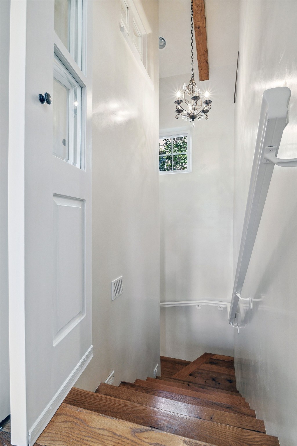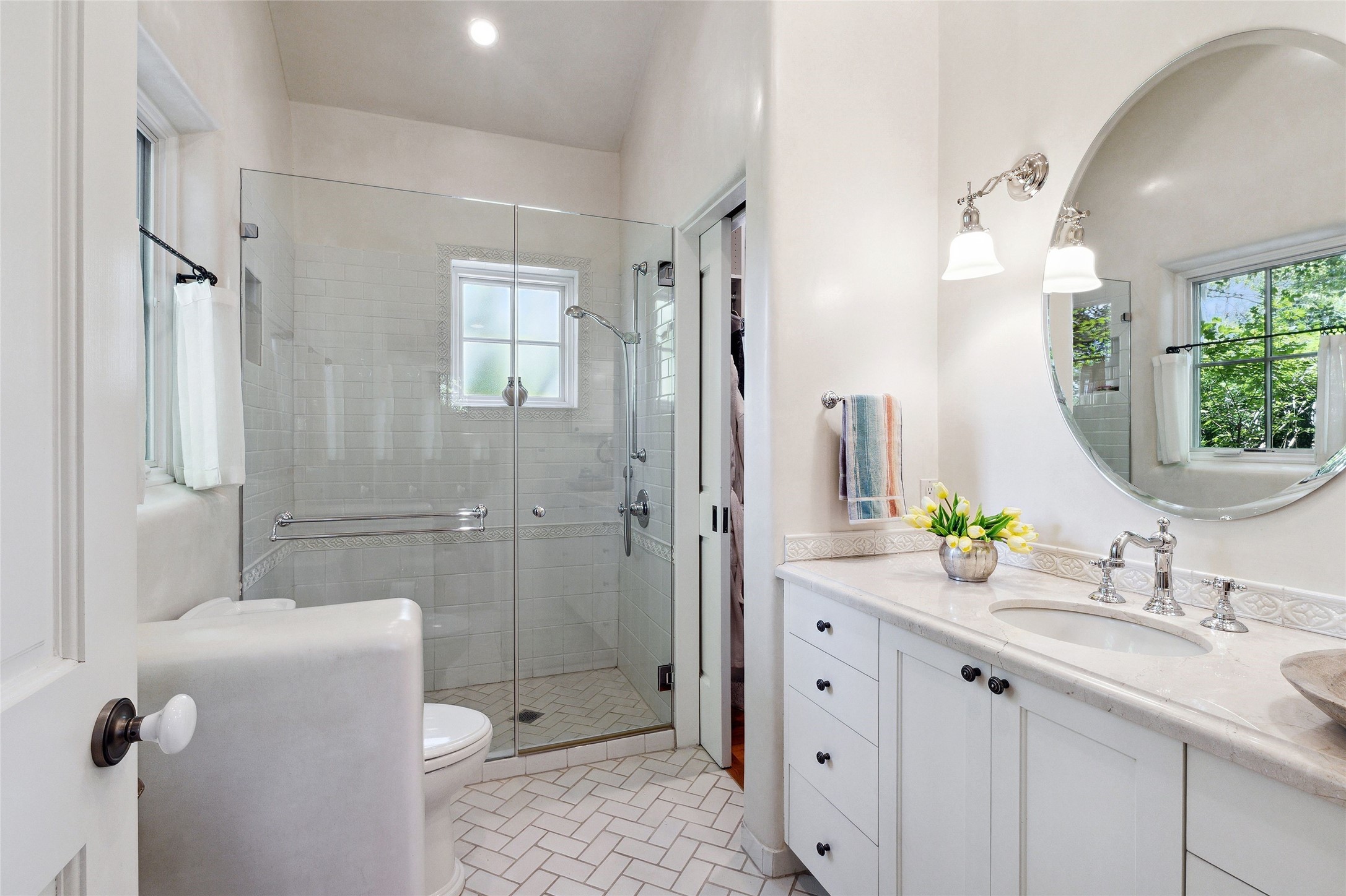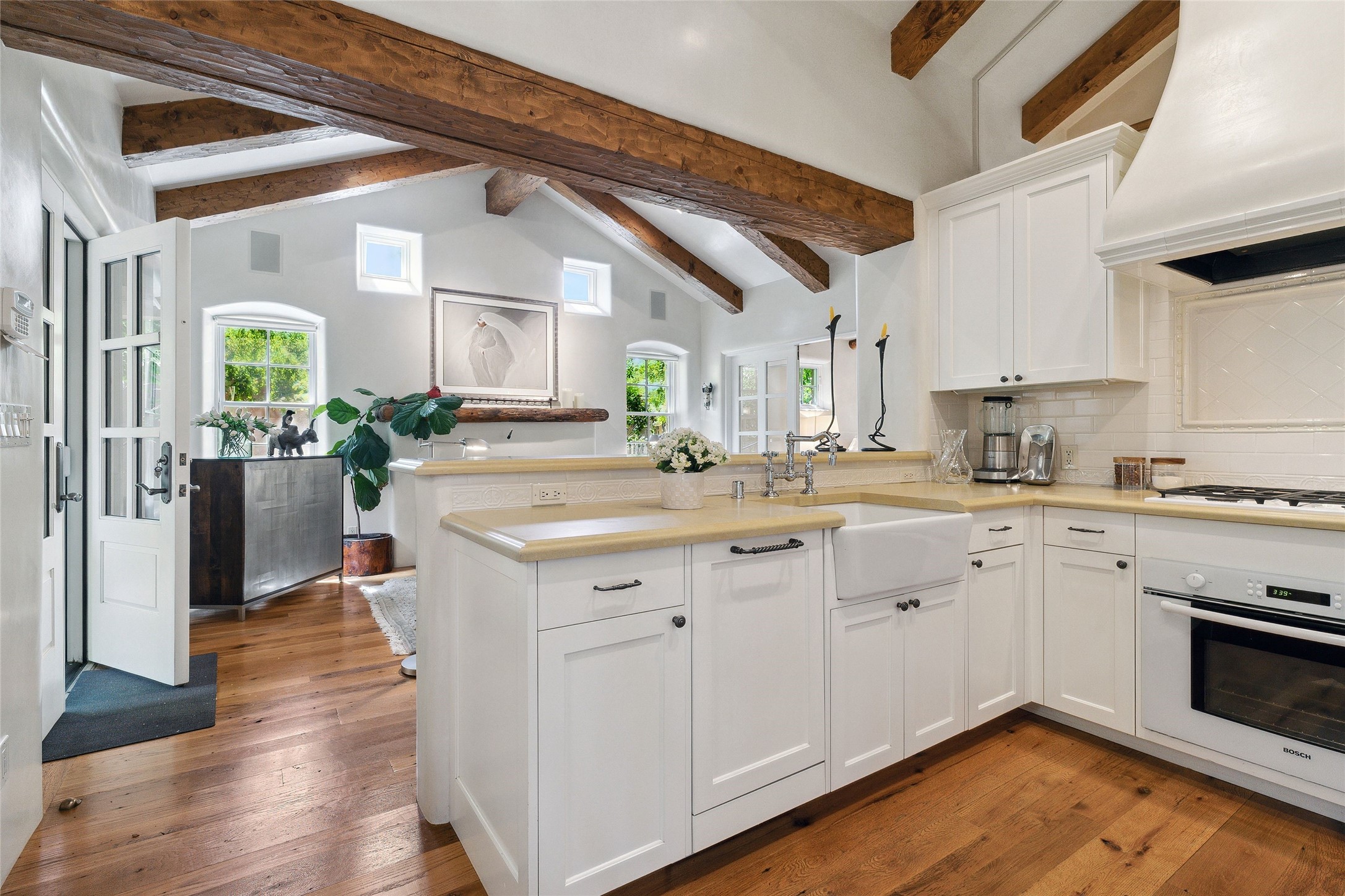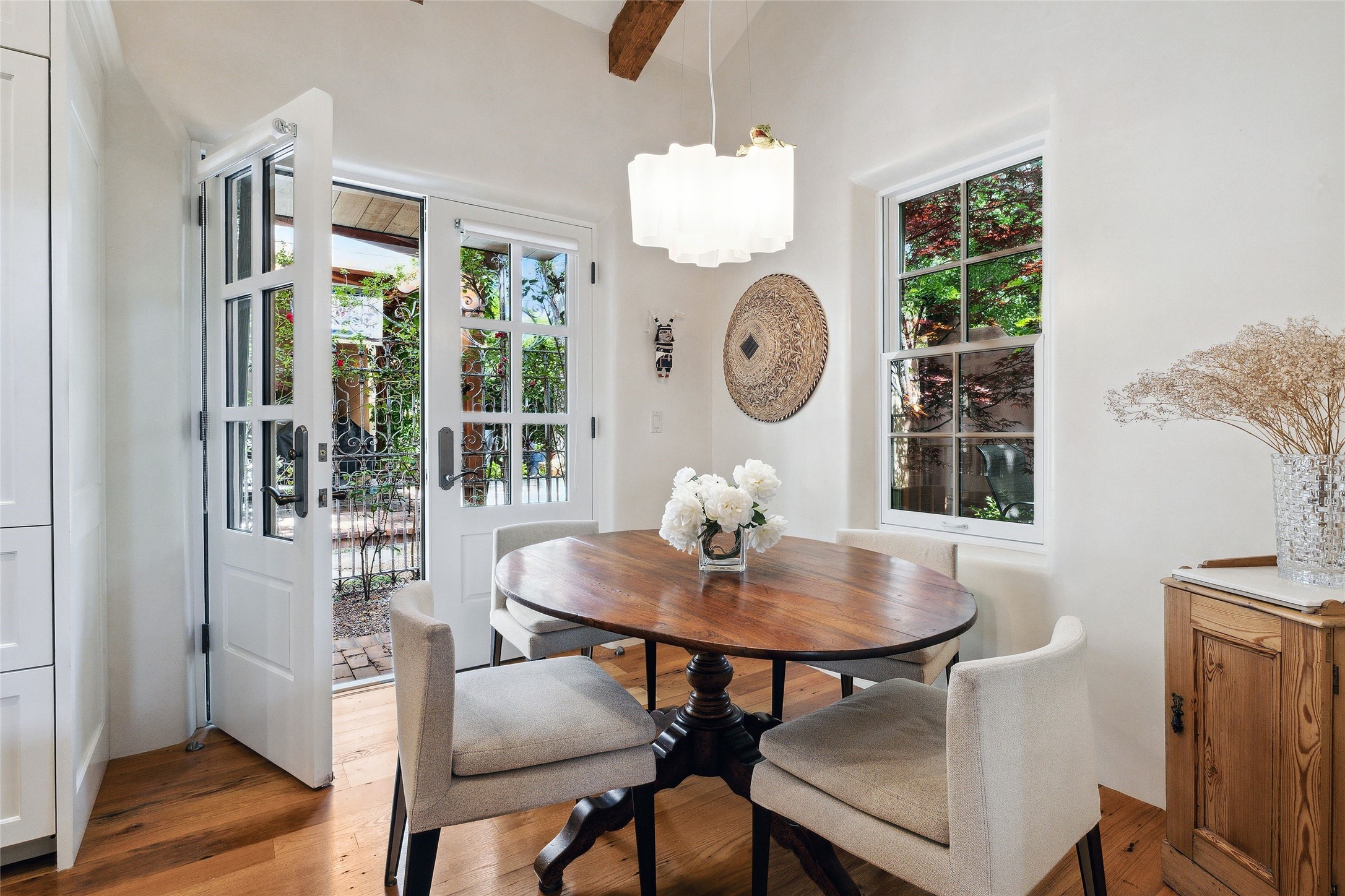 Experience the ultimate Santa Fe lifestyle, on one of the most iconic streets in all of Santa Fe, built by the famed, Sharon Woods. This extremely rare Historic Eastside home excites and impresses with modern architecture and lush, surround vibrant landscape and fountains, just steps away from the world class galleries and restaurants along Canyon Road and the Santa Fe River. Enter through the private, custom hand-carved electric gate, meander through the private pathway fountains, to this magical retreat. Built in 2008, this beautifully appointed home with soaring ceilings dazzles with soft natural light throughout and captivating design features. Ideal as the perfect lock and leave Santa Fe retreat, or as a primary home, 605 Acequia Madre has never been offered for sale since completion and is truly a rare offering. Design highlights include a stunning living room, located directly off the kitchen, with a grand fireplace, pitched ceilings with rich beams and surround view windows. Culinary enthusiasts will appreciate the well-appointed kitchen with custom cabinets, luxury appliances and ample storage which opens to the dining room and the vast outdoor entertainment and dining areas. The elegant primary suite, located on the main level, enjoys a private, fenced garden area with a fountain and an exquisite, spa-like bath with a walk-in closet. The spacious guest suite, located downstairs, offers privacy and a 1/2 bath, with a full bath option located on the main level. The outdoor living experience is one of the finest on the Historic Eastside, with vibrant gardens, multiple patios designed for both grand entertaining and intimate moments. Additional exceptional features include gated parking, a Northern New Mexican-style pitched roof, fully enclosed grounds, creamy plaster walls, and modern features. The property seamlessly blends seclusion with convenience, within the heart of the Historic Eastside and is not to be missed.
