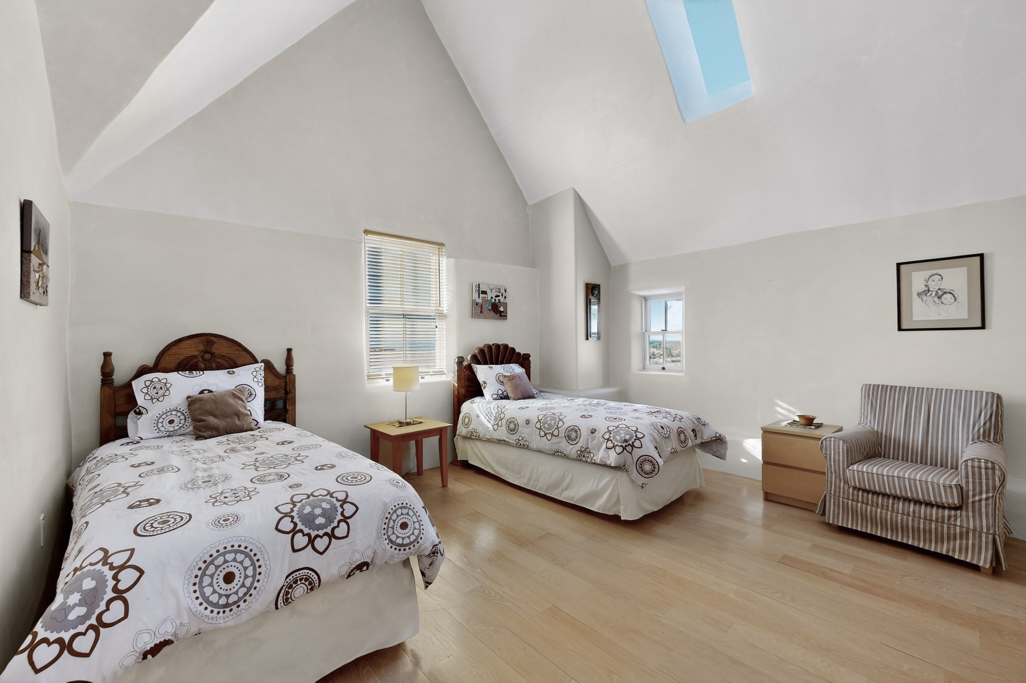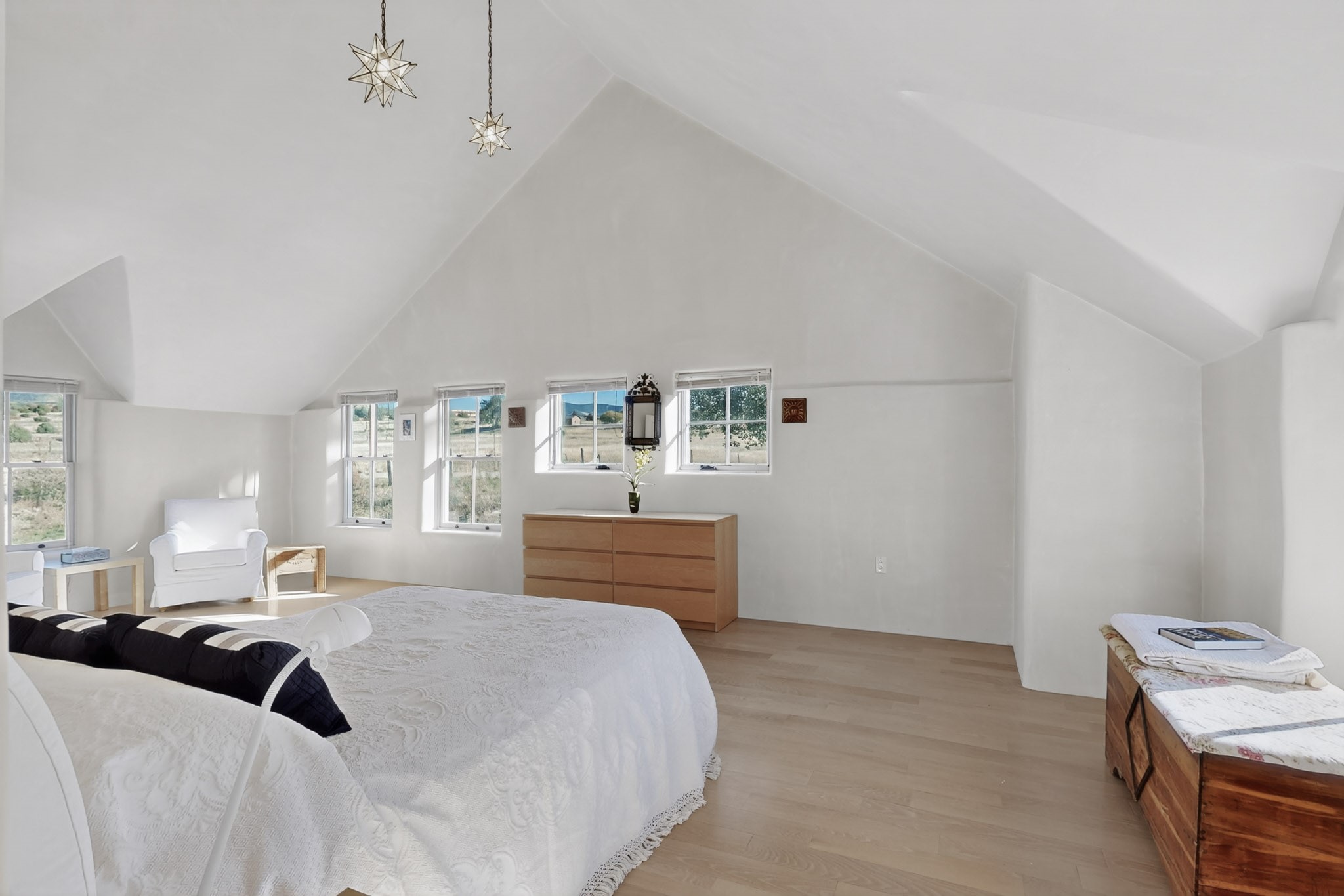 This custom-built Adobe home has spectacular views and easy access on 3.28 acresof premium irrigated land!Offering peace and privacy just minutes from the heart of Truchas, NM, this homeis rich in historyand character. The current owners thoughtfully expanded the original footprintof anadobe farmhouse while preserving the historic details authentic character and solid structure. Three large bedrooms, two upstairs and one on the main level are light, bright and airy. The two updated bathrooms feature walk-in showers, with a soaking tub upstairsand aprivate sauna downstairs for comfort andrelaxation. Features includehandcrafted plaster wallswith nichos,vigas, beams,soaring high ceilingsand gabled windows. Thebrick, saltillo,and white oak flooringwith radiant heat creates warmth and authenticity while aclassic kiva fireplace anchors the living space. . With community water supplemented by valuable ditch rights,the fully fencedpastures are well-suited for horses or small-scale farmingand an old log barn in the pasturespeaks to the history of the land and offers flexible use for storage and animals. Set against the backdrop of the Truchas Peaks, this distinctive Southwestern adobe retreat enjoys beautiful views of the mountainsand surrounding hillsides. The oversized garage offers additionalroom for a workshop with attic storage above. If you are seeking a horse property, a mountain getaway, or a full-time residence that embodies the charm of Northern New Mexicothis home is not to be missed!