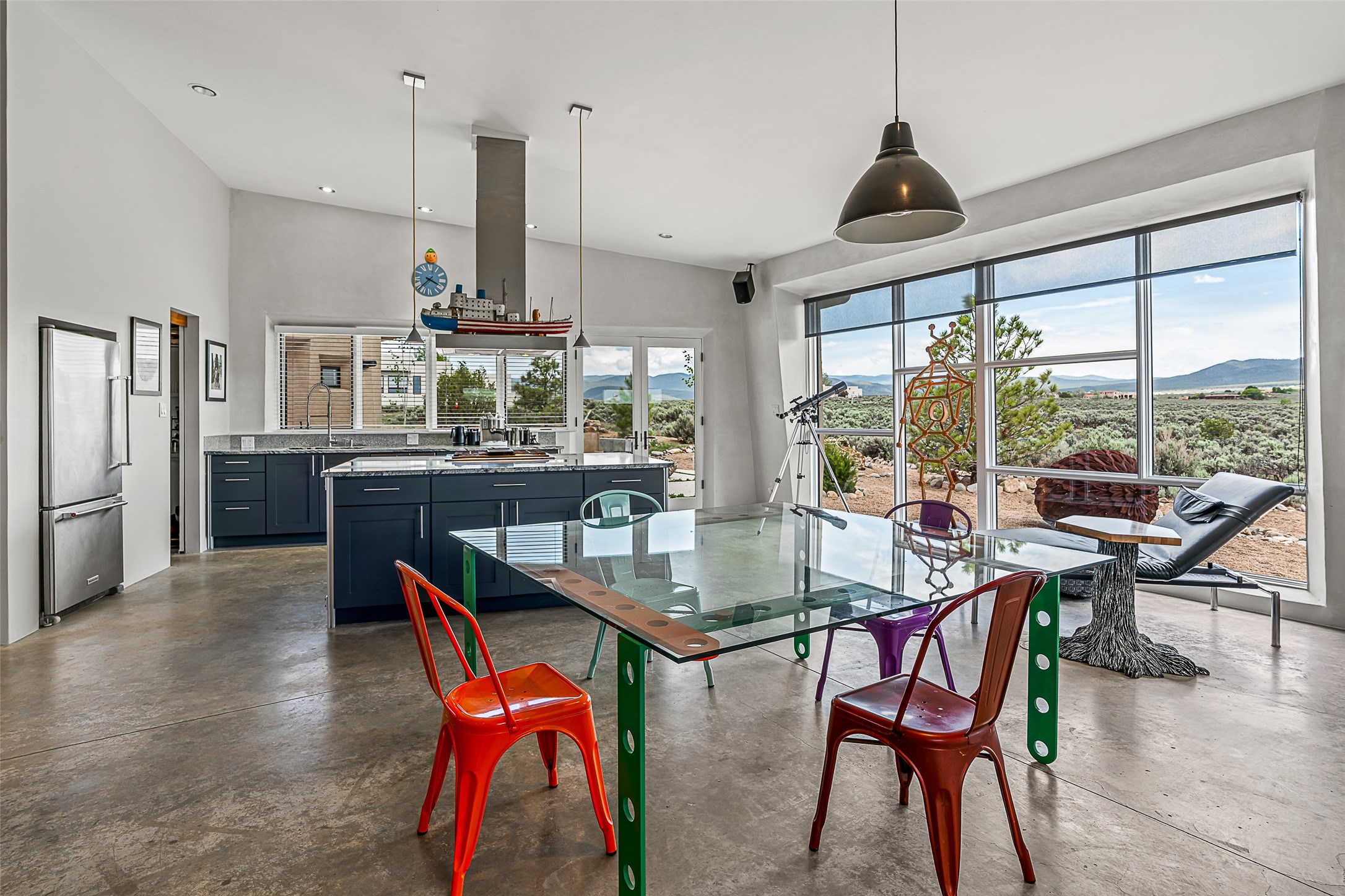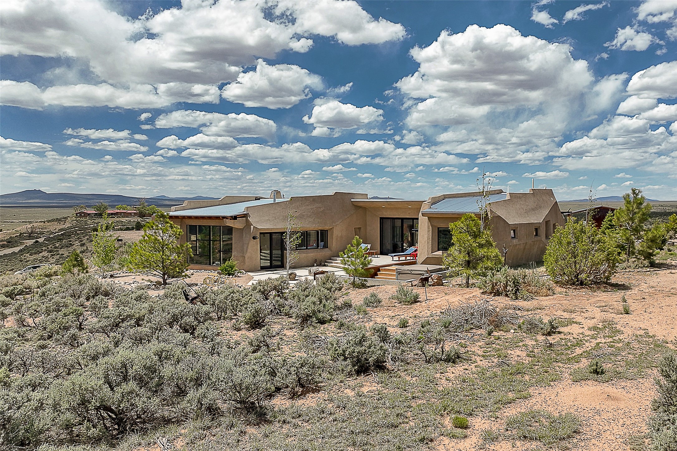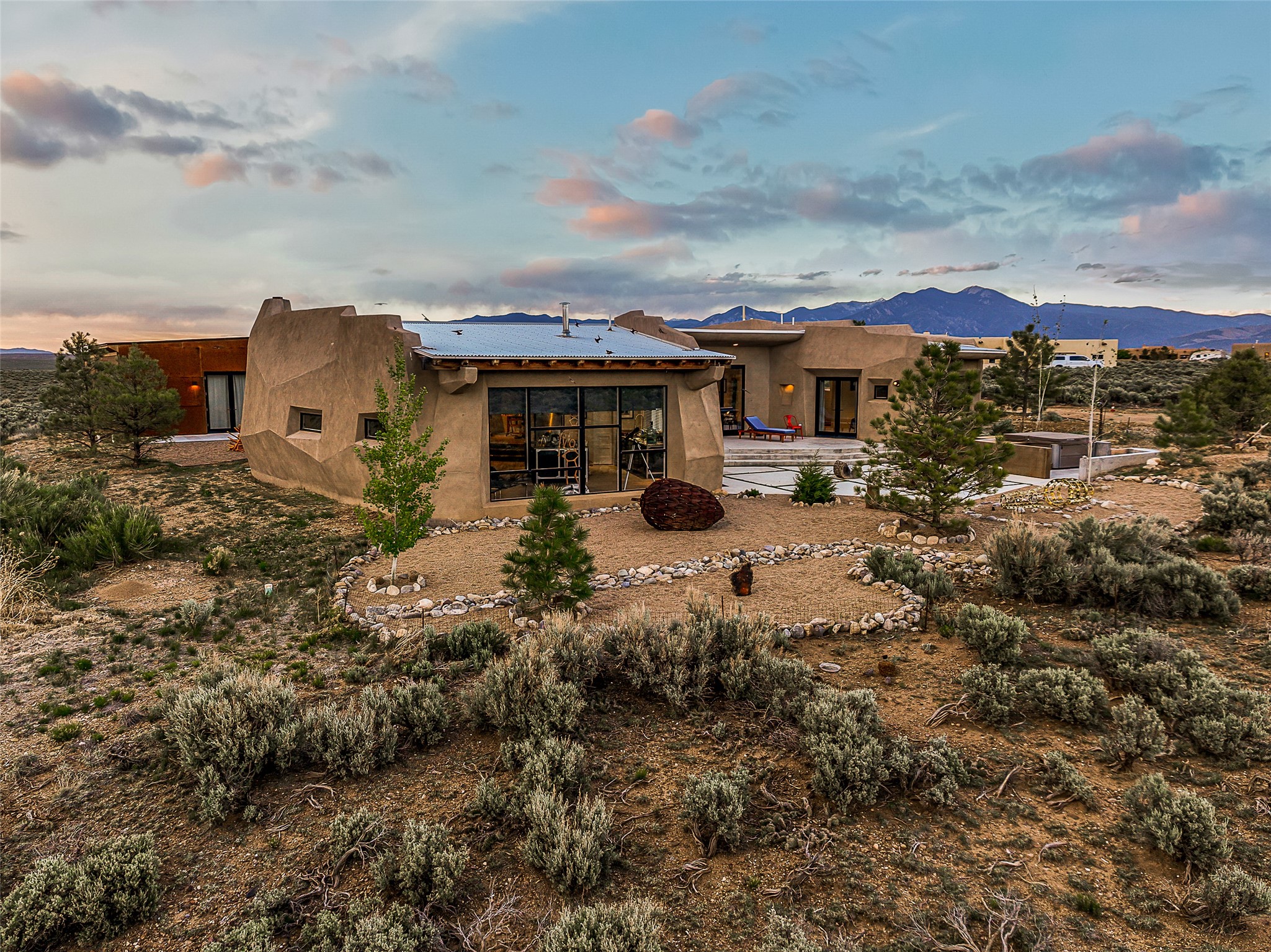 Live inside a work of art in this Artist's Dream Dwelling in Taos. Welcome to ATOMICA- a home unlike any other- where art, nature and architecture meet in perfect, unconventional harmony. Designed and built by internationally acclaimed visionary artist Allan Packer, this inspiring Taos retreat is anything but ordinary. The property consists of a house, a guesthouse, and a studio on 3 acres. Organic, off beat and unconventional in the best possible way. Sculpted thick pumice walls and large windows incorporate and frame the stunning views into a magical, serene space imagined to inspire. The layout defies expectation- fluid and intuitive, built to honor light, shadow and the surrounding land. The main house consists of 2 suites radiating off a large great room made up of an impressive kitchen space and a cozy sunken living room anchored by a whimsical fireplace. Step right out onto the stunning back patio with a firepit, hot tub and jaw dropping views in every direction. The guesthouse is fully equipped with a kitchen and has an established history of rental income. Set atop a peaceful rise, tucked near the edge of the Rio Grande del Norte National Monument, you're just minutes from breathtaking hikes where bighorn sheep roam, epic mountain biking trails, and the quiet power of the river below. The home also overlooks the 16th hole of the Taos Country Club and golf course, blending wild nature with wide-open fairways. This is not just a home-it's a living, breathing work of art. It's a space for dreamers, makers and seekers. Whether you're an artist, writer, hardcore recreationalist or someone simply craving authenticity and soul in a sea of sameness, this home offers something rare: a chance to live in art, not just hang it on the wall.One-of-a-kind. Off the beaten path. Totally Taos. Serious inquiries only. Magic lives here.