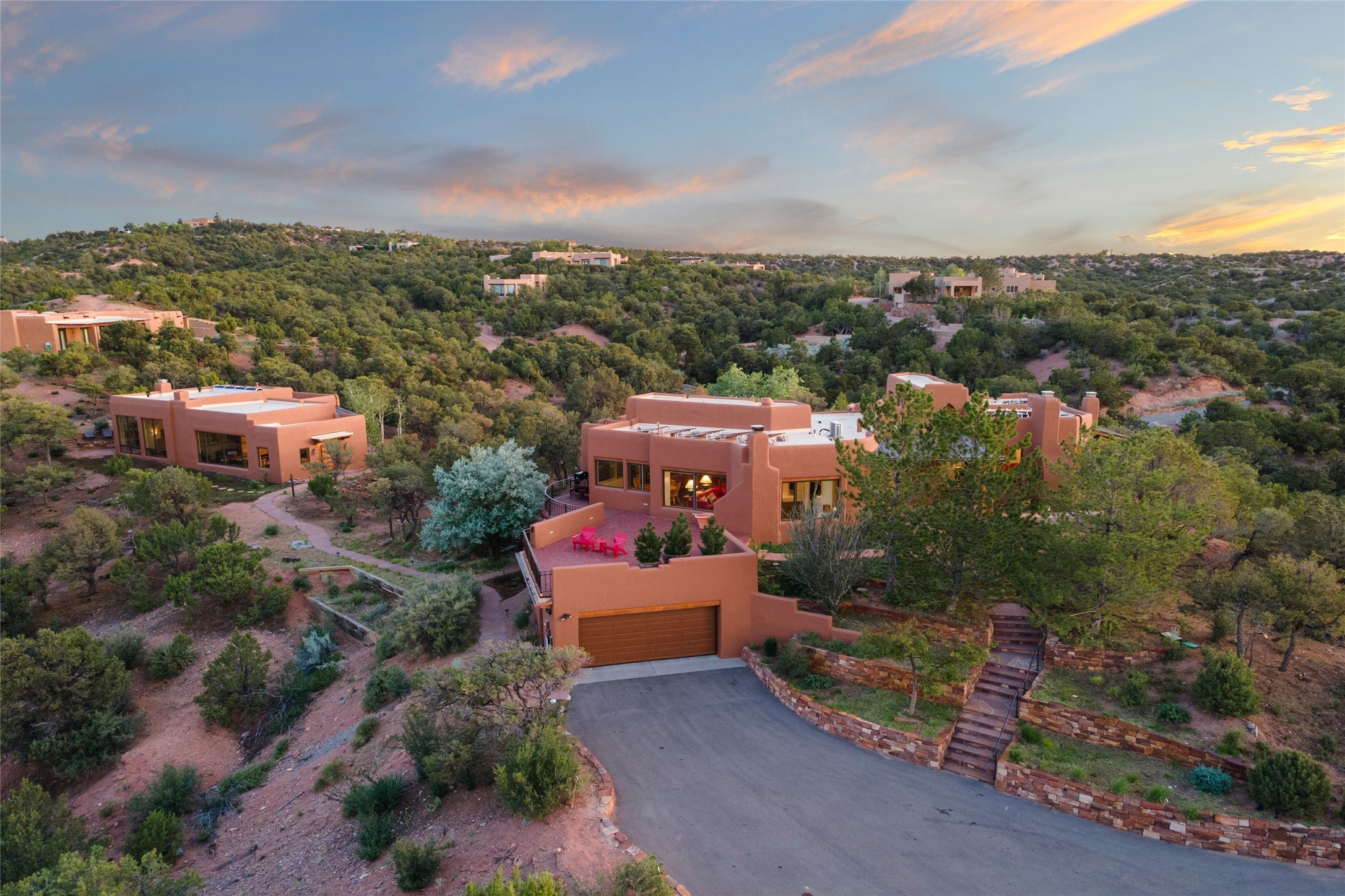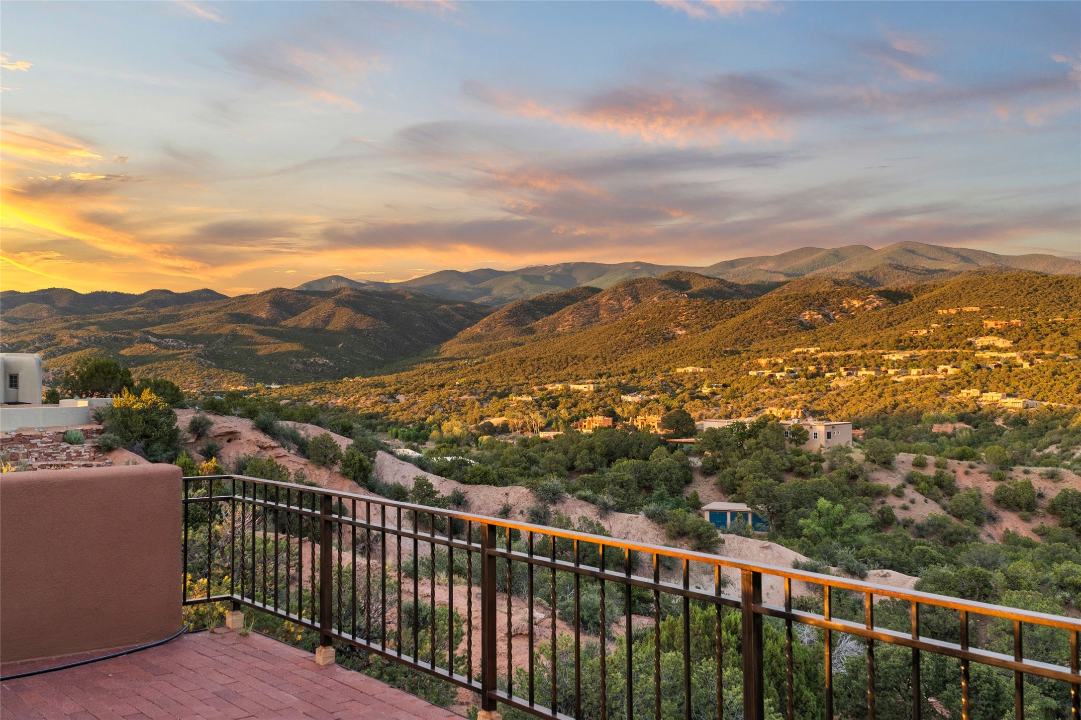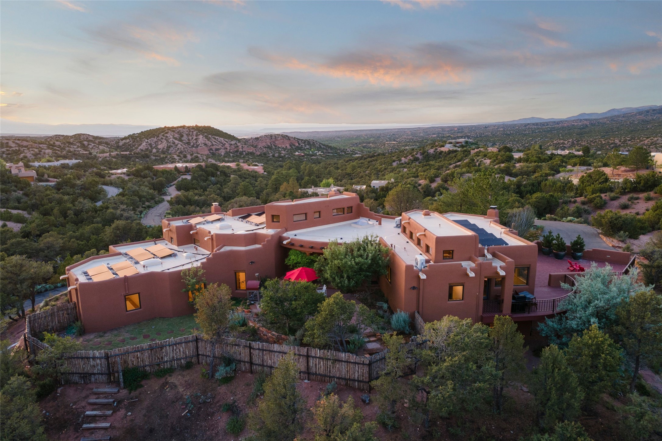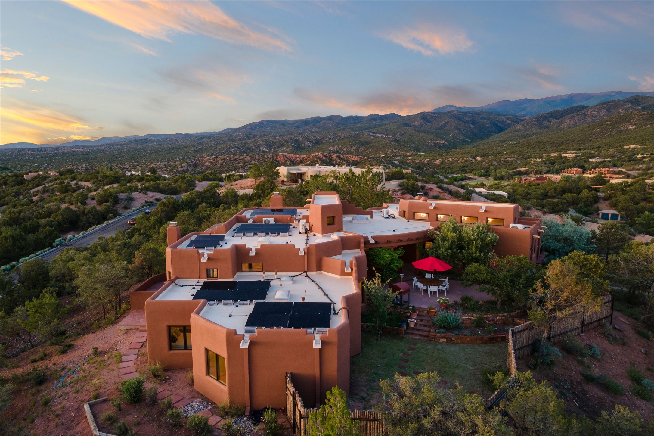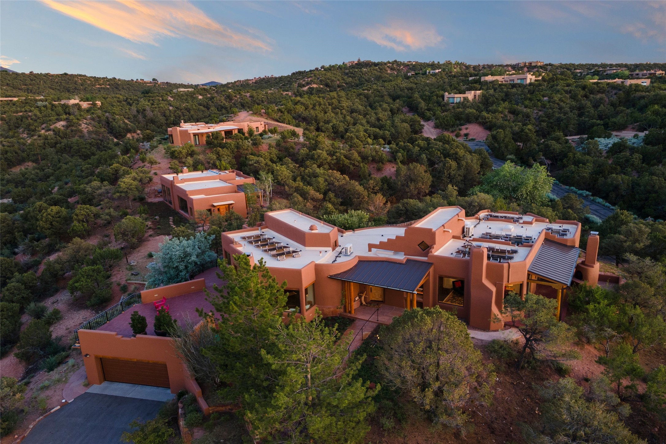 With spectacular mountain views in three directions and an enviable location just seven minutes from the Plaza, this recently remodeled home, originally constructed by noted builder Will Prull, is an exceptional estate. The 4,000-foot, 4-Bed + Office / 3.5 Bath Main House and spacious 1,700-foot 1-Bed / 2-Bath Guest House / Studio have gorgeous wood, stone, and tile finishes throughout. Nestled on a hilltop site within the exclusive Bishop Lodge Estates gated community, the property is located on 2.24 acres that overlook the storied Bishops Lodge and the National Forest. It enjoys unsurpassed, close-up views of the Sangre de Cristo mountains as well as stunning vistas of the Badlands and Jemez Mountains. It is in truly move-in condition having just undergone a comprehensive remodel in 2024-25 that includes new TPO roofs & stucco, new heating & cooling system, solar panels with battery backup, and much more. A short walk takes you to the Bishops Lodge, with numerous complimentary Club Privileges extended to the owners in this particular community. This exquisite, updated home represents a rare opportunity to live in a sought-after, gated community where properties rarely change hands. Call today to experience this extraordinary property.