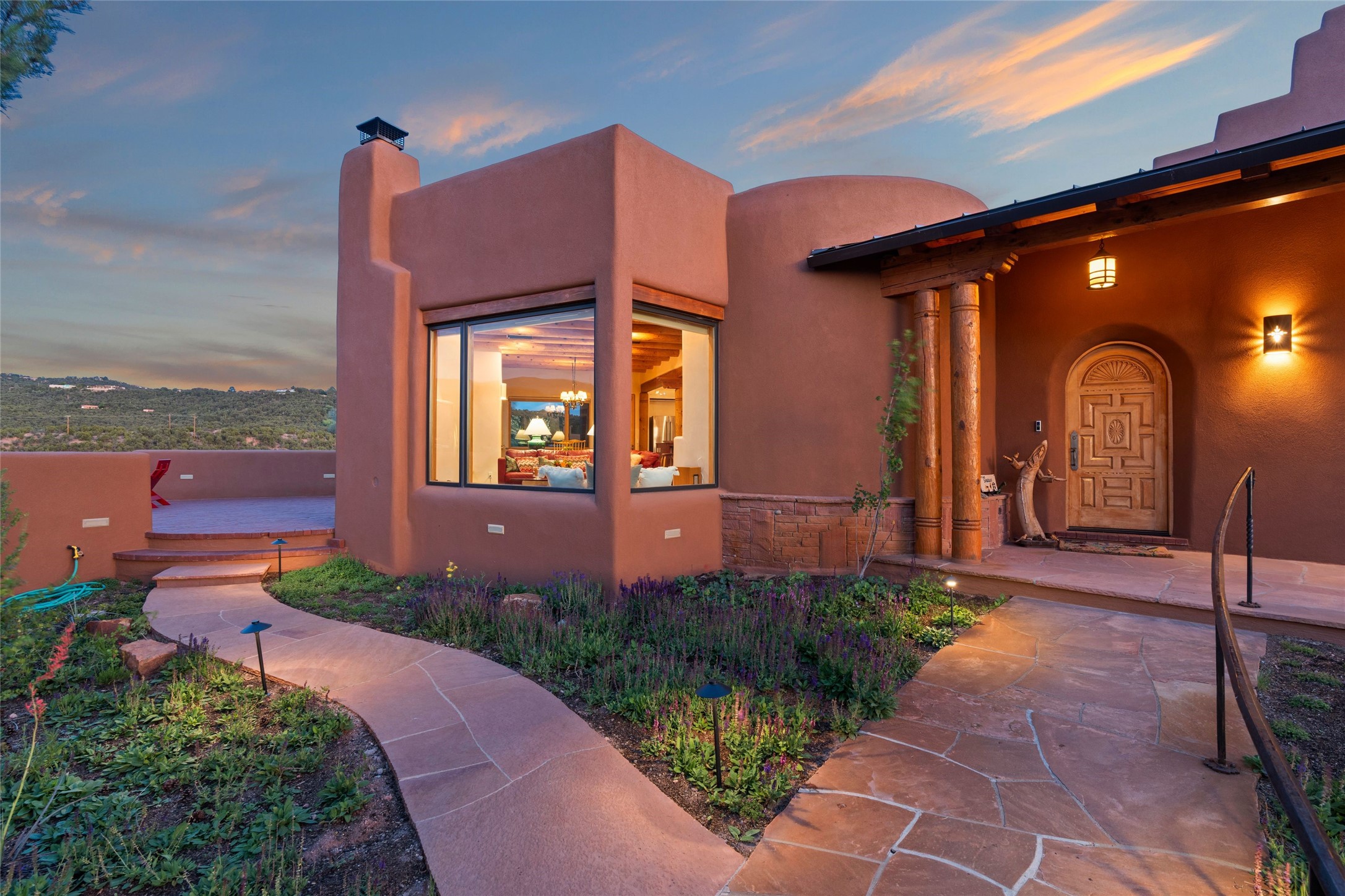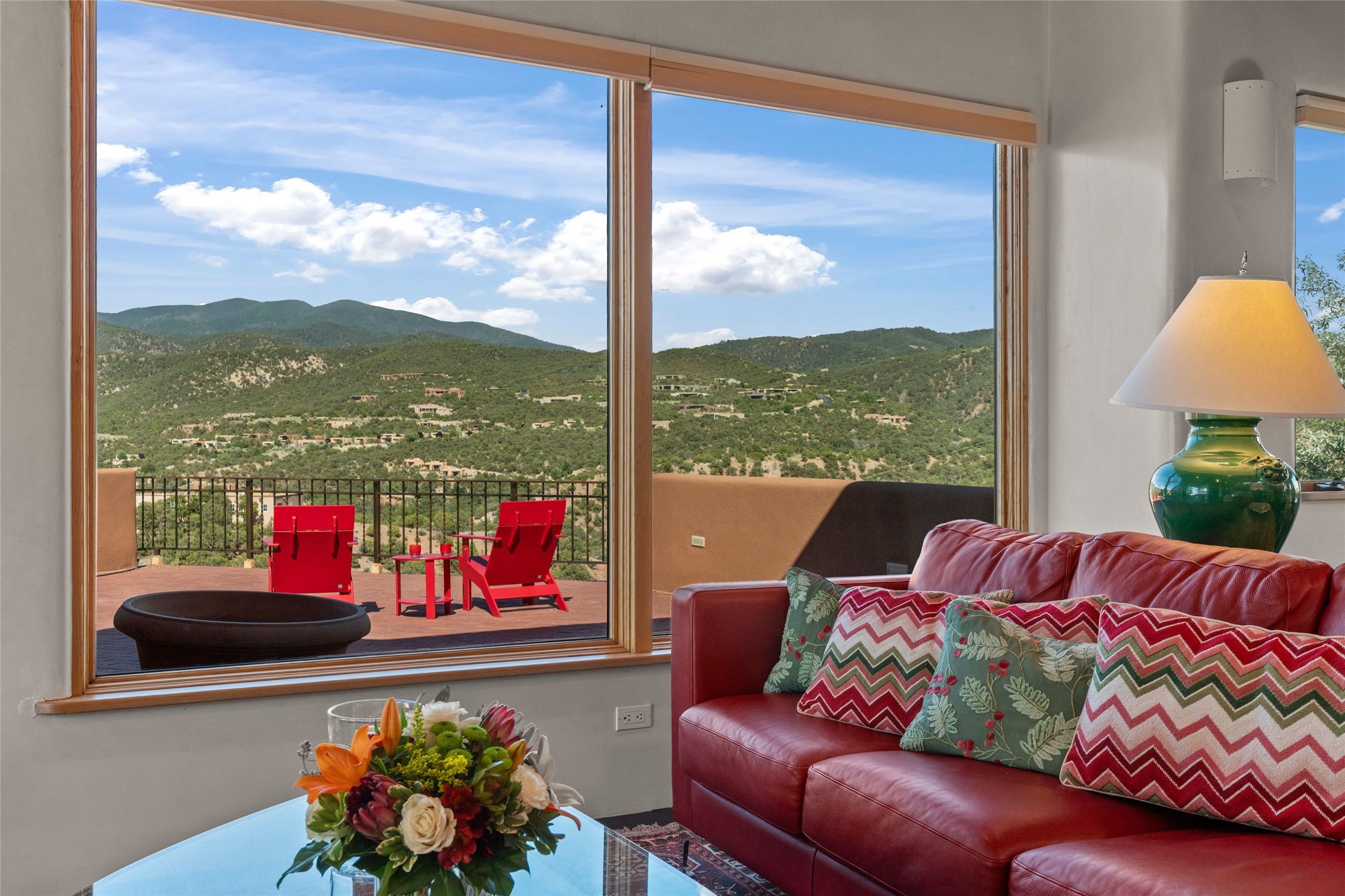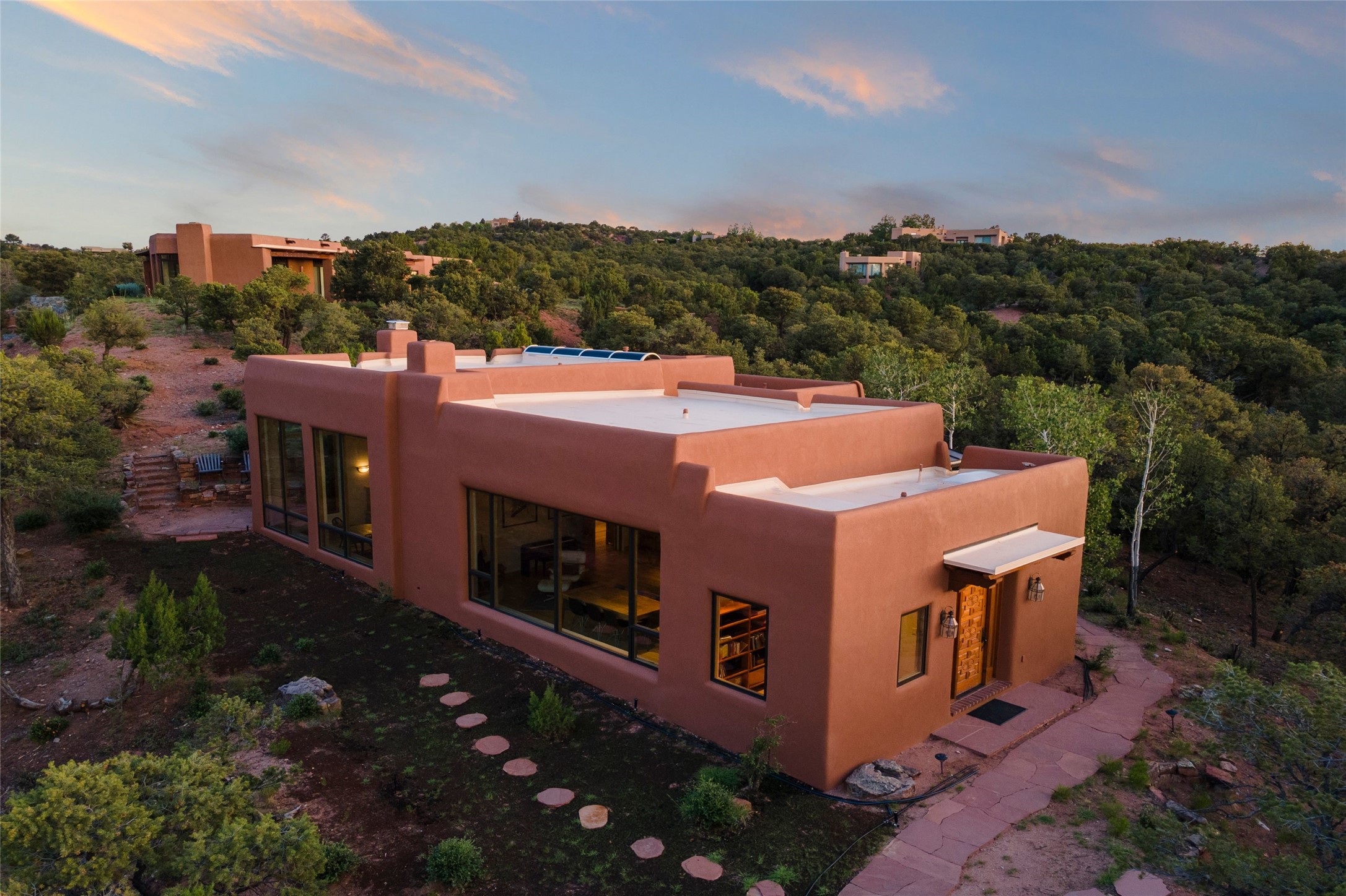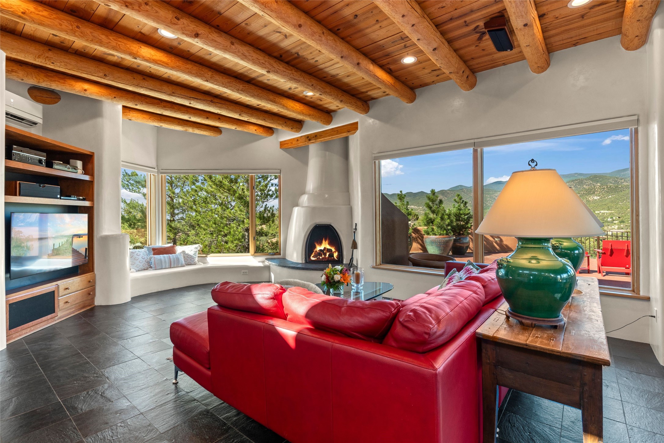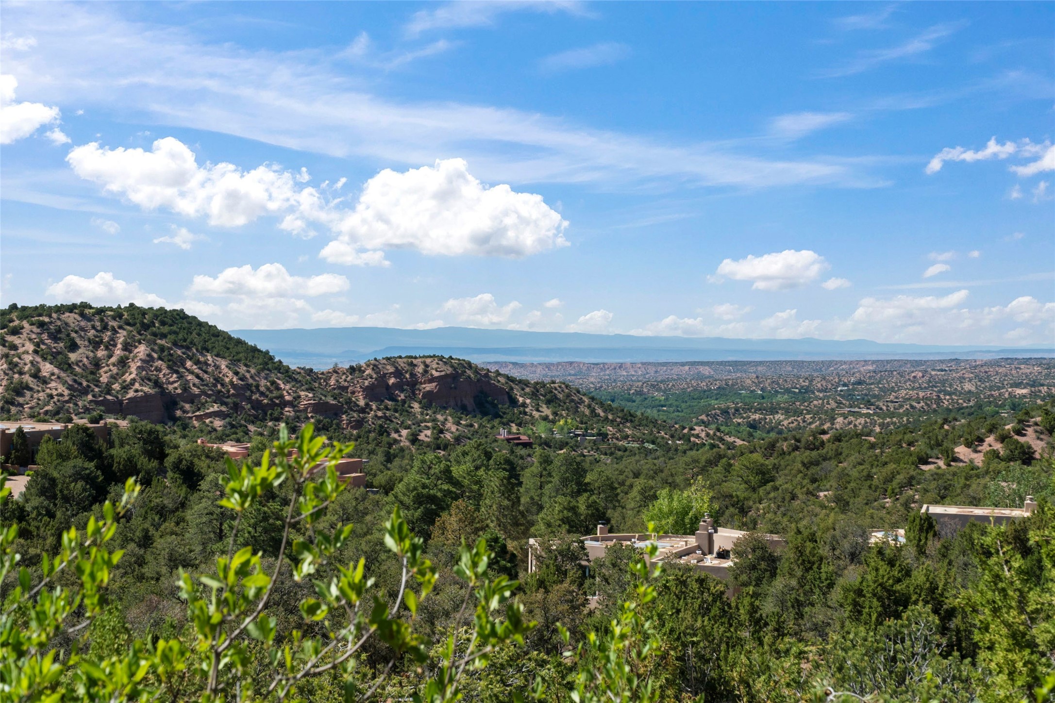 With spectacular mountain views in three directions and an enviable location just seven minutes from the Plaza, this recently remodeled home, originally constructed by noted builder Will Prull, is an exceptional estate. The 4,000-foot, 4-Bed + Office / 3.5 Bath Main House and spacious 1,700-foot 1-Bed / 2-Bath Guest House / Studio have gorgeous wood, stone, and tile finishes throughout. Nestled on a hilltop site within the exclusive Bishop Lodge Estates gated community, the property is located on 2.24 acres that overlook the storied Bishops Lodge and the National Forest. It enjoys unsurpassed, close-up views of the Sangre de Cristo mountains as well as stunning vistas of the Badlands and Jemez Mountains. It is in truly move-in condition having just undergone a comprehensive remodel in 2024-25 that includes new TPO roofs & stucco, new heating & cooling system, solar panels with battery backup, and much more. A short walk takes you to the Bishops Lodge, with numerous complimentary Club Privileges extended to the owners in this particular community. This exquisite, updated home represents a rare opportunity to live in a sought-after, gated community where properties rarely change hands. Call today to experience this extraordinary property.