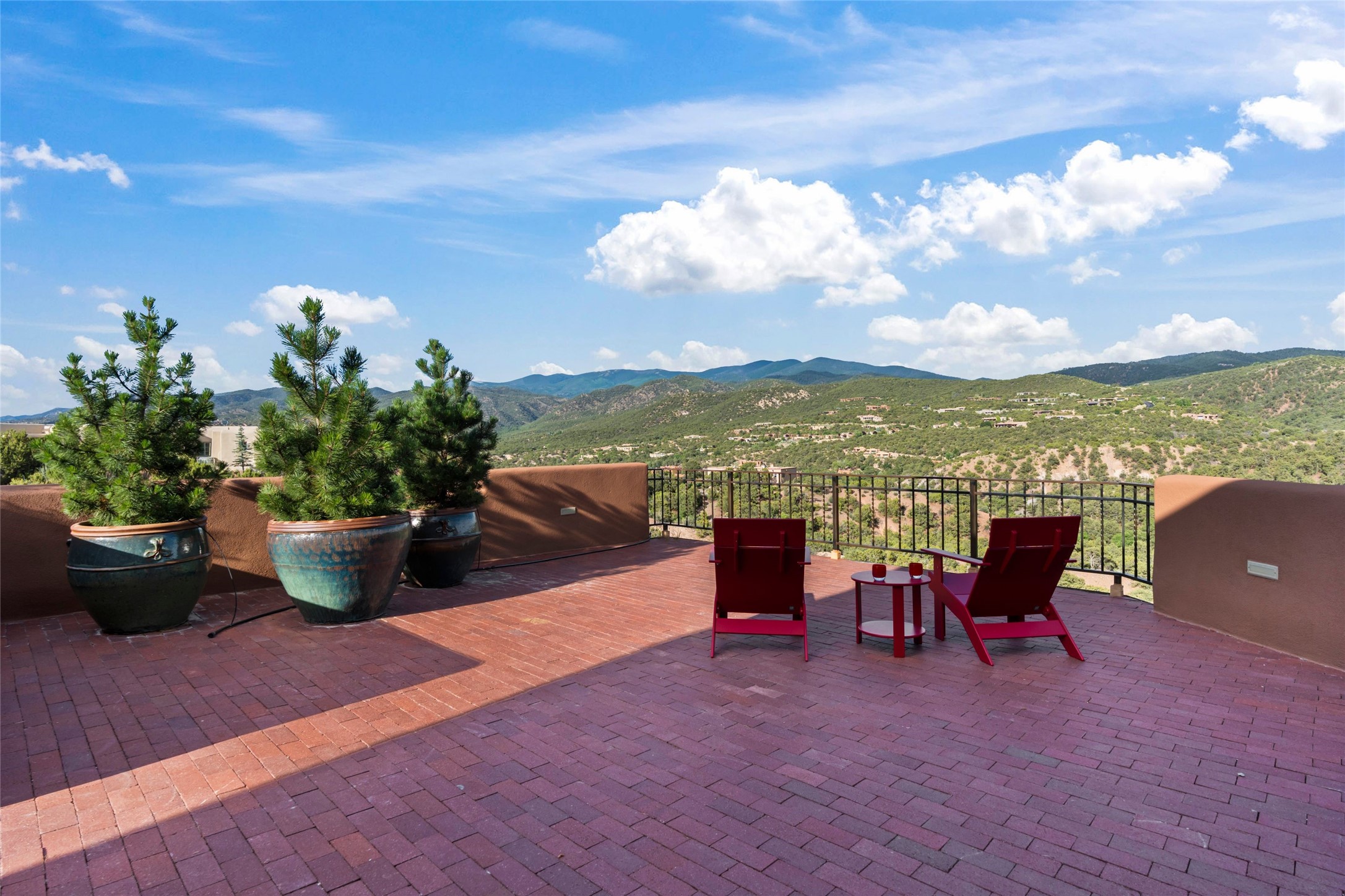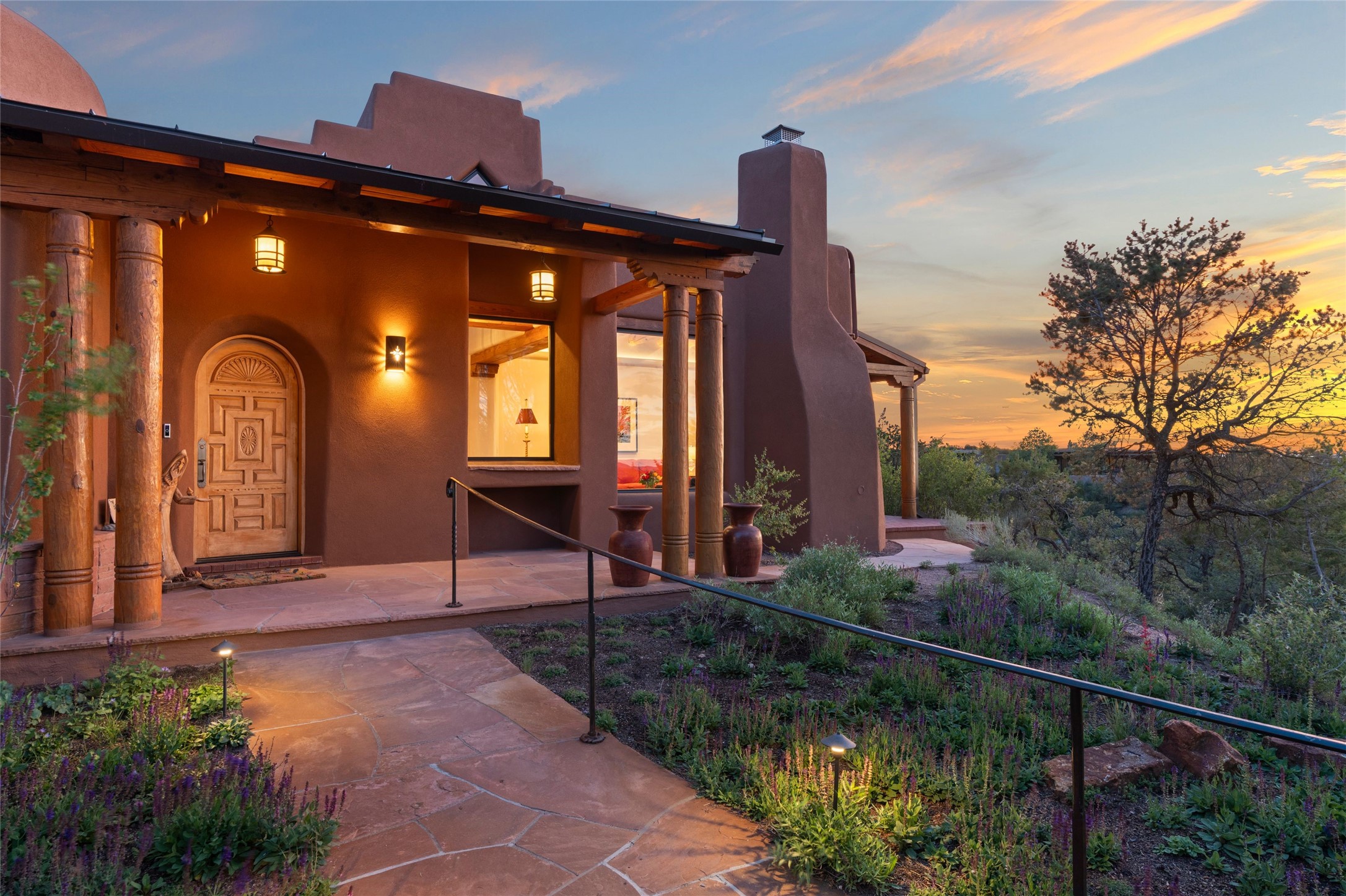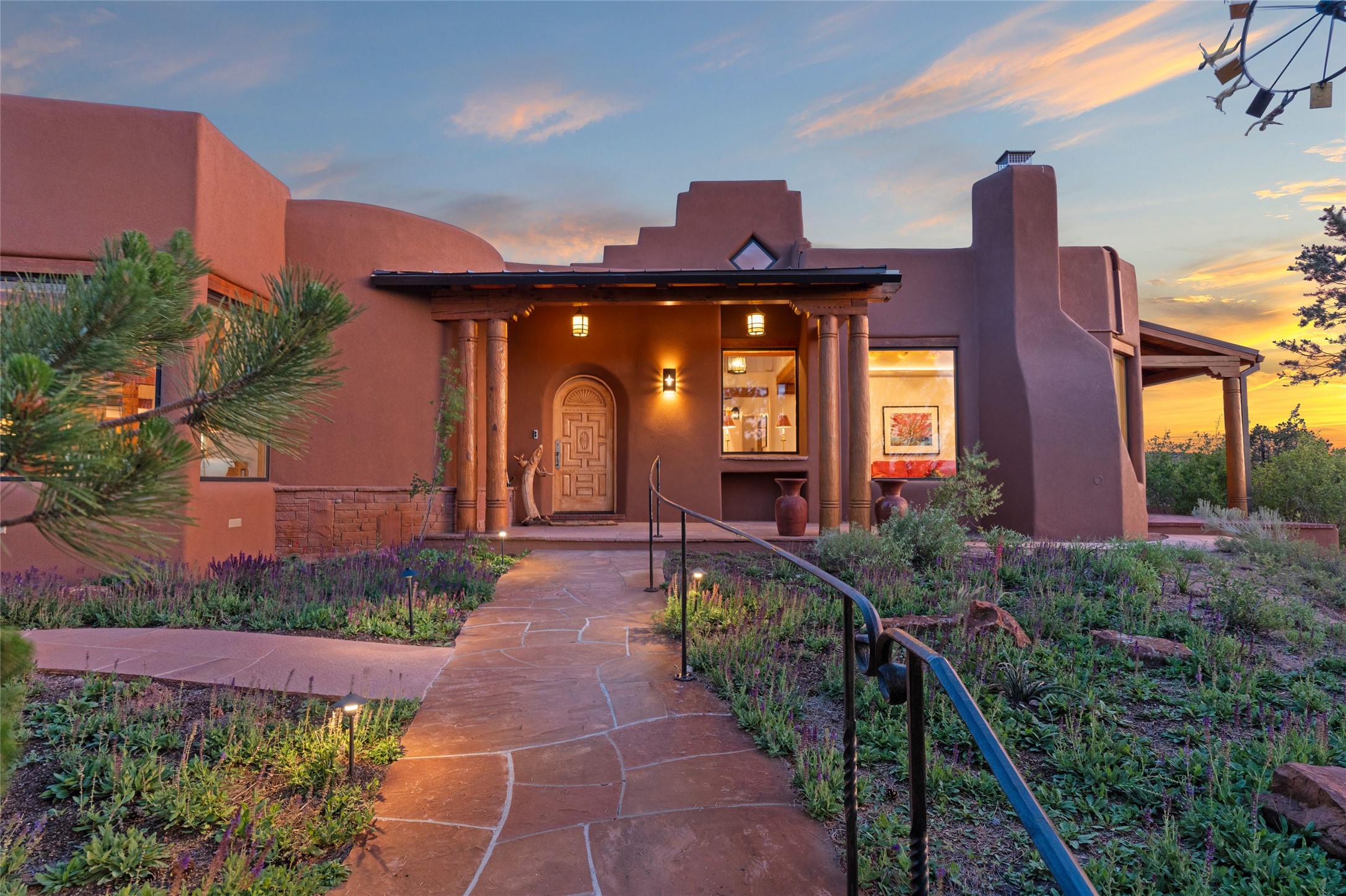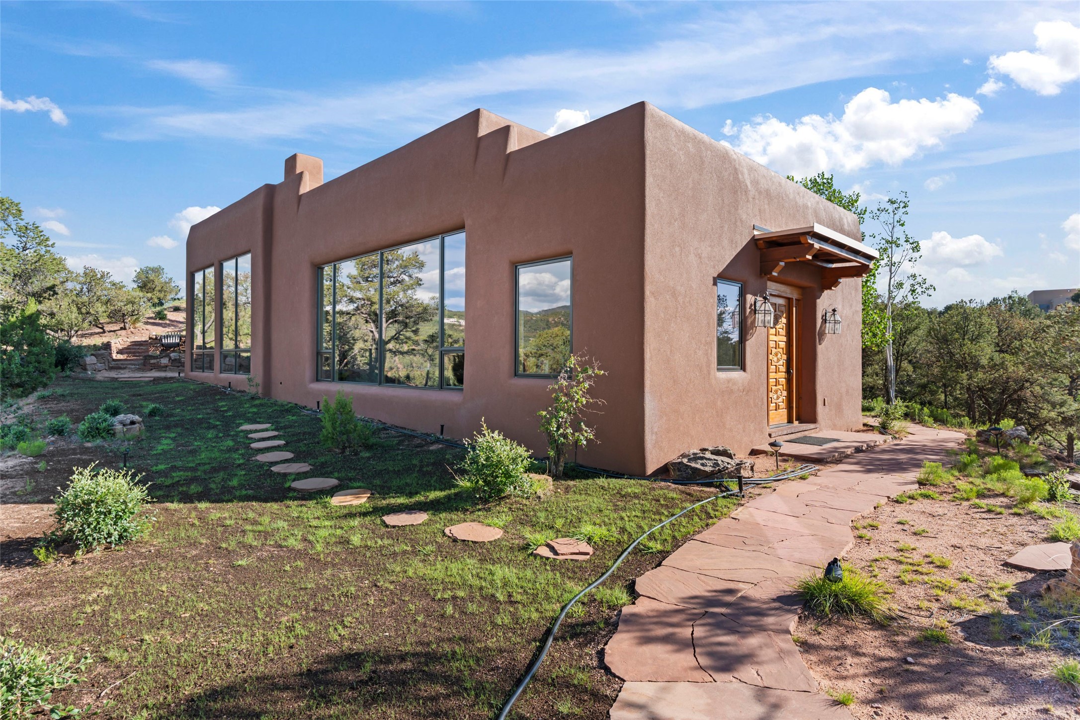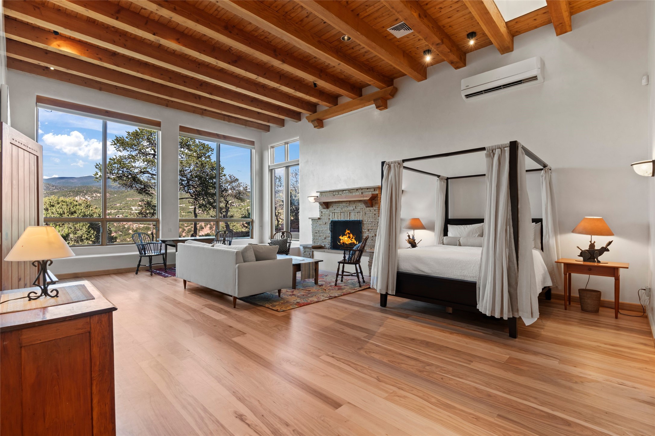With spectacular mountain views in three directions and an enviable location just seven minutes from the Plaza, this recently remodeled home, originally constructed by noted builder Will Prull, is an exceptional estate. The 4,000-foot, 4-Bed + Office / 3.5 Bath Main House and spacious 1,700-foot 1-Bed / 2-Bath Guest House / Studio have gorgeous wood, stone, and tile finishes throughout. Nestled on a hilltop site within the exclusive Bishop Lodge Estates gated community, the property is located on 2.24 acres that overlook the storied Bishops Lodge and the National Forest. It enjoys unsurpassed, close-up views of the Sangre de Cristo mountains as well as stunning vistas of the Badlands and Jemez Mountains. It is in truly move-in condition having just undergone a comprehensive remodel in 2024-25 that includes new TPO roofs & stucco, new heating & cooling system, solar panels with battery backup, and much more. A short walk takes you to the Bishops Lodge, with numerous complimentary Club Privileges extended to the owners in this particular community. This exquisite, updated home represents a rare opportunity to live in a sought-after, gated community where properties rarely change hands. Call today to experience this extraordinary property.