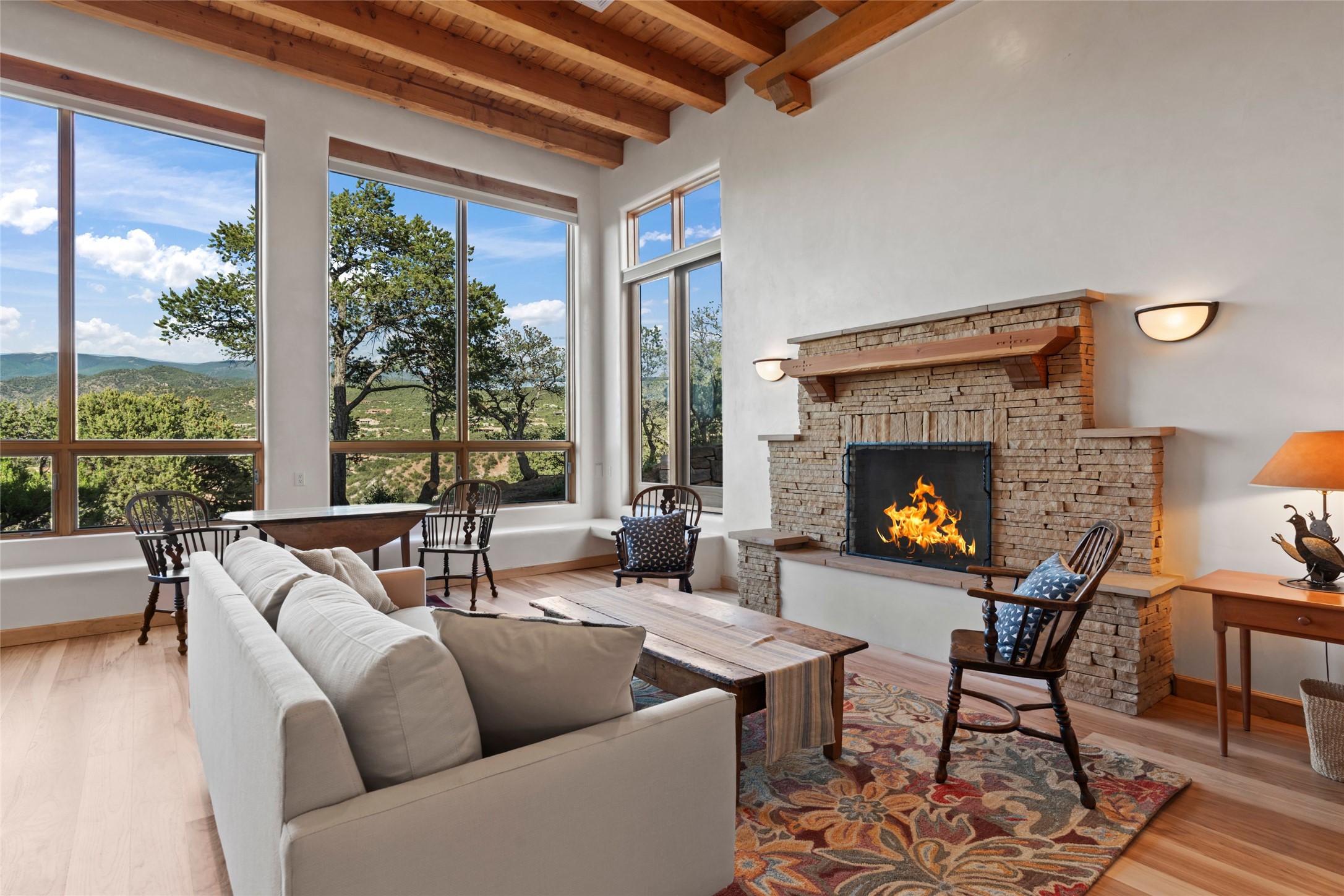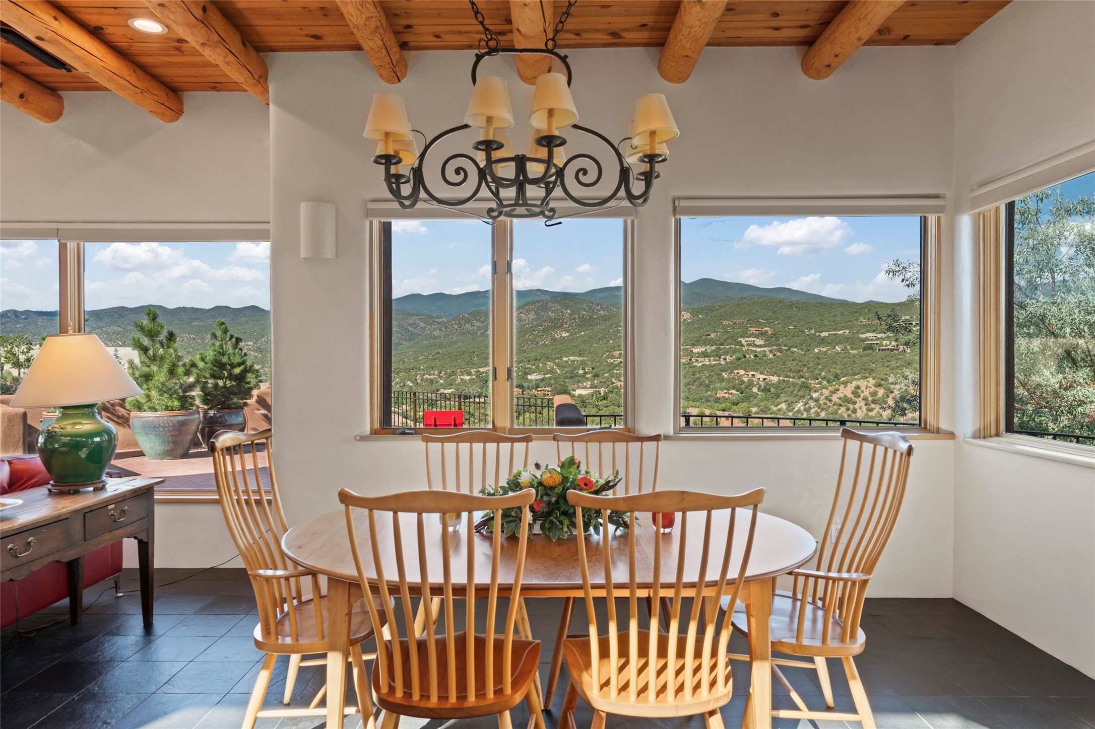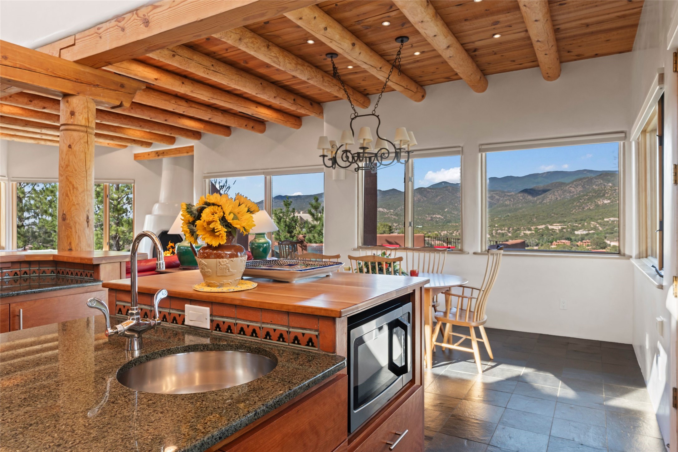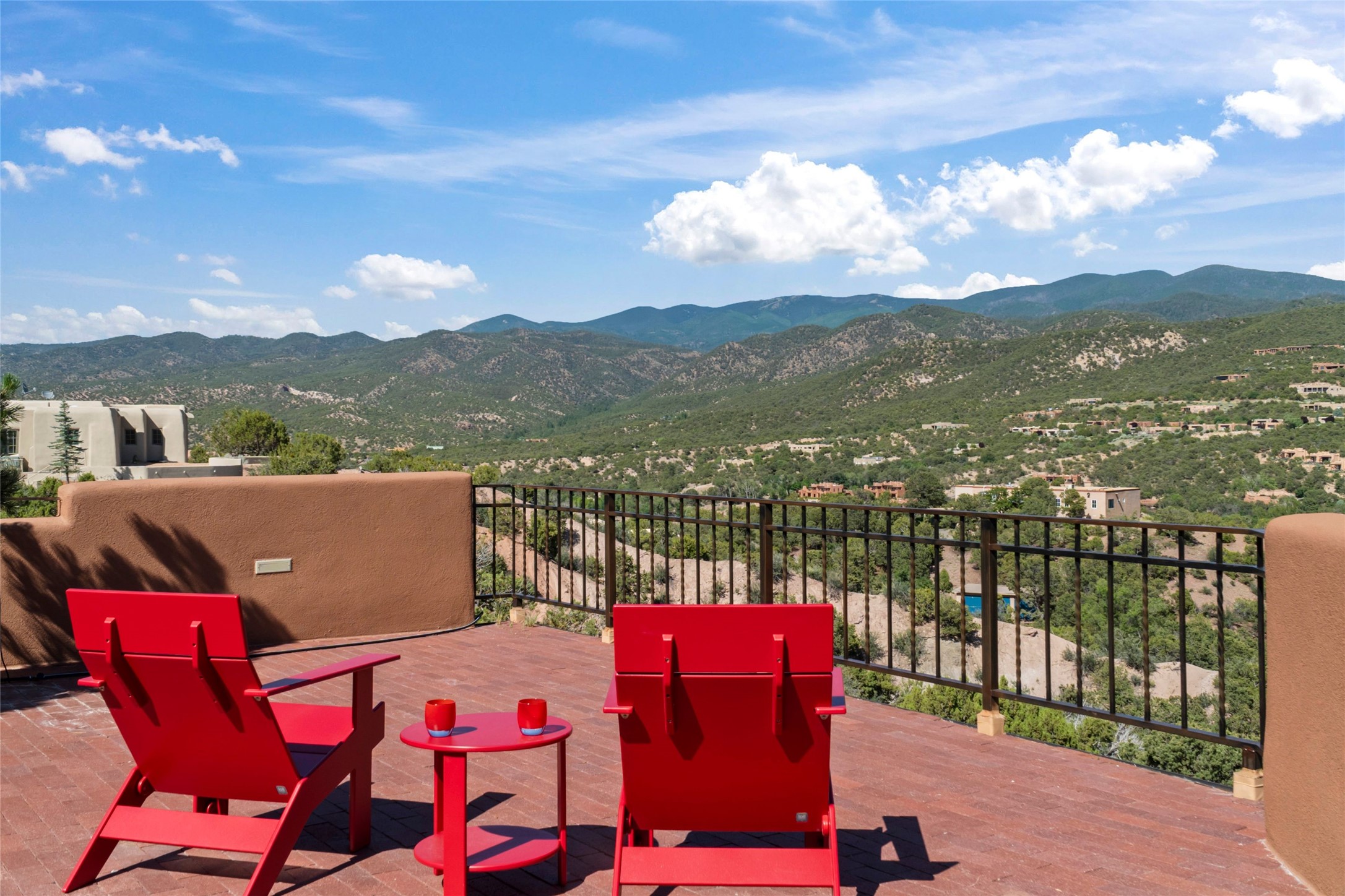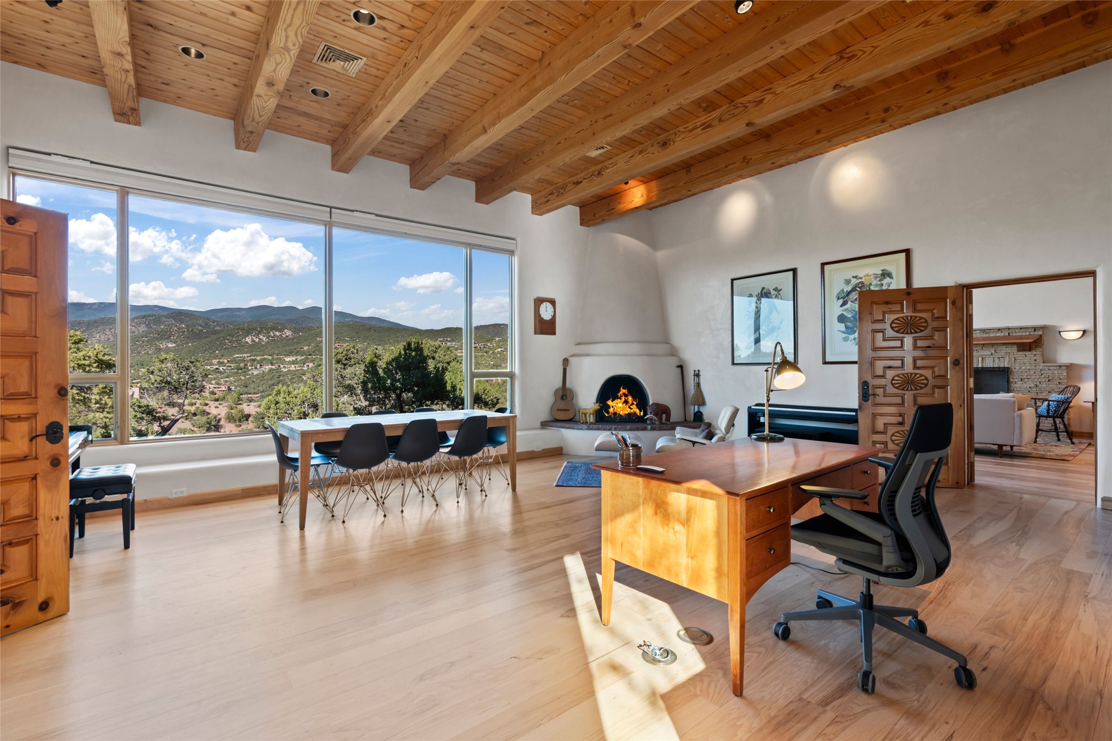 With spectacular mountain views in three directions and an enviable location just seven minutes from the Plaza, this recently remodeled home, originally constructed by noted builder Will Prull, is an exceptional estate. The 4,000-foot, 4-Bed + Office / 3.5 Bath Main House and spacious 1,700-foot 1-Bed / 2-Bath Guest House / Studio have gorgeous wood, stone, and tile finishes throughout. Nestled on a hilltop site within the exclusive Bishop Lodge Estates gated community, the property is located on 2.24 acres that overlook the storied Bishops Lodge and the National Forest. It enjoys unsurpassed, close-up views of the Sangre de Cristo mountains as well as stunning vistas of the Badlands and Jemez Mountains. It is in truly move-in condition having just undergone a comprehensive remodel in 2024-25 that includes new TPO roofs & stucco, new heating & cooling system, solar panels with battery backup, and much more. A short walk takes you to the Bishops Lodge, with numerous complimentary Club Privileges extended to the owners in this particular community. This exquisite, updated home represents a rare opportunity to live in a sought-after, gated community where properties rarely change hands. Call today to experience this extraordinary property.