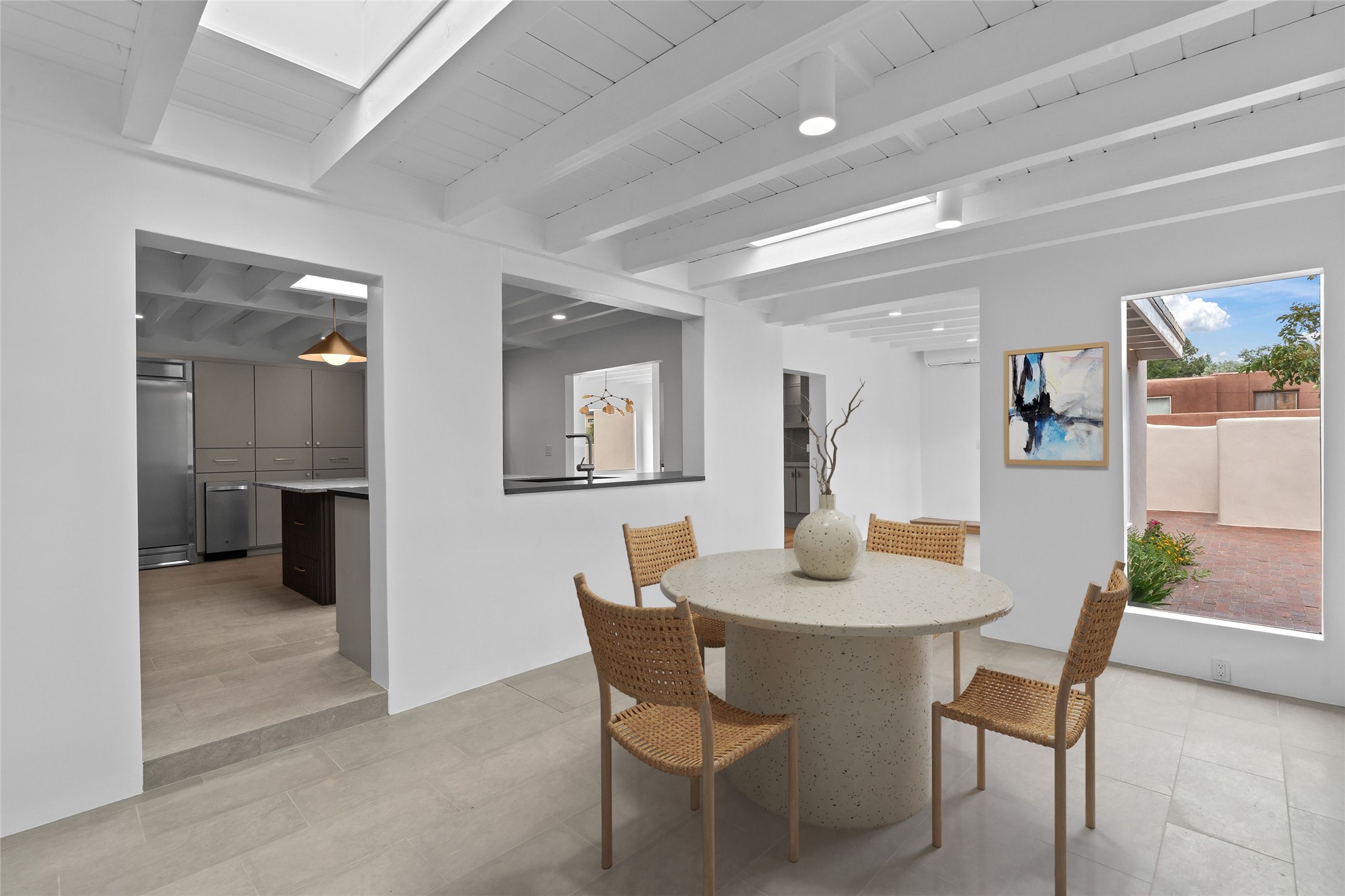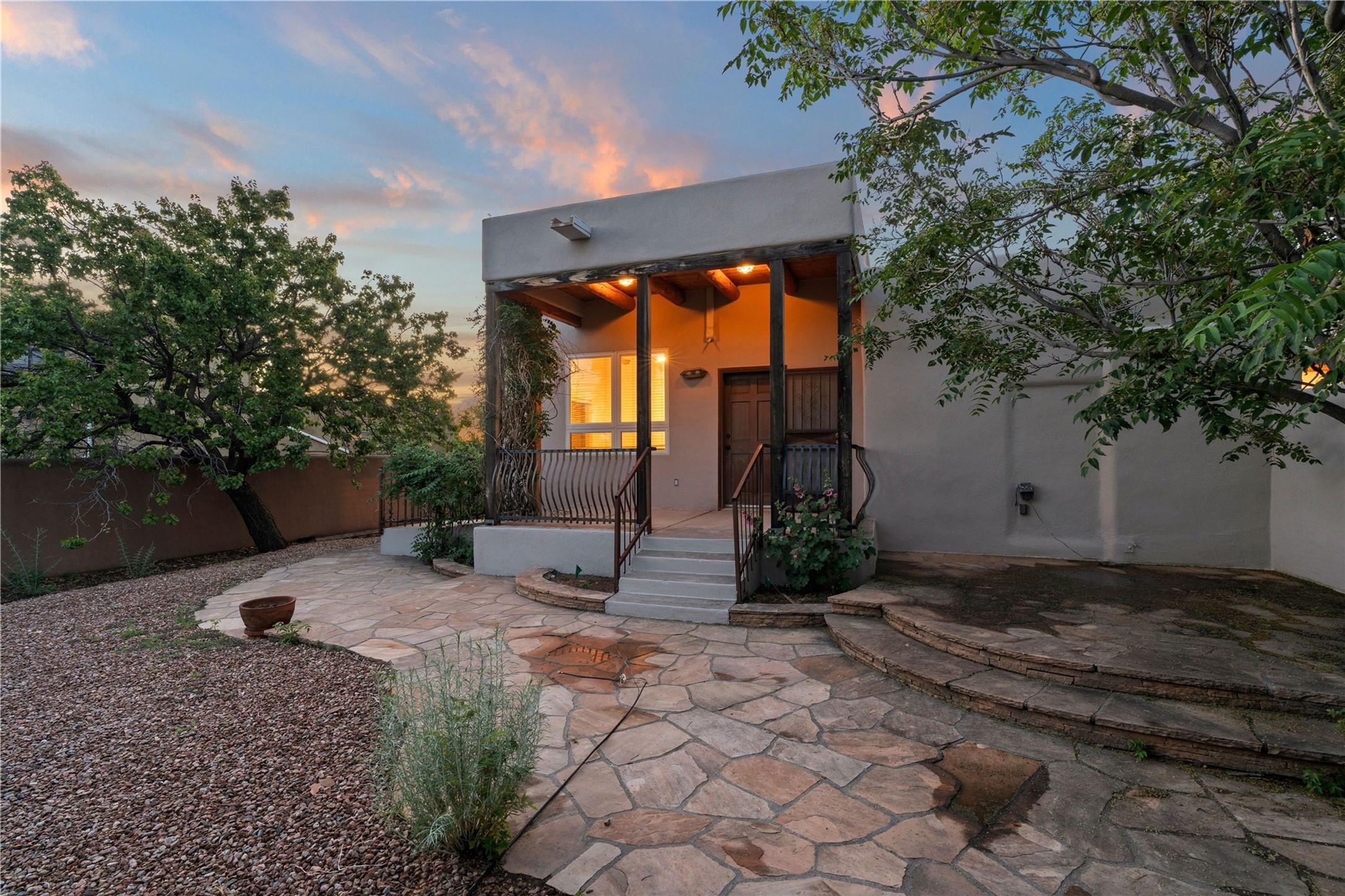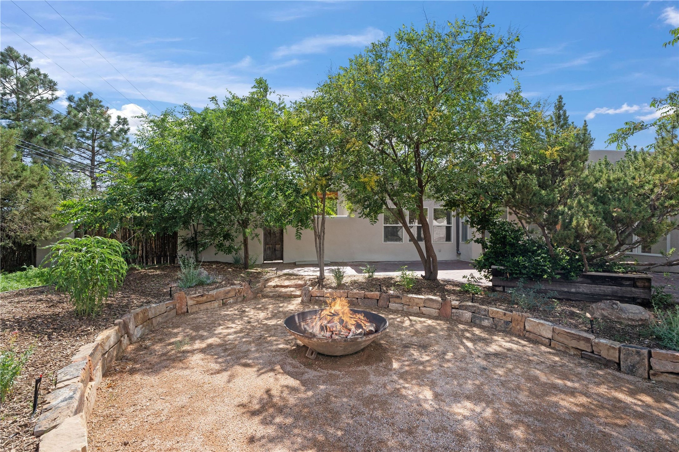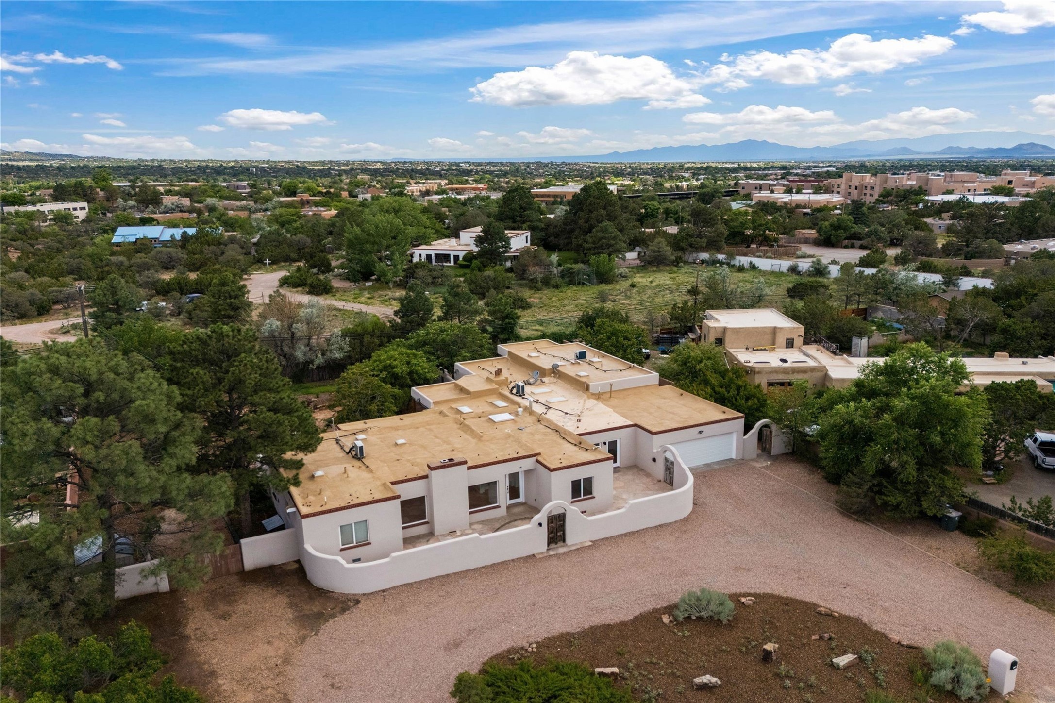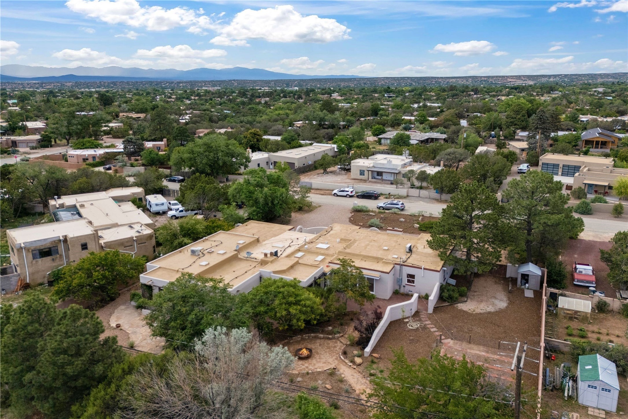 Discover a stunning 3-bedroom, 2.5-bath home paired with a charming 1-bedroom, 1-bath casita all located in the desirable San Mateo neighborhood. This residence has undergone a high-end complete renovation showcasing exquisite designer finishes throughout. Step inside to find blue Bateig honed limestone tile floors and original refinished wood floors that create a seamless flow across the spacious living areas. The gourmet kitchen features carbon grey honed granite counters, and a striking island topped with Nuage honed quartzite. Equipped with top-of-the-line appliances, including a Viking range and double oven and Forno Maderno French door refrigerator/freezer, this kitchen is designed for both functionality and style. Custom wood cabinets, a stylish bar area with a stainless-steel wine fridge and an elegant built-in wine rack complete the space. Primary bedroom includes a soaking tub, limestone shower, a freestanding double vanity, and dual custom-built closets, providing ample storage. Guest bedroom features an en-suite bath and wood burning fireplace. A third bedroom serves as versatile flex space, ideal for an office or studio. Half bath features authentic Terrazzo floor tile and custom-made concrete floating sink. New boiler, tankless water heater and 9 new ductless AC/heating units. 1/2-acre lot with a large backyard with custom fire pit, designated garden area, storage shed, mature fruit trees and a partially covered large brick patio. 2-car garage. Conveniently located close to the Santa Fe Plaza, Museum Hill, and the Railyard.