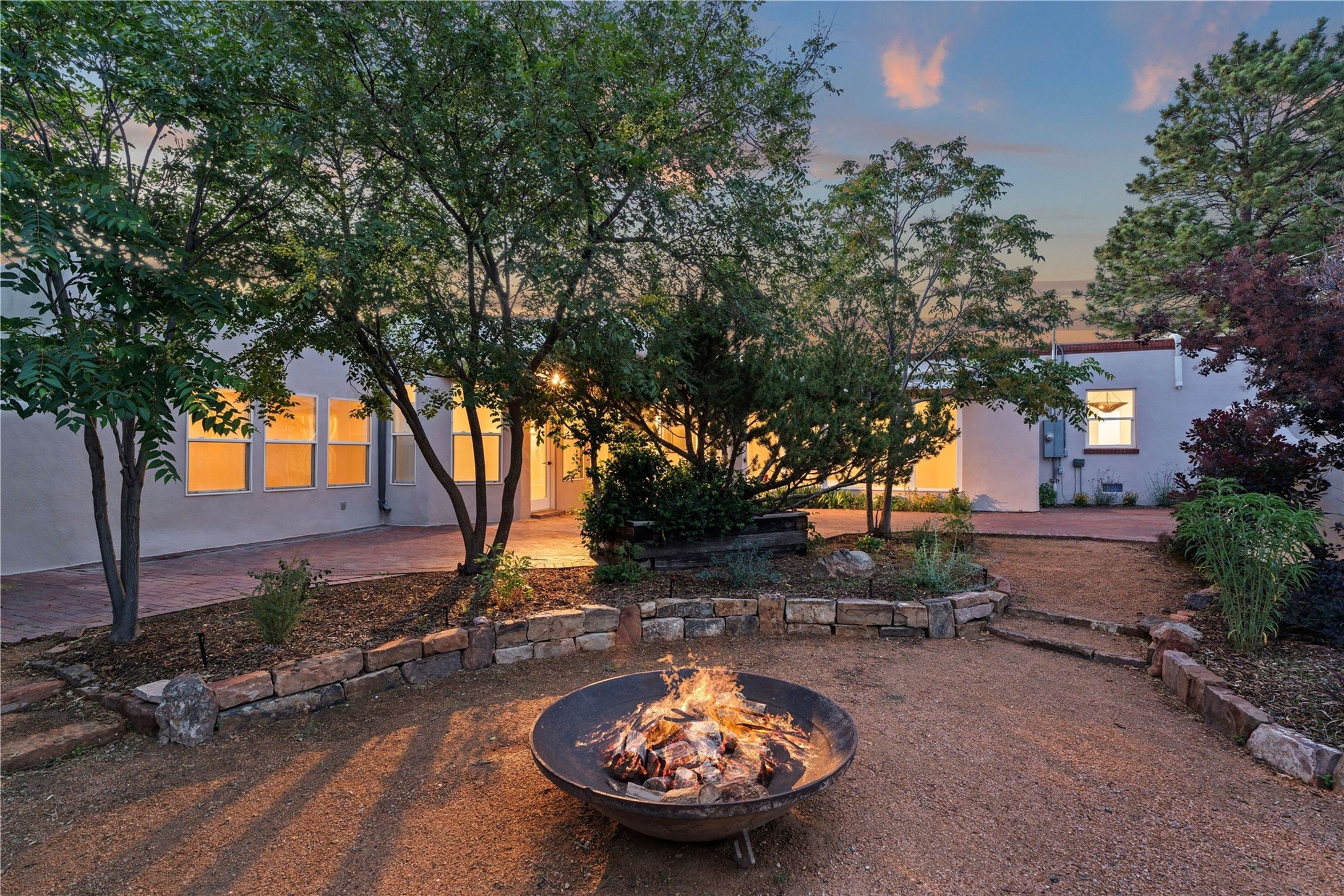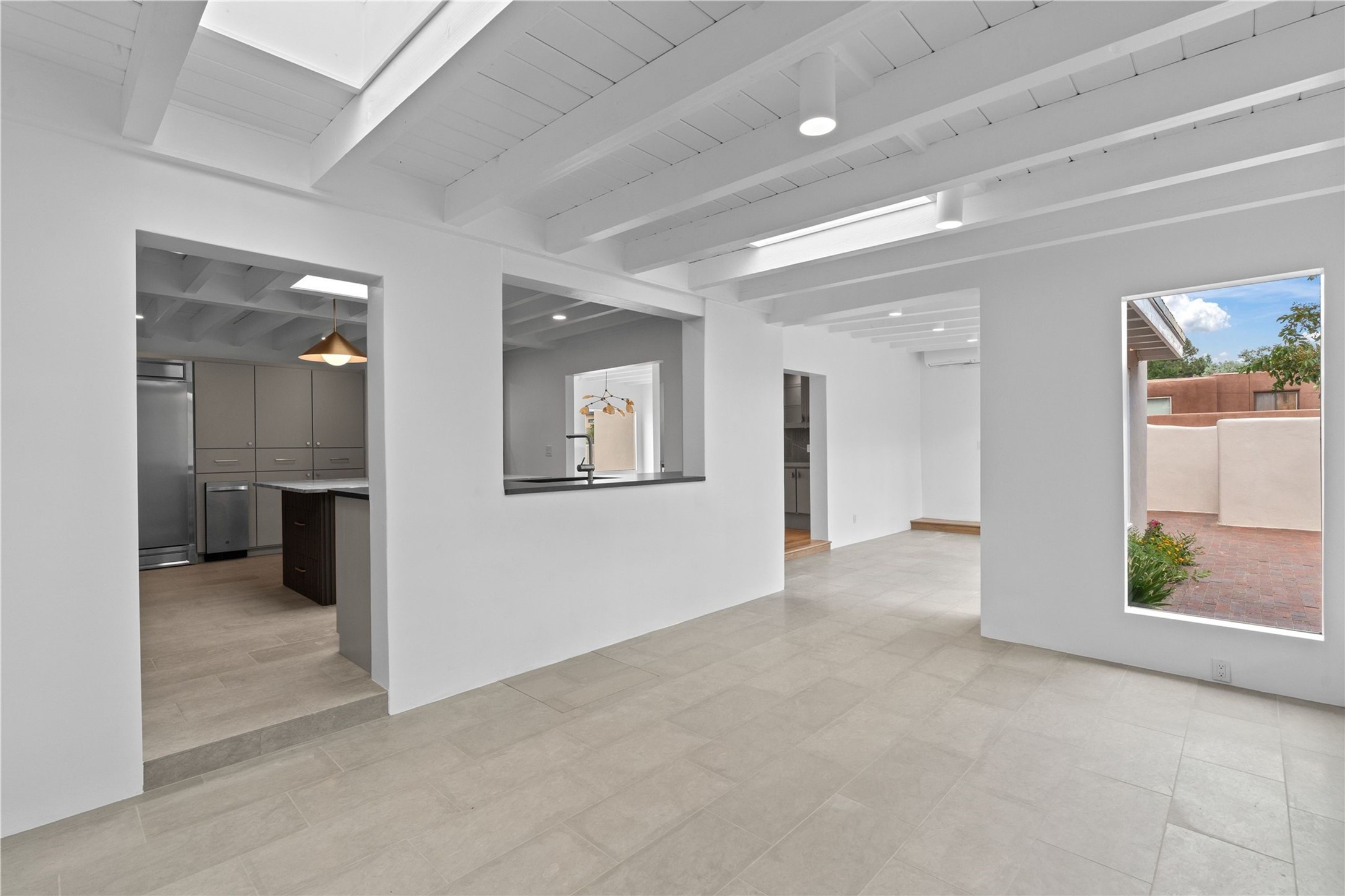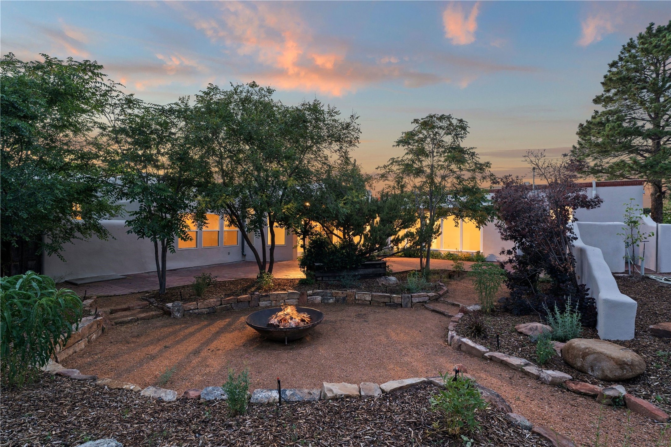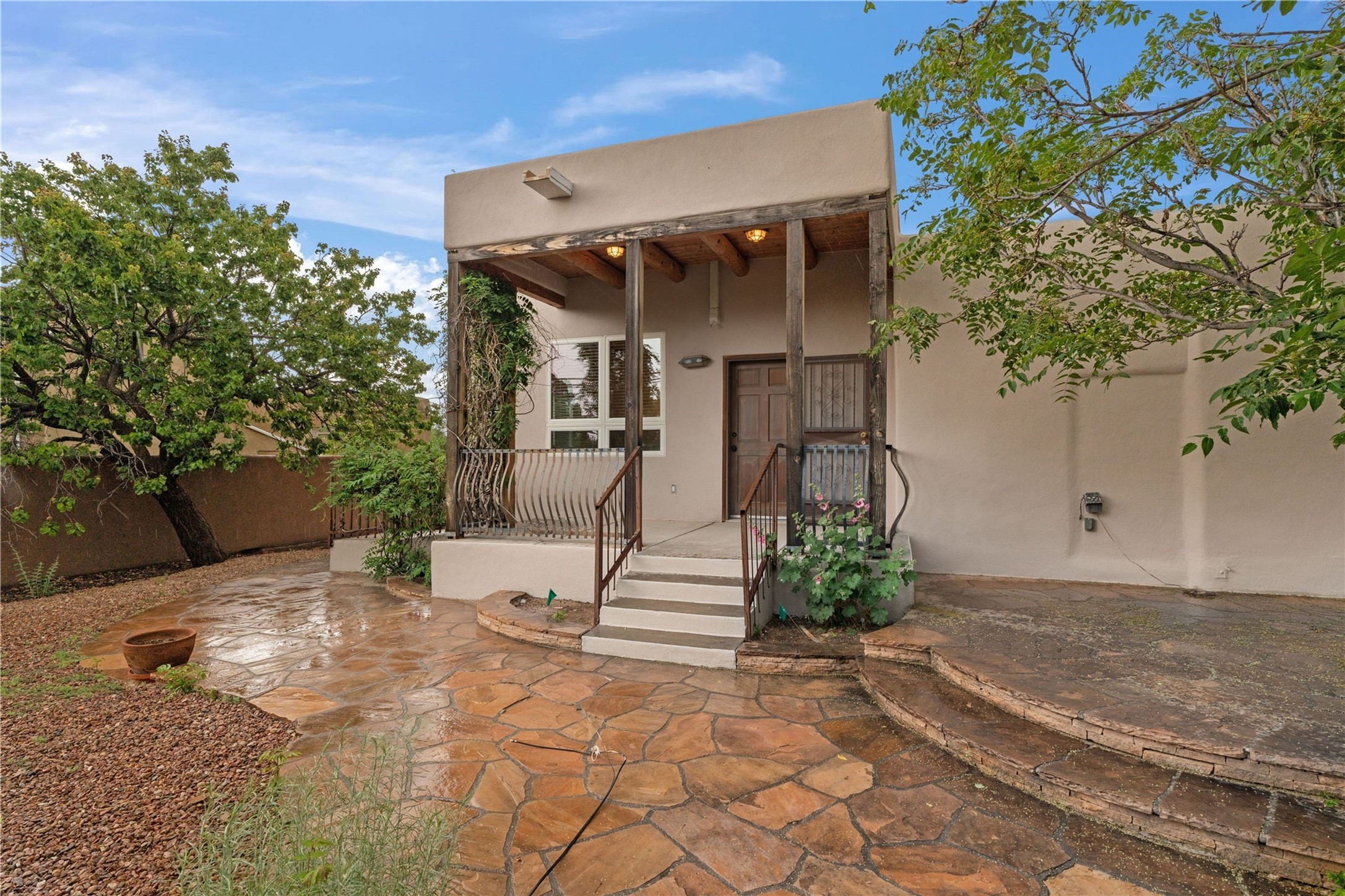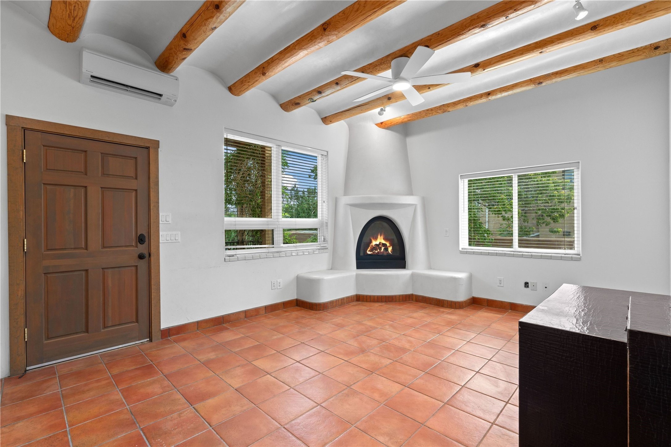Discover a stunning 3-bedroom, 2.5-bath home paired with a charming 1-bedroom, 1-bath casita all located in the desirable San Mateo neighborhood. This residence has undergone a high-end complete renovation showcasing exquisite designer finishes throughout. Step inside to find blue Bateig honed limestone tile floors and original refinished wood floors that create a seamless flow across the spacious living areas. The gourmet kitchen features carbon grey honed granite counters, and a striking island topped with Nuage honed quartzite. Equipped with top-of-the-line appliances, including a Viking range and double oven and Forno Maderno French door refrigerator/freezer, this kitchen is designed for both functionality and style. Custom wood cabinets, a stylish bar area with a stainless-steel wine fridge and an elegant built-in wine rack complete the space. Primary bedroom includes a soaking tub, limestone shower, a freestanding double vanity, and dual custom-built closets, providing ample storage. Guest bedroom features an en-suite bath and wood burning fireplace. A third bedroom serves as versatile flex space, ideal for an office or studio. Half bath features authentic Terrazzo floor tile and custom-made concrete floating sink. New boiler, tankless water heater and 9 new ductless AC/heating units. 1/2-acre lot with a large backyard with custom fire pit, designated garden area, storage shed, mature fruit trees and a partially covered large brick patio. 2-car garage. Conveniently located close to the Santa Fe Plaza, Museum Hill, and the Railyard.