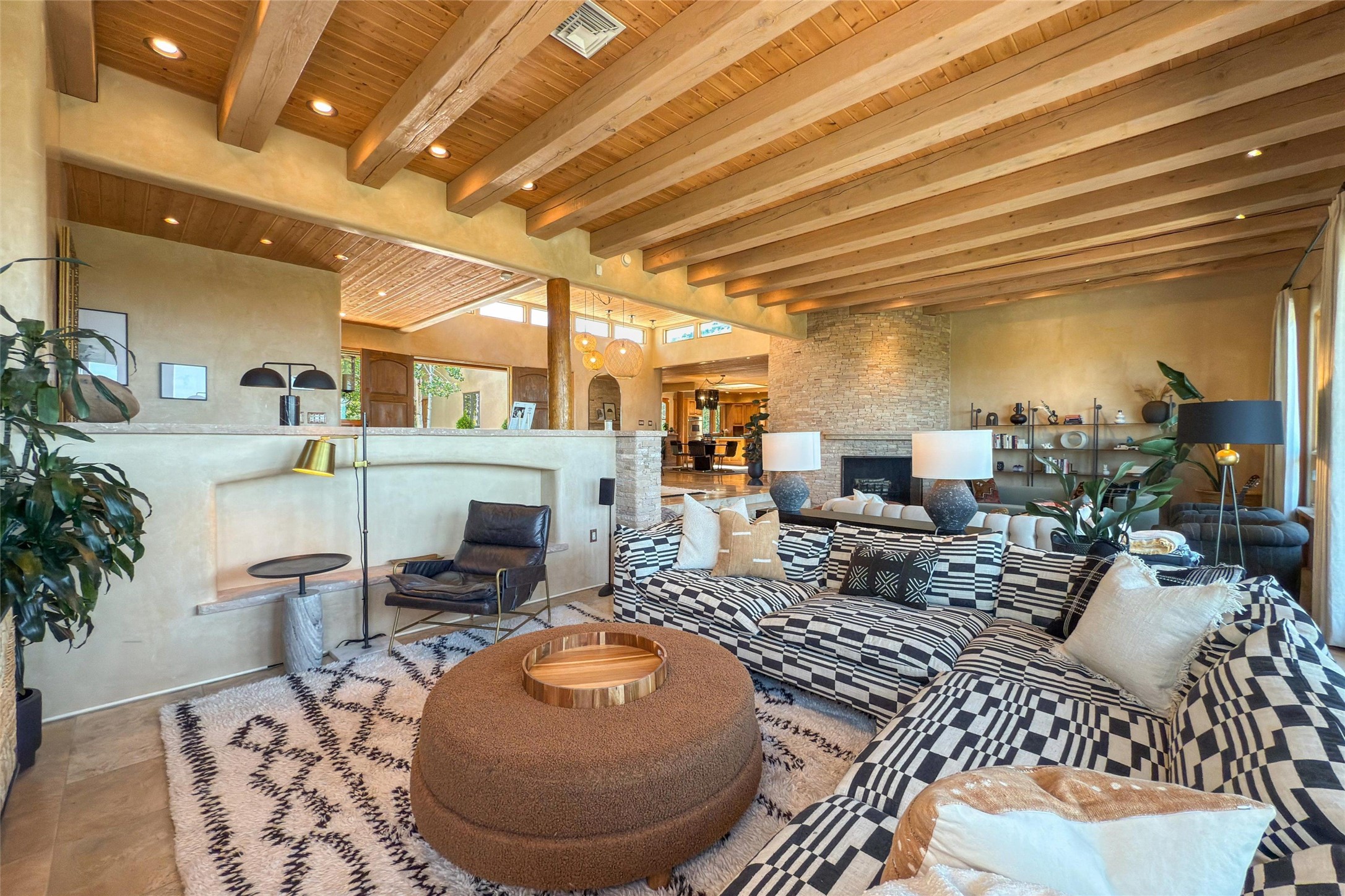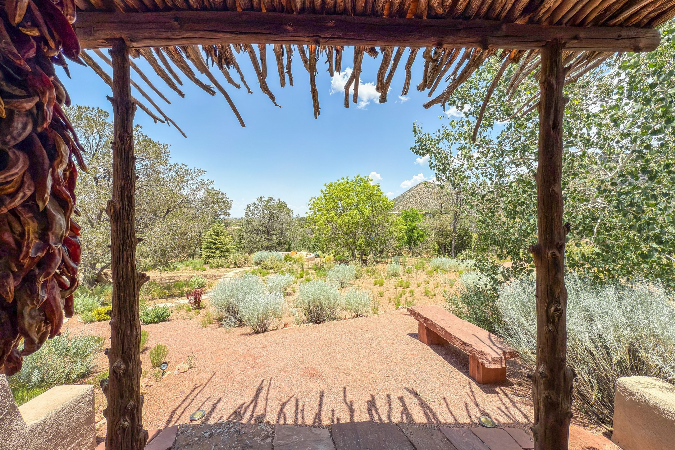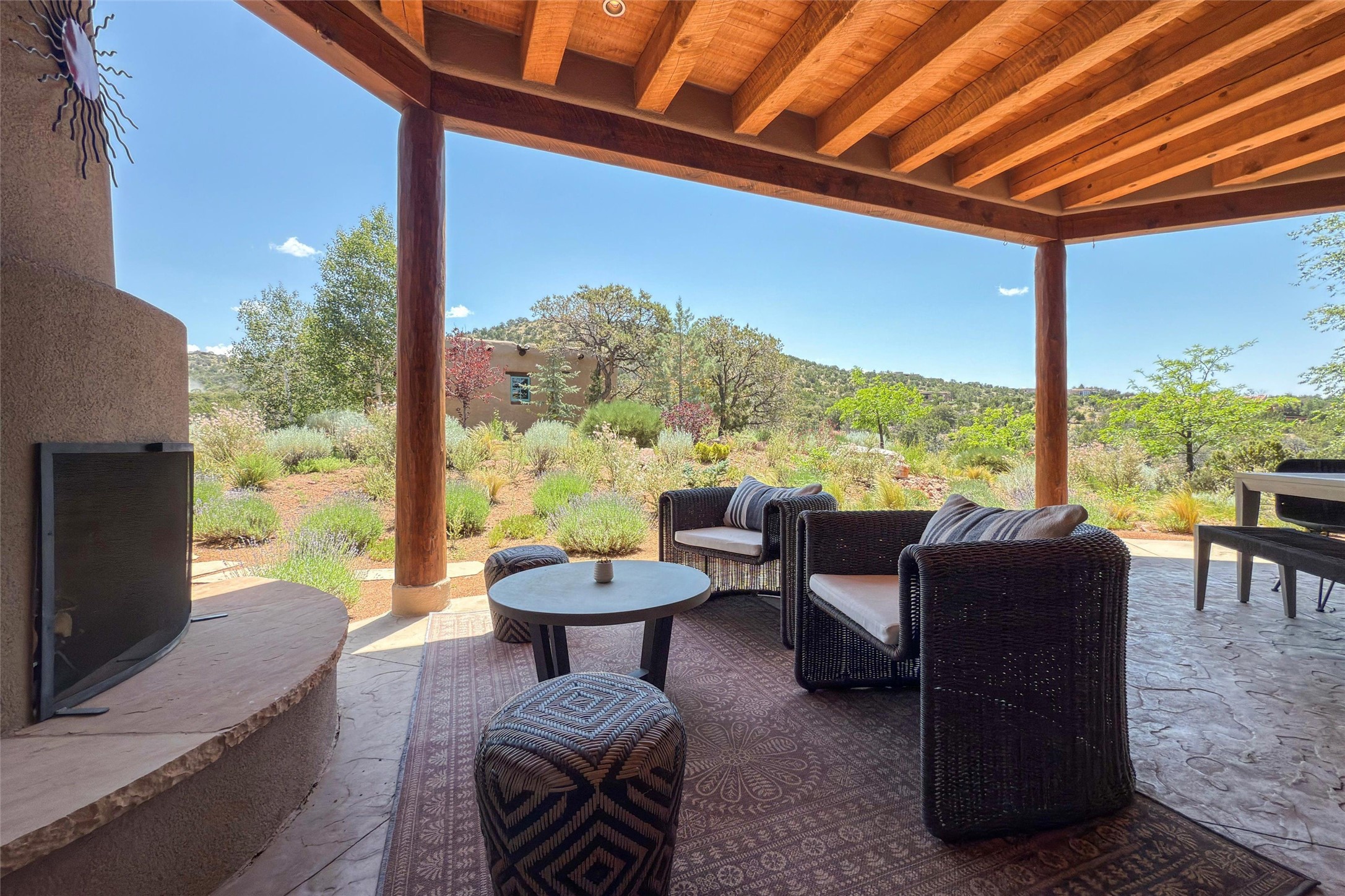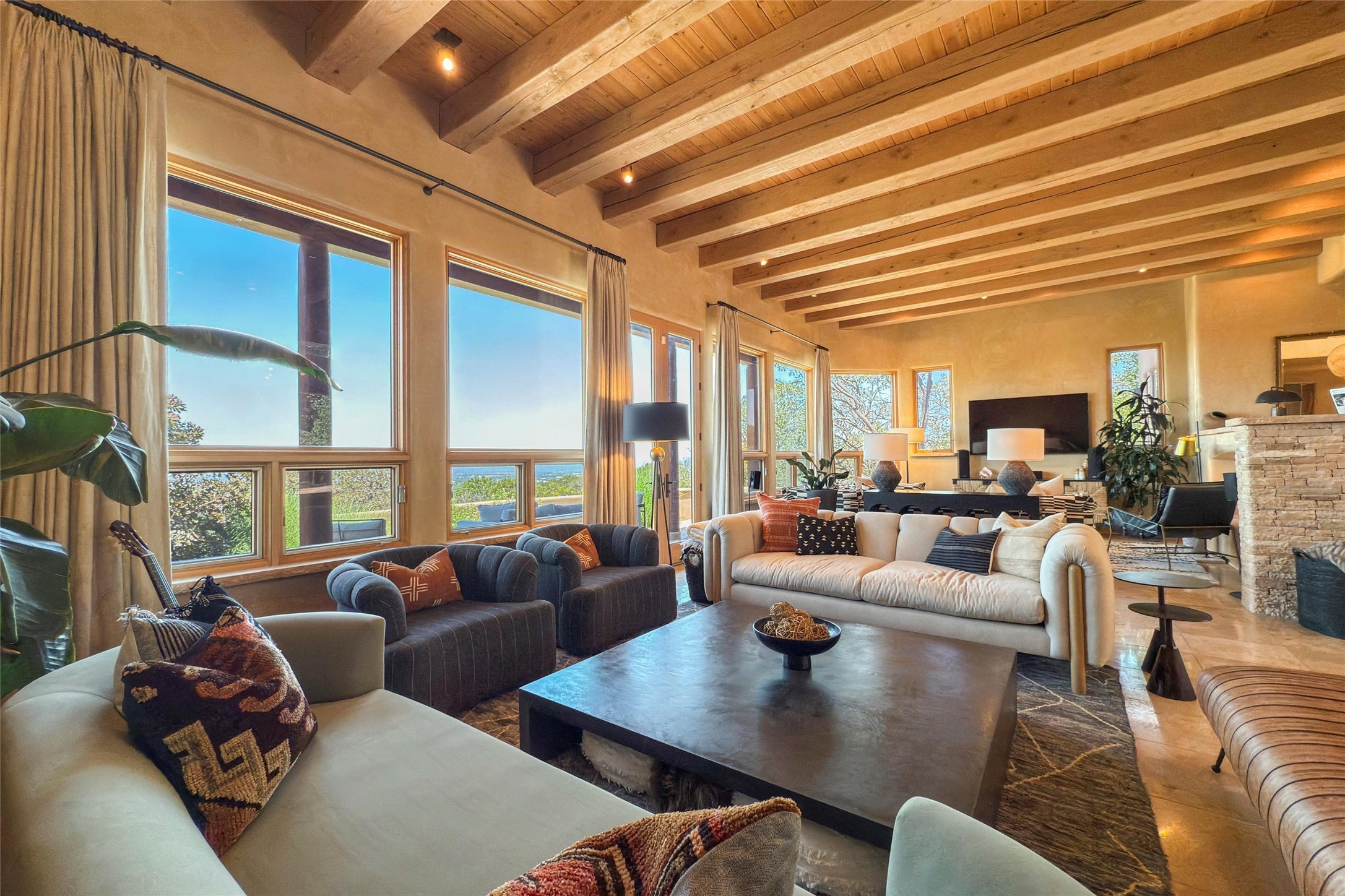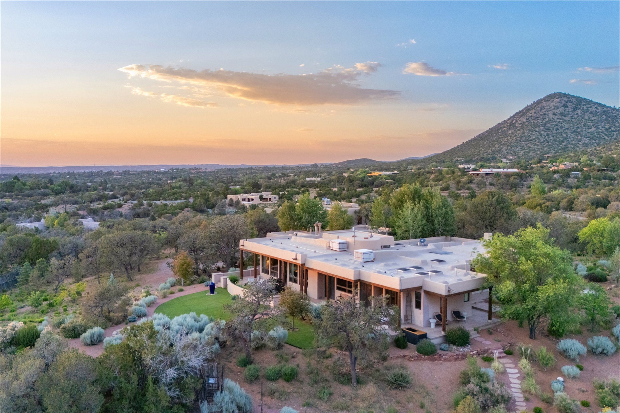 Embrace a lifestyle of sophistication and creativity in this stunning Northern New Mexico Compound that offers dramatic views of Sun and Moon Mountain. Situated on 2.5 acres, this special residence invites you to revel in the beauty of the surrounding landscape, with mountain vistas and city lights visible from indoor windows and the expansive 2,500 sq. ft. covered portal. A private quarter-mile walking path winds through the property, offering a tranquil way to connect with the land and enjoy the scenery. Gather around the outdoor kiva fireplace to enjoy views of the enchanting New Mexican nights. The property includes a main residence with two spacious bedrooms, a detached bedroom with a full bath, and a one-bedroom casita with a living area, kitchen, and full bath. In addition, there is a 100-year-old adobe studio. Inside the main house, the large great room is highlighted by soaring vigas and a striking, stacked stone fireplace that serves as the focal point. Culinary enthusiasts will delight in the generous gourmet kitchen, equipped with a central island and top-tier appliances. Retreat to the owner's suite, featuring another stacked stone fireplace, a jacuzzi tub, and an infrared sauna with an open-air cold plunge pool. The outside space is complete with a cedar tub, outdoor shower, and fire pit. Convenience and comfort are enhanced with a whole house generator. Recent upgrades include a new boiler system, water softener, modernized electrical, a new pantry system, custom California Closets and more. Fully fenced yard with drip irrigation is enhanced by the recent planting of over 30 trees. Located minutes from the Historic Santa Fe Plaza.
