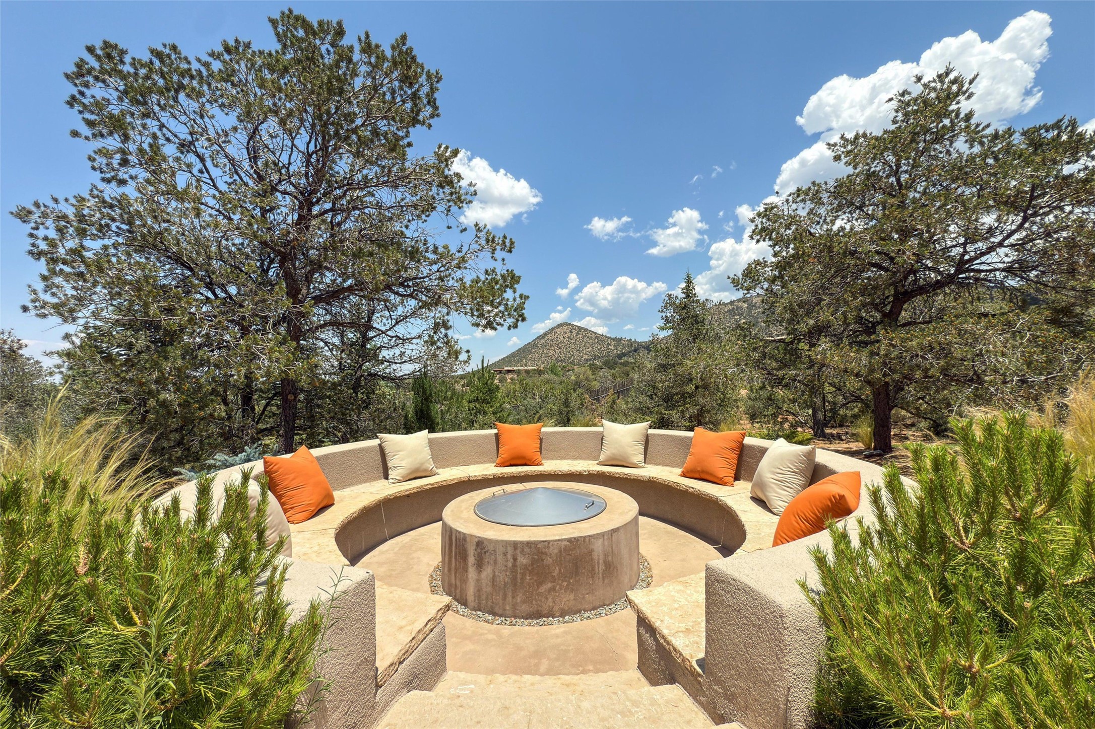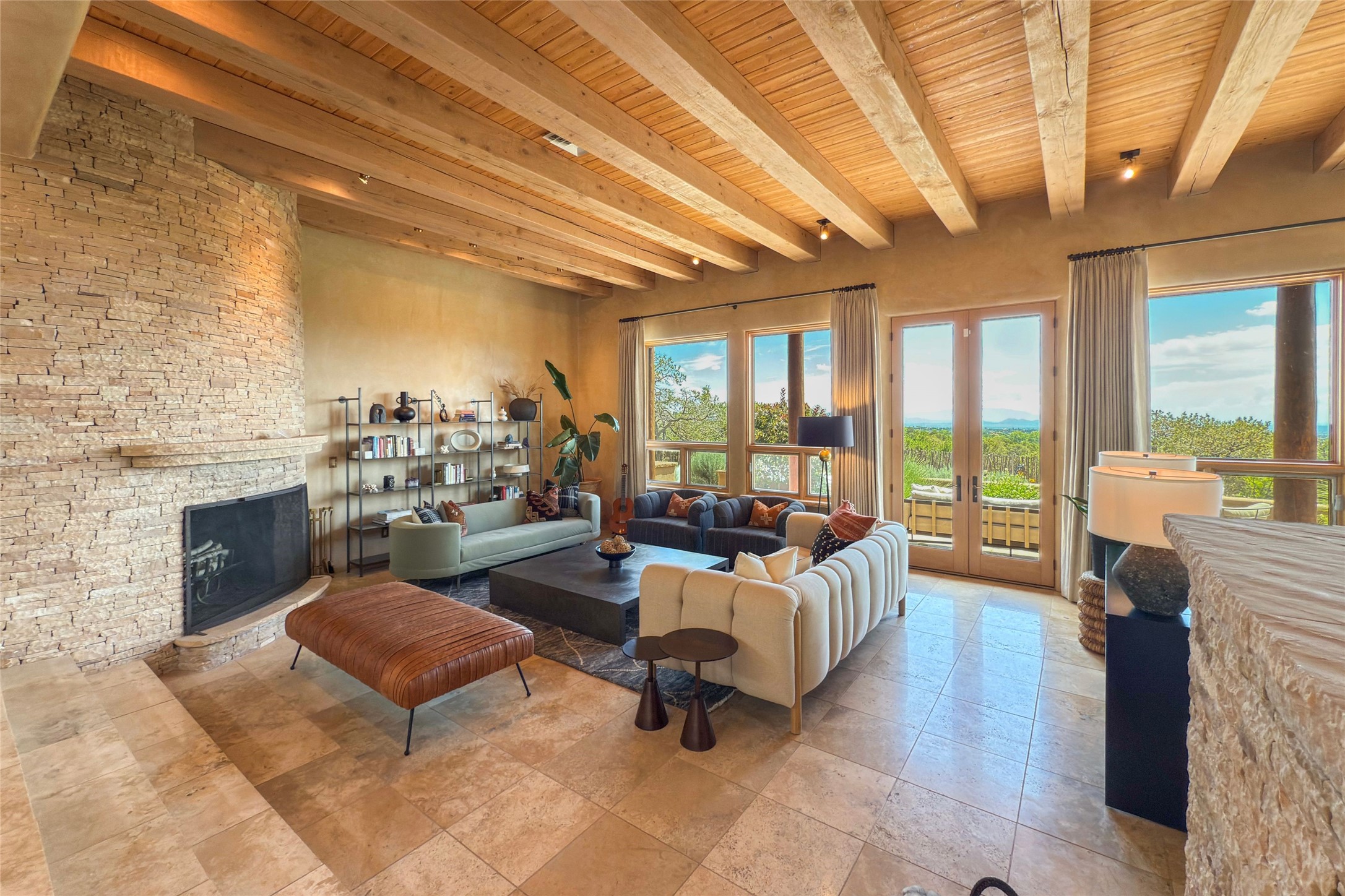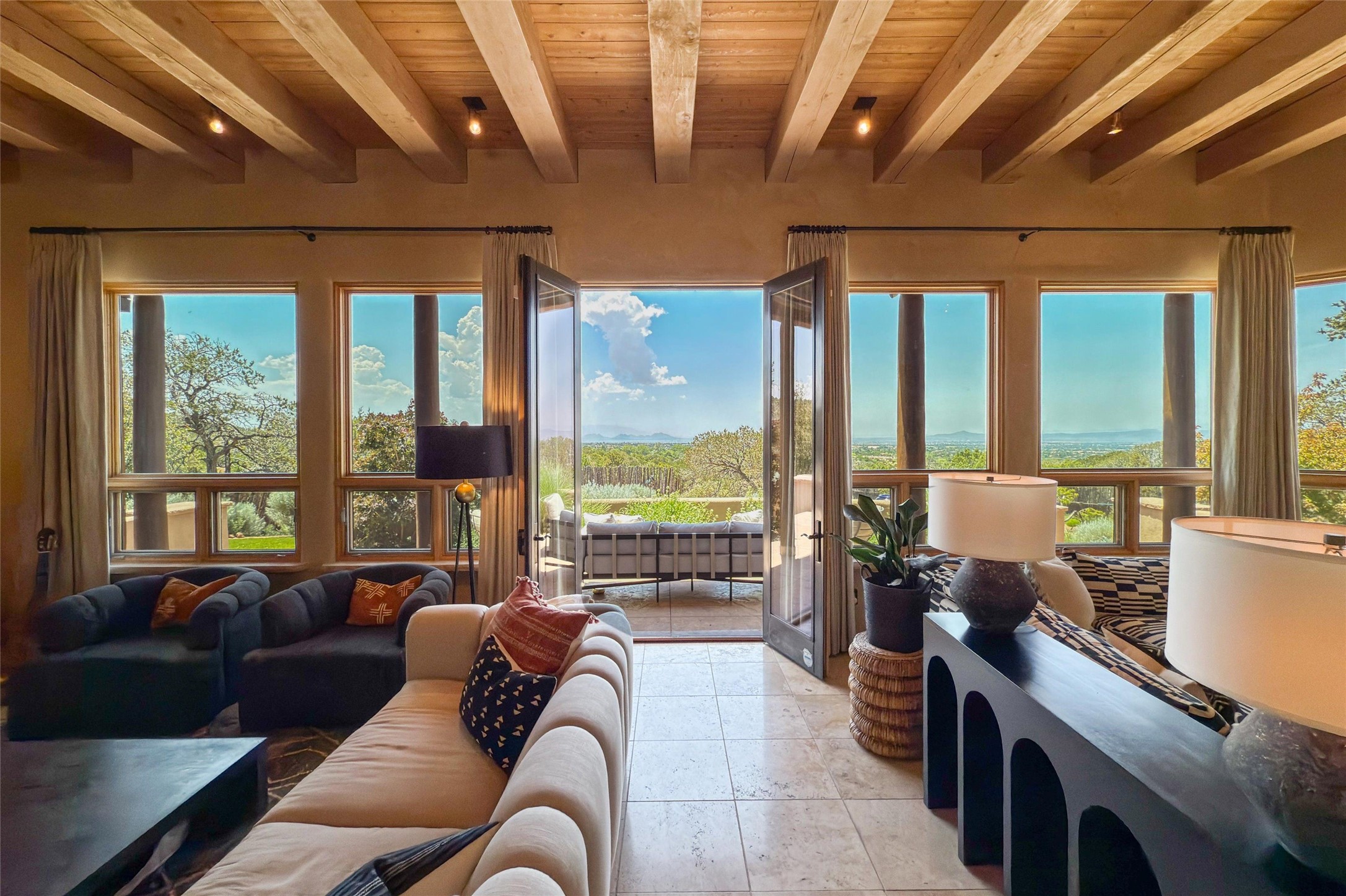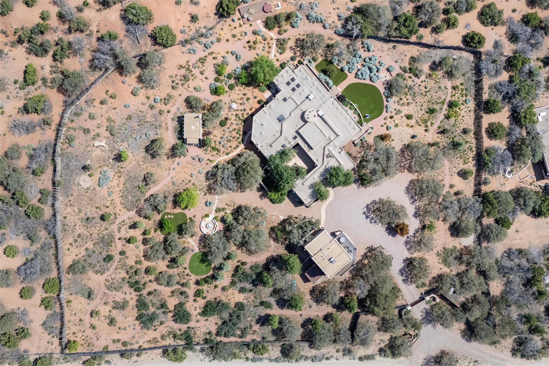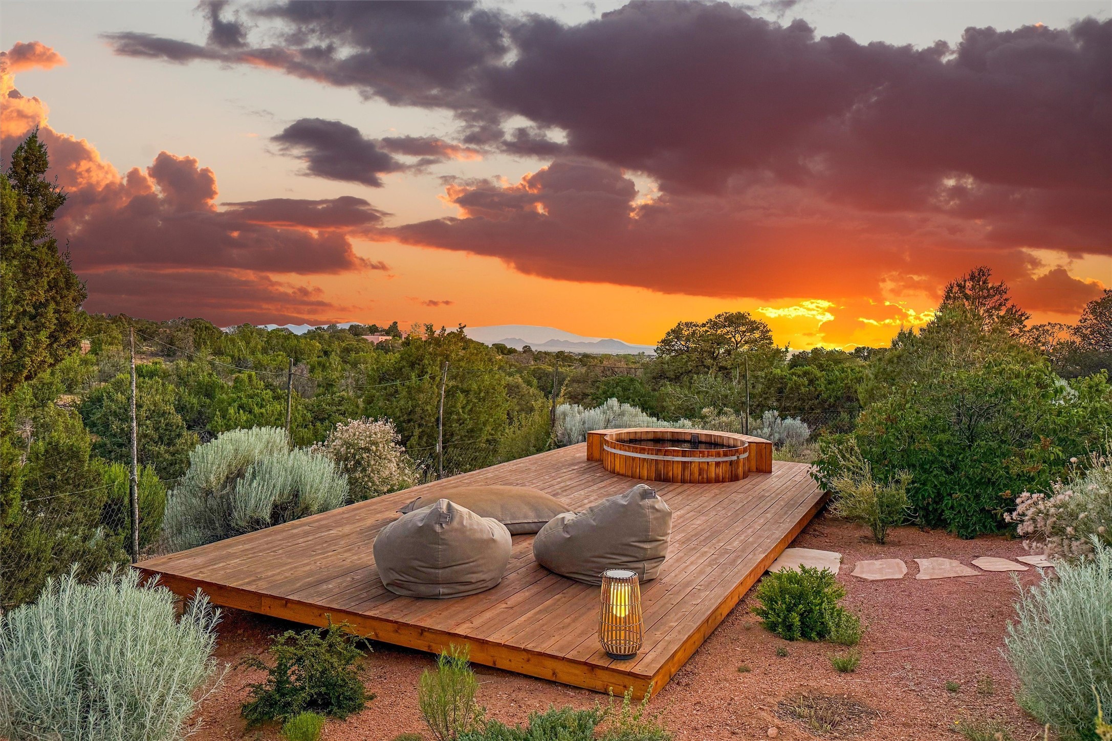 Embrace a lifestyle of sophistication and creativity in this stunning Northern New Mexico Compound that offers dramatic views of Sun and Moon Mountain. Situated on 2.5 acres, this special residence invites you to revel in the beauty of the surrounding landscape, with mountain vistas and city lights visible from indoor windows and the expansive 2,500 sq. ft. covered portal. A private quarter-mile walking path winds through the property, offering a tranquil way to connect with the land and enjoy the scenery. Gather around the outdoor kiva fireplace to enjoy views of the enchanting New Mexican nights. The property includes a main residence with two spacious bedrooms, a detached bedroom with a full bath, and a one-bedroom casita with a living area, kitchen, and full bath. In addition, there is a 100-year-old adobe studio. Inside the main house, the large great room is highlighted by soaring vigas and a striking, stacked stone fireplace that serves as the focal point. Culinary enthusiasts will delight in the generous gourmet kitchen, equipped with a central island and top-tier appliances. Retreat to the owner's suite, featuring another stacked stone fireplace, a jacuzzi tub, and an infrared sauna with an open-air cold plunge pool. The outside space is complete with a cedar tub, outdoor shower, and fire pit. Convenience and comfort are enhanced with a whole house generator. Recent upgrades include a new boiler system, water softener, modernized electrical, a new pantry system, custom California Closets and more. Fully fenced yard with drip irrigation is enhanced by the recent planting of over 30 trees. Located minutes from the Historic Santa Fe Plaza.