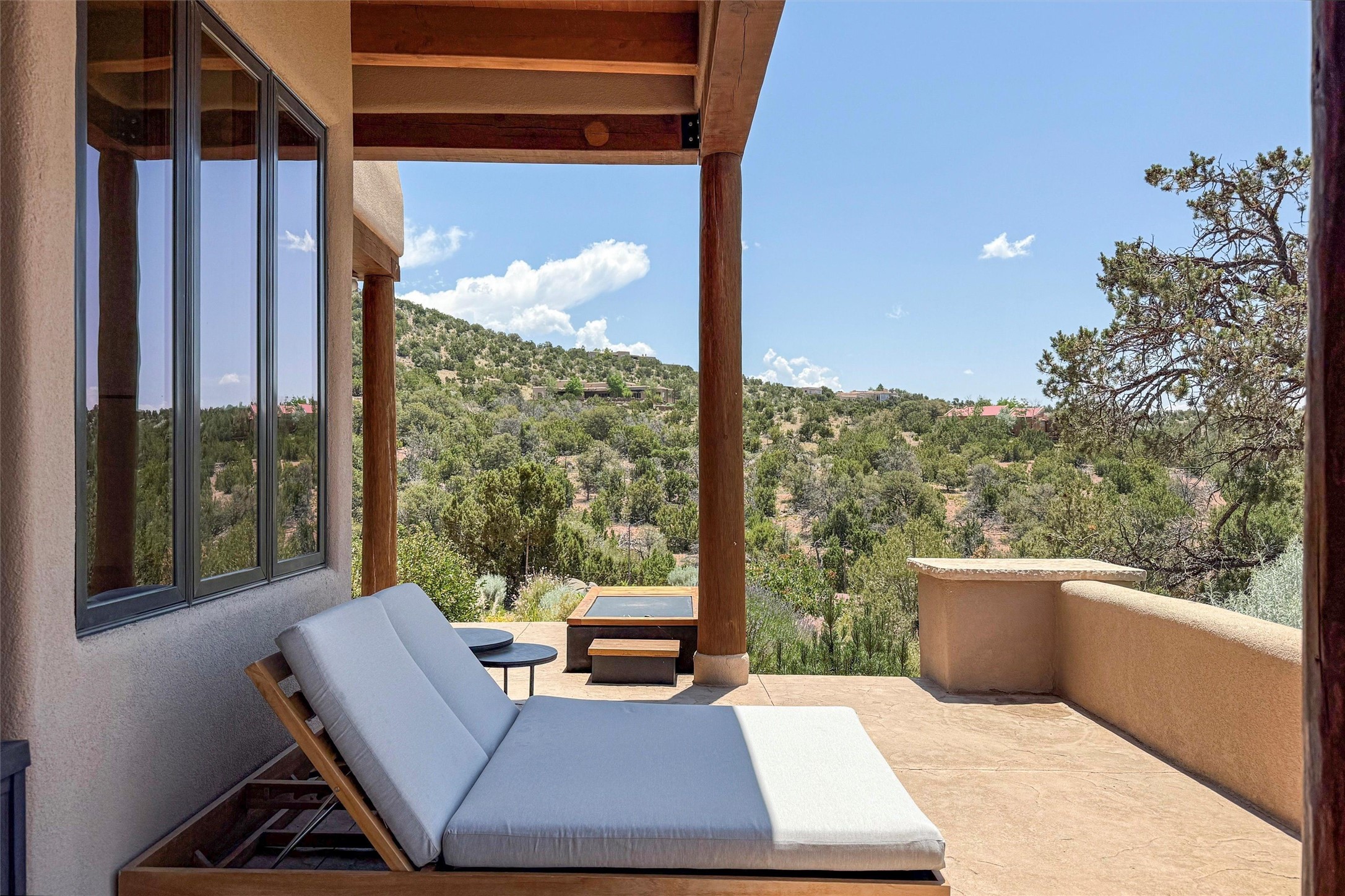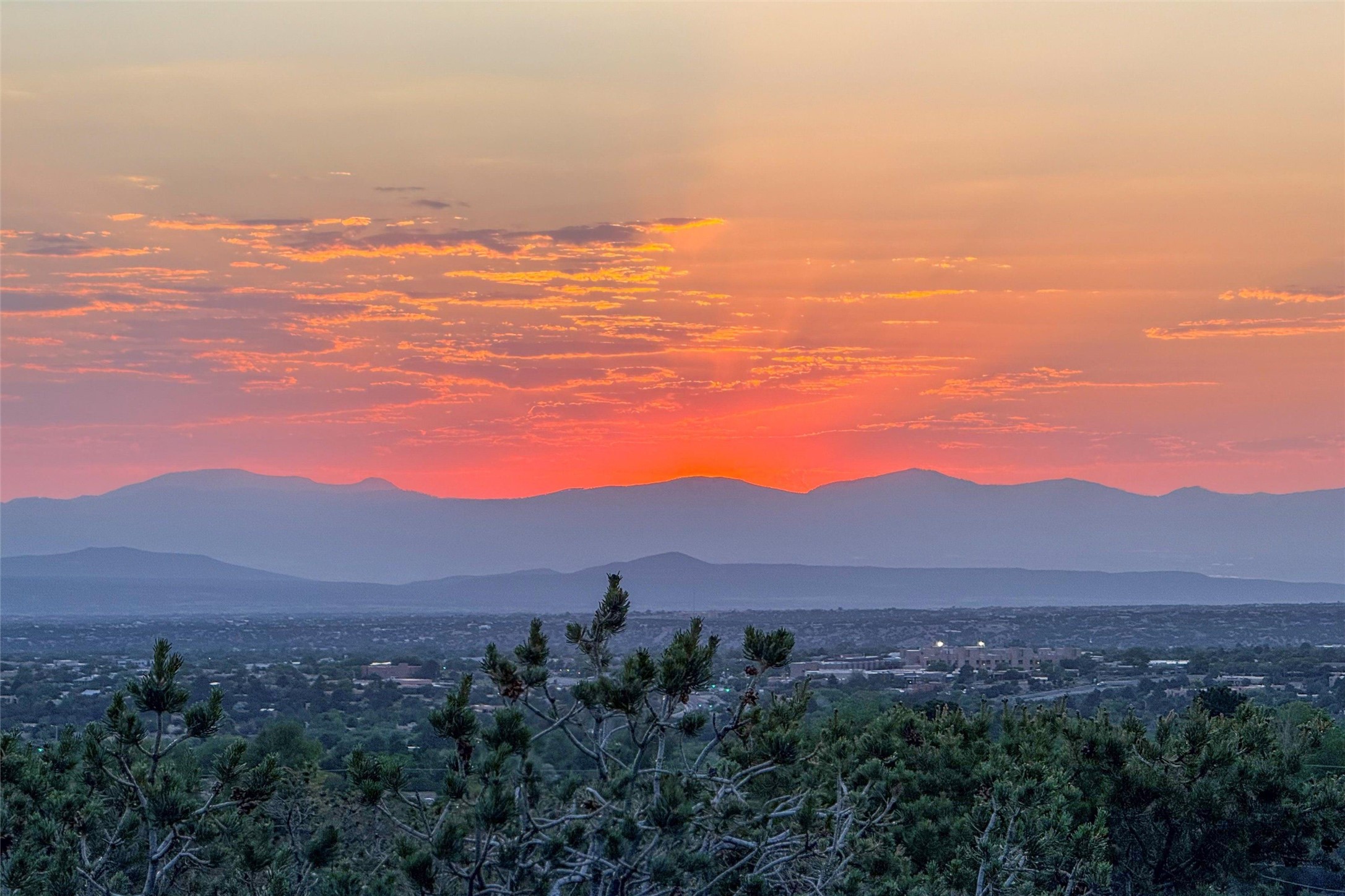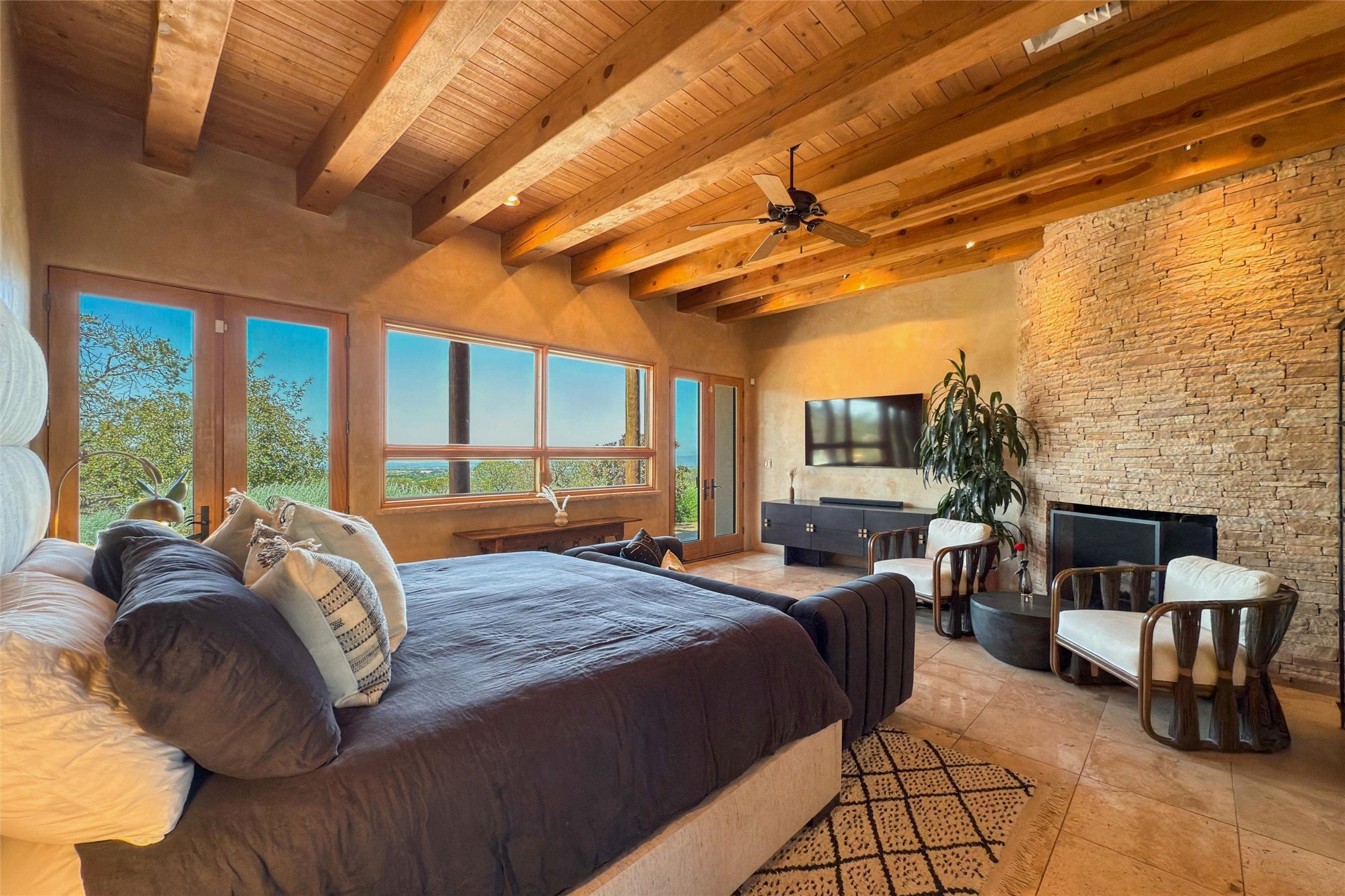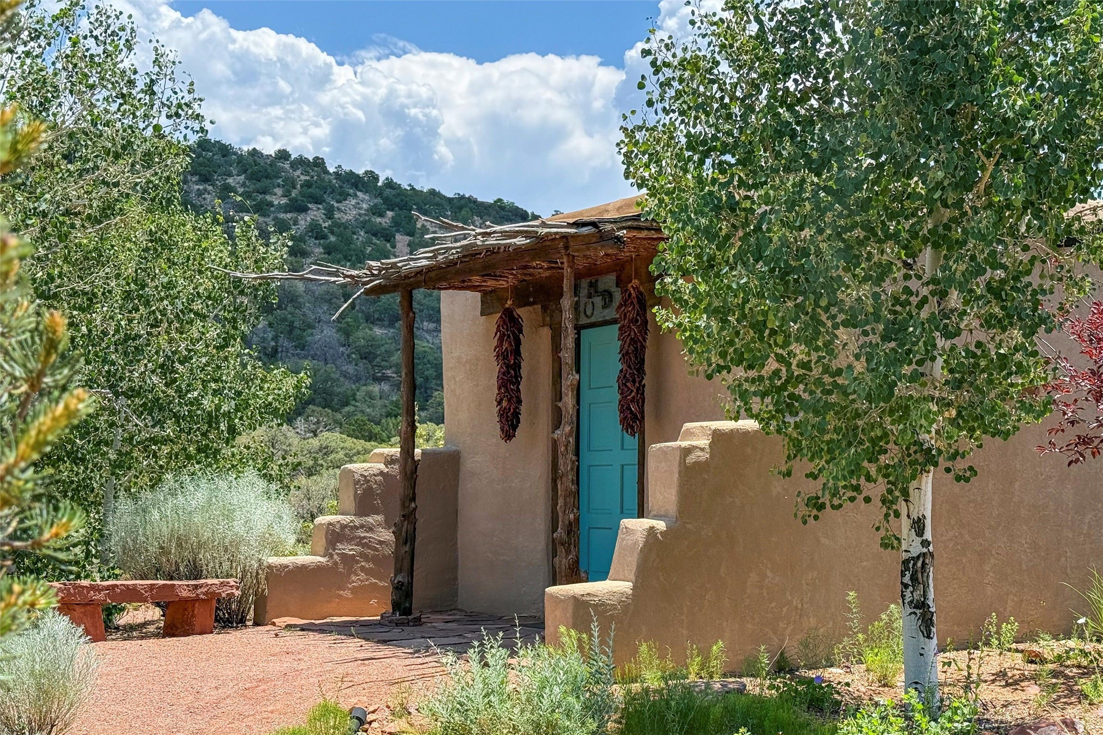 Embrace a lifestyle of sophistication and creativity in this stunning Northern New Mexico Compound that offers dramatic views of Sun and Moon Mountain. Situated on 2.5 acres, this special residence invites you to revel in the beauty of the surrounding landscape, with mountain vistas and city lights visible from indoor windows and the expansive 2,500 sq. ft. covered portal. A private quarter-mile walking path winds through the property, offering a tranquil way to connect with the land and enjoy the scenery. Gather around the outdoor kiva fireplace to enjoy views of the enchanting New Mexican nights. The property includes a main residence with two spacious bedrooms, a detached bedroom with a full bath, and a one-bedroom casita with a living area, kitchen, and full bath. In addition, there is a 100-year-old adobe studio. Inside the main house, the large great room is highlighted by soaring vigas and a striking, stacked stone fireplace that serves as the focal point. Culinary enthusiasts will delight in the generous gourmet kitchen, equipped with a central island and top-tier appliances. Retreat to the owner's suite, featuring another stacked stone fireplace, a jacuzzi tub, and an infrared sauna with an open-air cold plunge pool. The outside space is complete with a cedar tub, outdoor shower, and fire pit. Convenience and comfort are enhanced with a whole house generator. Recent upgrades include a new boiler system, water softener, modernized electrical, a new pantry system, custom California Closets and more. Fully fenced yard with drip irrigation is enhanced by the recent planting of over 30 trees. Located minutes from the Historic Santa Fe Plaza.