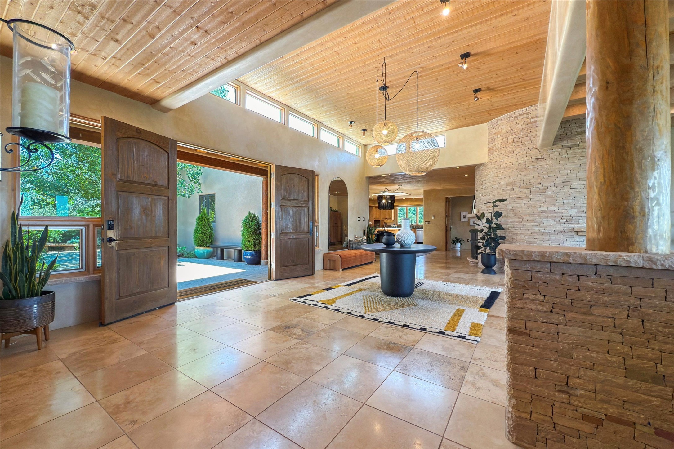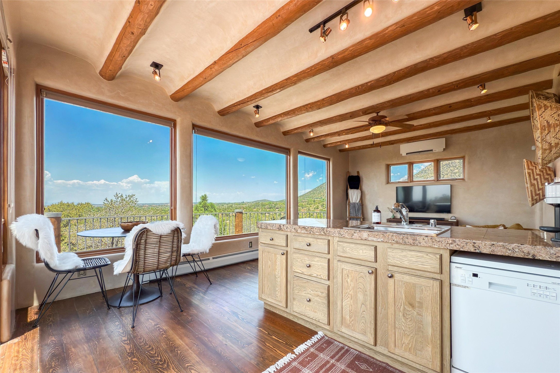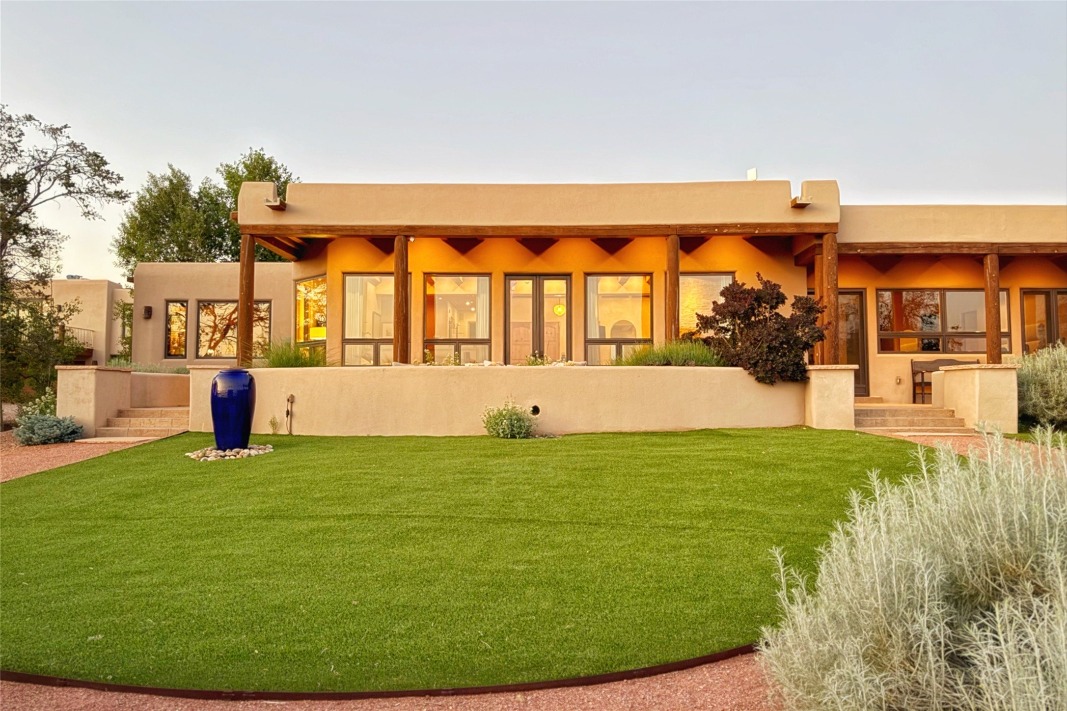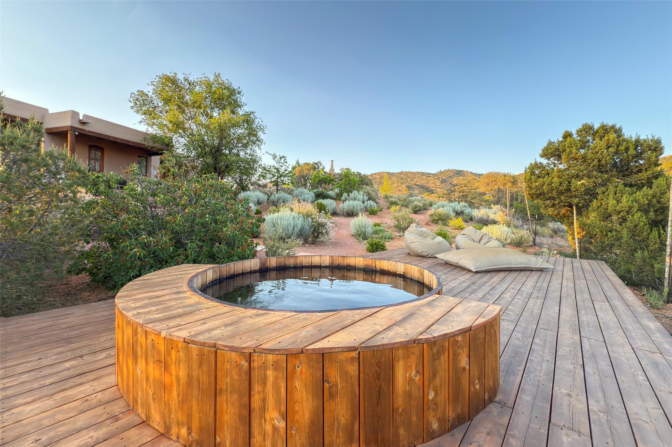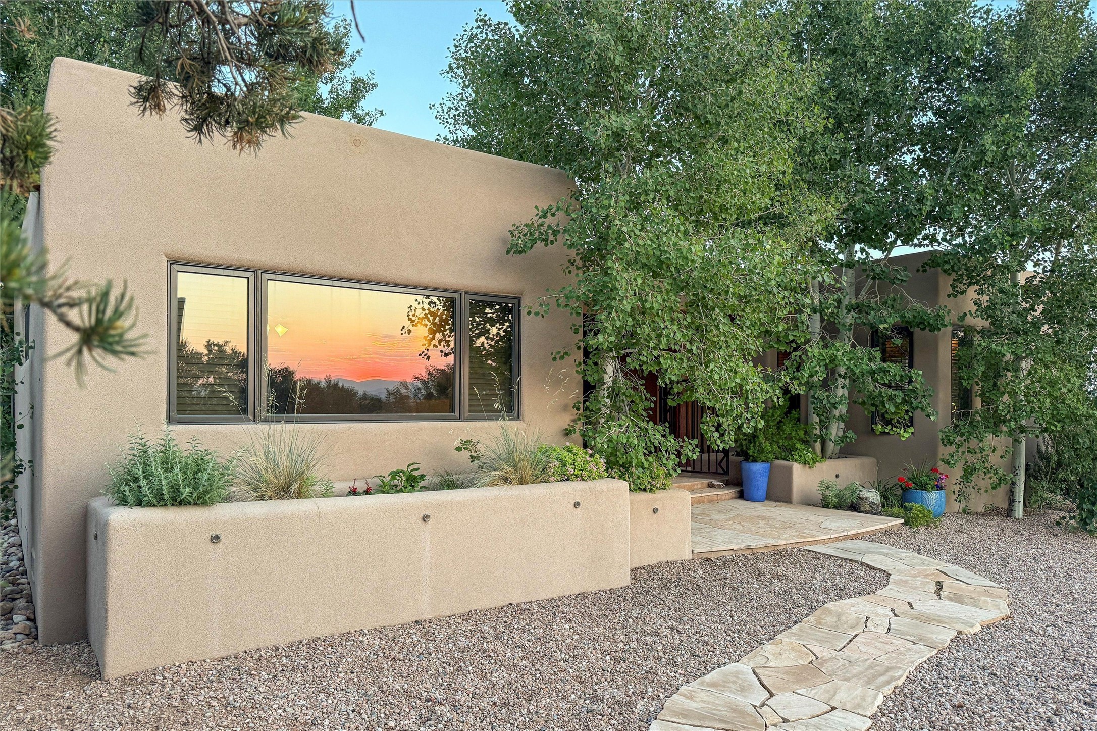Embrace a lifestyle of sophistication and creativity in this stunning Northern New Mexico Compound that offers dramatic views of Sun and Moon Mountain. Situated on 2.5 acres, this special residence invites you to revel in the beauty of the surrounding landscape, with mountain vistas and city lights visible from indoor windows and the expansive 2,500 sq. ft. covered portal. A private quarter-mile walking path winds through the property, offering a tranquil way to connect with the land and enjoy the scenery. Gather around the outdoor kiva fireplace to enjoy views of the enchanting New Mexican nights. The property includes a main residence with two spacious bedrooms, a detached bedroom with a full bath, and a one-bedroom casita with a living area, kitchen, and full bath. In addition, there is a 100-year-old adobe studio. Inside the main house, the large great room is highlighted by soaring vigas and a striking, stacked stone fireplace that serves as the focal point. Culinary enthusiasts will delight in the generous gourmet kitchen, equipped with a central island and top-tier appliances. Retreat to the owner's suite, featuring another stacked stone fireplace, a jacuzzi tub, and an infrared sauna with an open-air cold plunge pool. The outside space is complete with a cedar tub, outdoor shower, and fire pit. Convenience and comfort are enhanced with a whole house generator. Recent upgrades include a new boiler system, water softener, modernized electrical, a new pantry system, custom California Closets and more. Fully fenced yard with drip irrigation is enhanced by the recent planting of over 30 trees. Located minutes from the Historic Santa Fe Plaza.