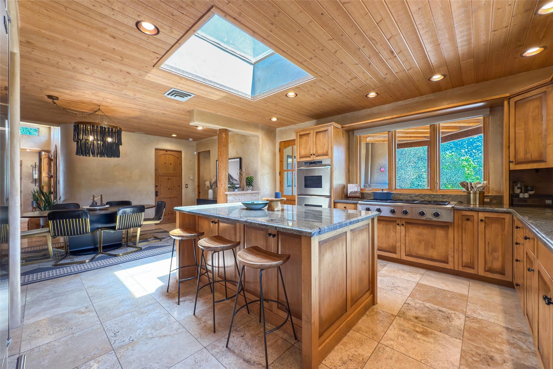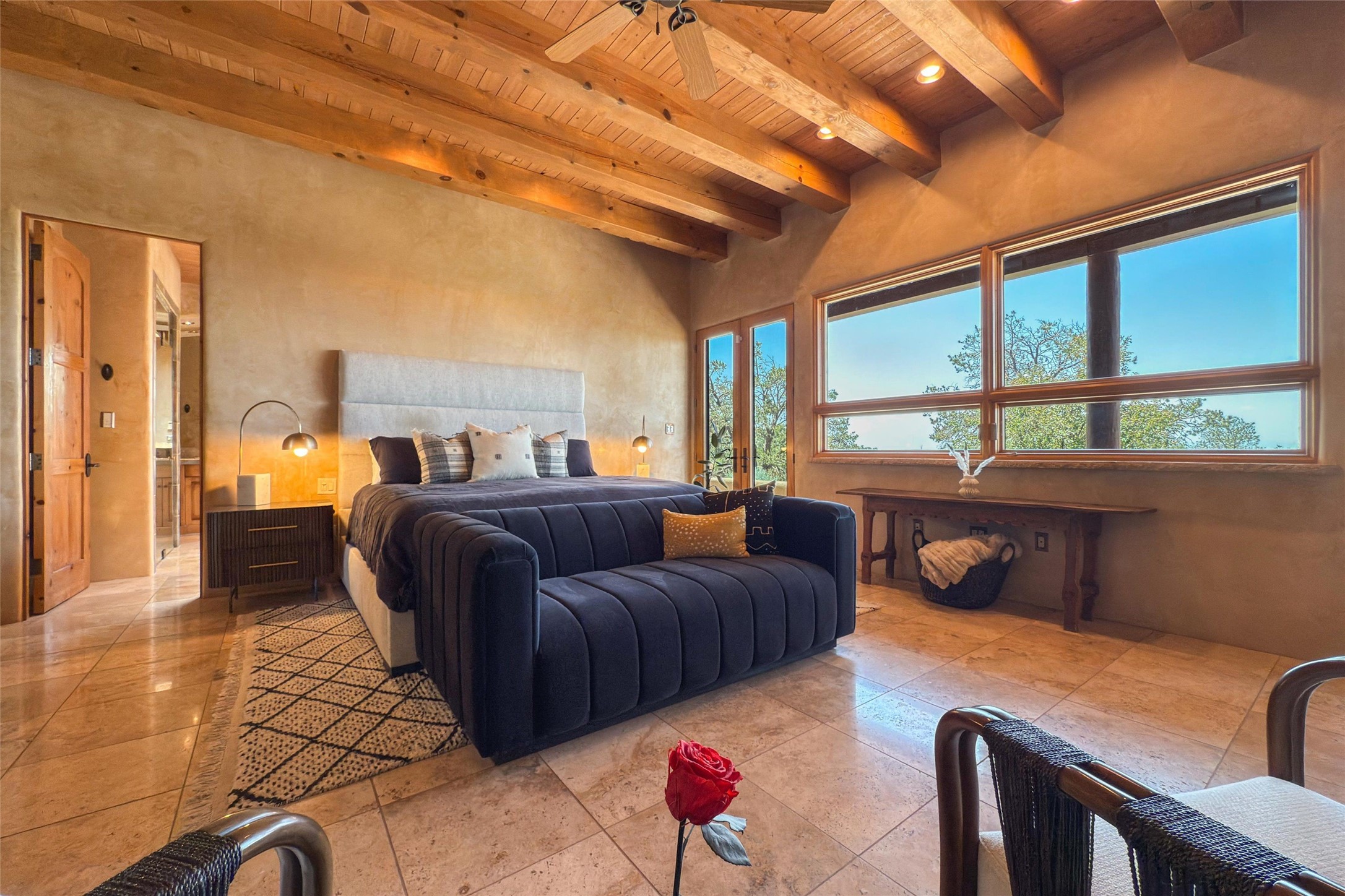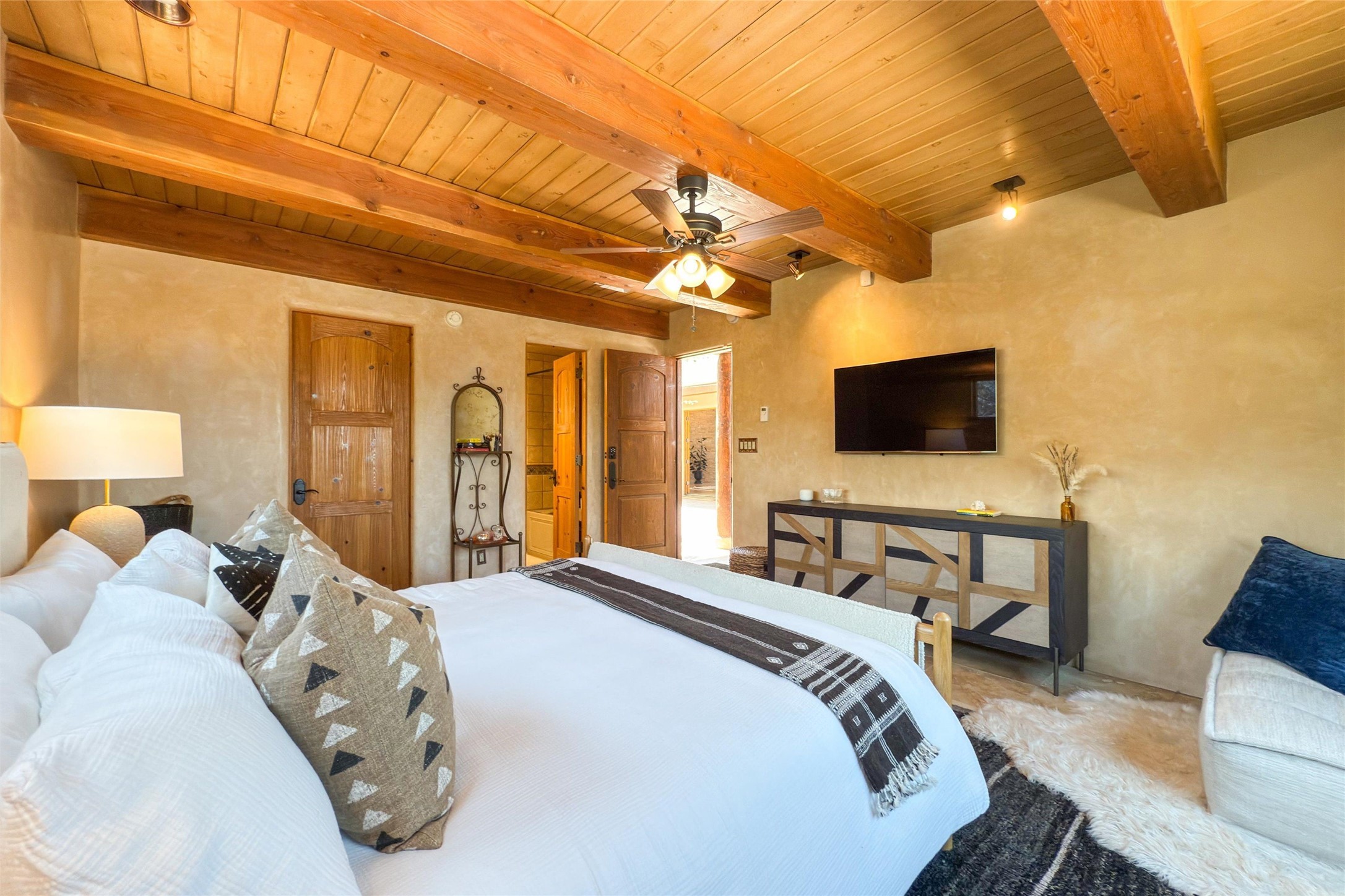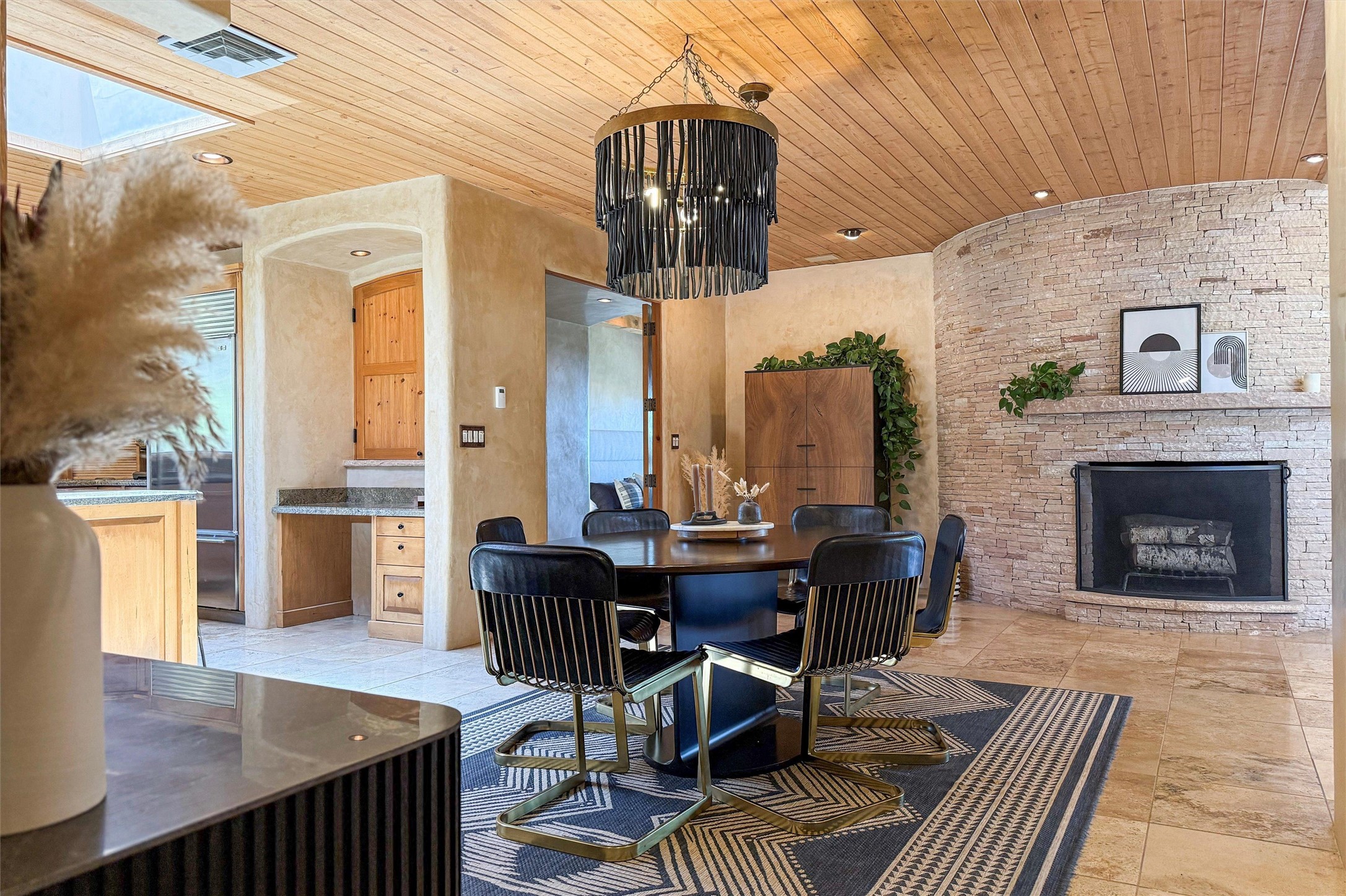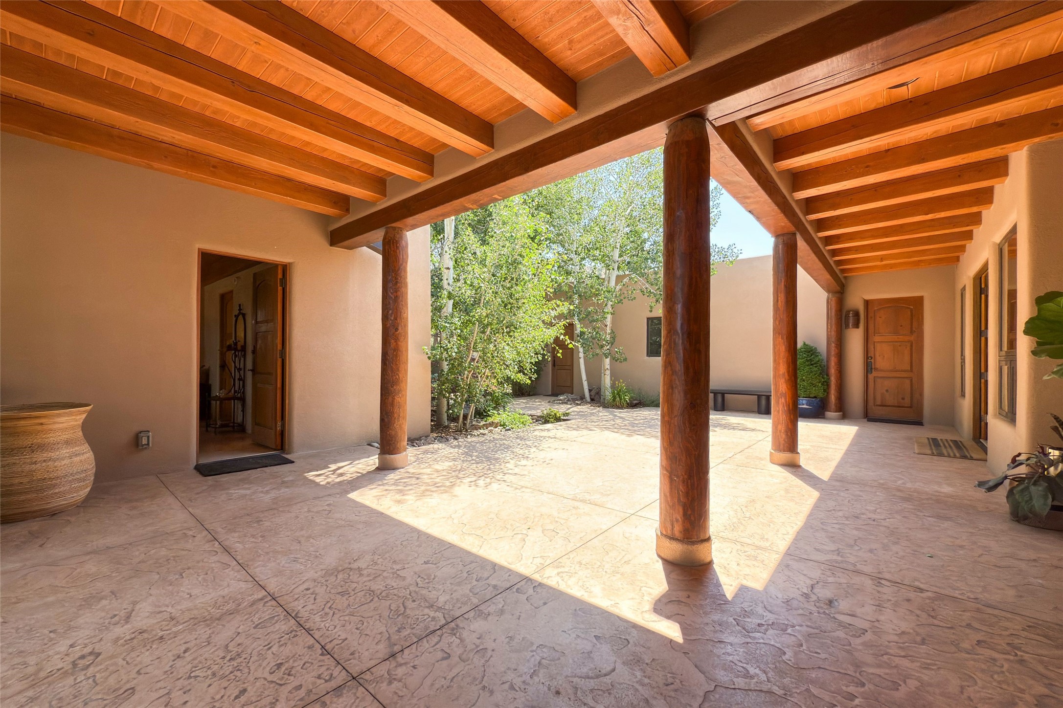 Embrace a lifestyle of sophistication and creativity in this stunning Northern New Mexico Compound that offers dramatic views of Sun and Moon Mountain. Situated on 2.5 acres, this special residence invites you to revel in the beauty of the surrounding landscape, with mountain vistas and city lights visible from indoor windows and the expansive 2,500 sq. ft. covered portal. A private quarter-mile walking path winds through the property, offering a tranquil way to connect with the land and enjoy the scenery. Gather around the outdoor kiva fireplace to enjoy views of the enchanting New Mexican nights. The property includes a main residence with two spacious bedrooms, a detached bedroom with a full bath, and a one-bedroom casita with a living area, kitchen, and full bath. In addition, there is a 100-year-old adobe studio. Inside the main house, the large great room is highlighted by soaring vigas and a striking, stacked stone fireplace that serves as the focal point. Culinary enthusiasts will delight in the generous gourmet kitchen, equipped with a central island and top-tier appliances. Retreat to the owner's suite, featuring another stacked stone fireplace, a jacuzzi tub, and an infrared sauna with an open-air cold plunge pool. The outside space is complete with a cedar tub, outdoor shower, and fire pit. Convenience and comfort are enhanced with a whole house generator. Recent upgrades include a new boiler system, water softener, modernized electrical, a new pantry system, custom California Closets and more. Fully fenced yard with drip irrigation is enhanced by the recent planting of over 30 trees. Located minutes from the Historic Santa Fe Plaza.