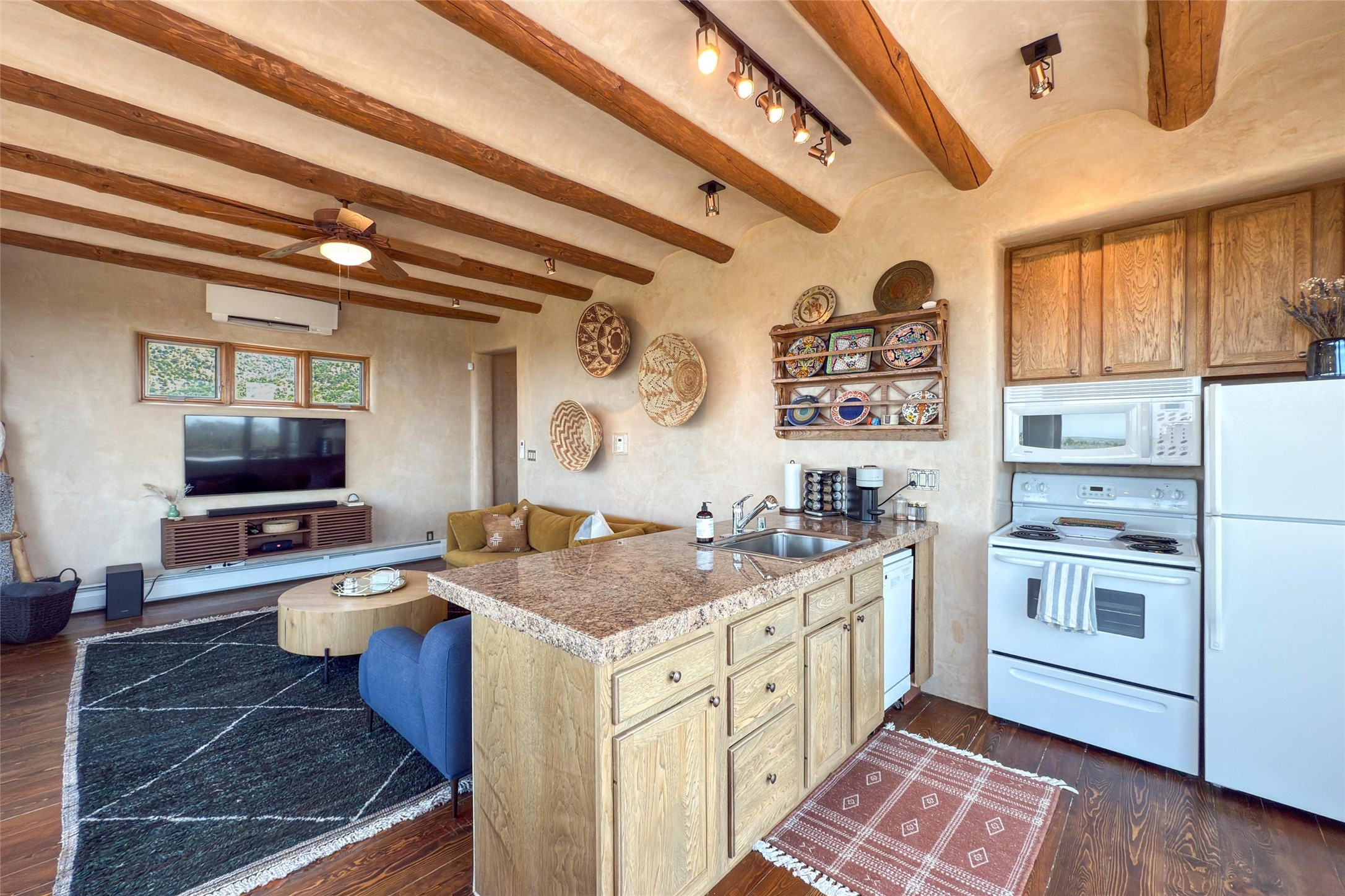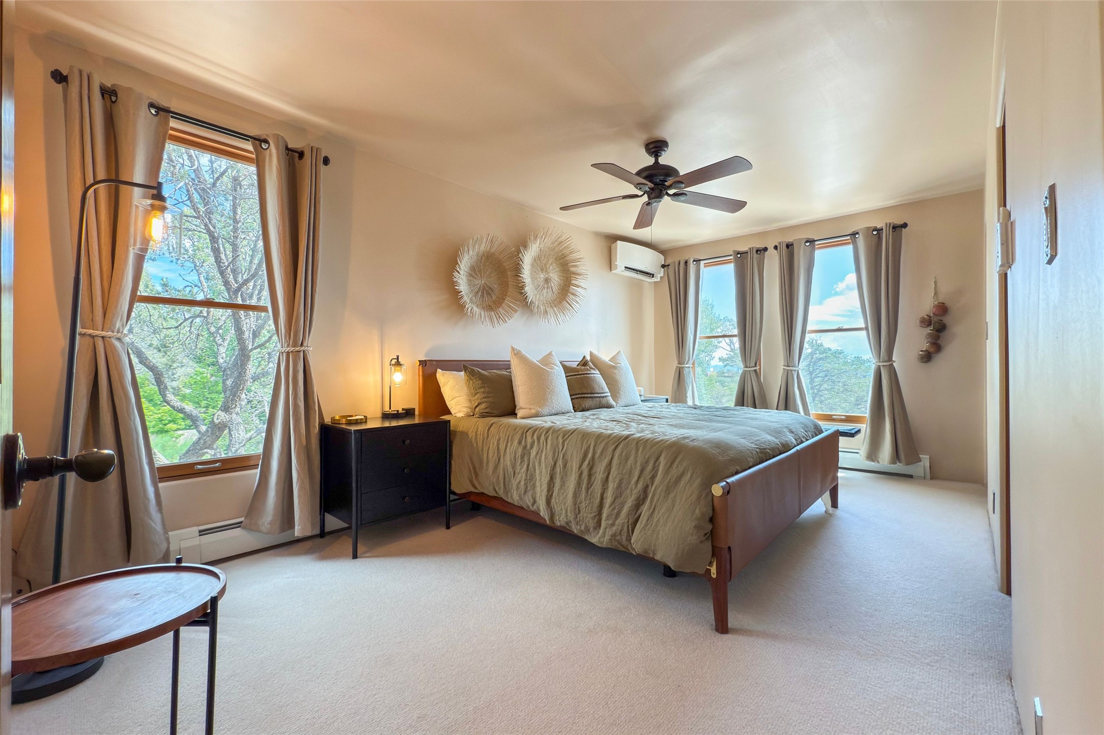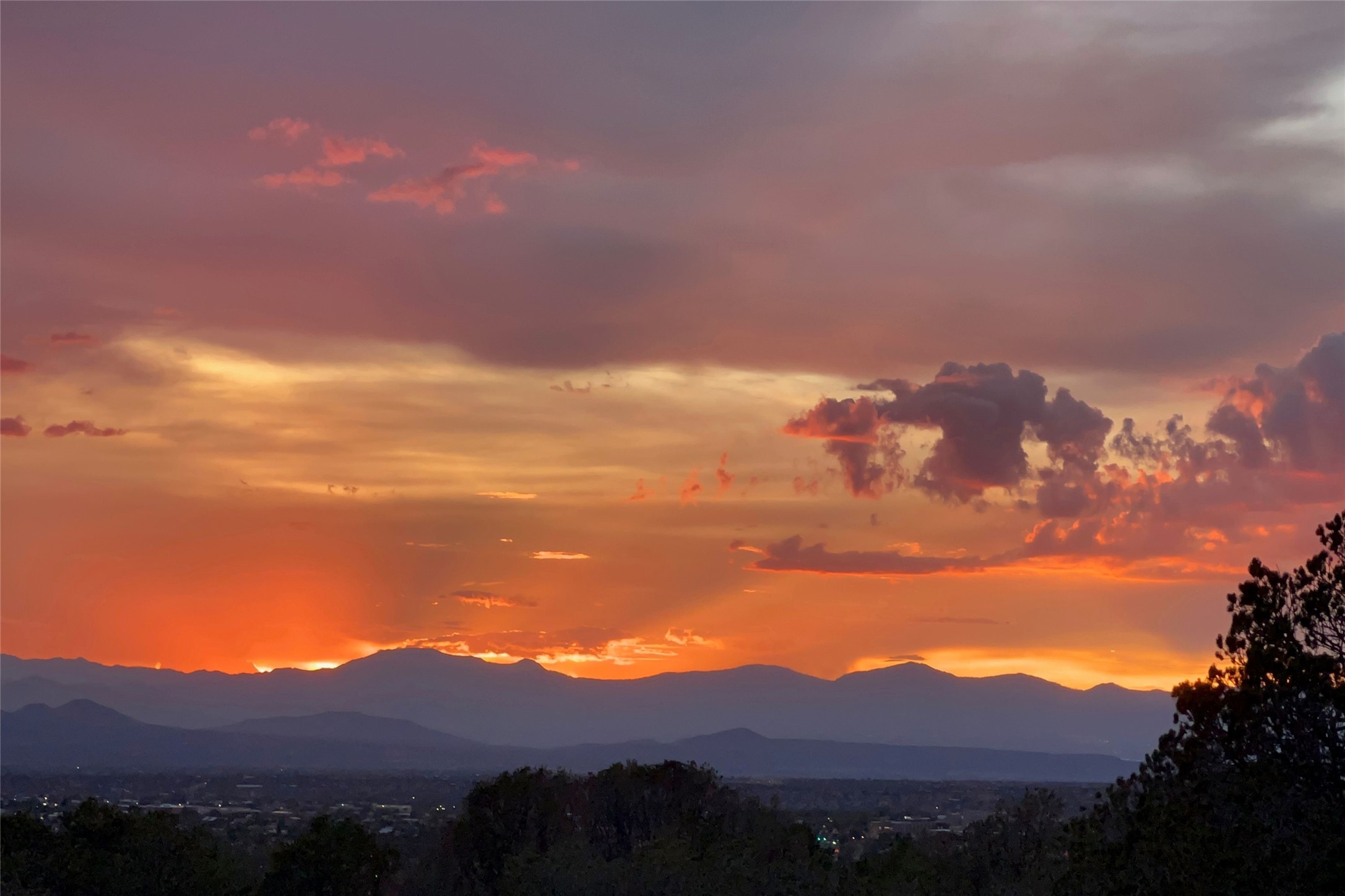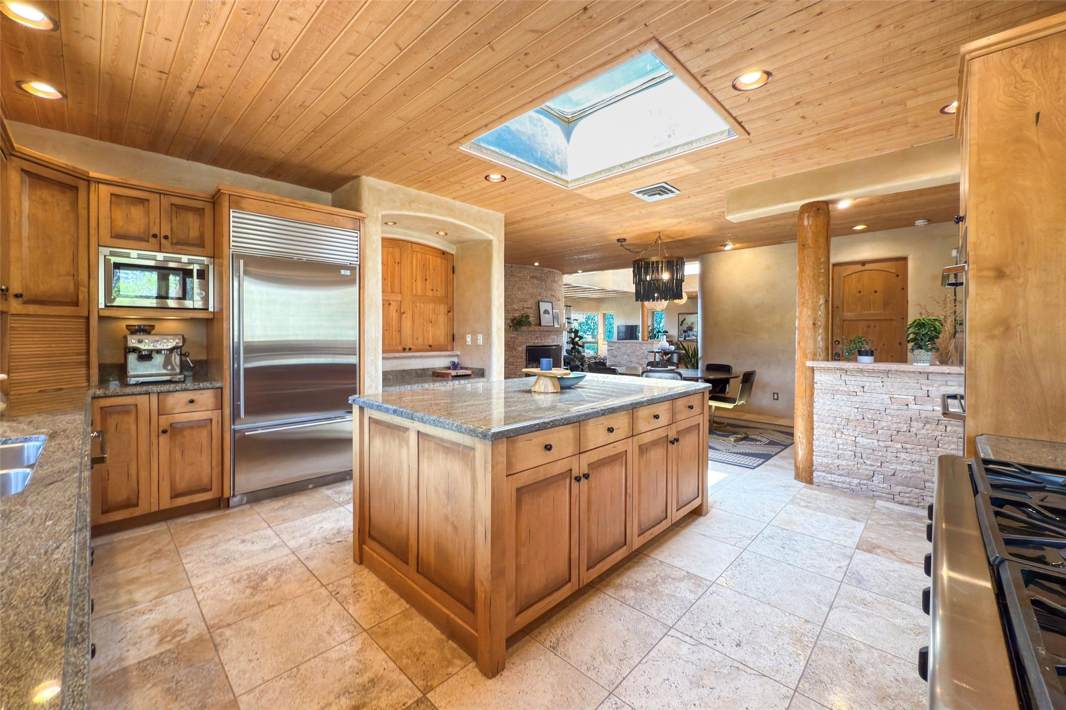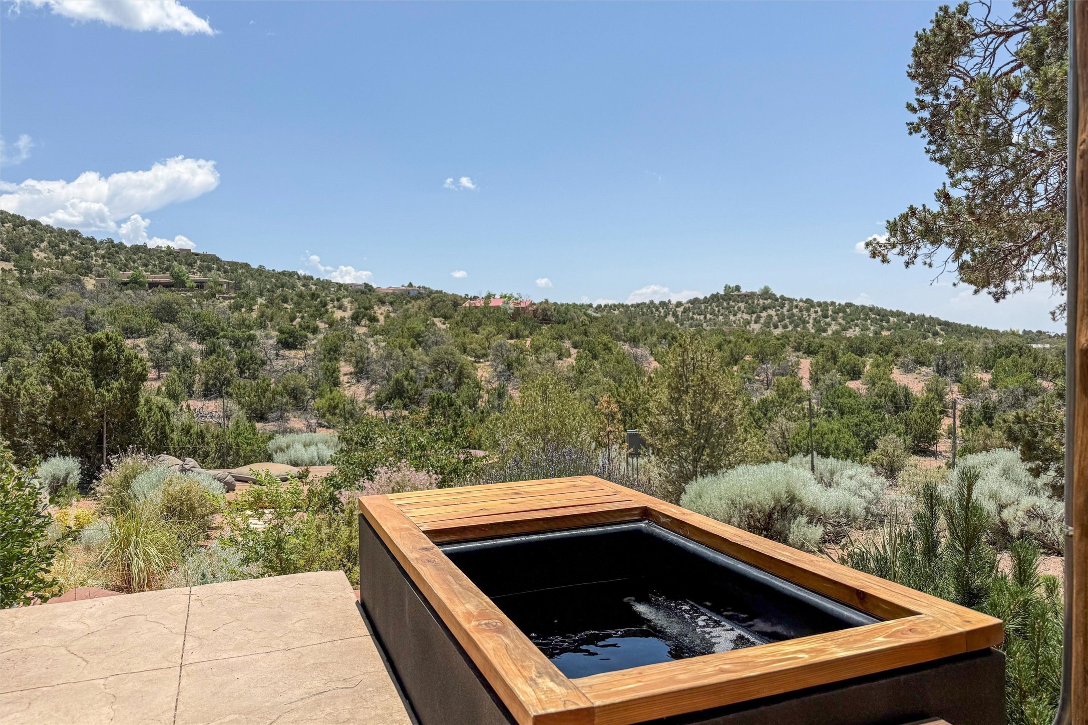Embrace a lifestyle of sophistication and creativity in this stunning Northern New Mexico Compound that offers dramatic views of Sun and Moon Mountain. Situated on 2.5 acres, this special residence invites you to revel in the beauty of the surrounding landscape, with mountain vistas and city lights visible from indoor windows and the expansive 2,500 sq. ft. covered portal. A private quarter-mile walking path winds through the property, offering a tranquil way to connect with the land and enjoy the scenery. Gather around the outdoor kiva fireplace to enjoy views of the enchanting New Mexican nights. The property includes a main residence with two spacious bedrooms, a detached bedroom with a full bath, and a one-bedroom casita with a living area, kitchen, and full bath. In addition, there is a 100-year-old adobe studio. Inside the main house, the large great room is highlighted by soaring vigas and a striking, stacked stone fireplace that serves as the focal point. Culinary enthusiasts will delight in the generous gourmet kitchen, equipped with a central island and top-tier appliances. Retreat to the owner's suite, featuring another stacked stone fireplace, a jacuzzi tub, and an infrared sauna with an open-air cold plunge pool. The outside space is complete with a cedar tub, outdoor shower, and fire pit. Convenience and comfort are enhanced with a whole house generator. Recent upgrades include a new boiler system, water softener, modernized electrical, a new pantry system, custom California Closets and more. Fully fenced yard with drip irrigation is enhanced by the recent planting of over 30 trees. Located minutes from the Historic Santa Fe Plaza.
