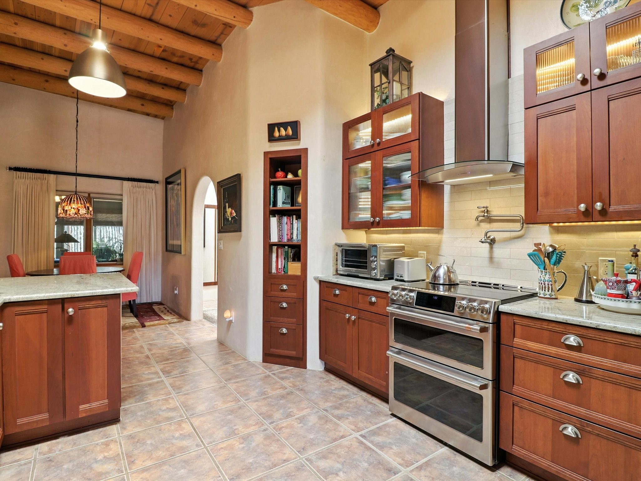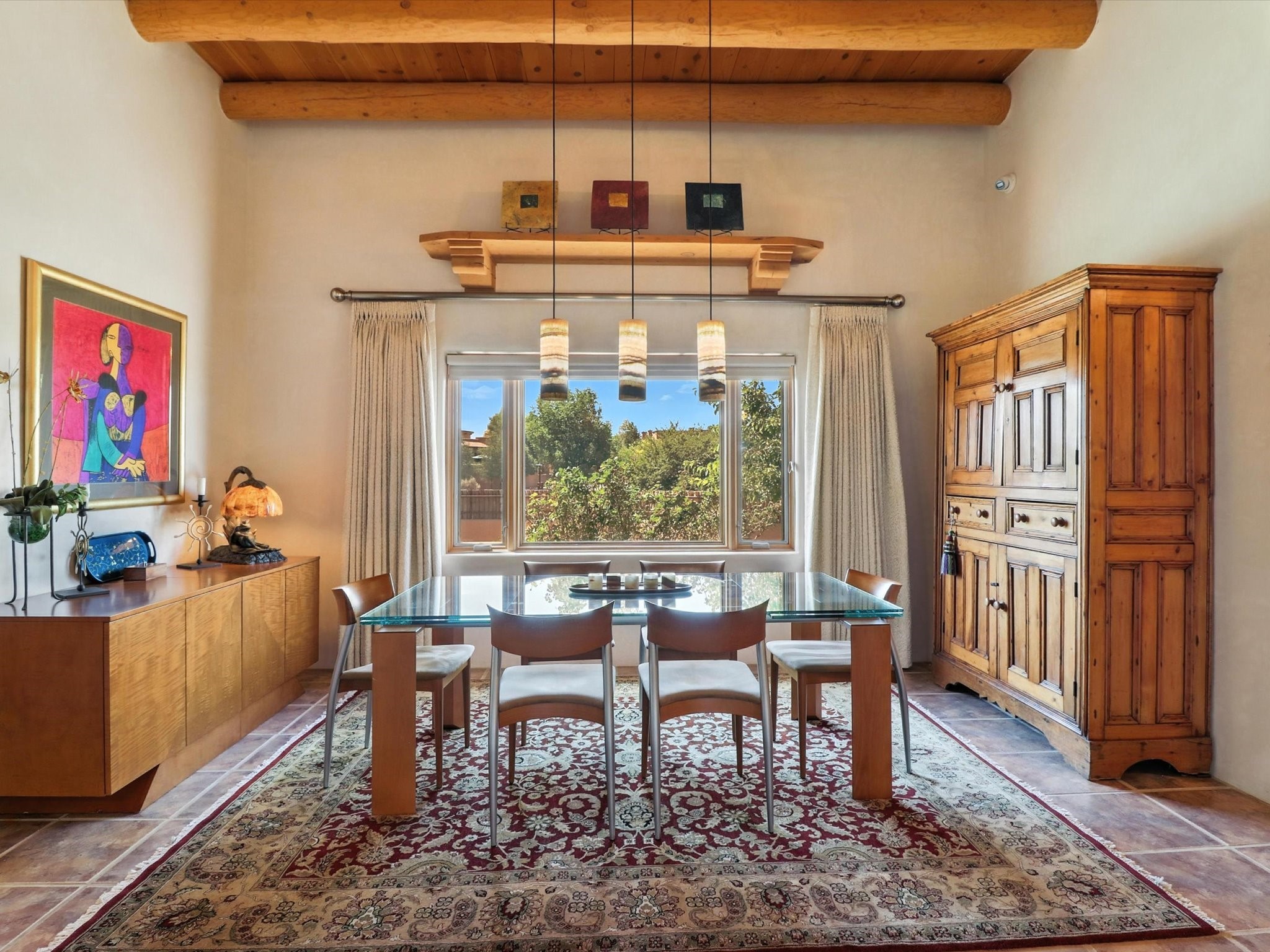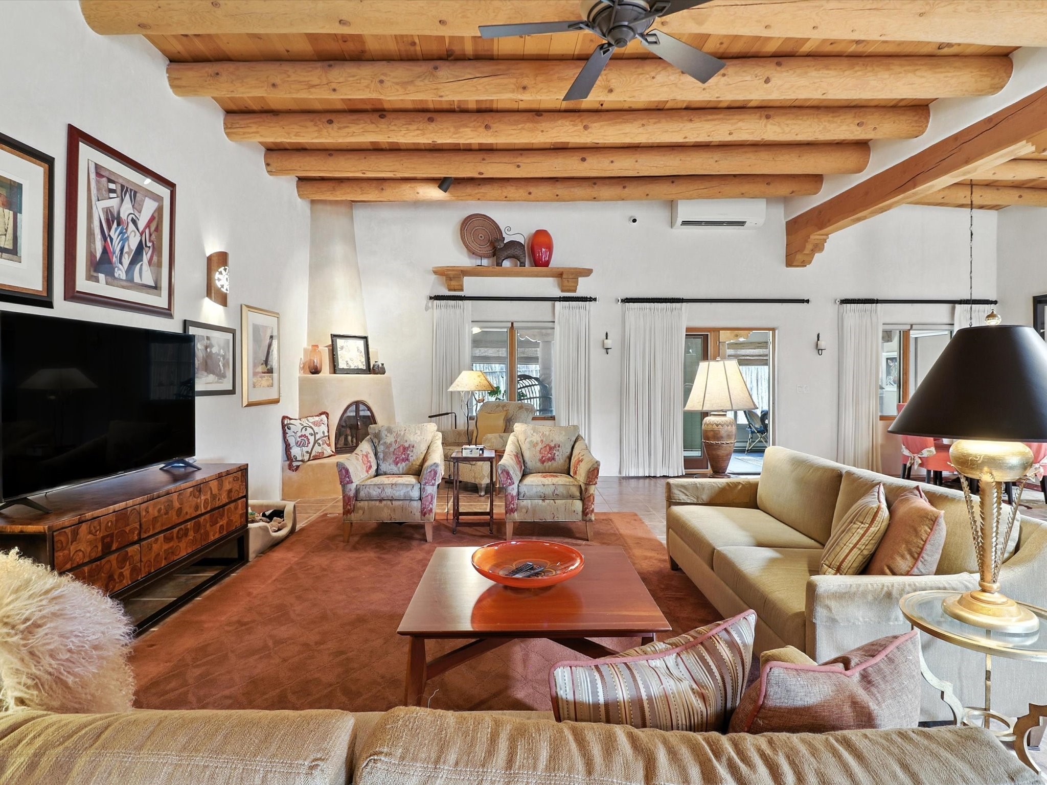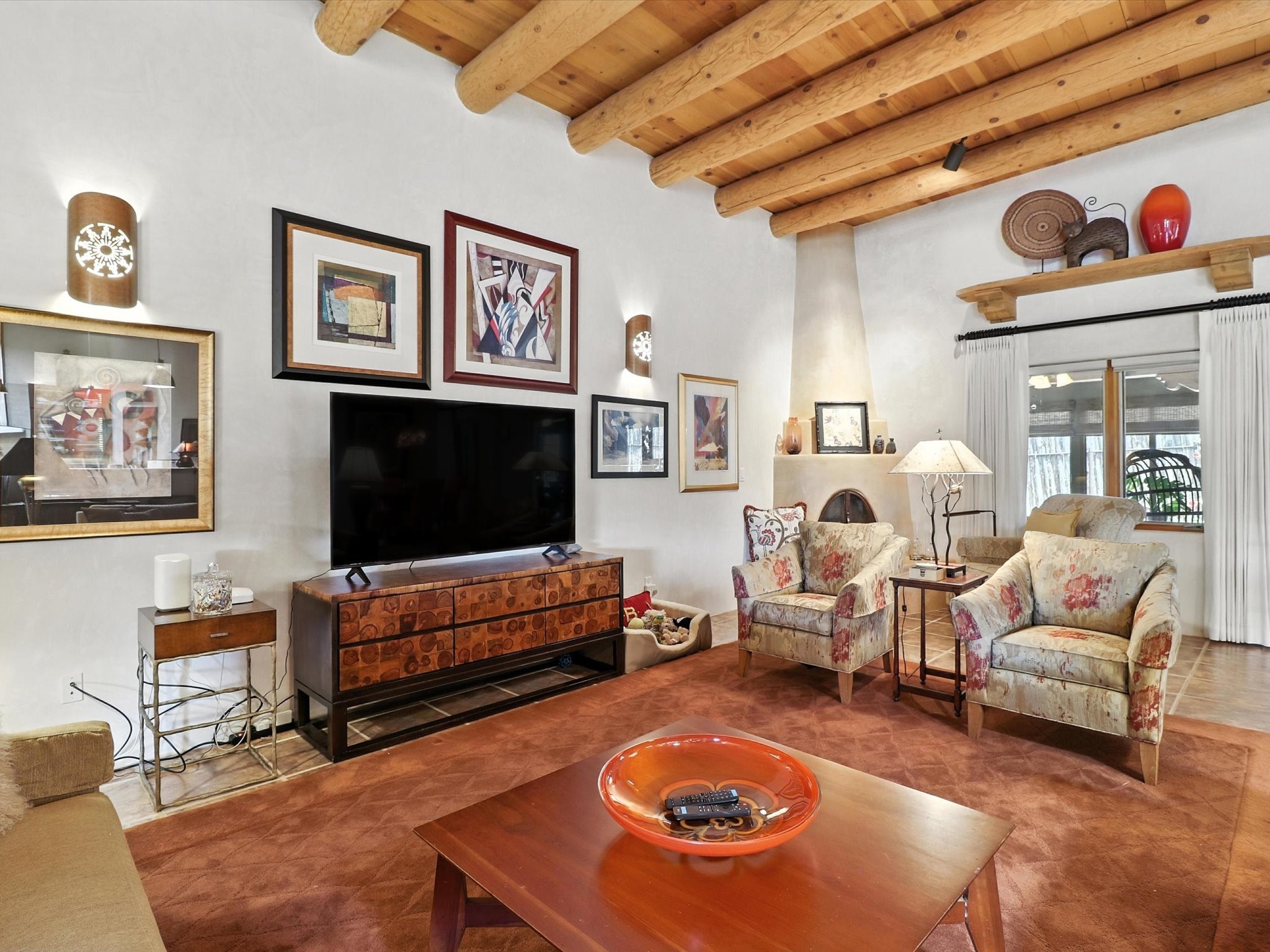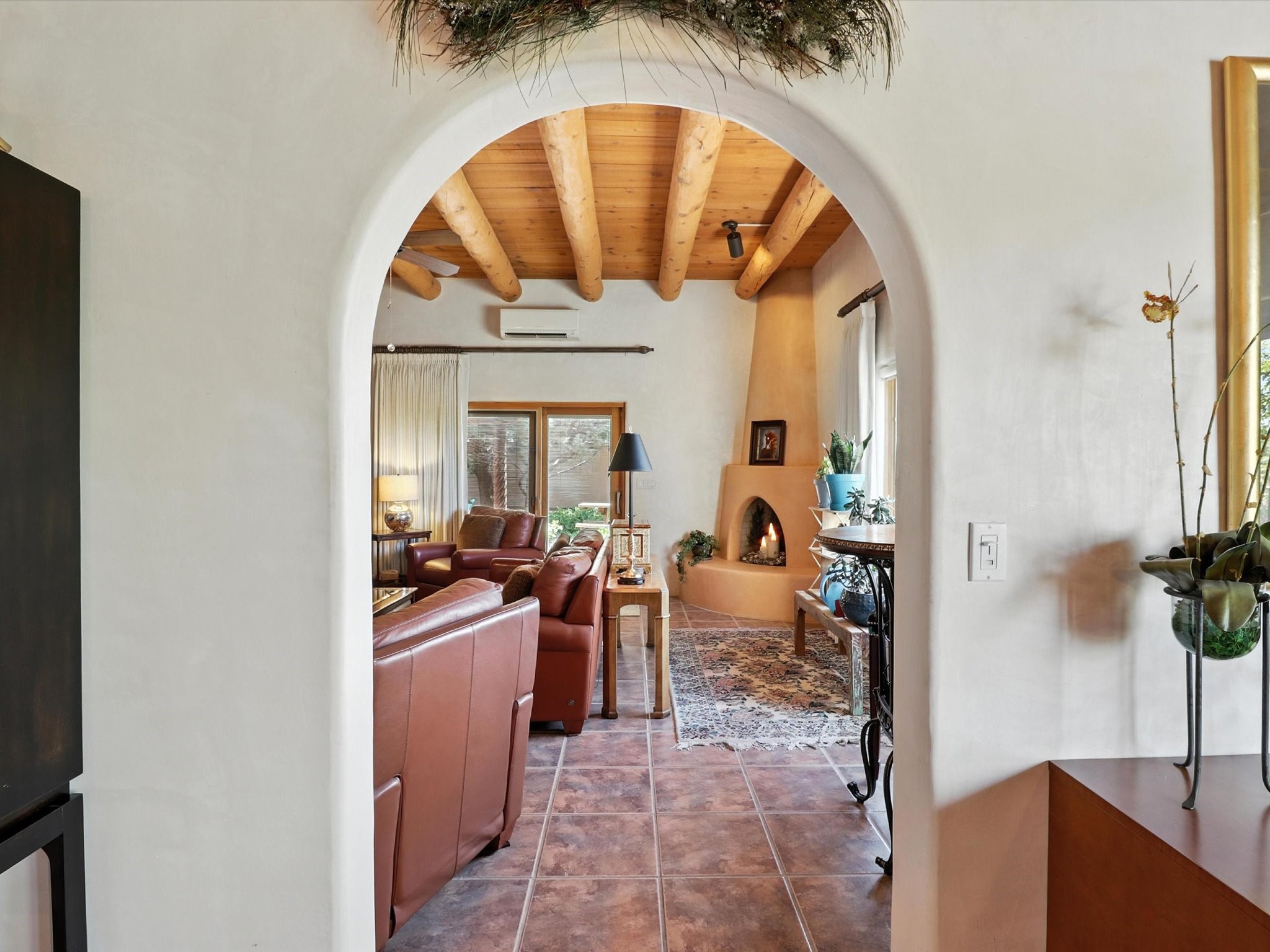 This beautifully maintained and thoughtfully updated home blends timeless Southwestern charm with refined, modern comfort. Spacious and gracefully proportioned rooms are enhanced by luxurious details throughout, including diamond finish plaster walls and elegant, large-format ceramic tile flooring. Step into the dramatic great room, where a soaring 12-foot viga ceiling and a cozy kiva fireplace create a stunning central gathering space. The fully remodeled kitchen is open to the living area and features slab granite countertops, stainless steel appliances, abundant custom cabinetry, and a sunny breakfast nook, perfect for everyday living and entertaining alike. The adjacent formal dining room, also crowned by a high viga ceiling, offers seamless flow for gatherings both intimate and celebratory.A separate den with a wood-burning kiva-style fireplace provides additional flexible living space and opens to a private rear patio and manicured outdoor area.The expansive owner's suite is thoughtfully positioned for privacy and serenity. It includes a peaceful sitting area, direct access to the heated sunroom, and a beautifully appointed updated bath featuring a glass brick wall that gently filters natural light. Two additional bedrooms are located at the opposite end of the home. One is currently serving as studio and office, the other a wonderful guest room, with both sharing a generous full bath. Additional features include: walled and gated yard with security cameras, attached oversized two-car garage, large walk-in closets in every bedroom, heated enclosed Portal Santa Fe room with adjoining covered BBQ area, 5 mini-split Mitsubishi systems for personalized cooling and supplemental heat w/ upgraded hyper compressors, 13 GPM tankless water heater, Toto Washlet toilets, 18 solar panel (owned), and a large in-town lot with all city utilities. This home has been a place of deep joy, creativity, & care, now ready to welcome its next chapter w/ warmth & grace.