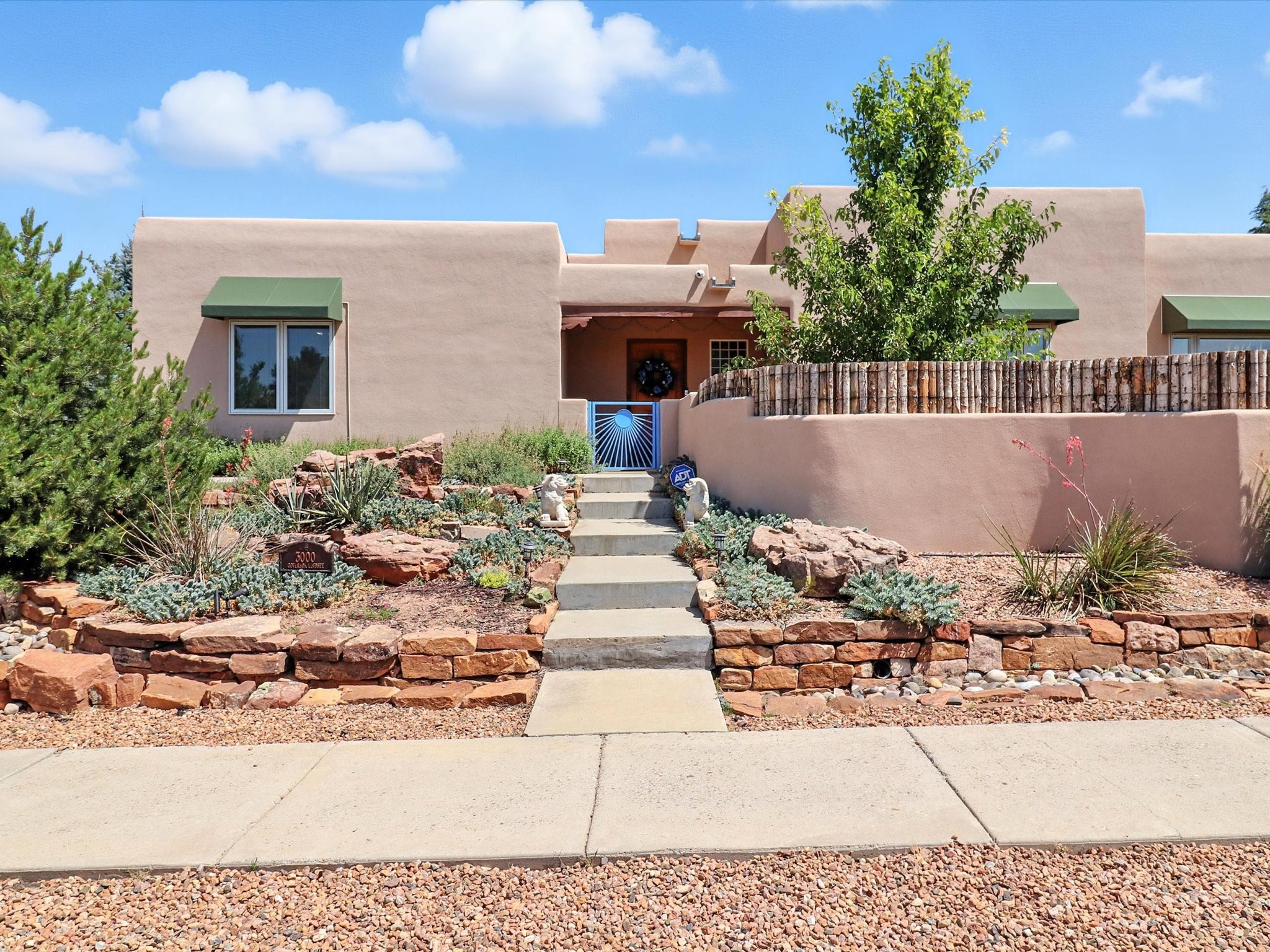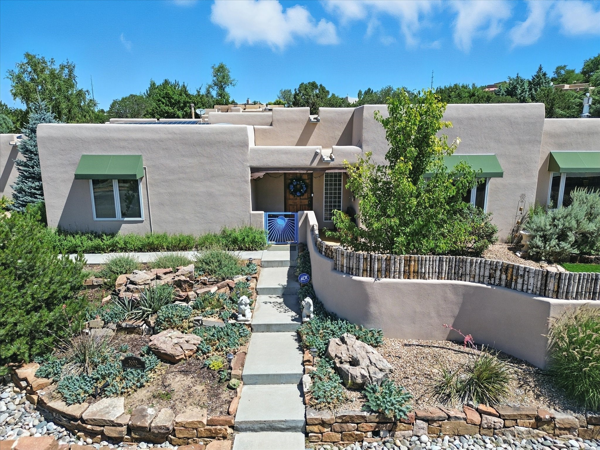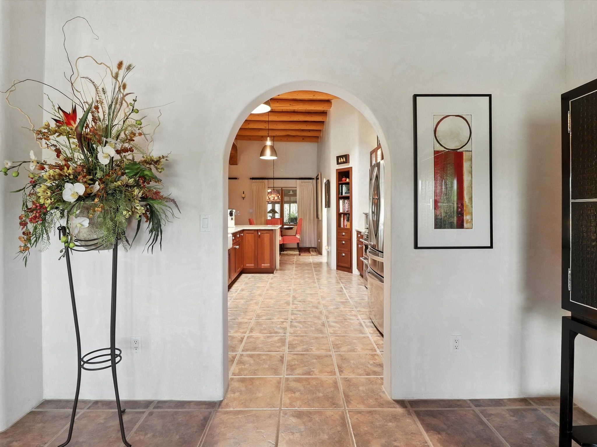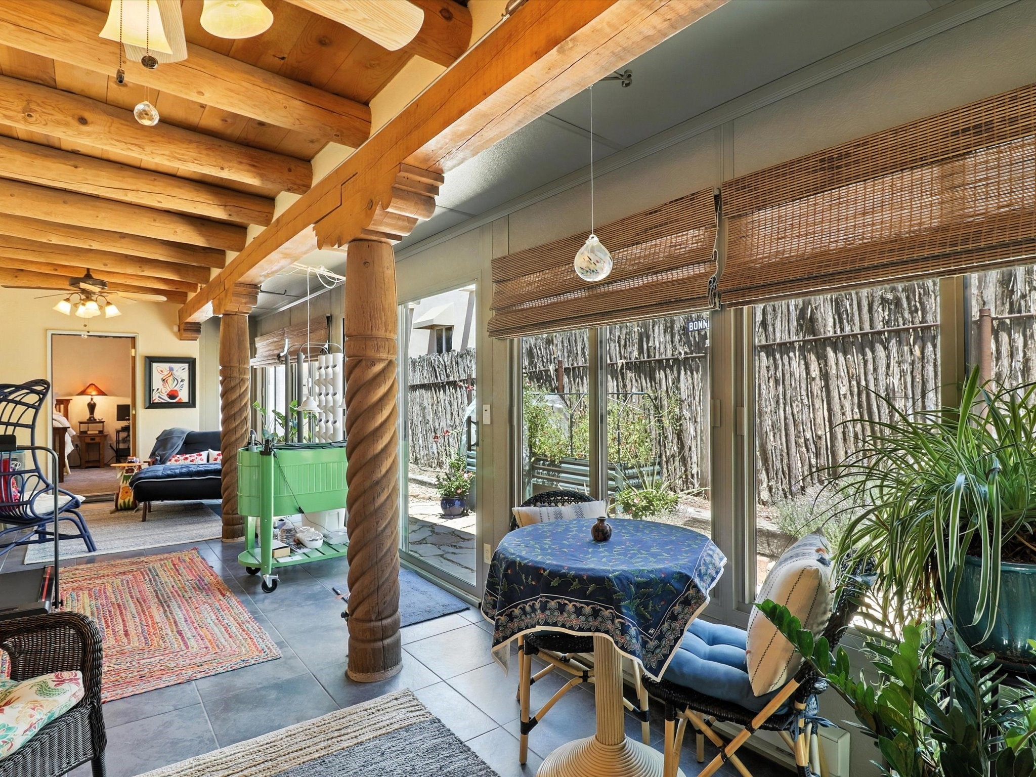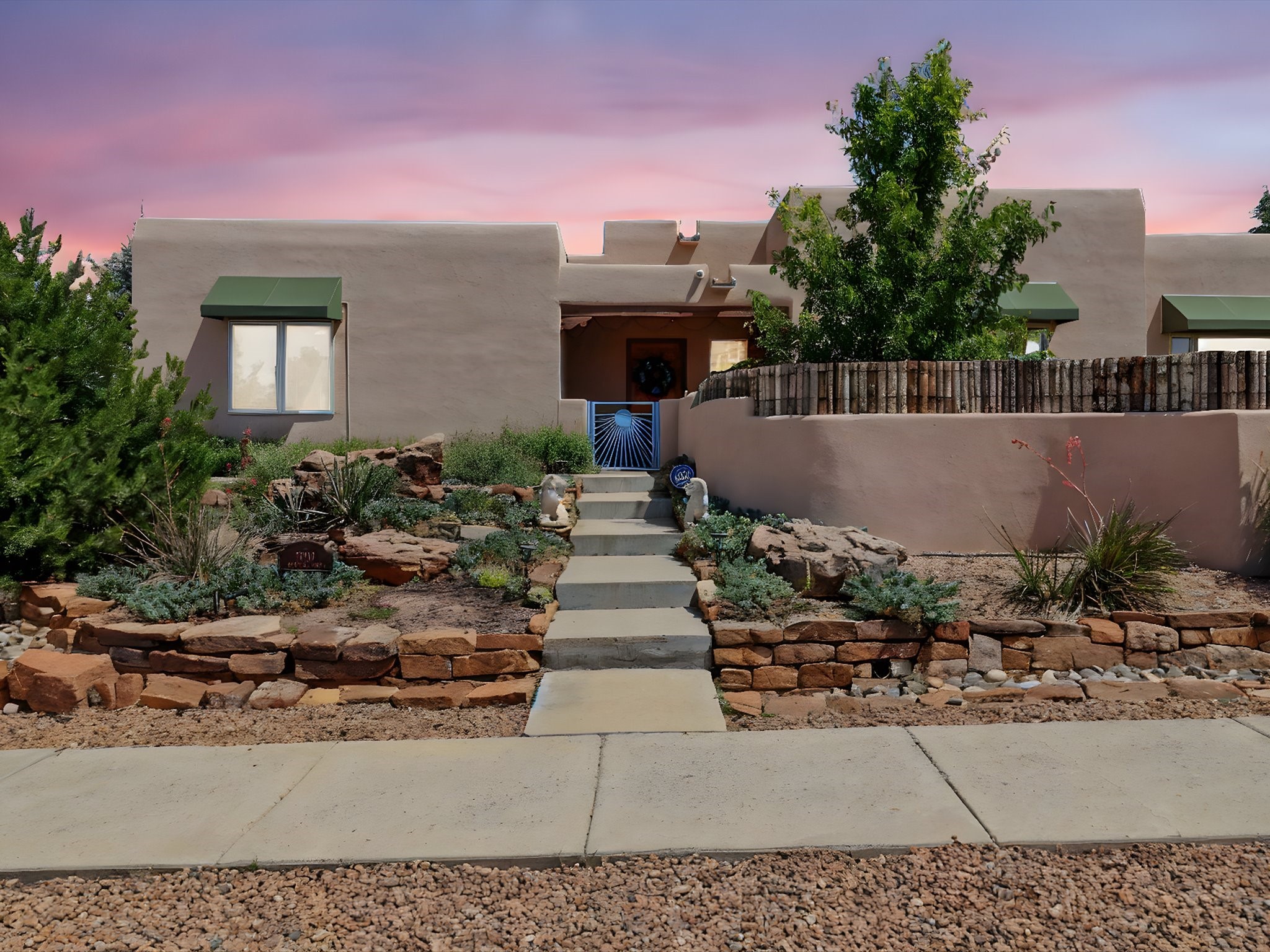 This beautifully maintained and thoughtfully updated home blends timeless Southwestern charm with refined, modern comfort. Spacious and gracefully proportioned rooms are enhanced by luxurious details throughout, including diamond finish plaster walls and elegant, large-format ceramic tile flooring. Step into the dramatic great room, where a soaring 12-foot viga ceiling and a cozy kiva fireplace create a stunning central gathering space. The fully remodeled kitchen is open to the living area and features slab granite countertops, stainless steel appliances, abundant custom cabinetry, and a sunny breakfast nook, perfect for everyday living and entertaining alike. The adjacent formal dining room, also crowned by a high viga ceiling, offers seamless flow for gatherings both intimate and celebratory.A separate den with a wood-burning kiva-style fireplace provides additional flexible living space and opens to a private rear patio and manicured outdoor area.The expansive owner's suite is thoughtfully positioned for privacy and serenity. It includes a peaceful sitting area, direct access to the heated sunroom, and a beautifully appointed updated bath featuring a glass brick wall that gently filters natural light. Two additional bedrooms are located at the opposite end of the home. One is currently serving as studio and office, the other a wonderful guest room, with both sharing a generous full bath. Additional features include: walled and gated yard with security cameras, attached oversized two-car garage, large walk-in closets in every bedroom, heated enclosed Portal Santa Fe room with adjoining covered BBQ area, 5 mini-split Mitsubishi systems for personalized cooling and supplemental heat w/ upgraded hyper compressors, 13 GPM tankless water heater, Toto Washlet toilets, 18 solar panel (owned), and a large in-town lot with all city utilities. This home has been a place of deep joy, creativity, & care, now ready to welcome its next chapter w/ warmth & grace.