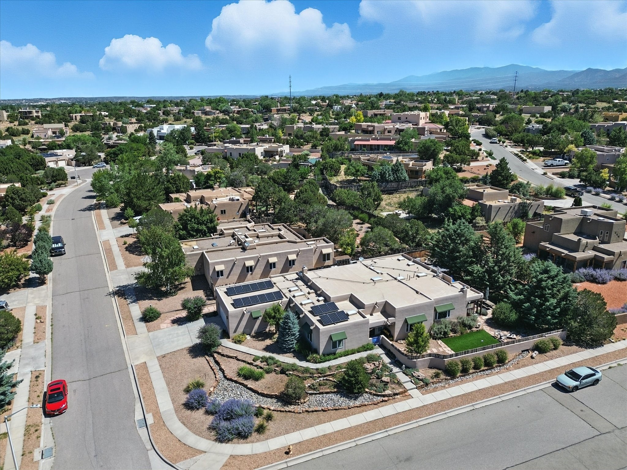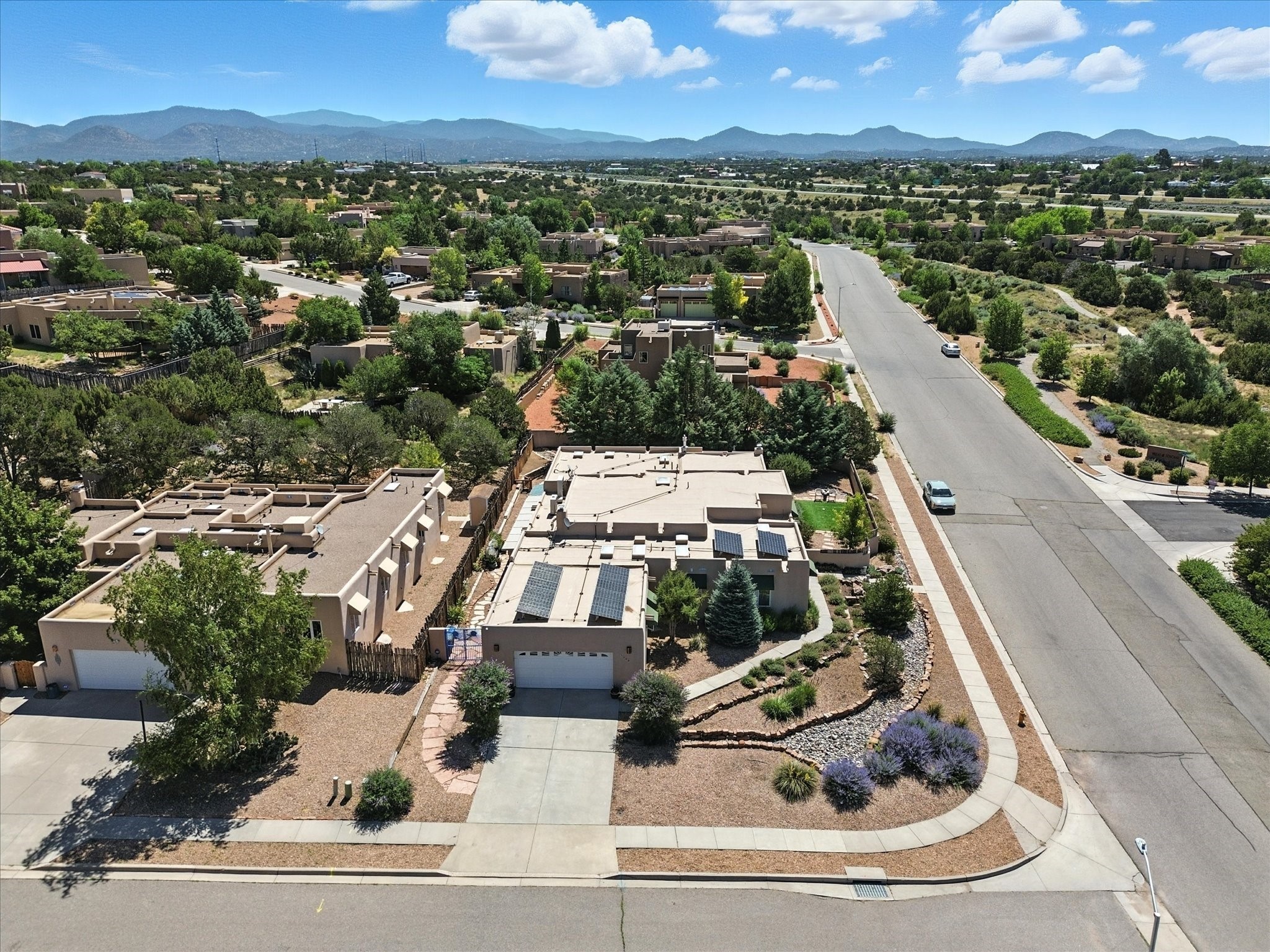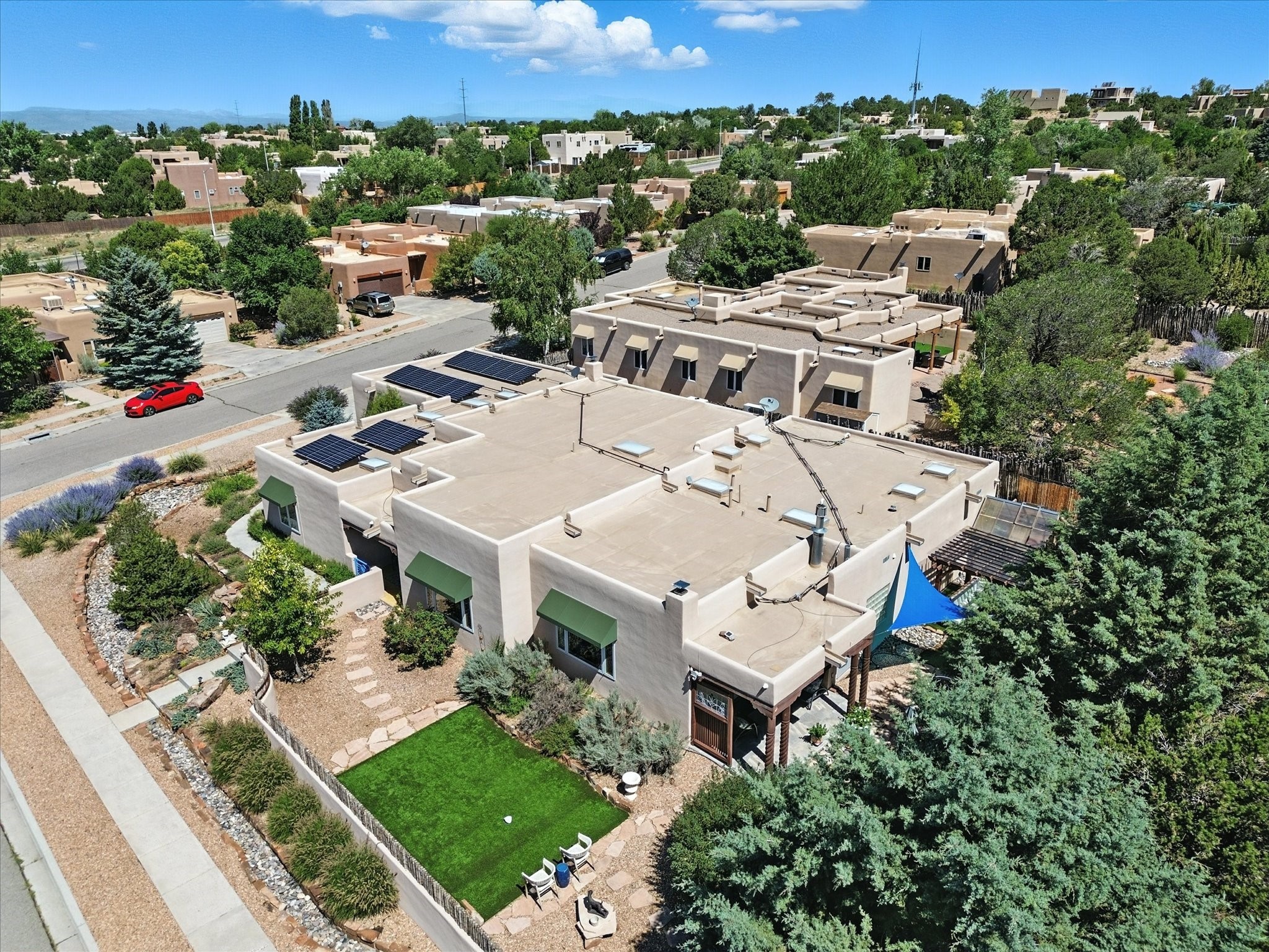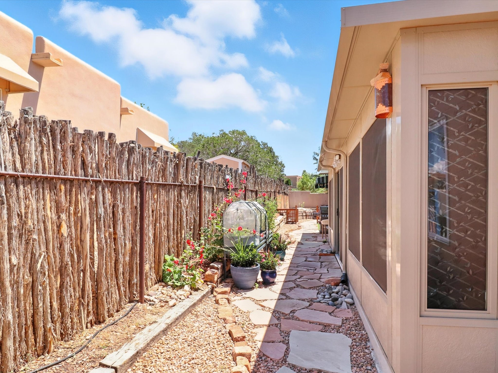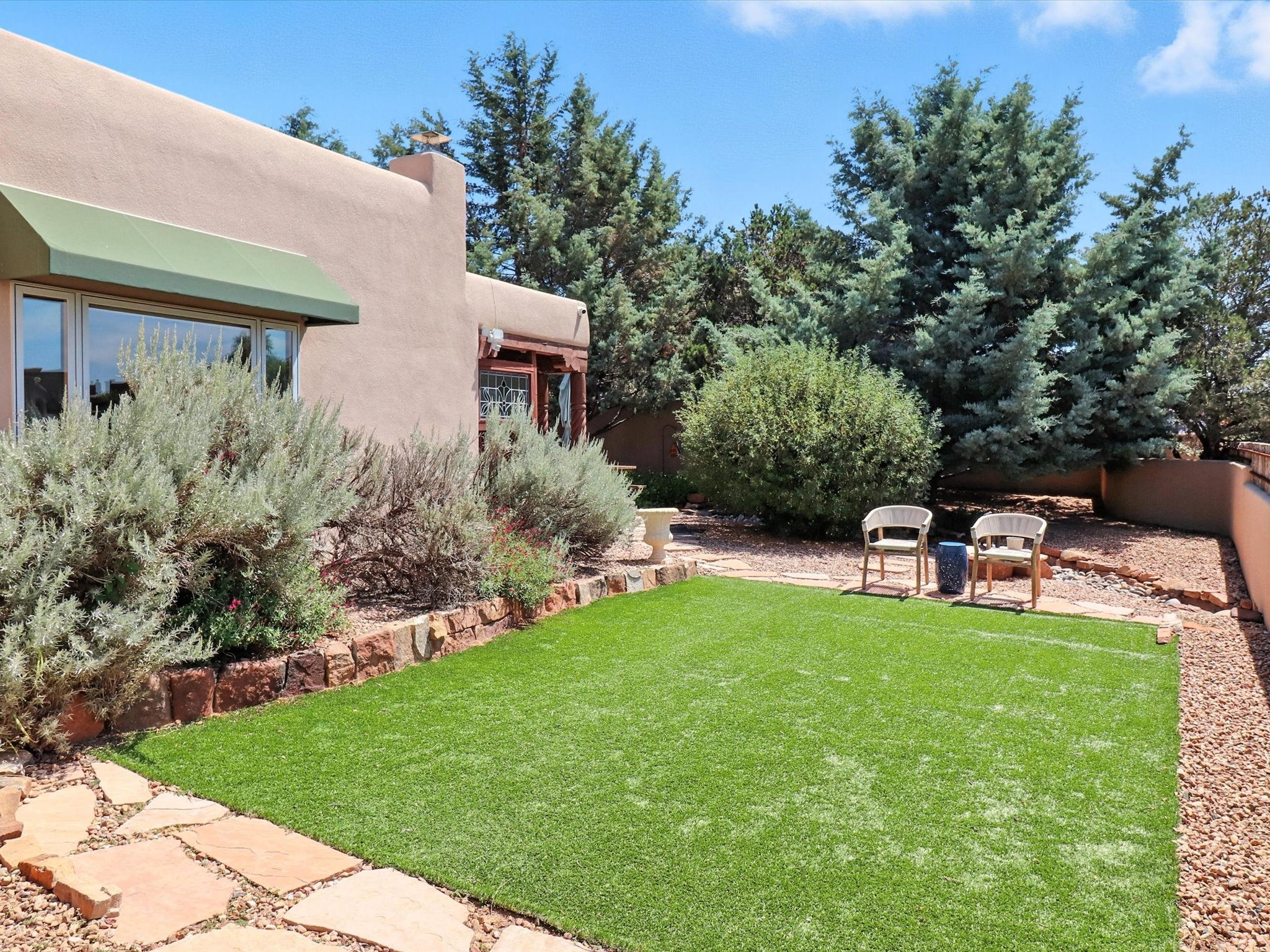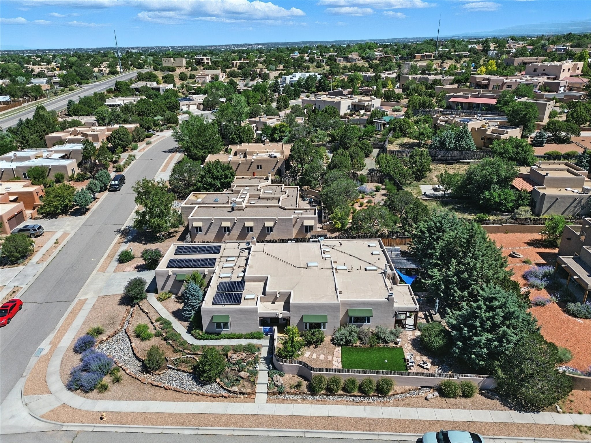 This beautifully maintained and thoughtfully updated home blends timeless Southwestern charm with refined, modern comfort. Spacious and gracefully proportioned rooms are enhanced by luxurious details throughout, including diamond finish plaster walls and elegant, large-format ceramic tile flooring. Step into the dramatic great room, where a soaring 12-foot viga ceiling and a cozy kiva fireplace create a stunning central gathering space. The fully remodeled kitchen is open to the living area and features slab granite countertops, stainless steel appliances, abundant custom cabinetry, and a sunny breakfast nook, perfect for everyday living and entertaining alike. The adjacent formal dining room, also crowned by a high viga ceiling, offers seamless flow for gatherings both intimate and celebratory.A separate den with a wood-burning kiva-style fireplace provides additional flexible living space and opens to a private rear patio and manicured outdoor area.The expansive owner's suite is thoughtfully positioned for privacy and serenity. It includes a peaceful sitting area, direct access to the heated sunroom, and a beautifully appointed updated bath featuring a glass brick wall that gently filters natural light. Two additional bedrooms are located at the opposite end of the home. One is currently serving as studio and office, the other a wonderful guest room, with both sharing a generous full bath. Additional features include: walled and gated yard with security cameras, attached oversized two-car garage, large walk-in closets in every bedroom, heated enclosed Portal Santa Fe room with adjoining covered BBQ area, 5 mini-split Mitsubishi systems for personalized cooling and supplemental heat w/ upgraded hyper compressors, 13 GPM tankless water heater, Toto Washlet toilets, 18 solar panel (owned), and a large in-town lot with all city utilities. This home has been a place of deep joy, creativity, & care, now ready to welcome its next chapter w/ warmth & grace.