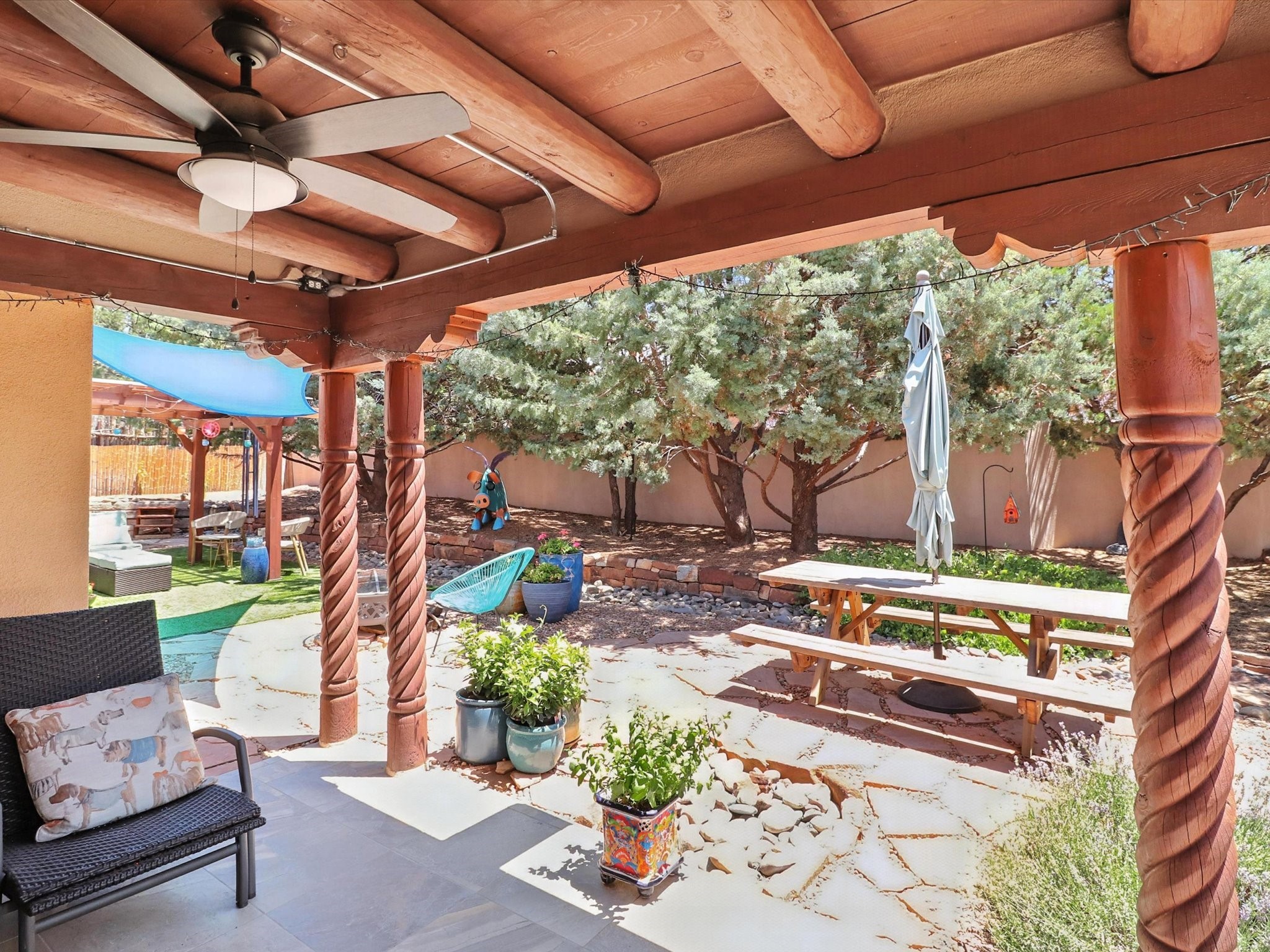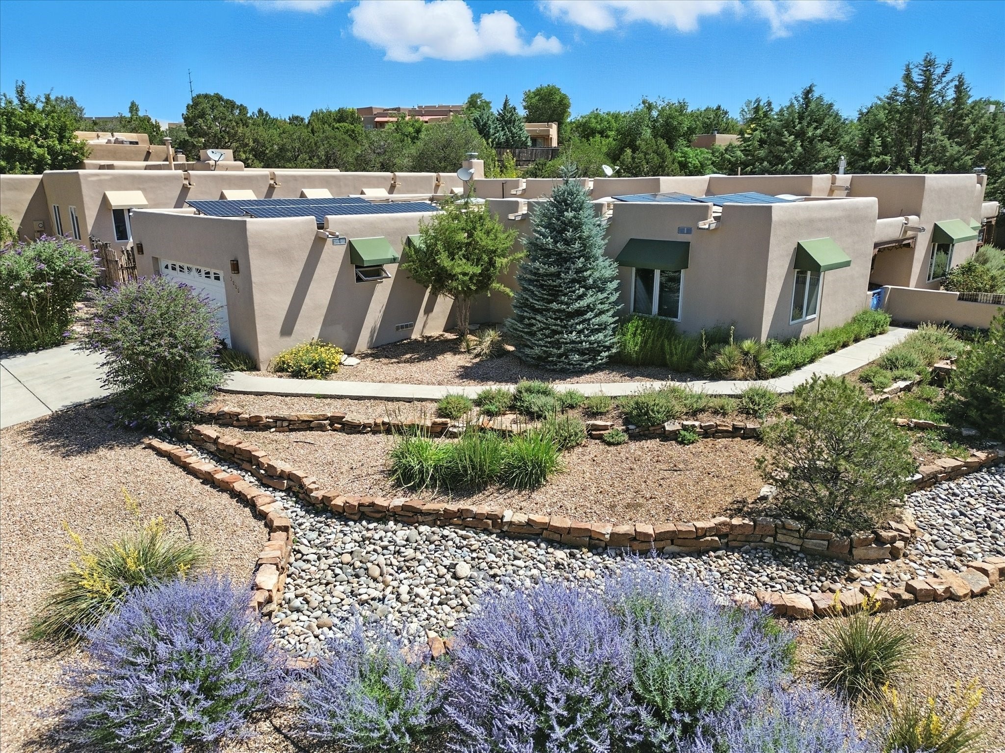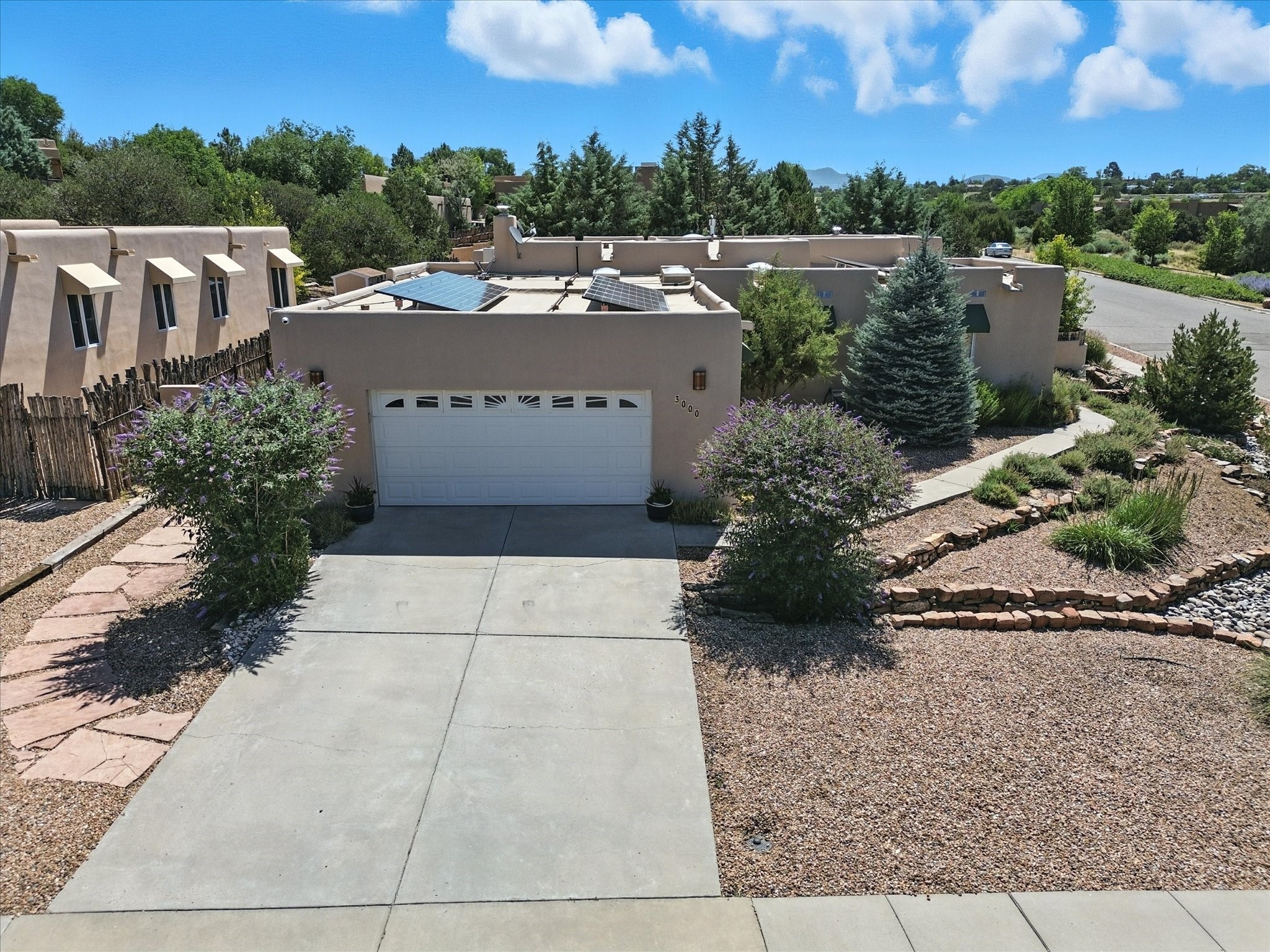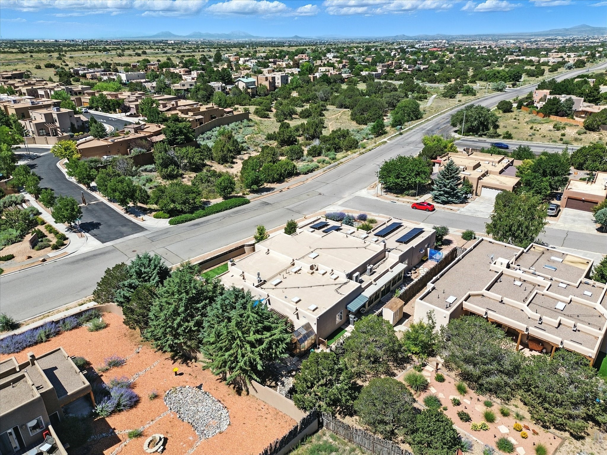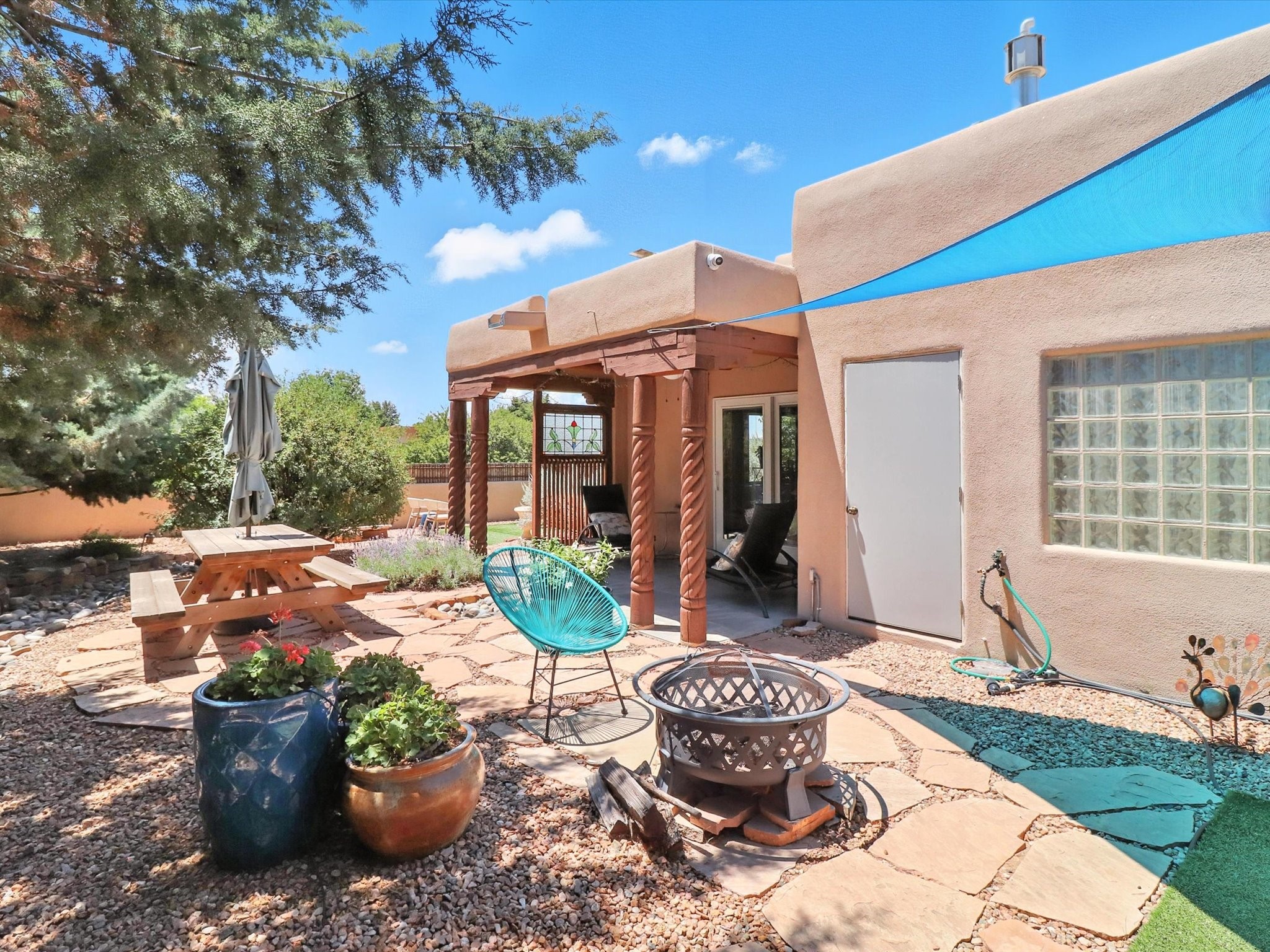 This beautifully maintained and thoughtfully updated home blends timeless Southwestern charm with refined, modern comfort. Spacious and gracefully proportioned rooms are enhanced by luxurious details throughout, including diamond finish plaster walls and elegant, large-format ceramic tile flooring. Step into the dramatic great room, where a soaring 12-foot viga ceiling and a cozy kiva fireplace create a stunning central gathering space. The fully remodeled kitchen is open to the living area and features slab granite countertops, stainless steel appliances, abundant custom cabinetry, and a sunny breakfast nook, perfect for everyday living and entertaining alike. The adjacent formal dining room, also crowned by a high viga ceiling, offers seamless flow for gatherings both intimate and celebratory.A separate den with a wood-burning kiva-style fireplace provides additional flexible living space and opens to a private rear patio and manicured outdoor area.The expansive owner's suite is thoughtfully positioned for privacy and serenity. It includes a peaceful sitting area, direct access to the heated sunroom, and a beautifully appointed updated bath featuring a glass brick wall that gently filters natural light. Two additional bedrooms are located at the opposite end of the home. One is currently serving as studio and office, the other a wonderful guest room, with both sharing a generous full bath. Additional features include: walled and gated yard with security cameras, attached oversized two-car garage, large walk-in closets in every bedroom, heated enclosed Portal Santa Fe room with adjoining covered BBQ area, 5 mini-split Mitsubishi systems for personalized cooling and supplemental heat w/ upgraded hyper compressors, 13 GPM tankless water heater, Toto Washlet toilets, 18 solar panel (owned), and a large in-town lot with all city utilities. This home has been a place of deep joy, creativity, & care, now ready to welcome its next chapter w/ warmth & grace.